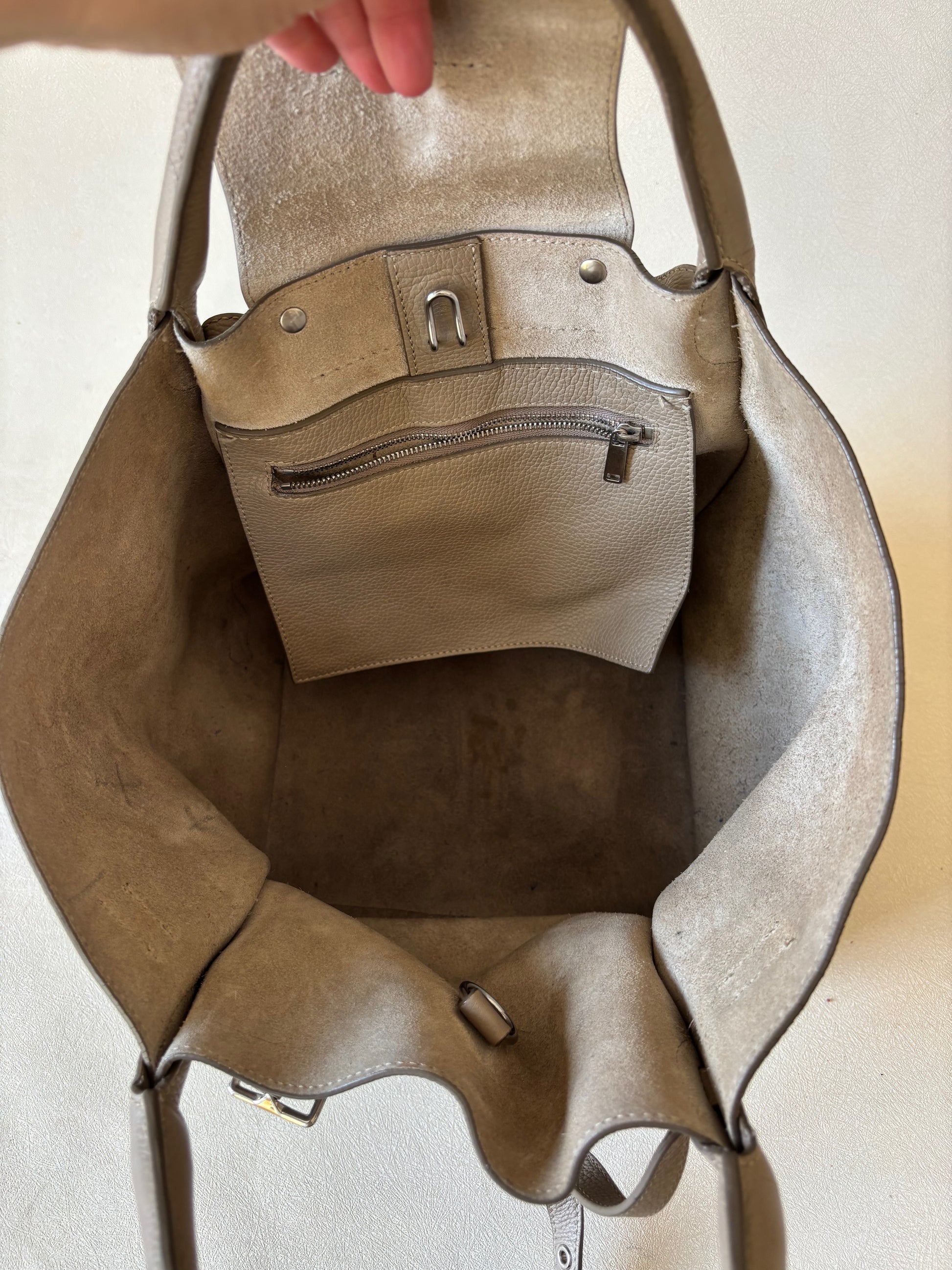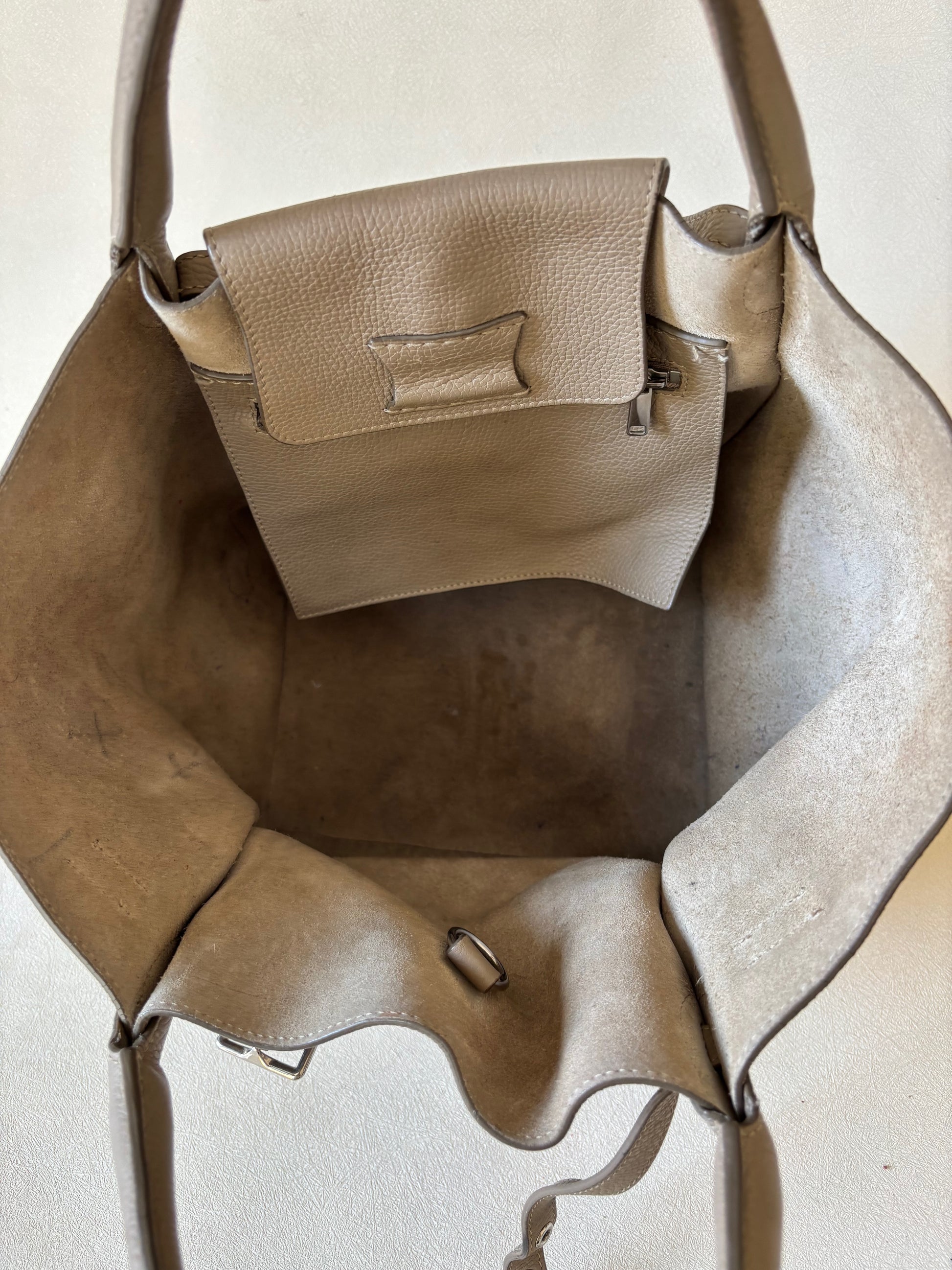 * Doublure intérieure en daim avec poche intérieure zippée en cuir