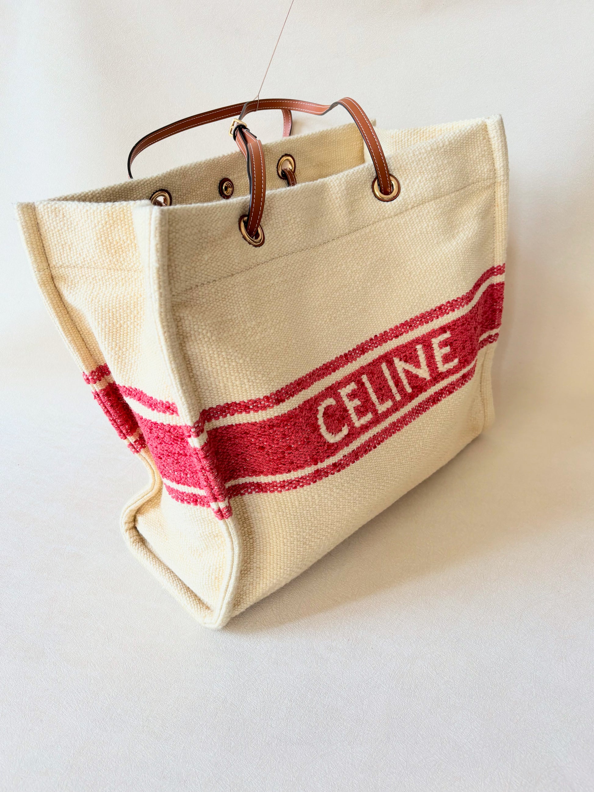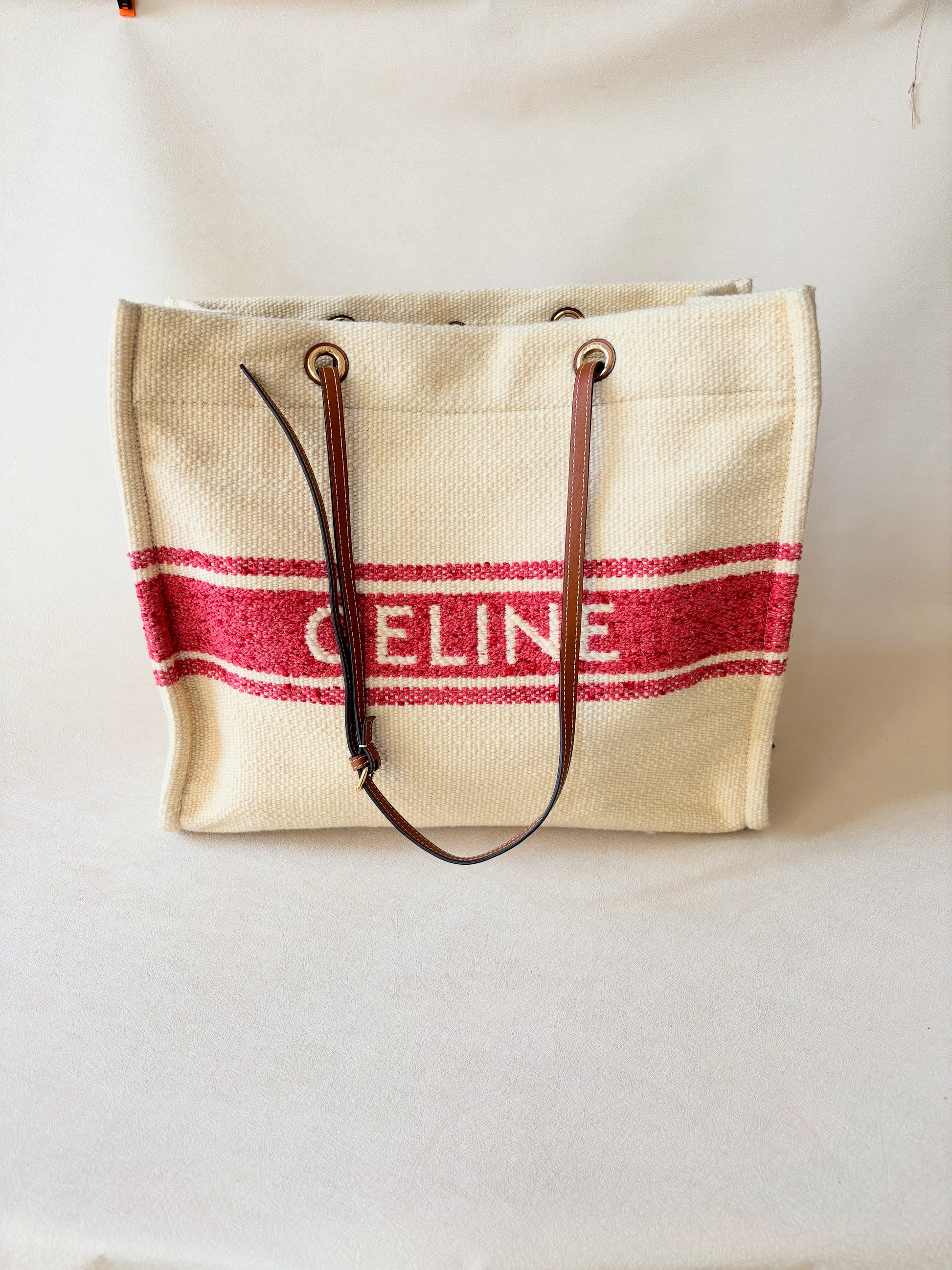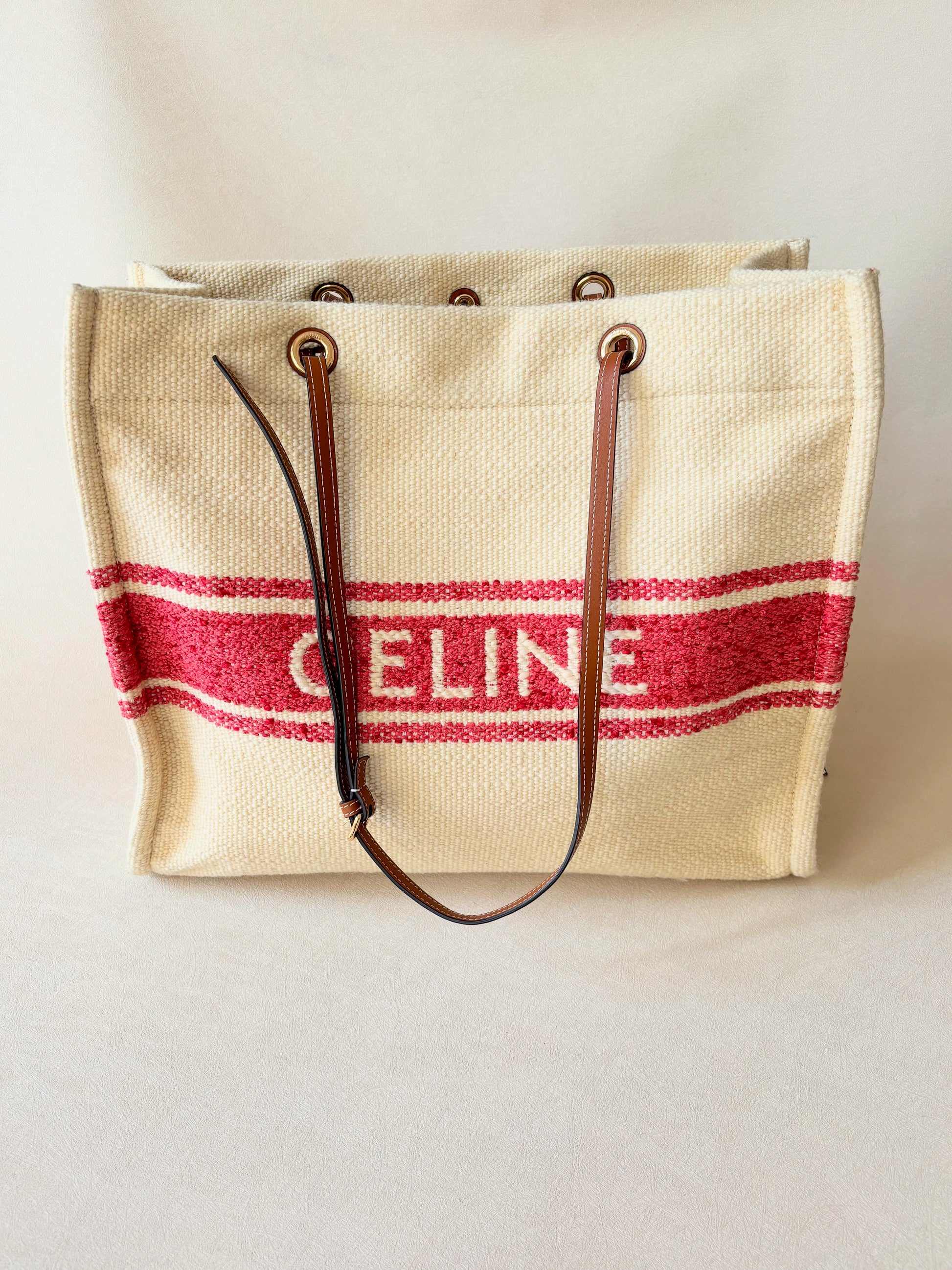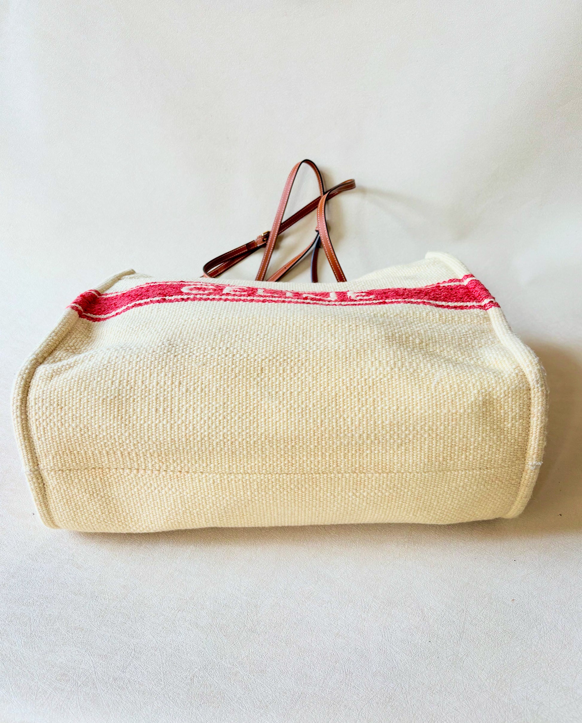 * Logo CÉLINE rouge contrastant sur la toile écrue