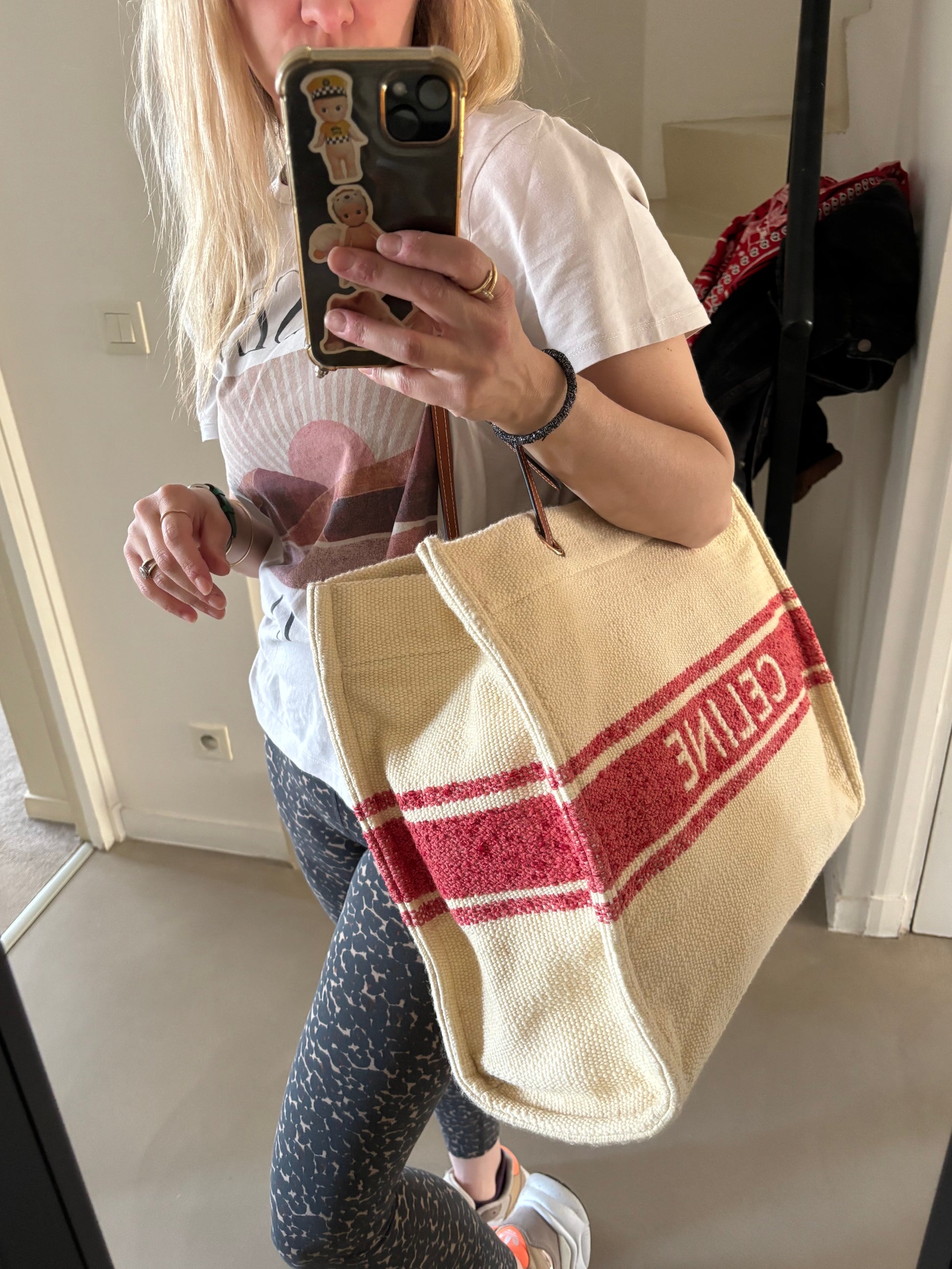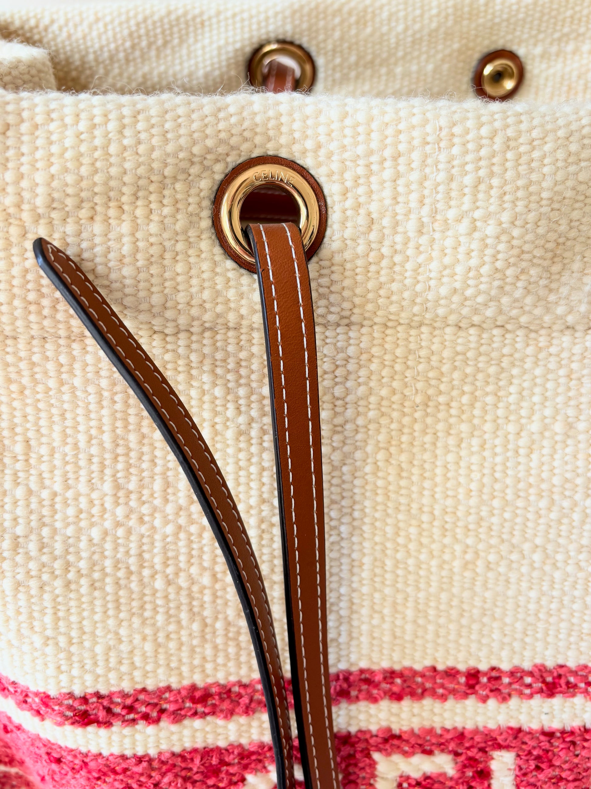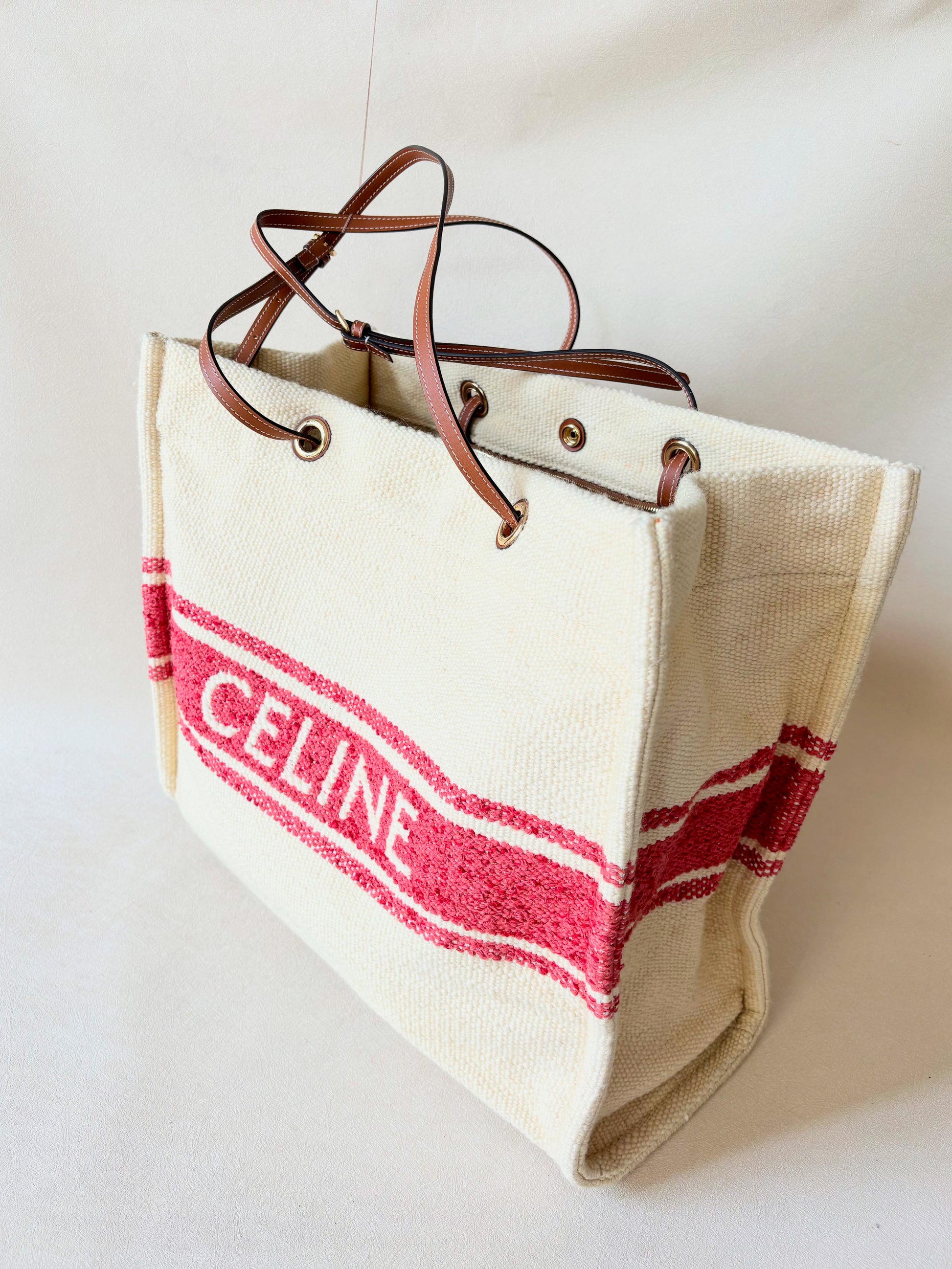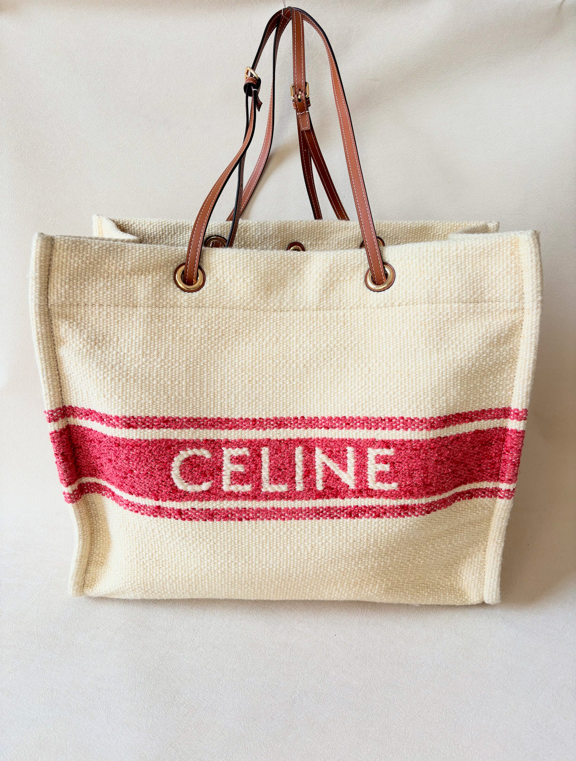* Logo CÉLINE rouge contrastant sur la toile écrue
