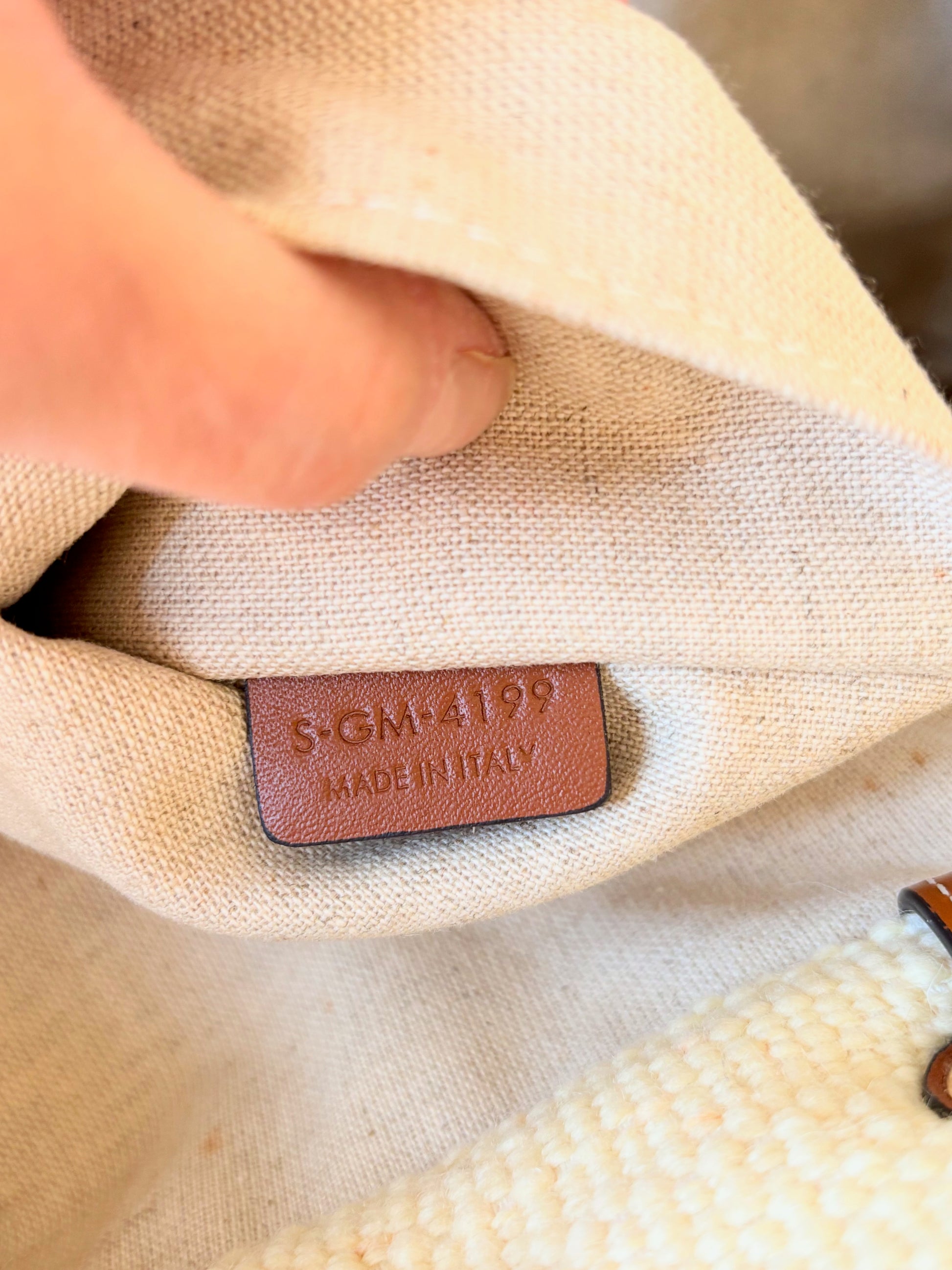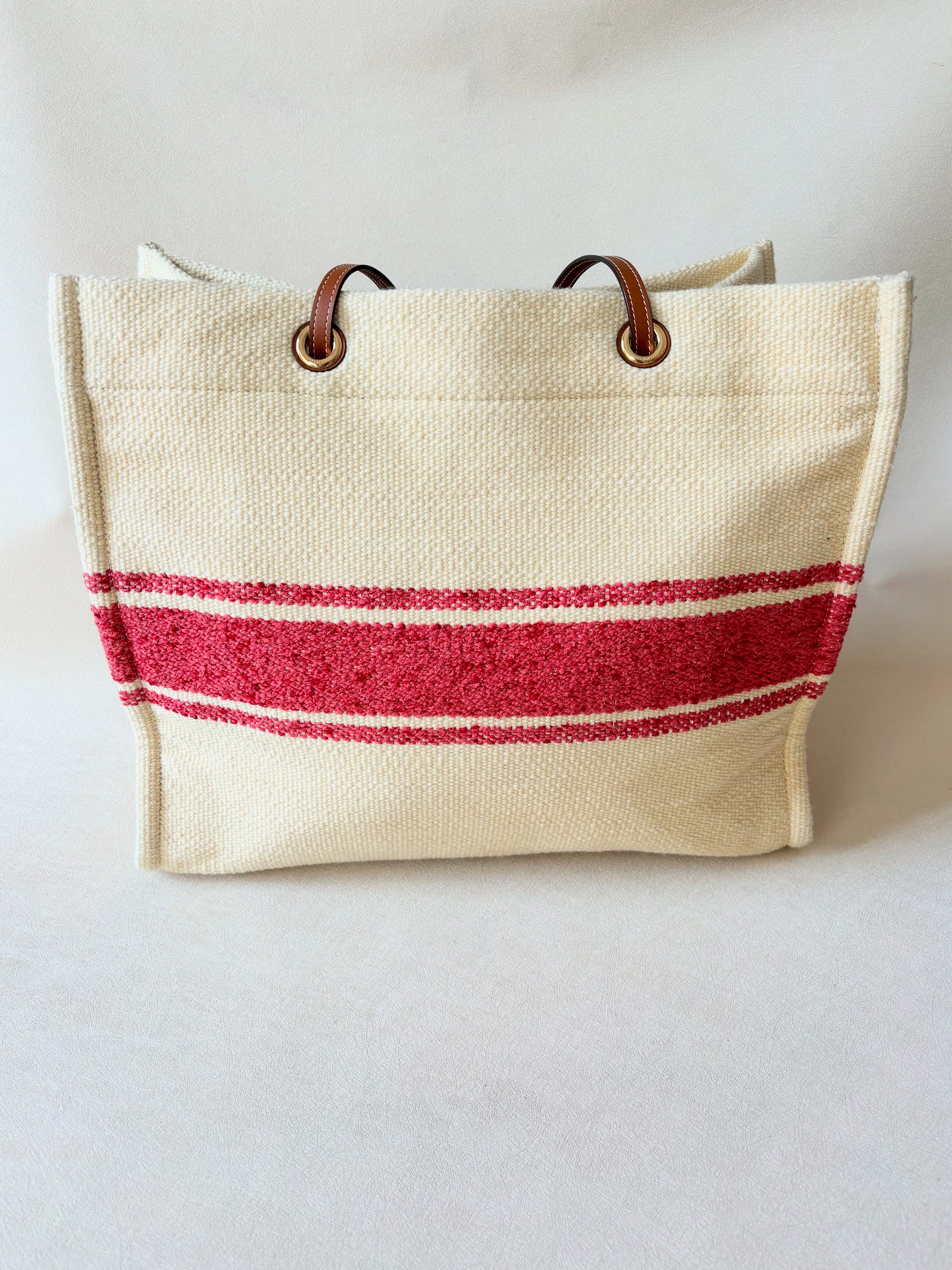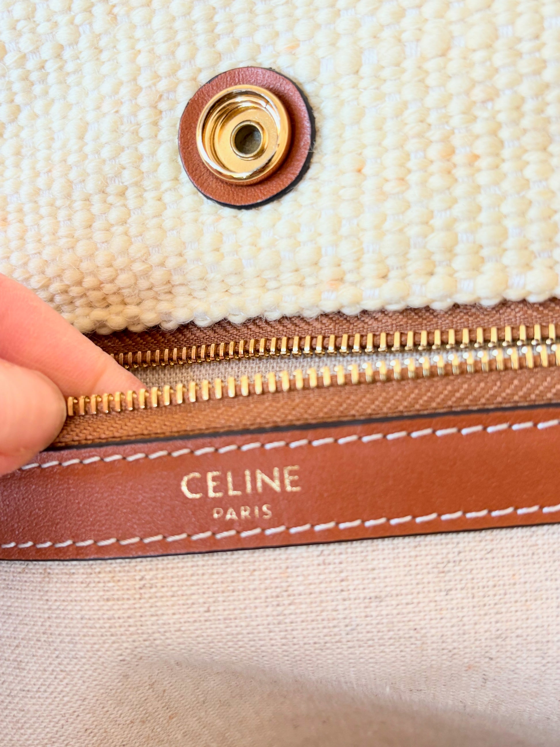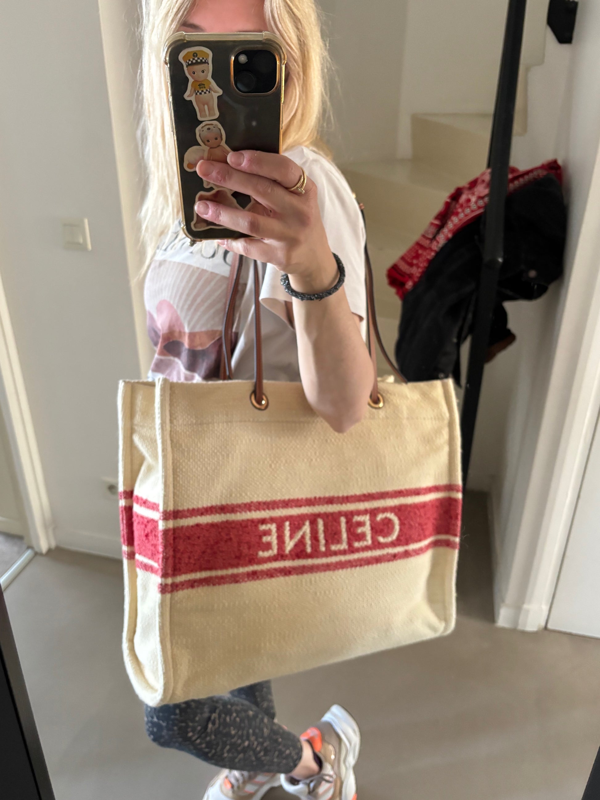 * Logo CÉLINE rouge contrastant sur la toile écrue