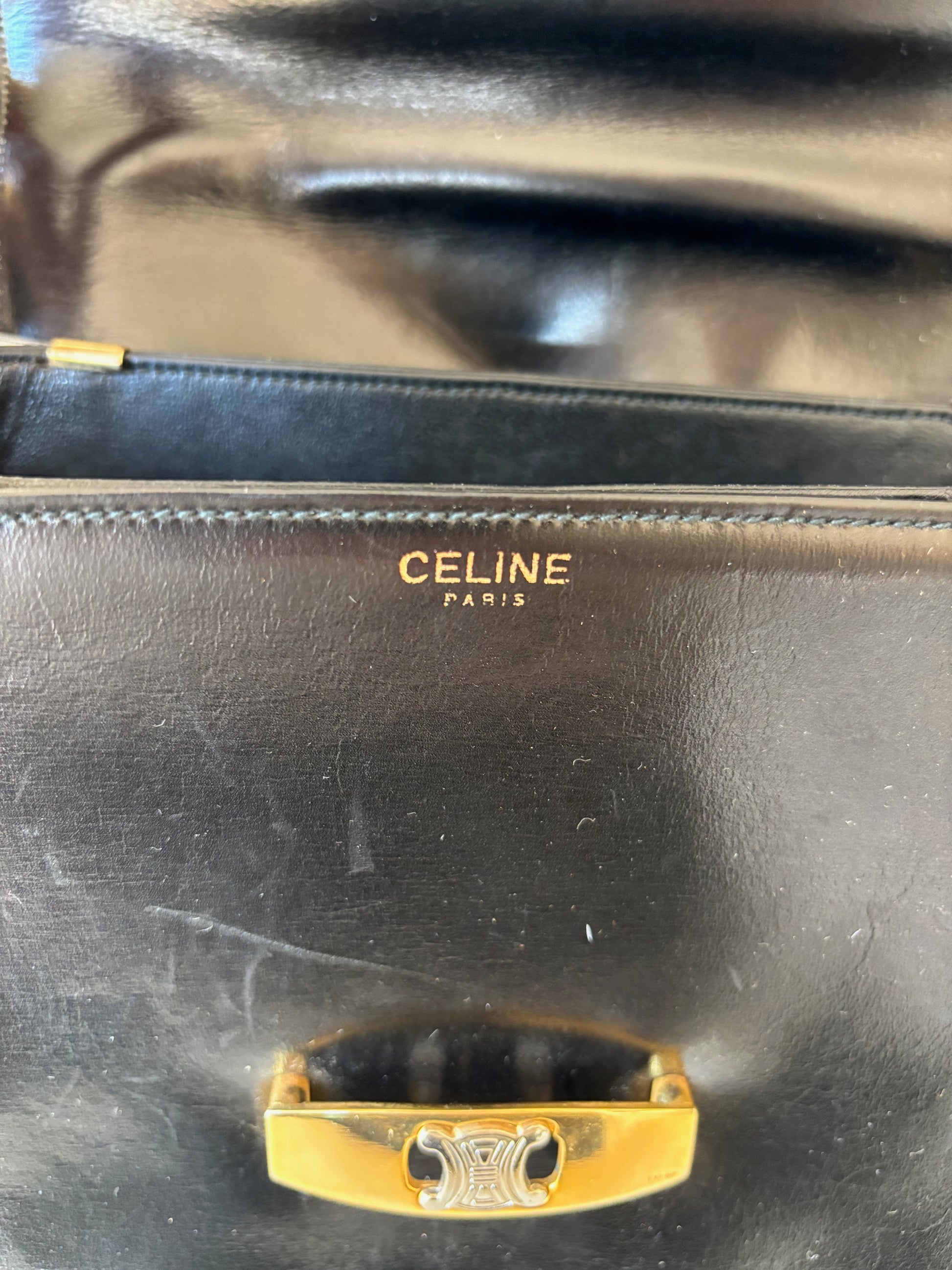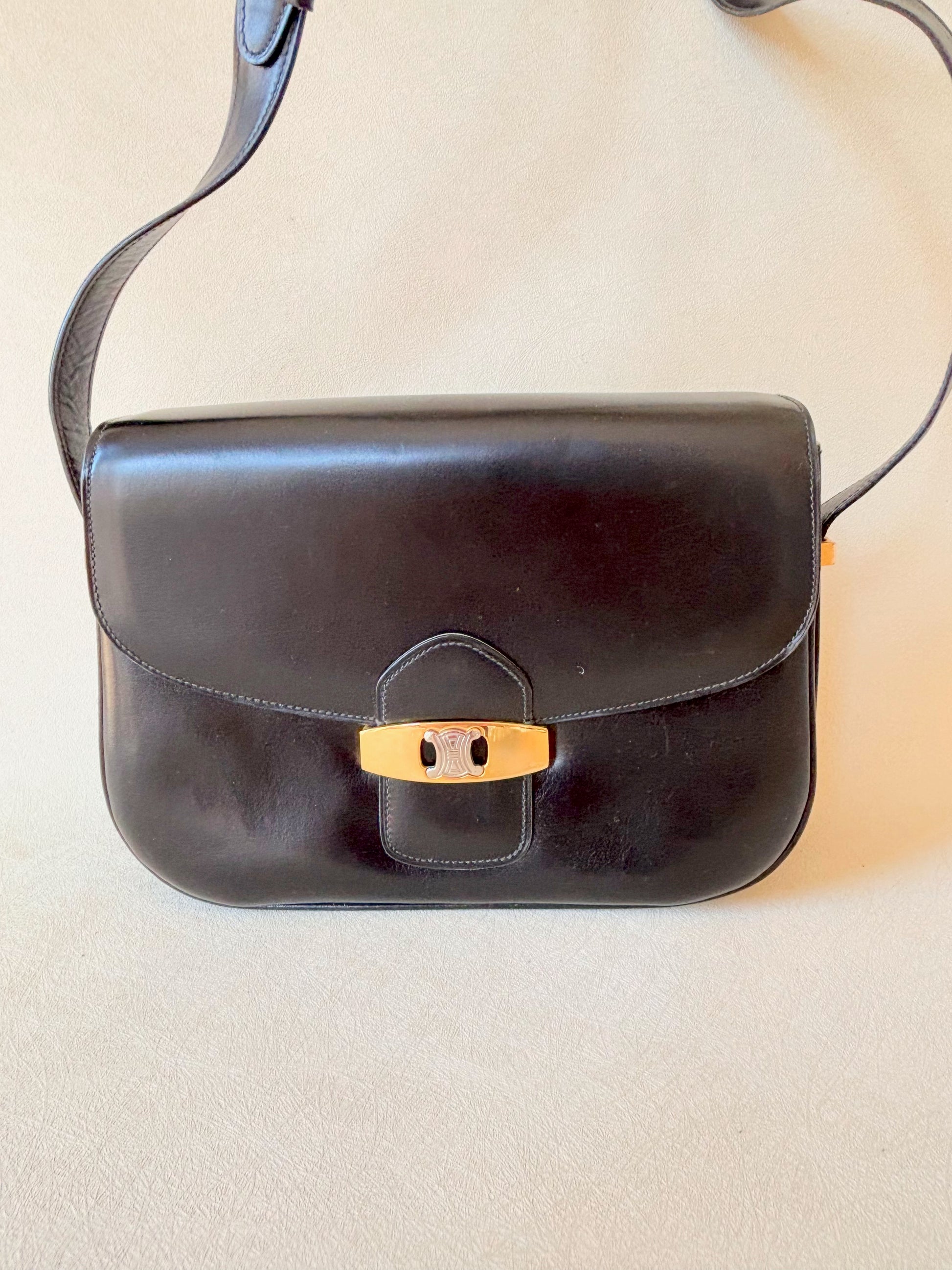 * Sac à rabat en cuir noir, fermoir à passant en métal doré à l'effigie de la célèbre maille Triomphe