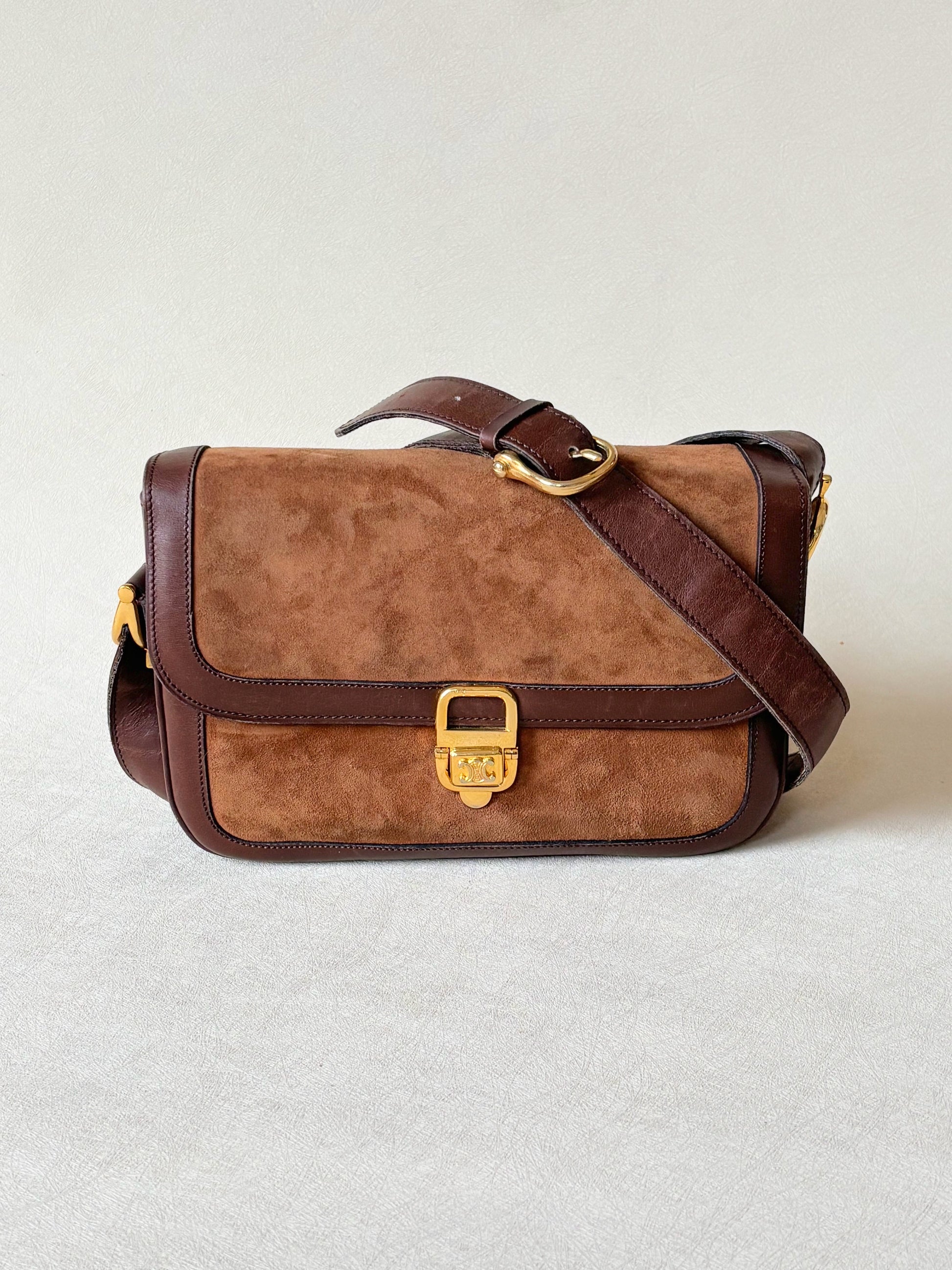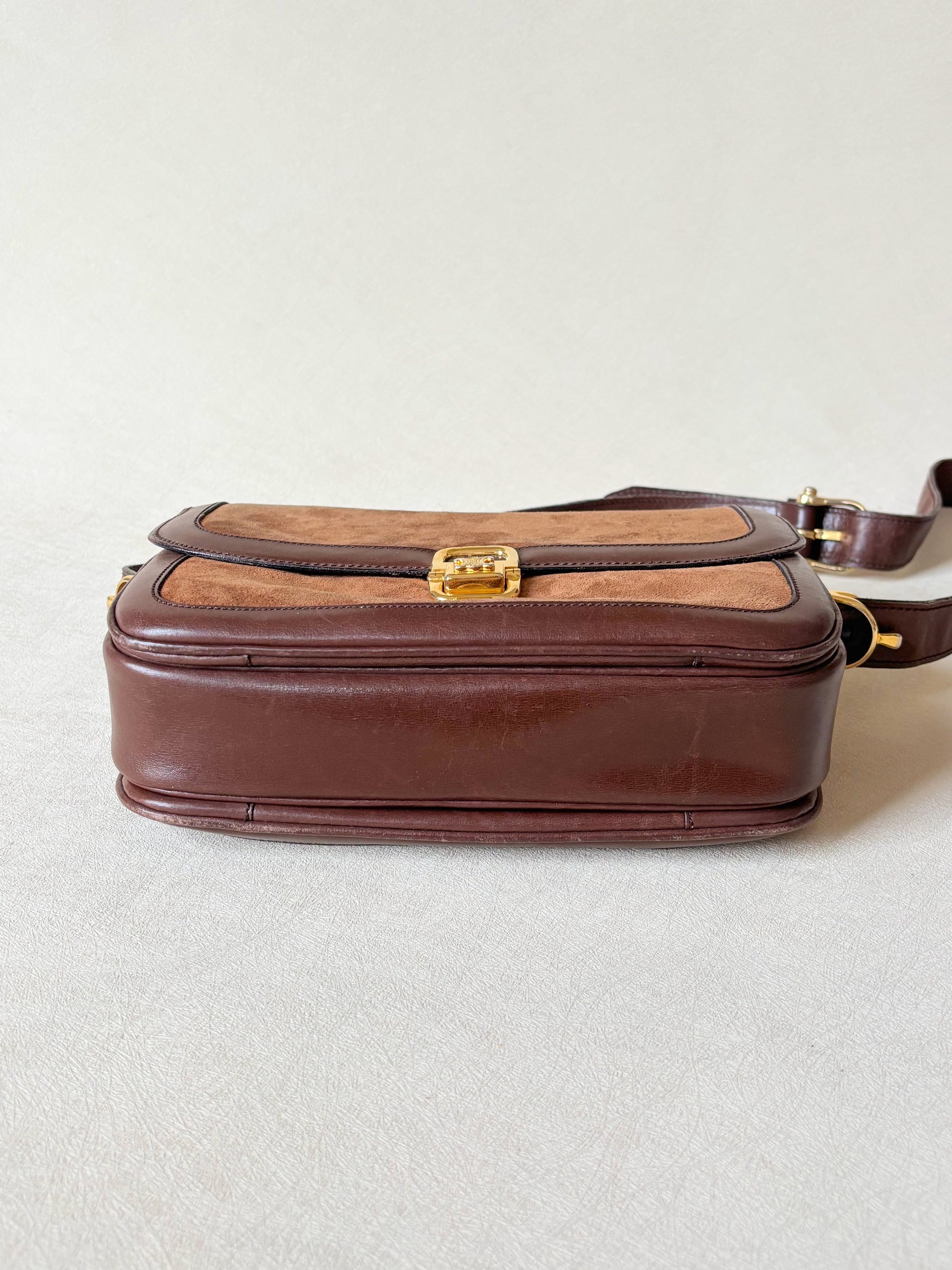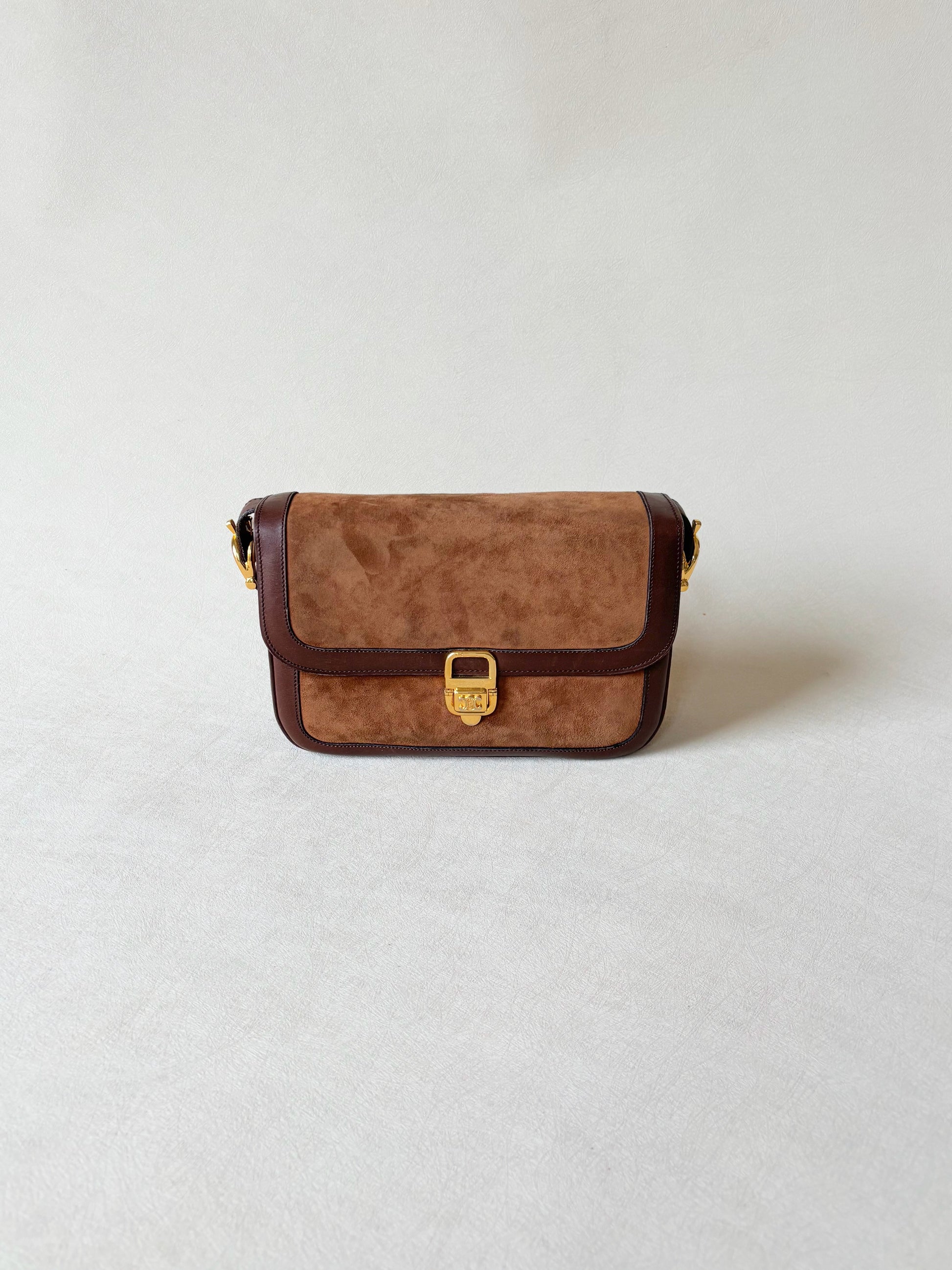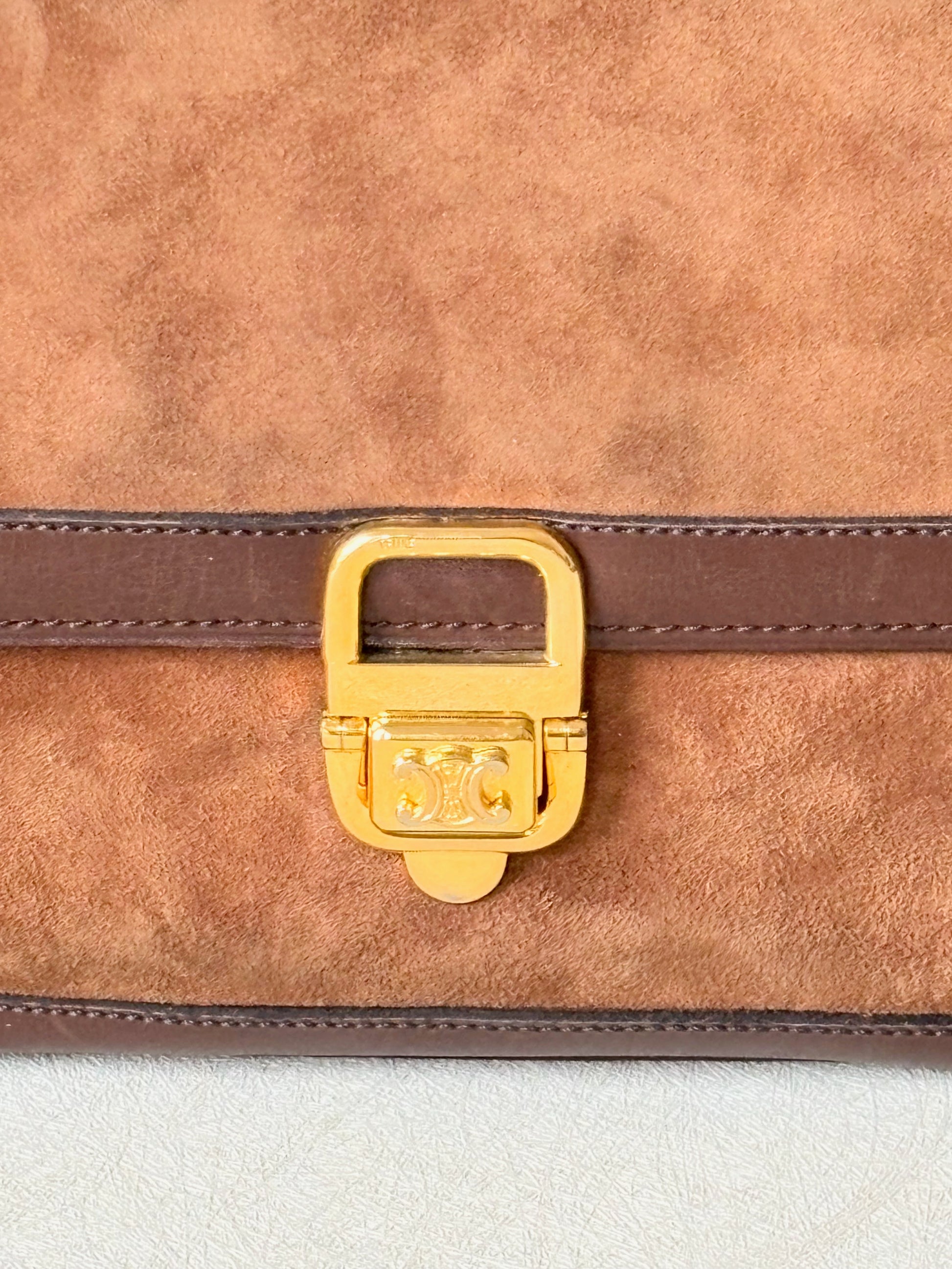 * Sac à rabat en cuir et cuir suédé marron, fermoir Triomphe en métal doré