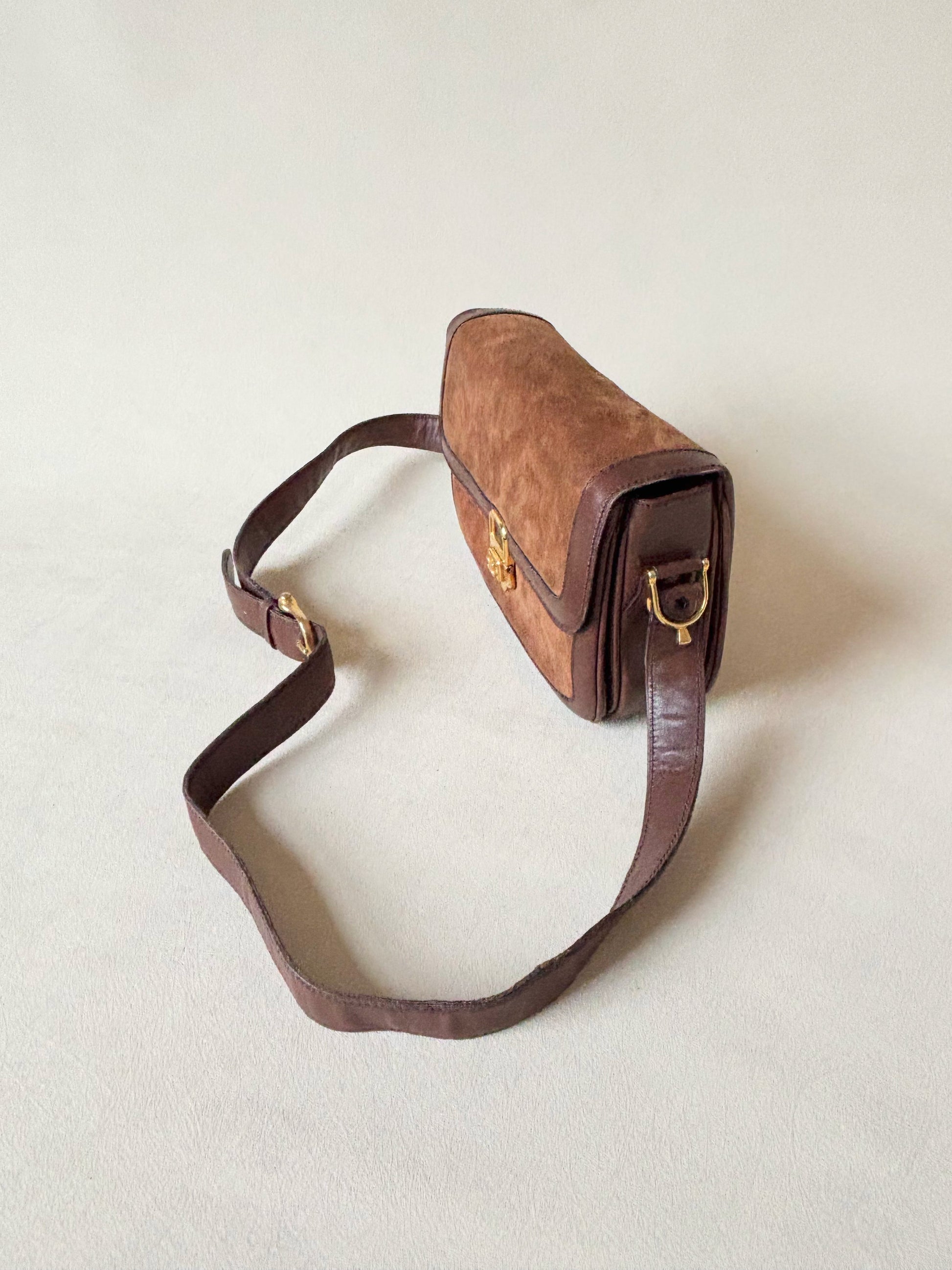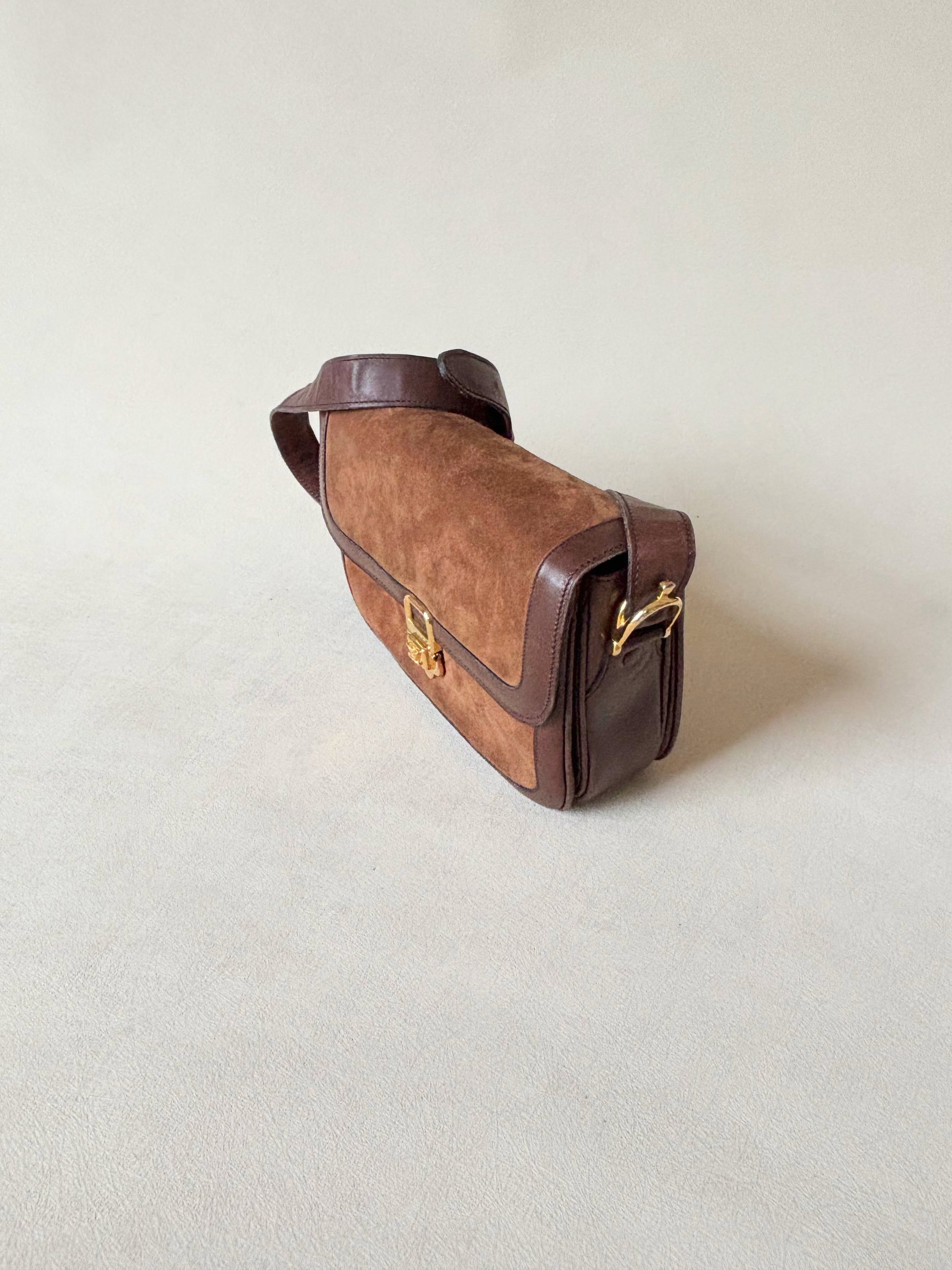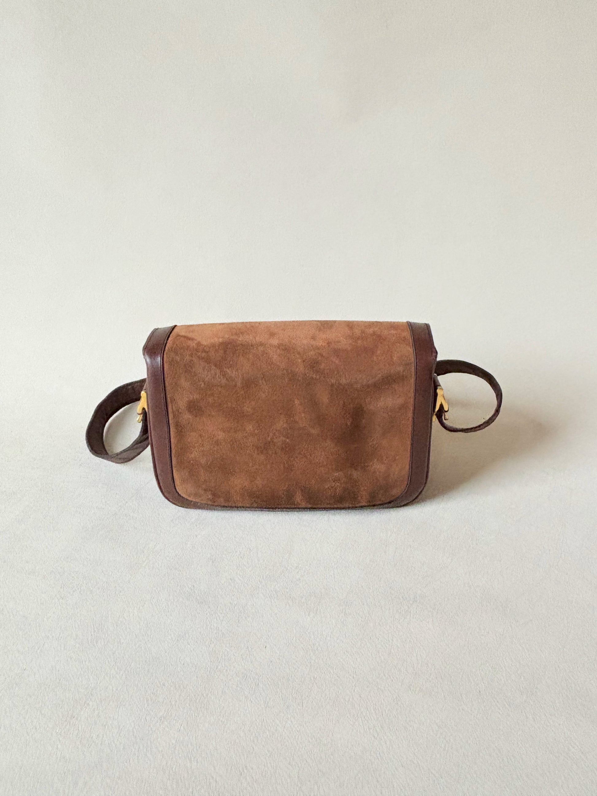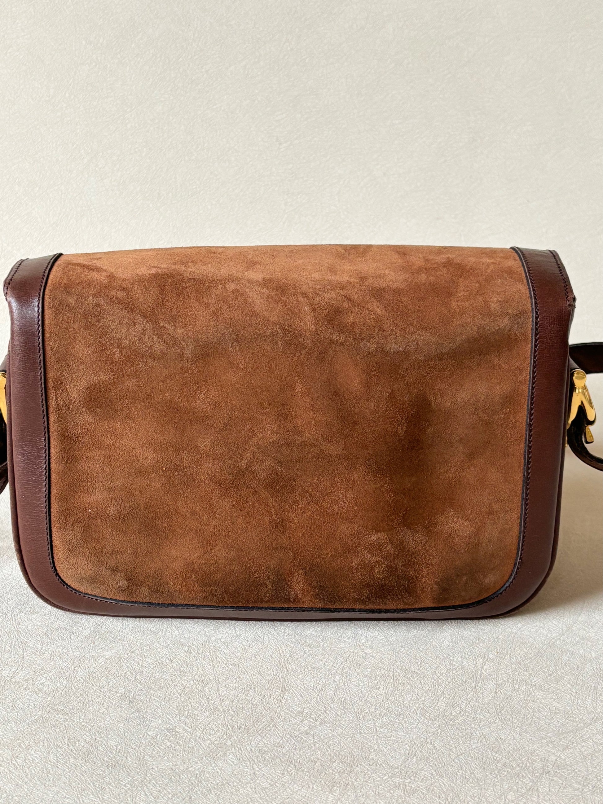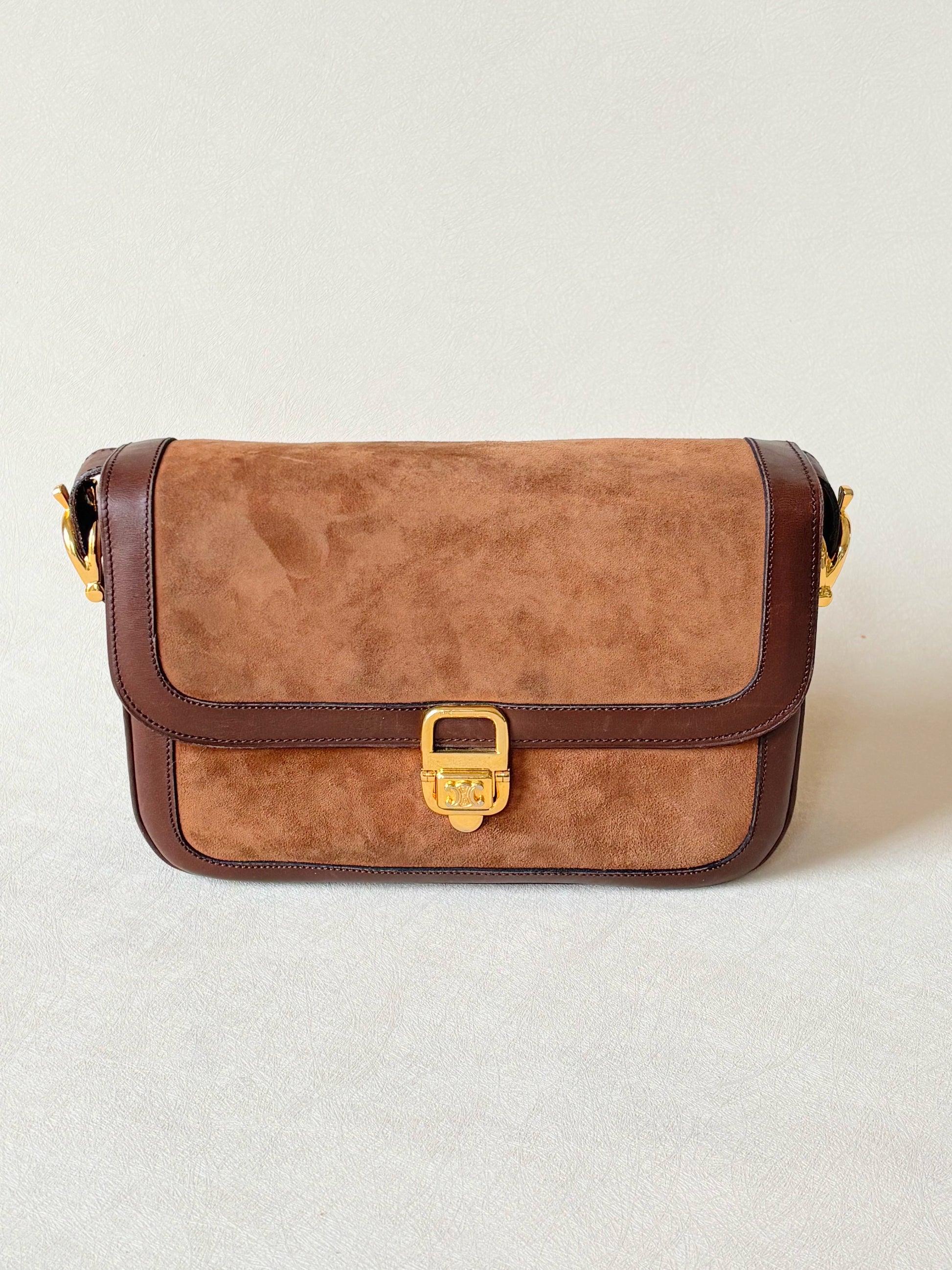 * Sac à rabat en cuir et cuir suédé marron, fermoir Triomphe en métal doré