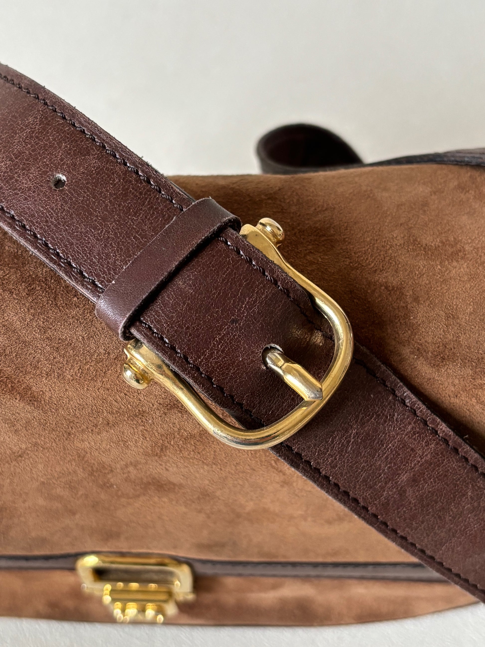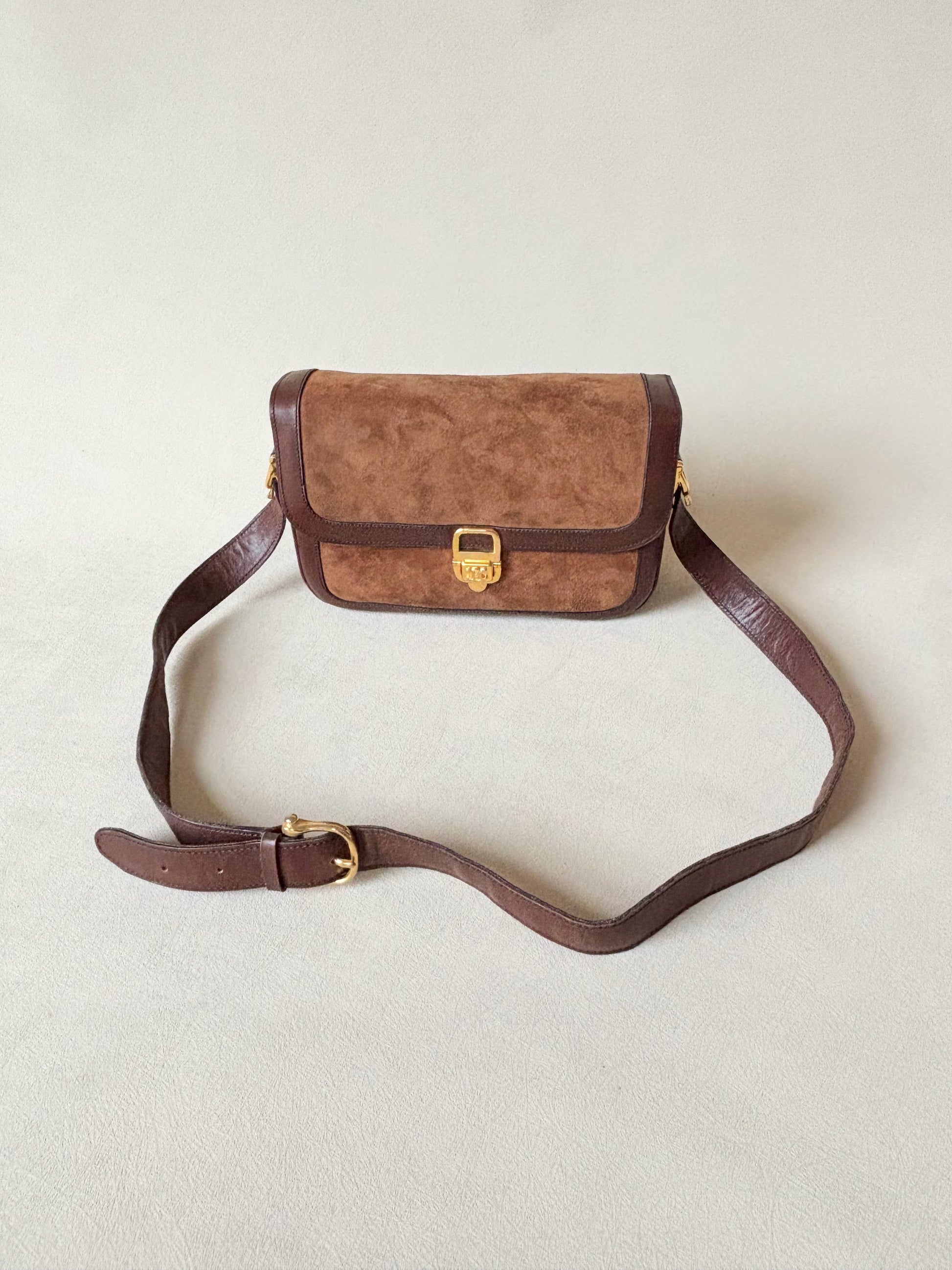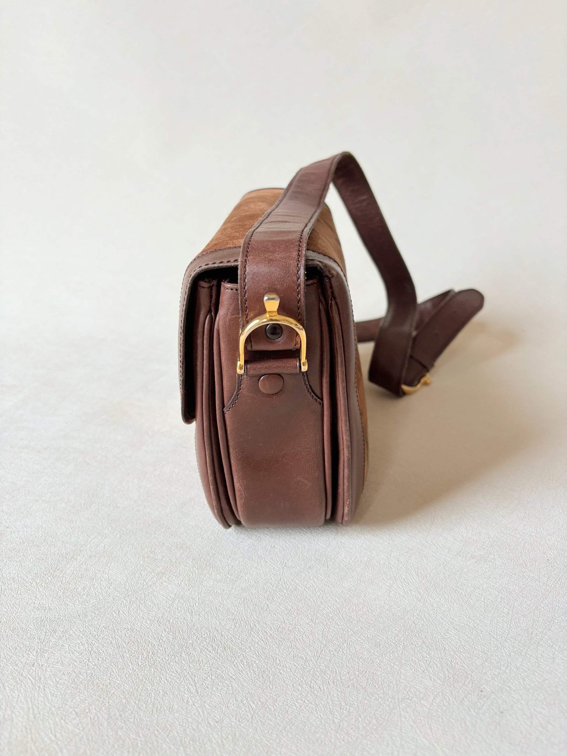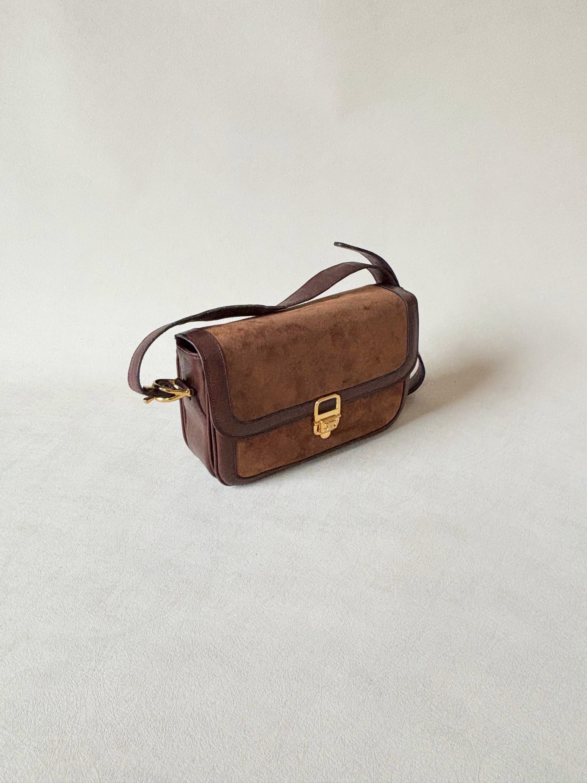* Sac à rabat en cuir et cuir suédé marron, fermoir Triomphe en métal doré