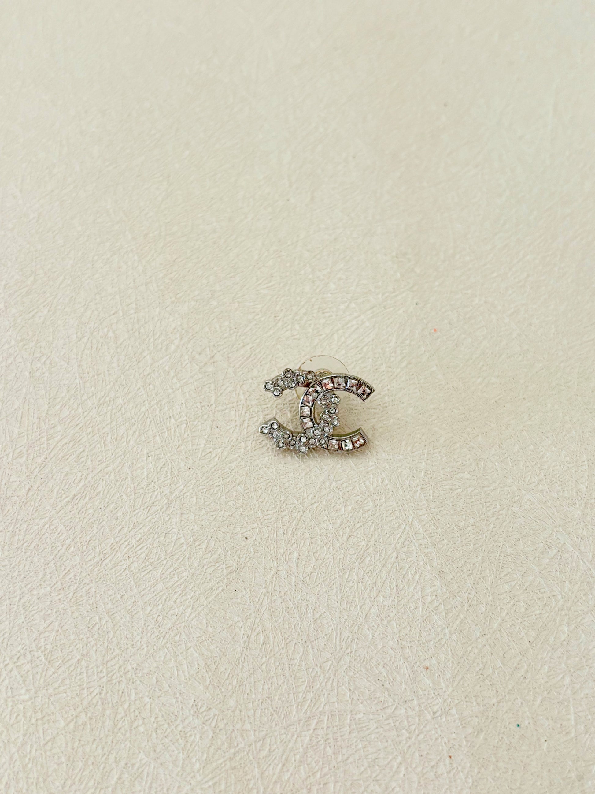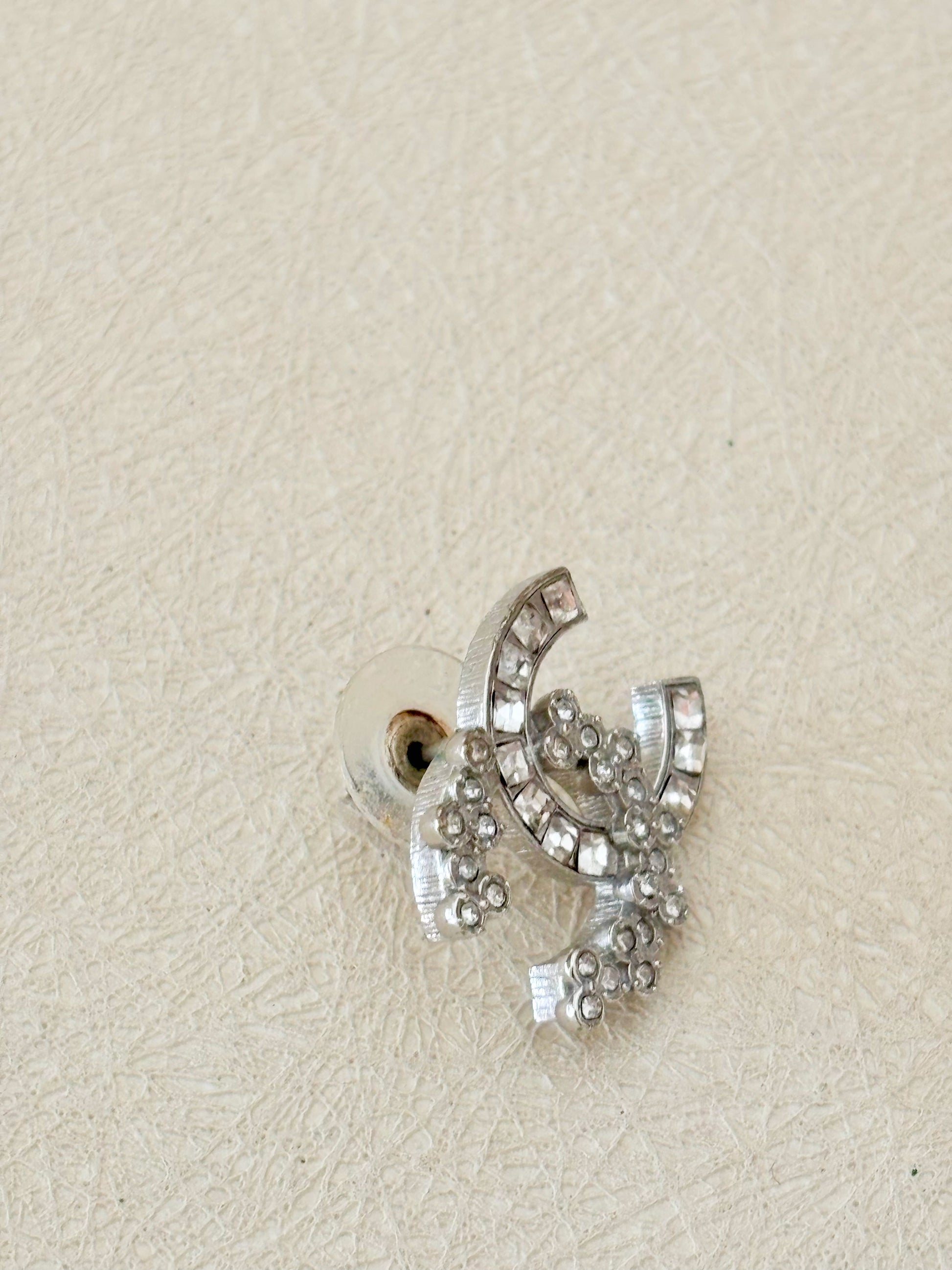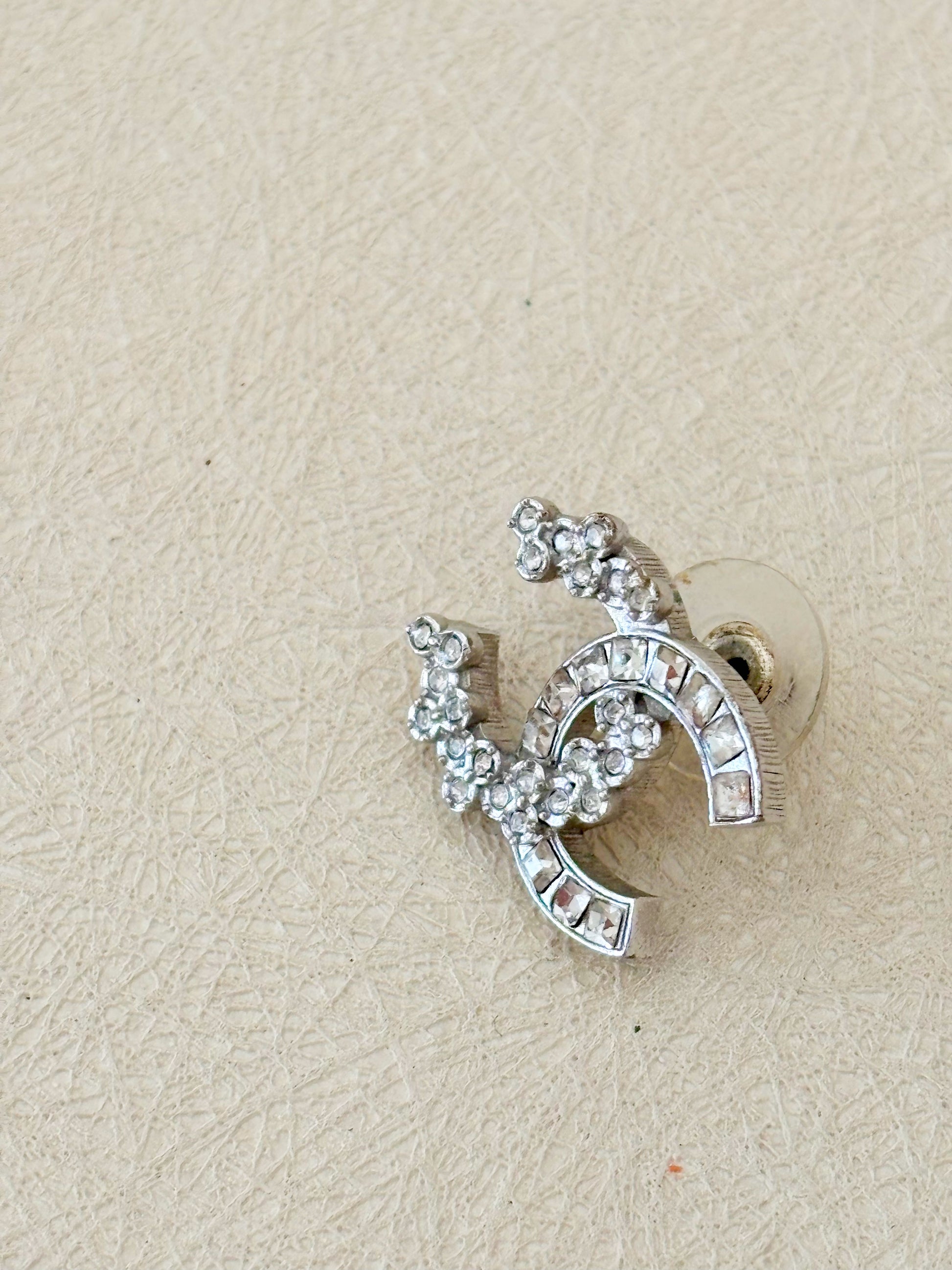 * Logo CC entrelaçé en métal argenté strillé, serti de strass de forme carrée sur une partie et de forme ronde sur l'autre