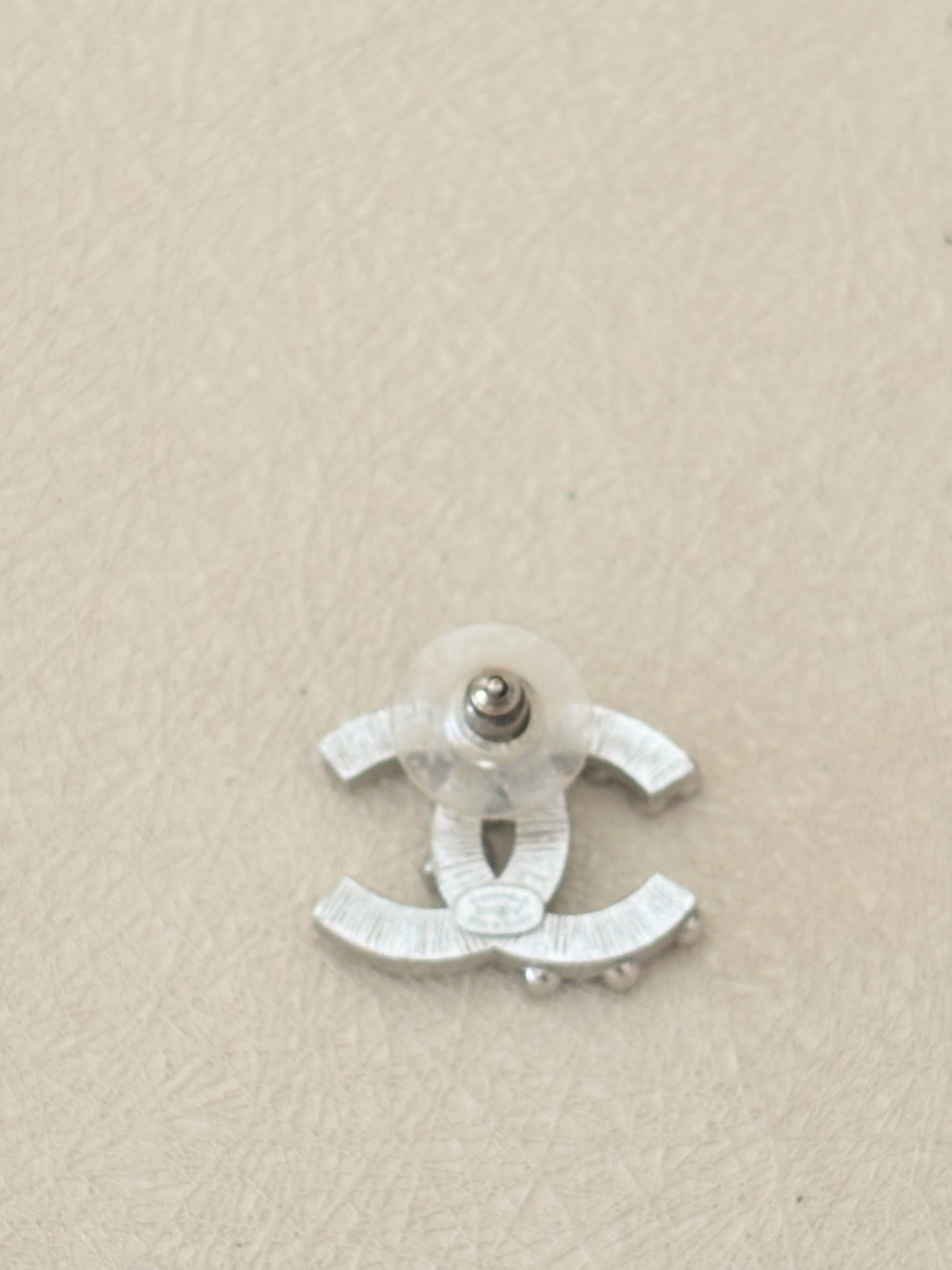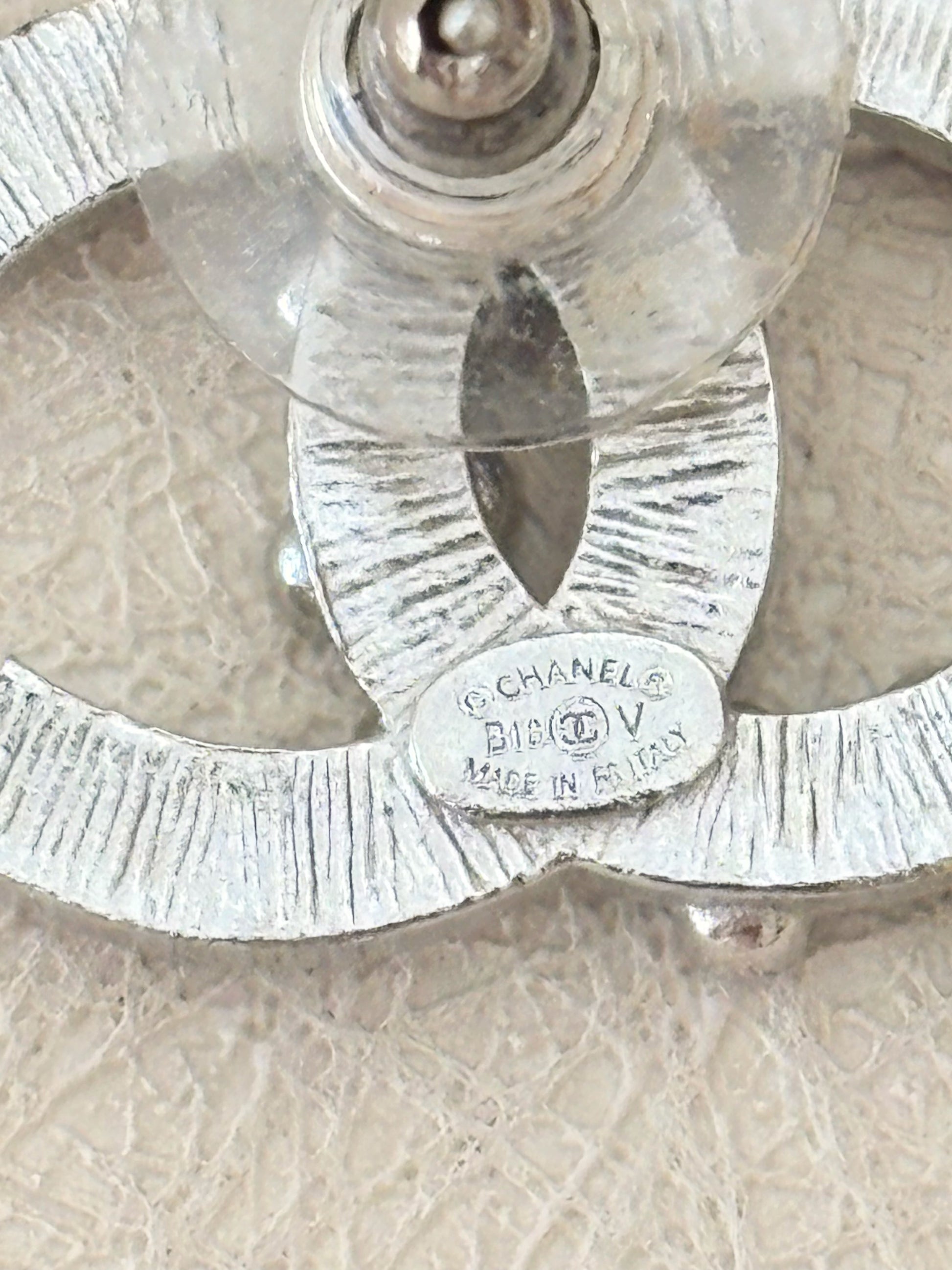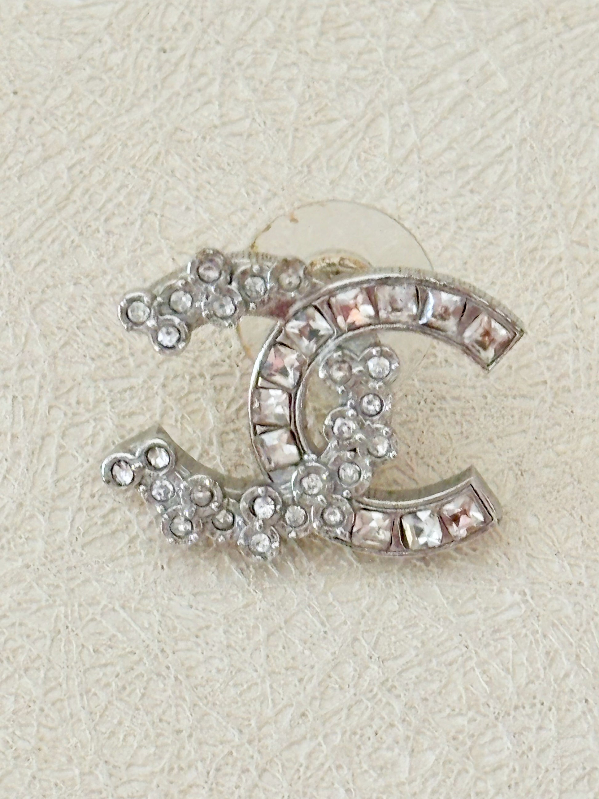 * Logo CC entrelaçé en métal argenté strillé, serti de strass de forme carrée sur une partie et de forme ronde sur l'autre