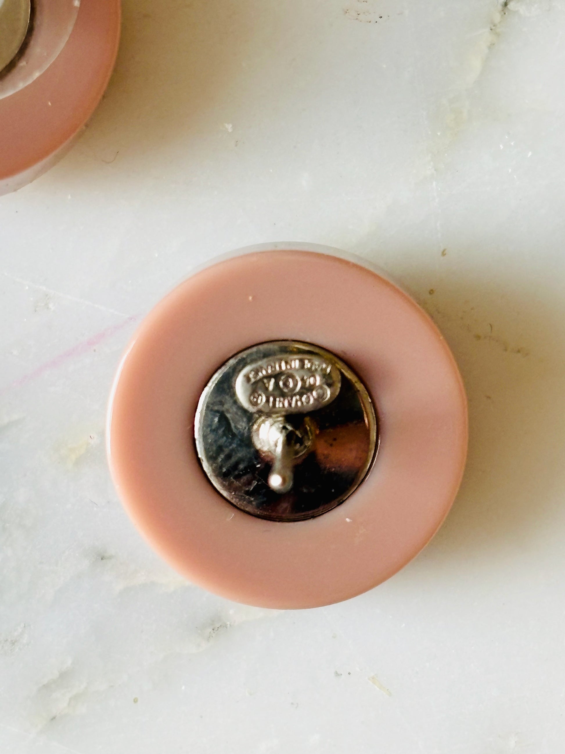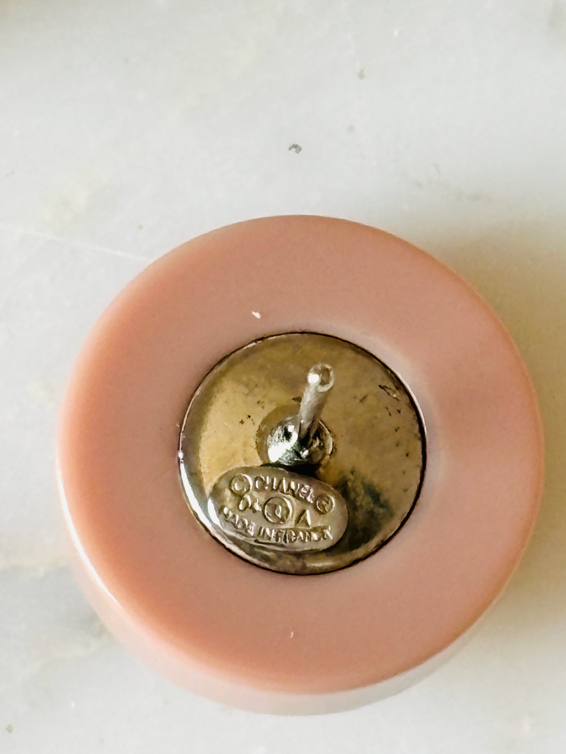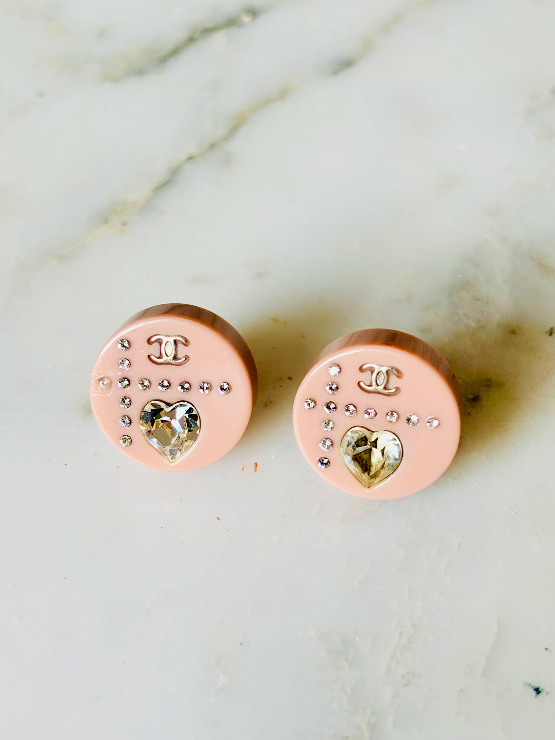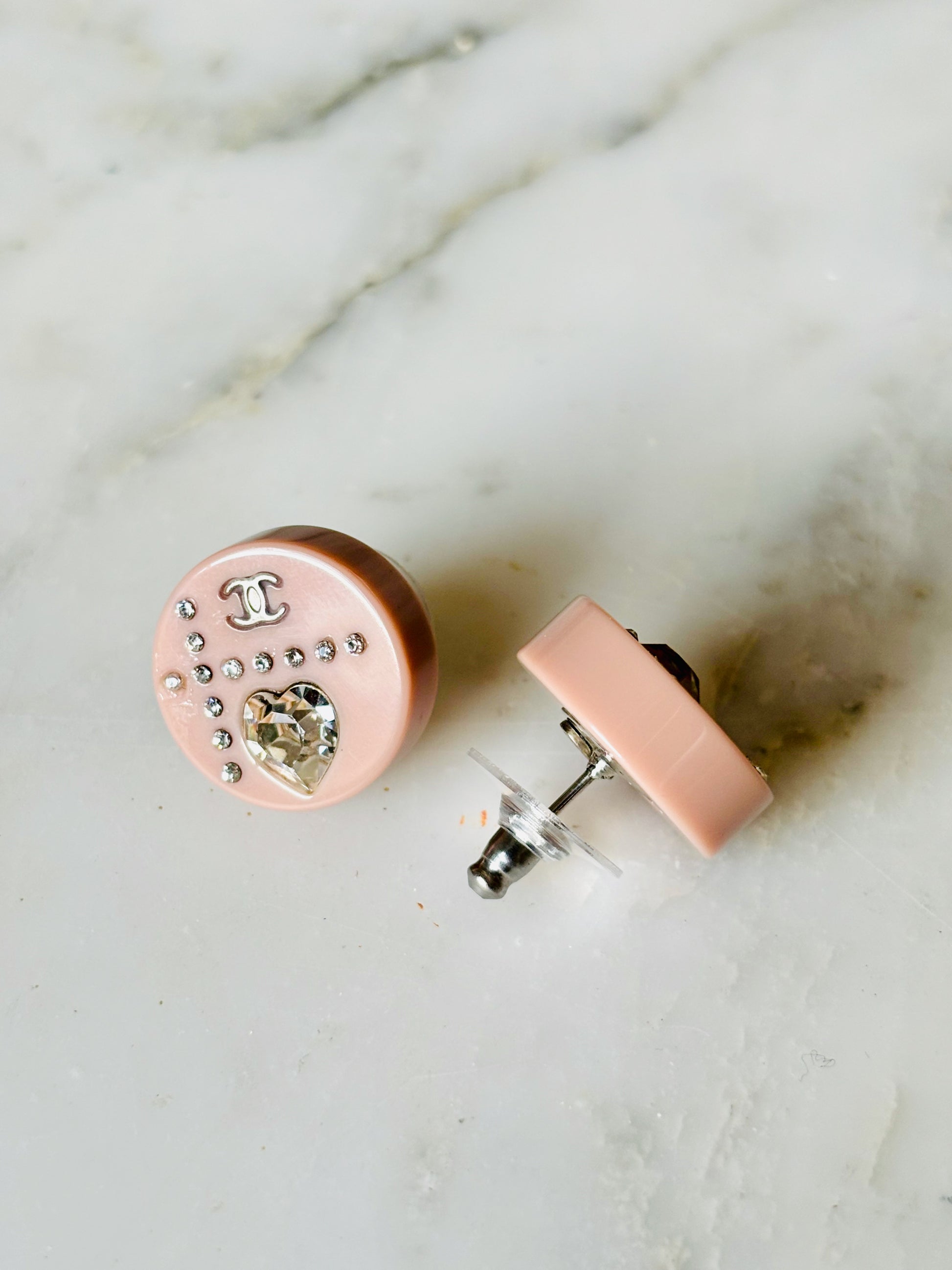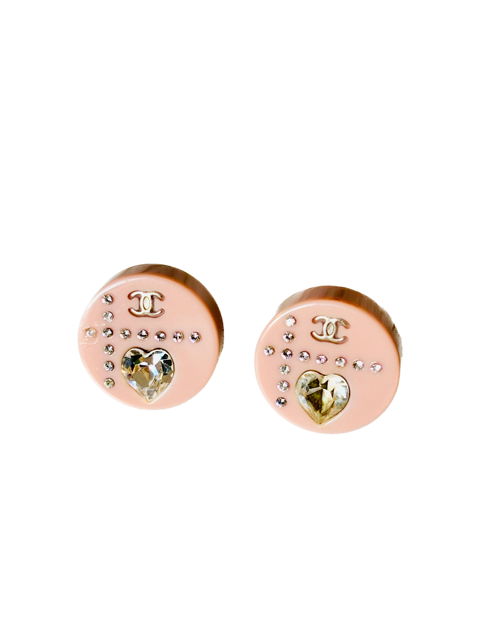 * En résine rose pâle, logo CC en métal argenté, serti de strass en forme de coeur