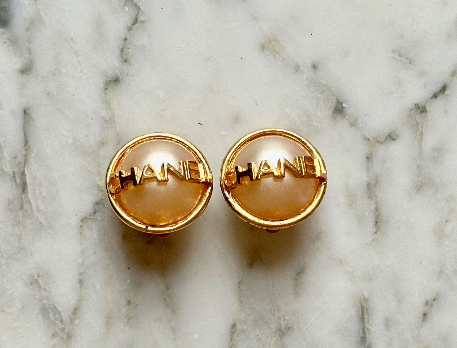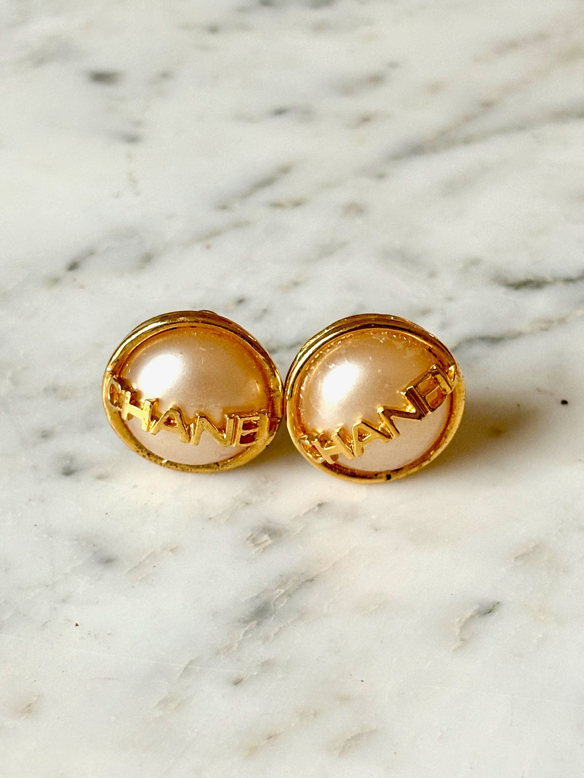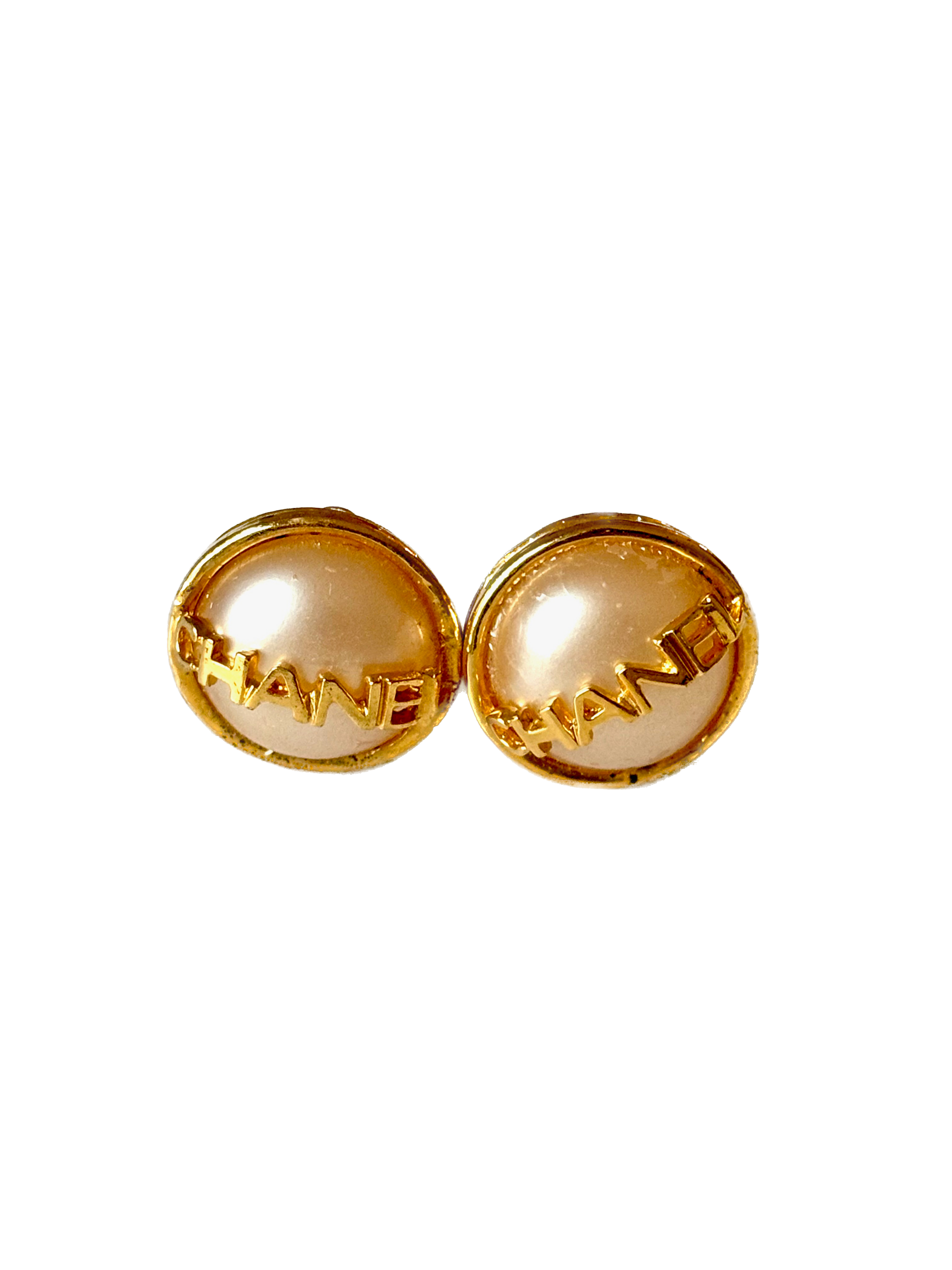 * En métal doré et perles nacrées, CHANEL en lettres dorées incrustées sur la perle