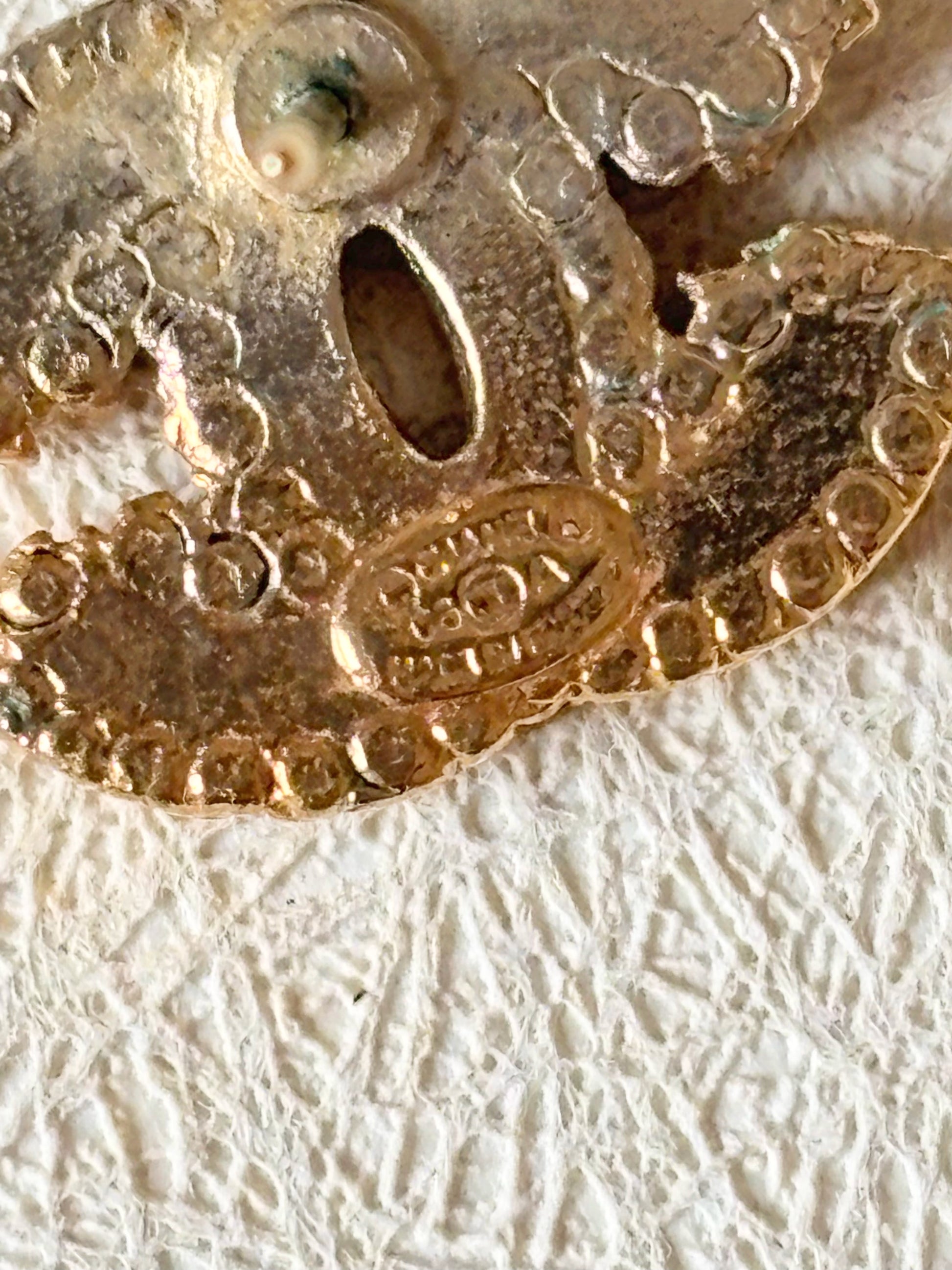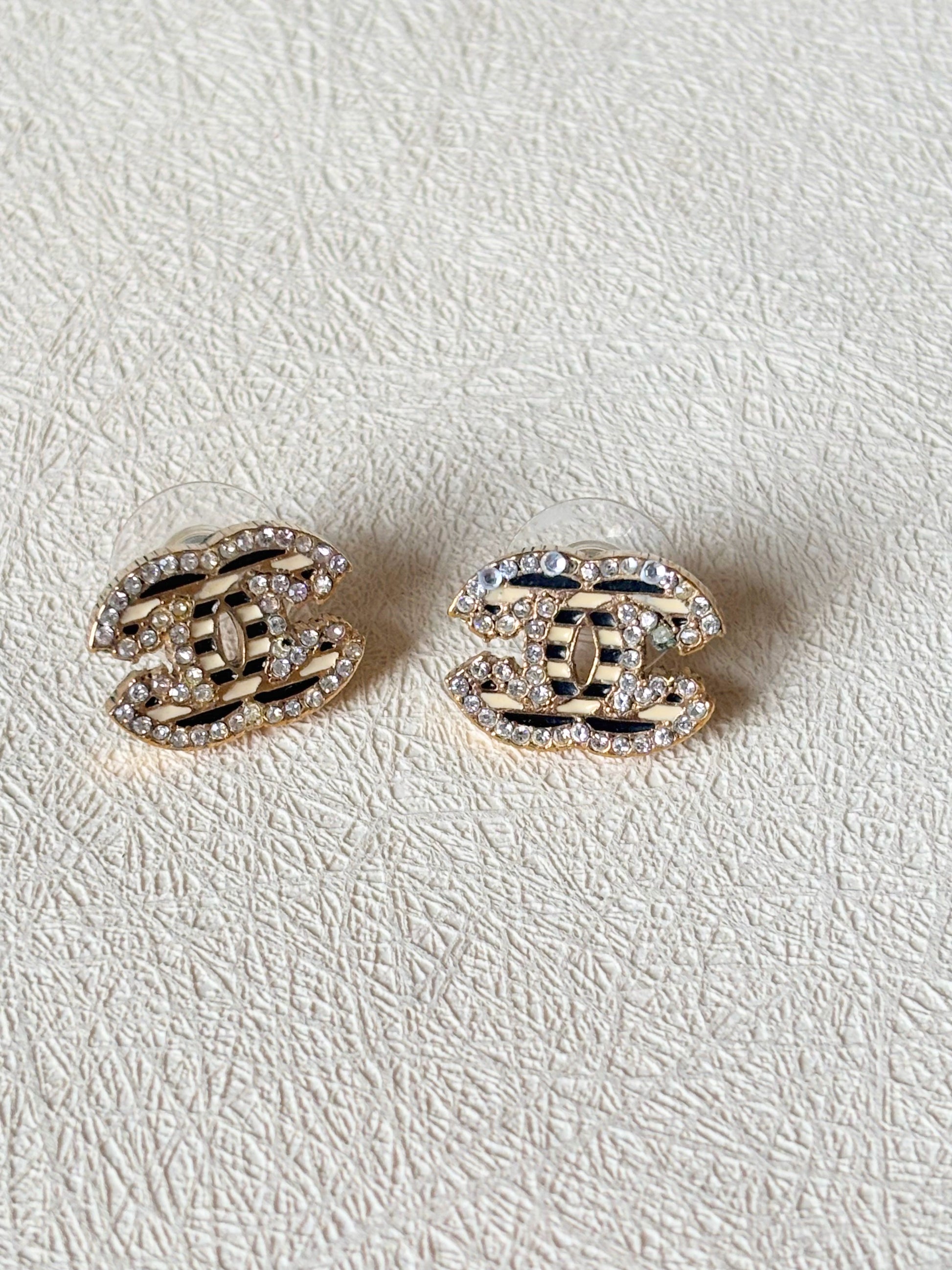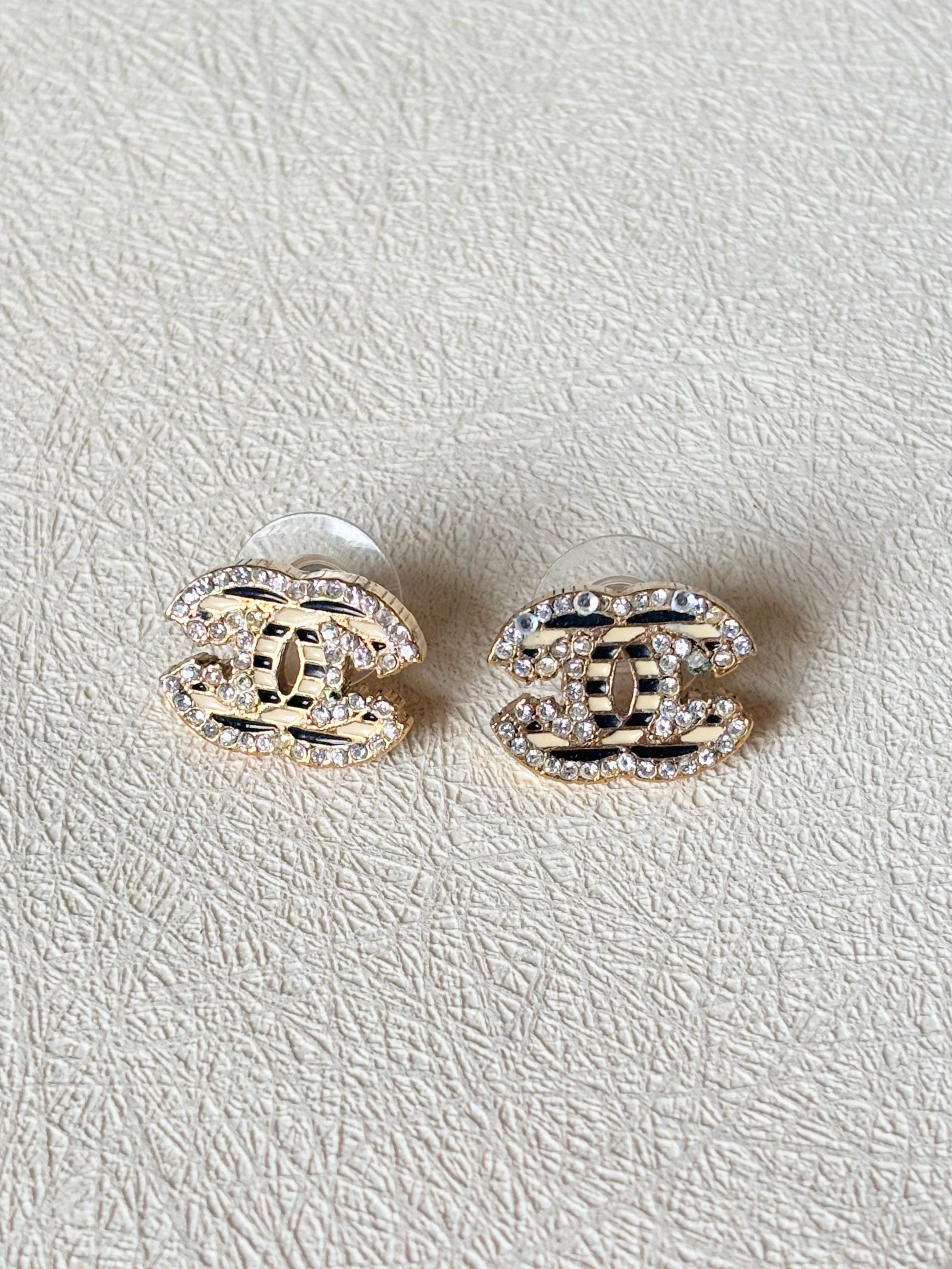 * En métal doré martelé, logo CC à rayures noires et blanches, bordure incrustée de strass