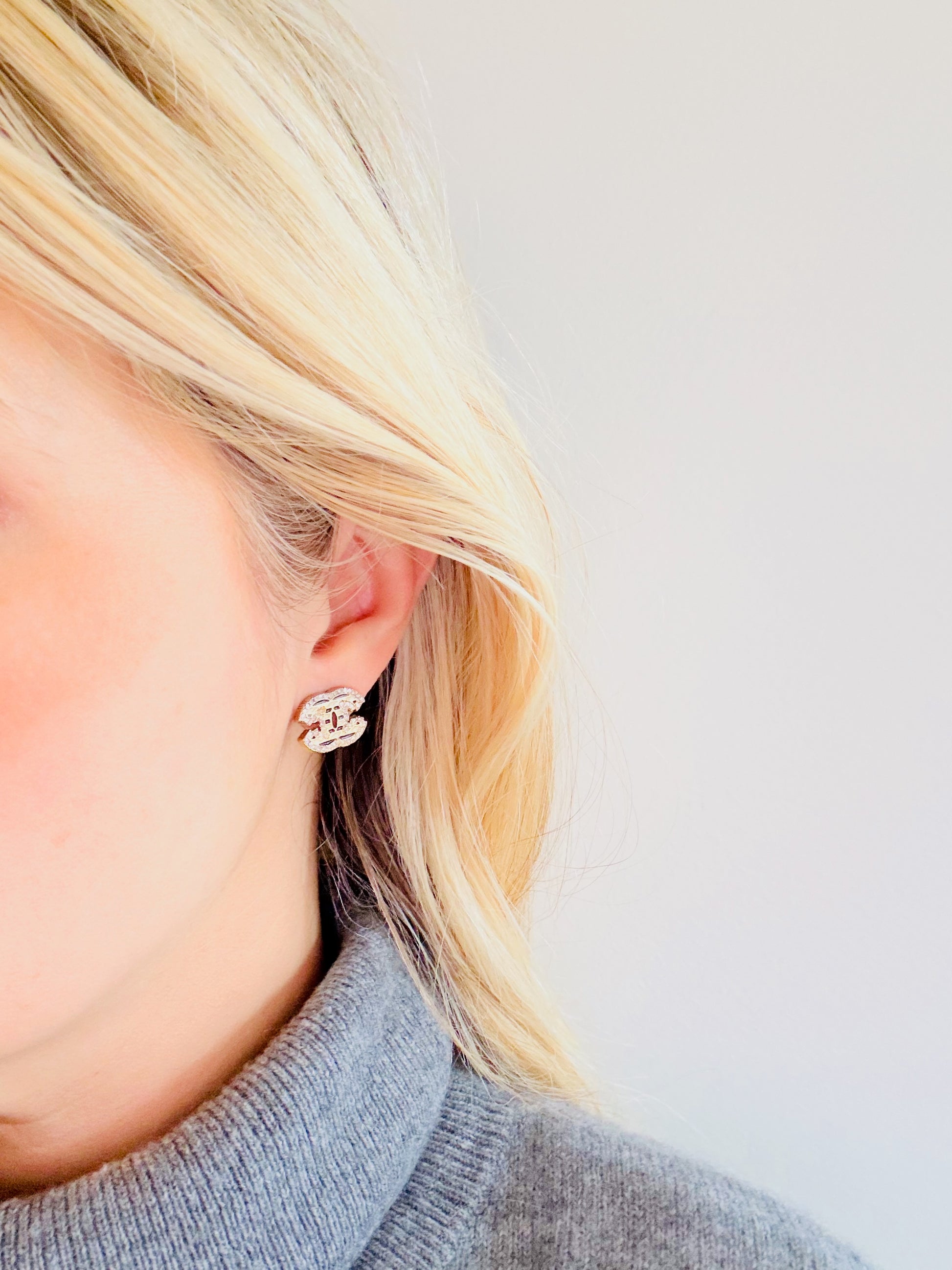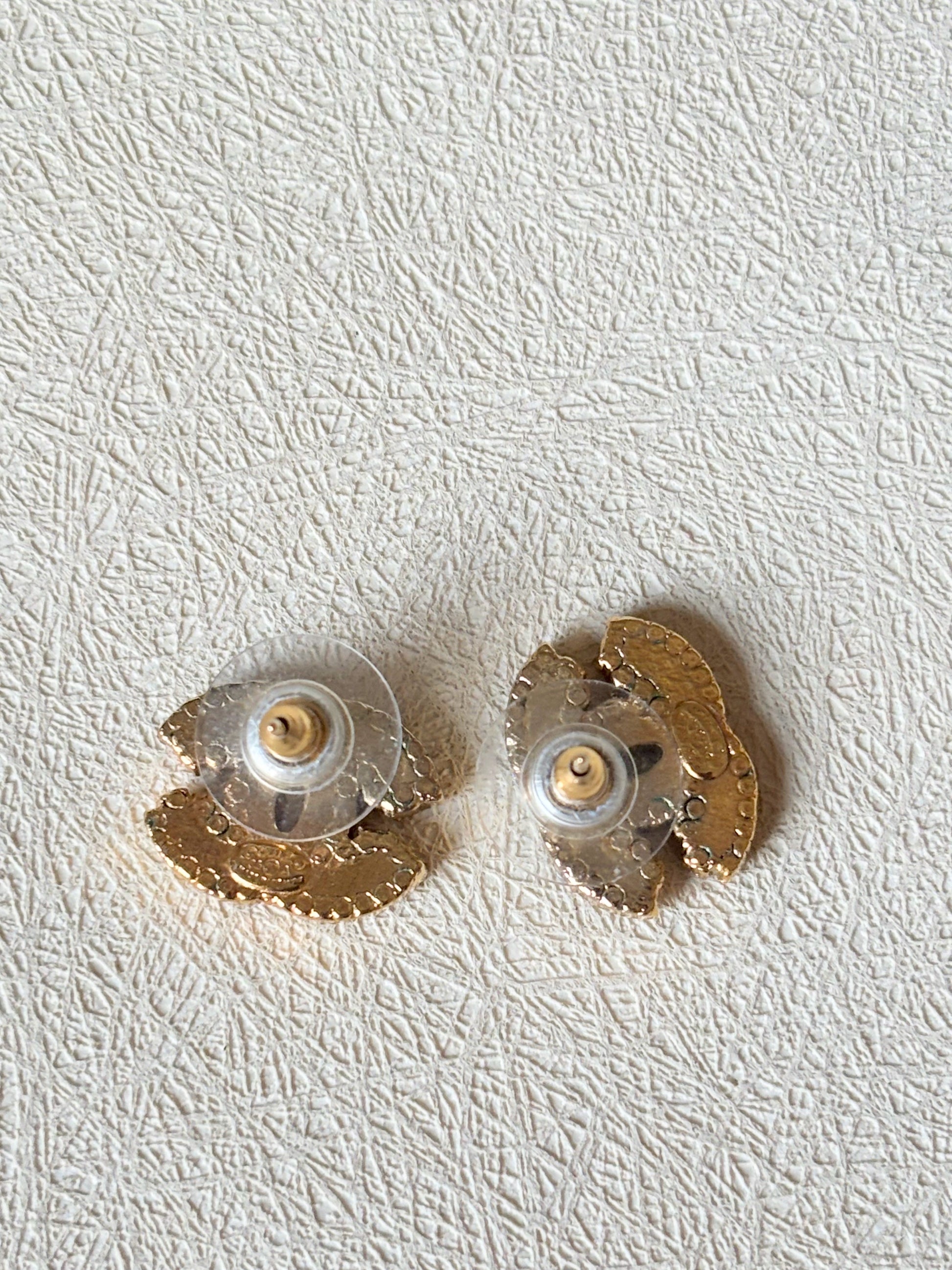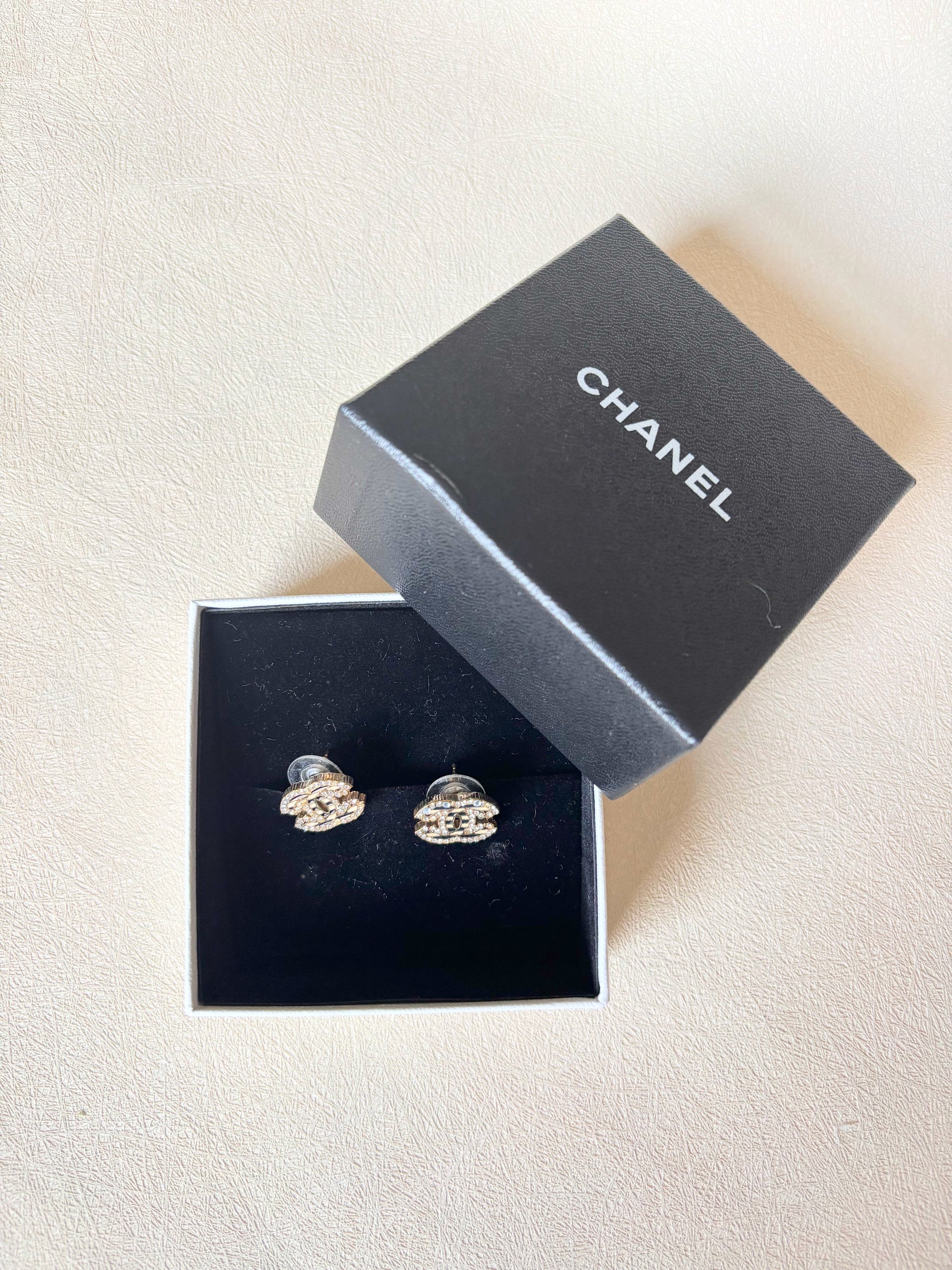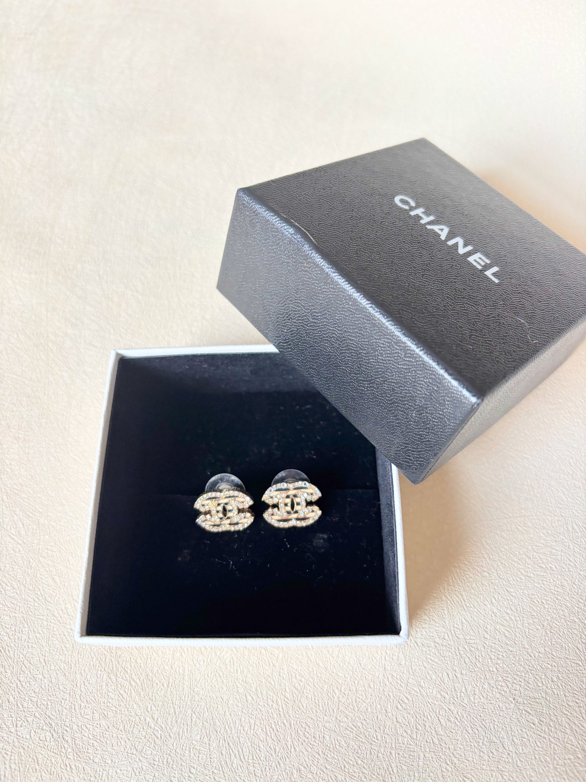 * En métal doré martelé, logo CC à rayures noires et blanches, bordure incrustée de strass