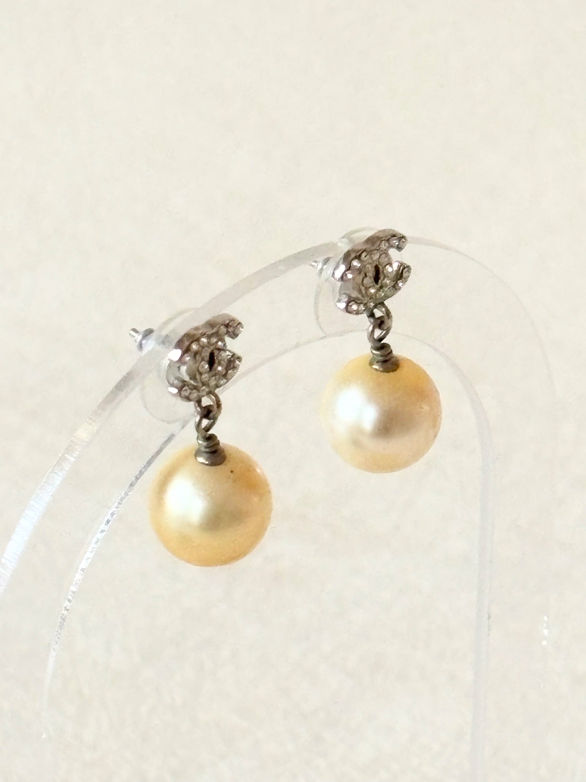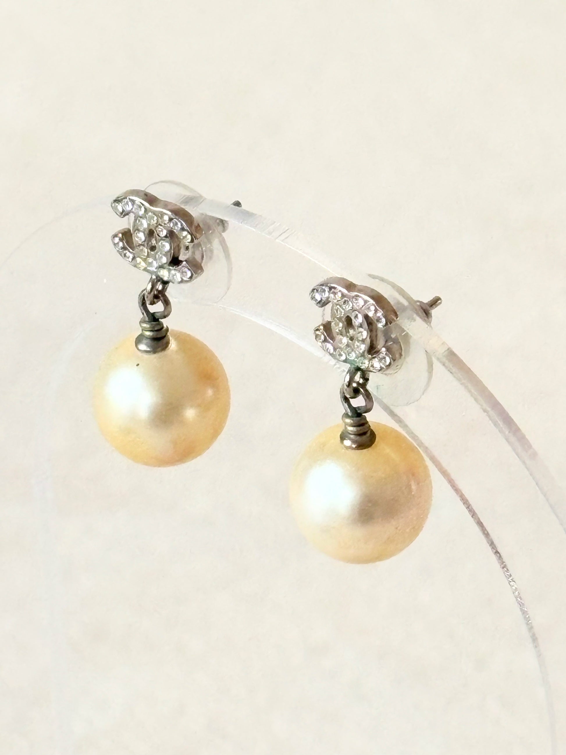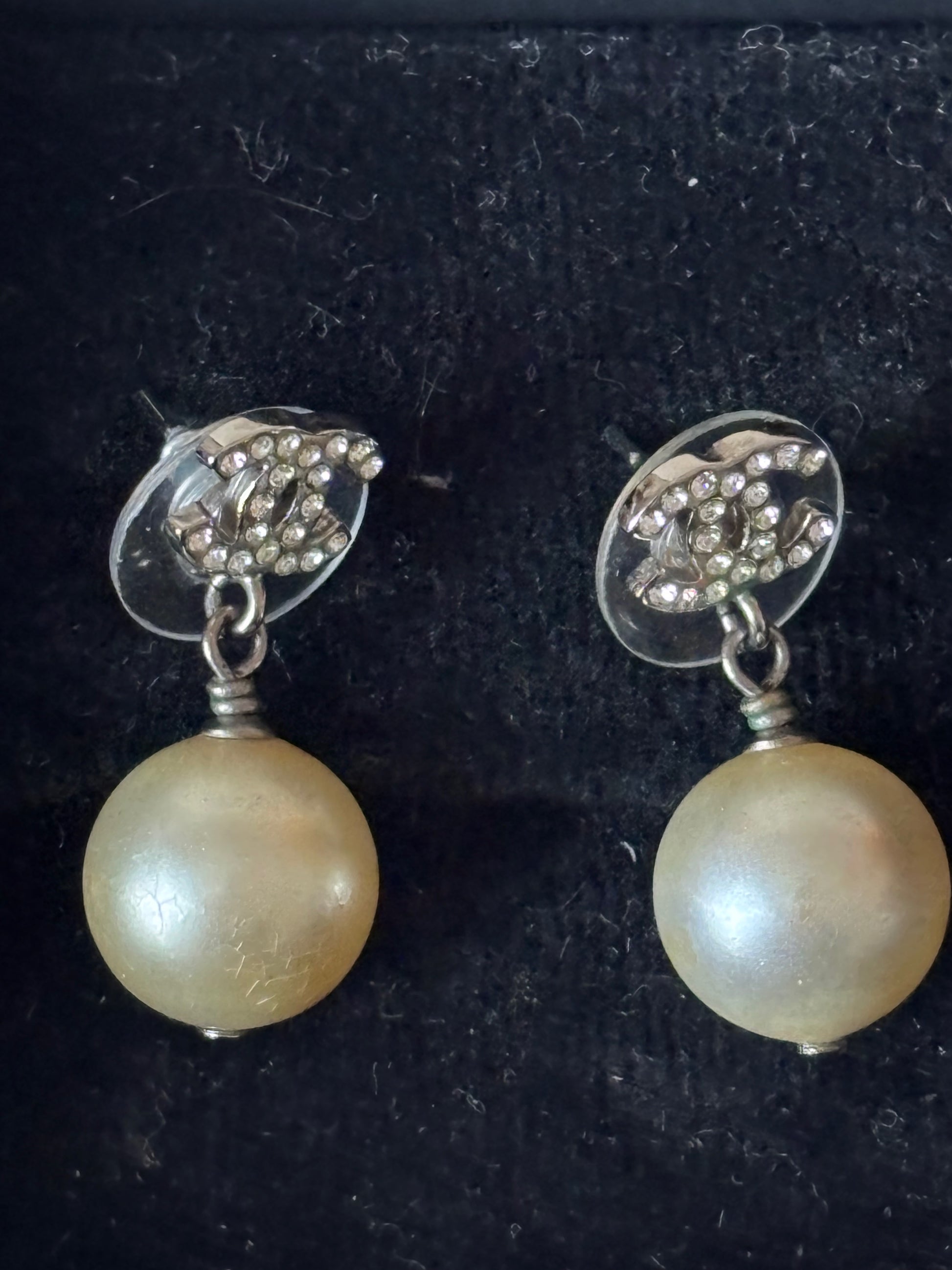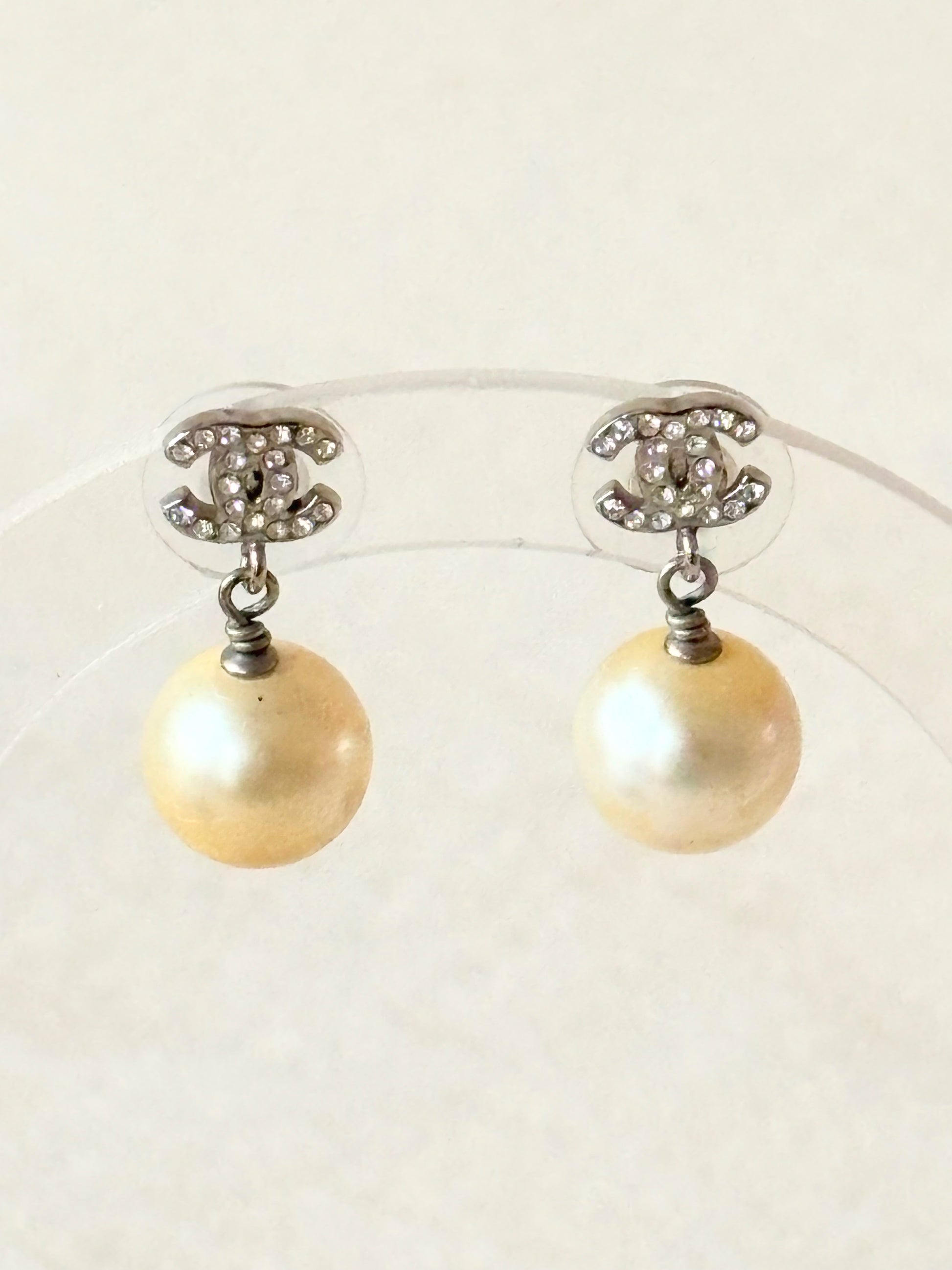* Logo CC en métal argenté, incrusté de strass, et perle nacrée ronde en pendentif