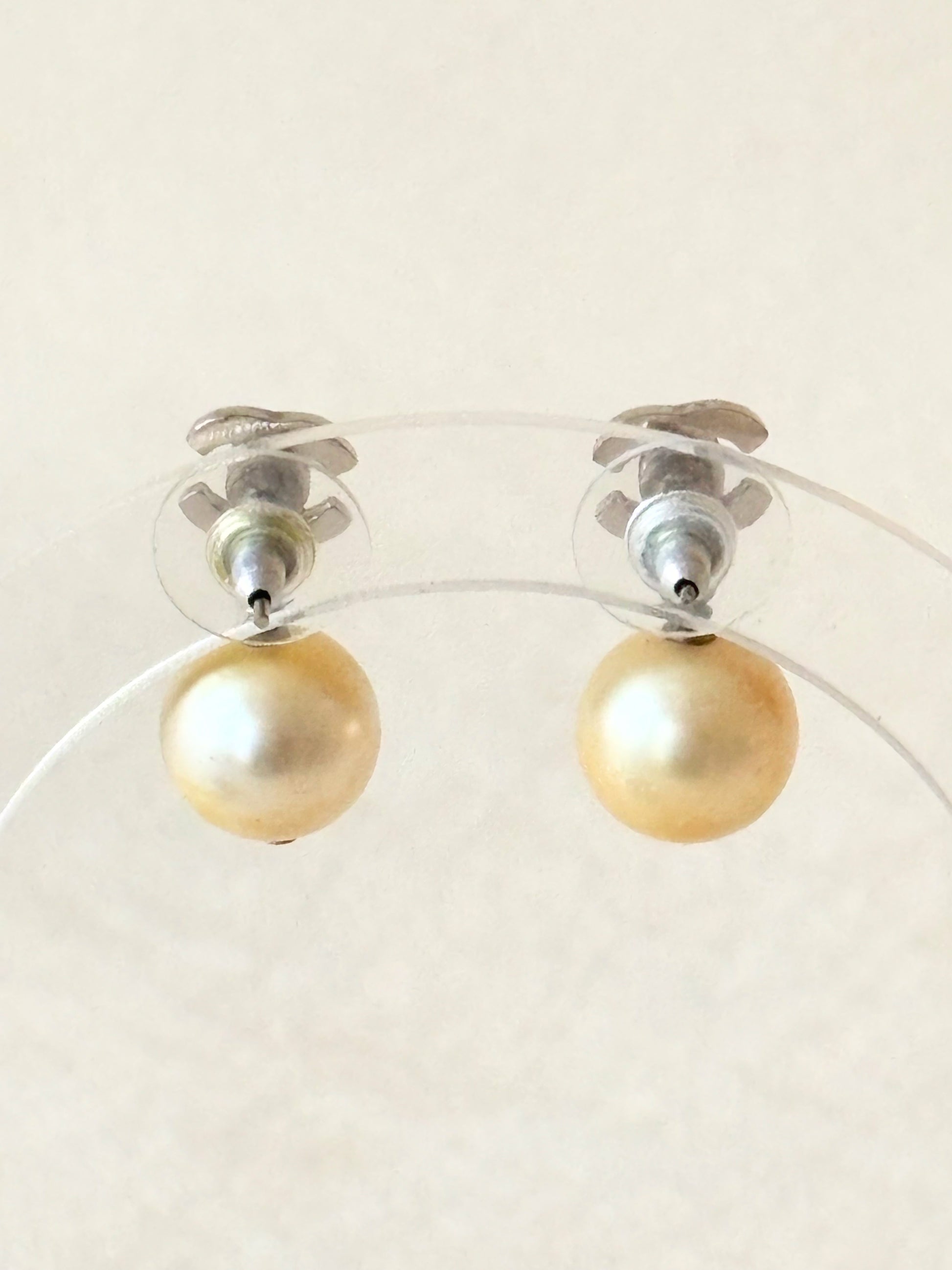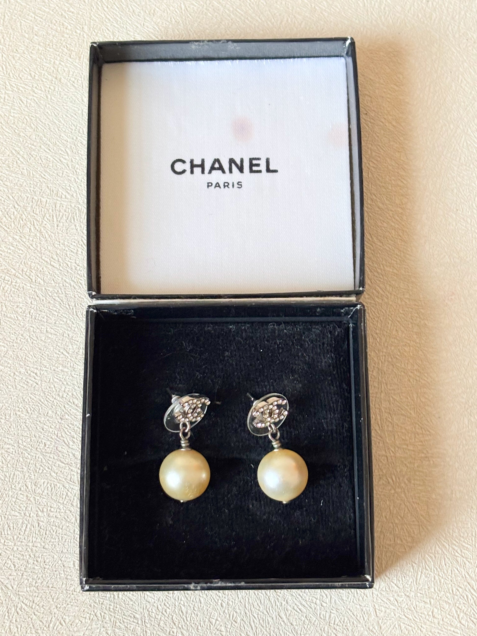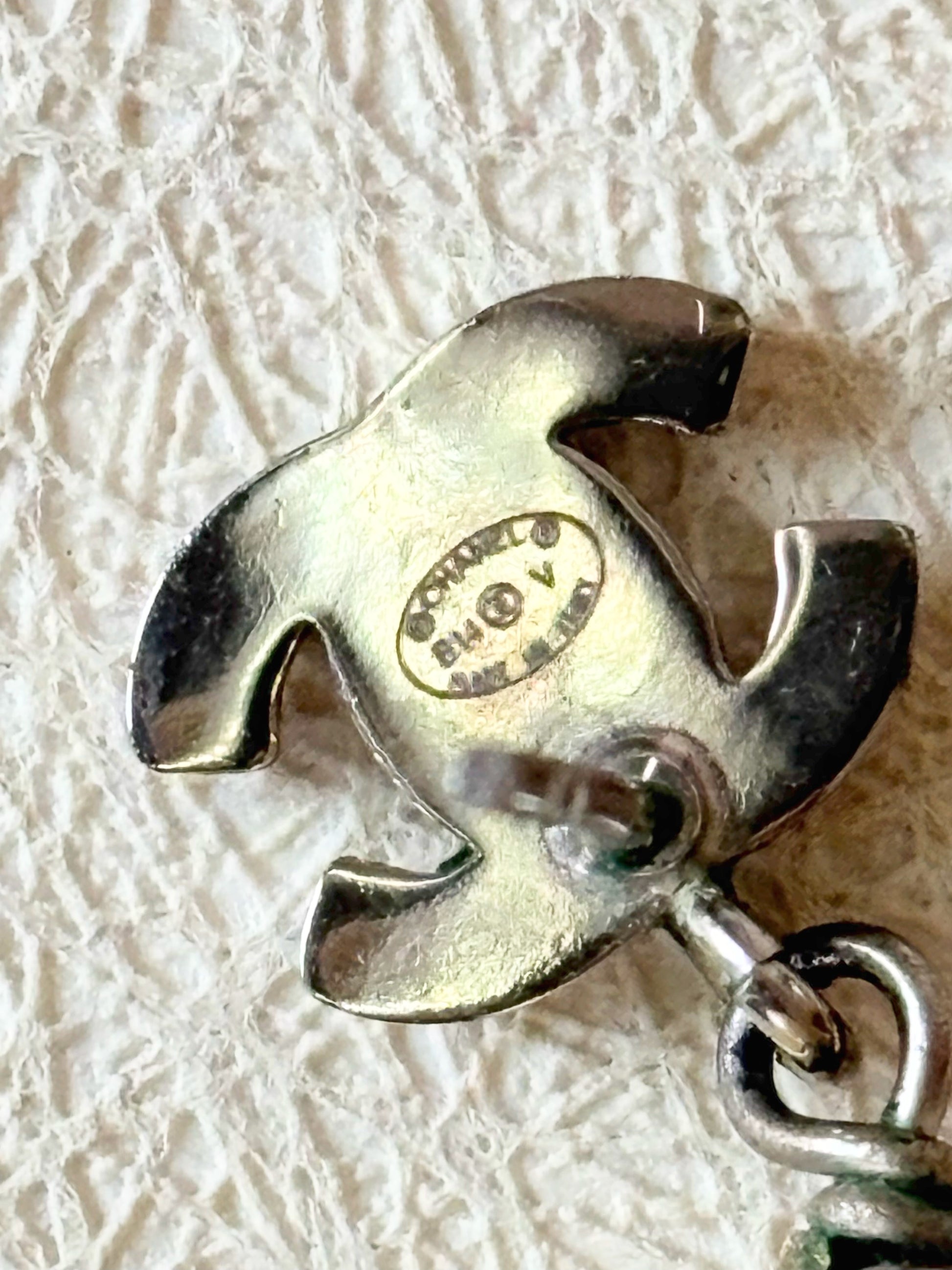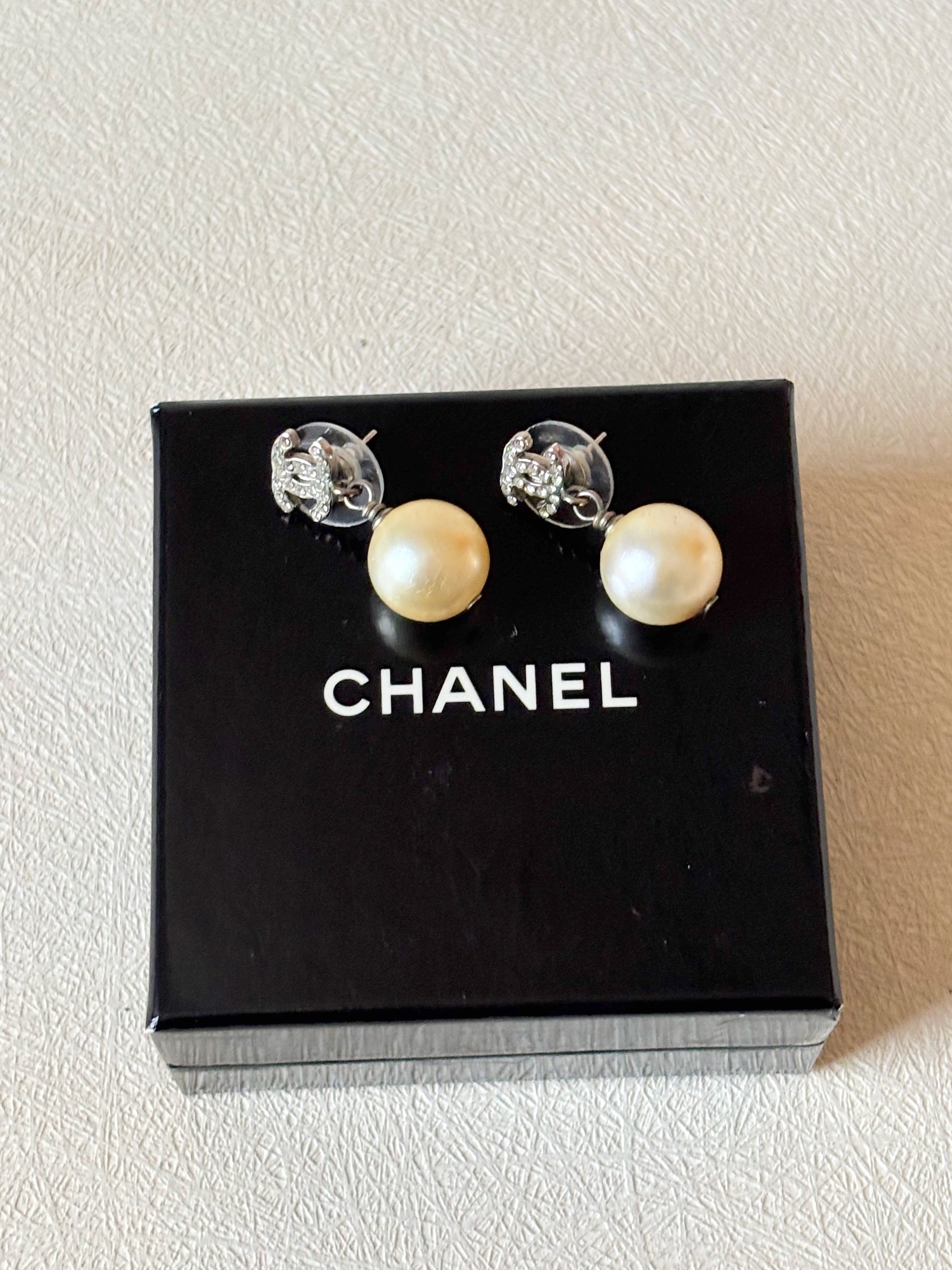 * Logo CC en métal argenté, incrusté de strass, et perle nacrée ronde en pendentif