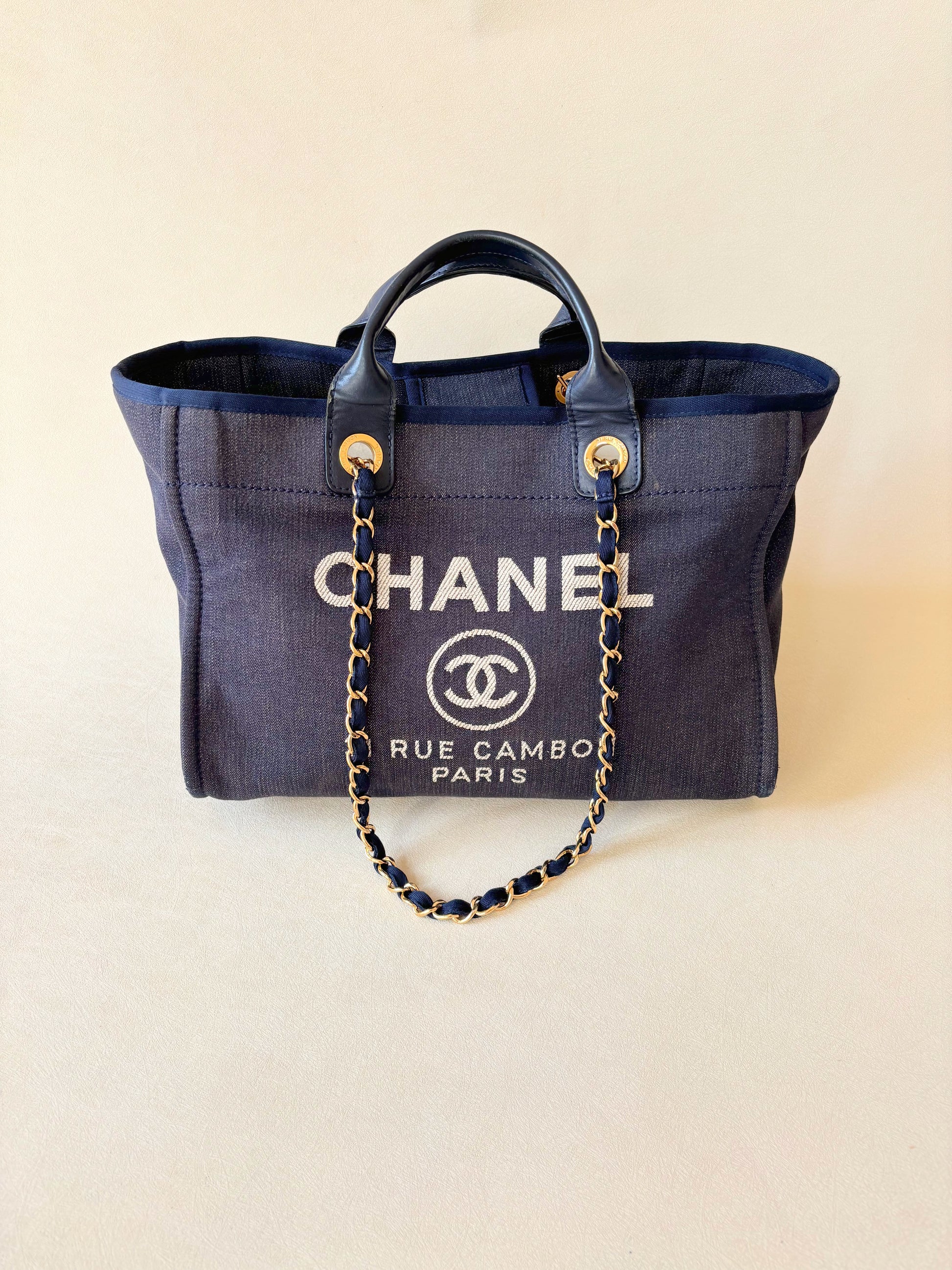 * Chaîne en métal doré entrelacée de denim, pour un porté épaule, et deux anses en cuir marine en parfait état