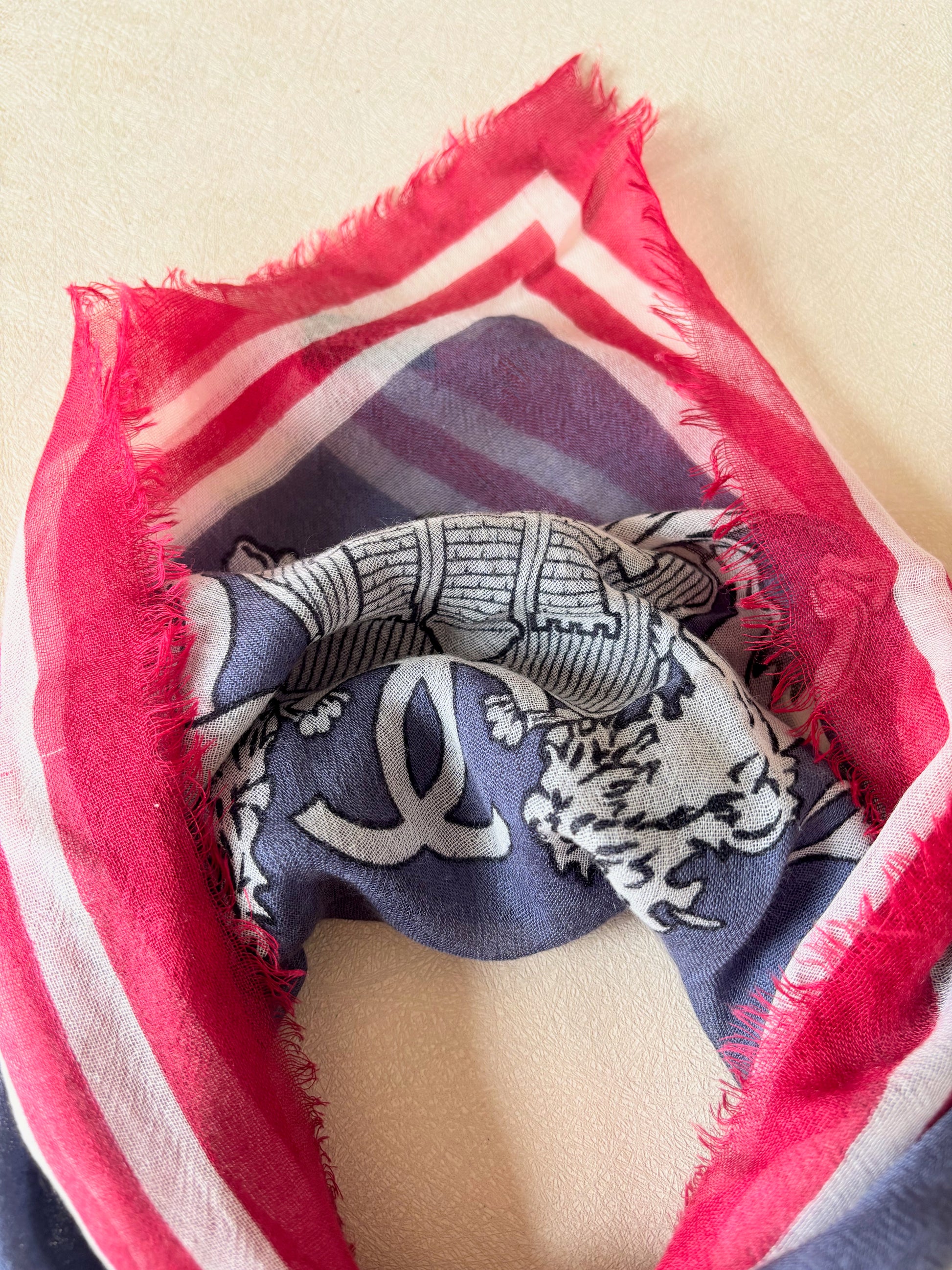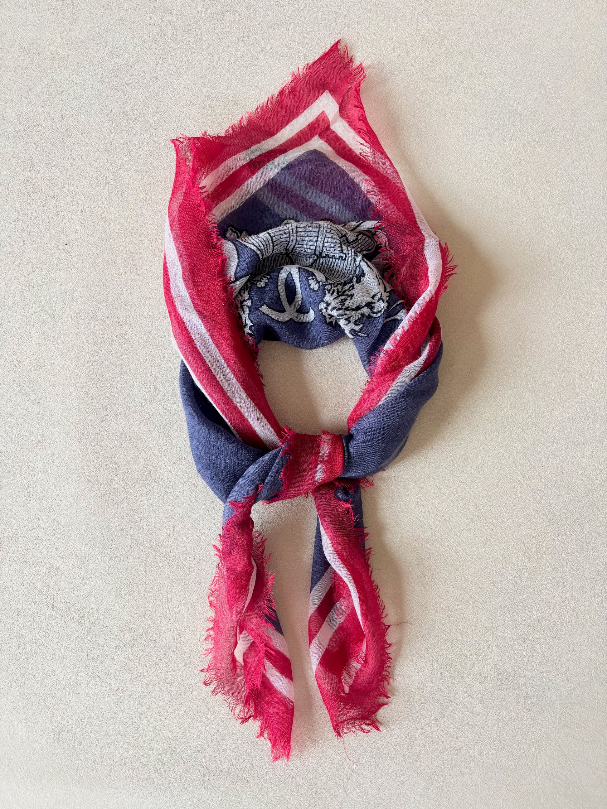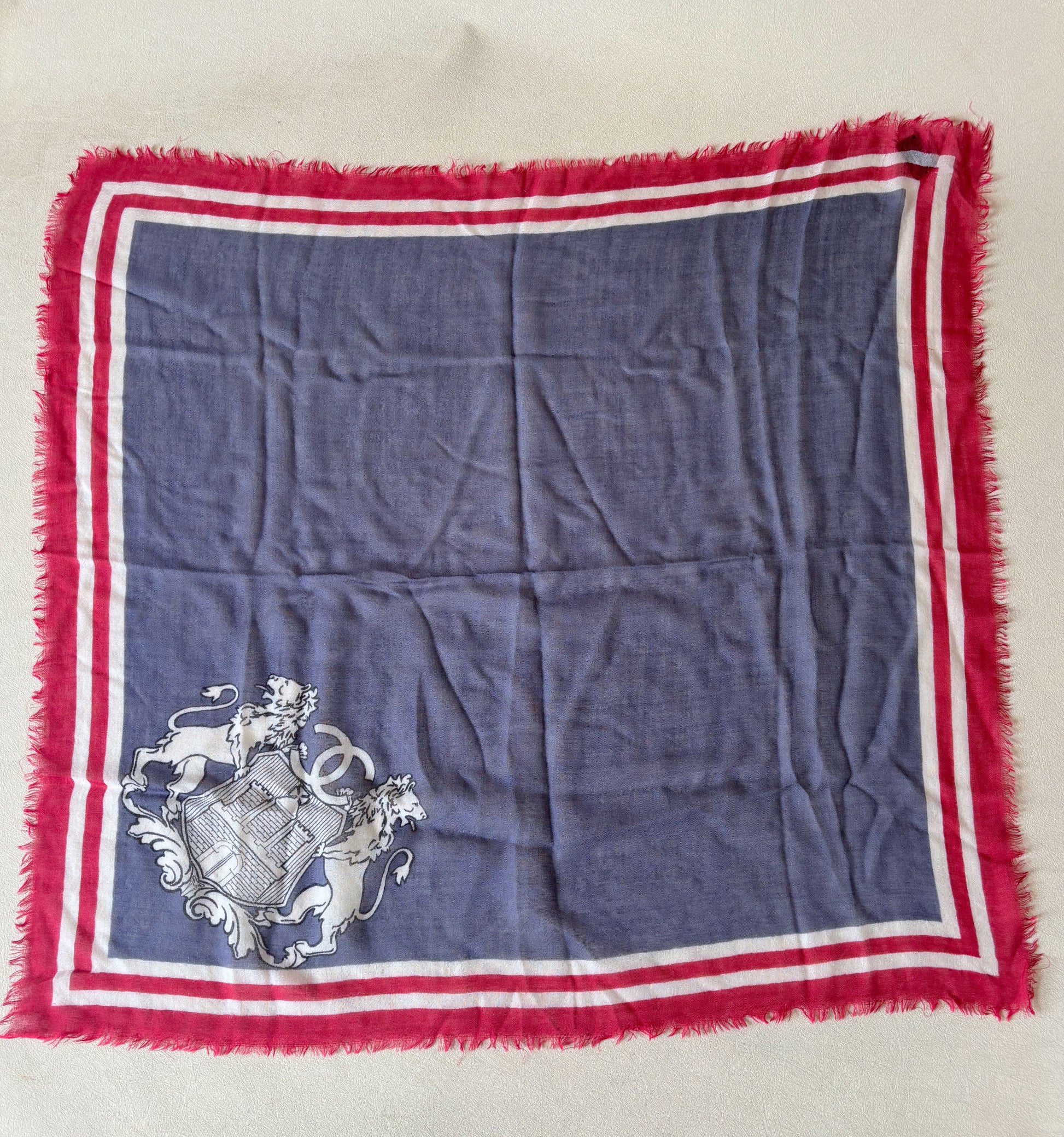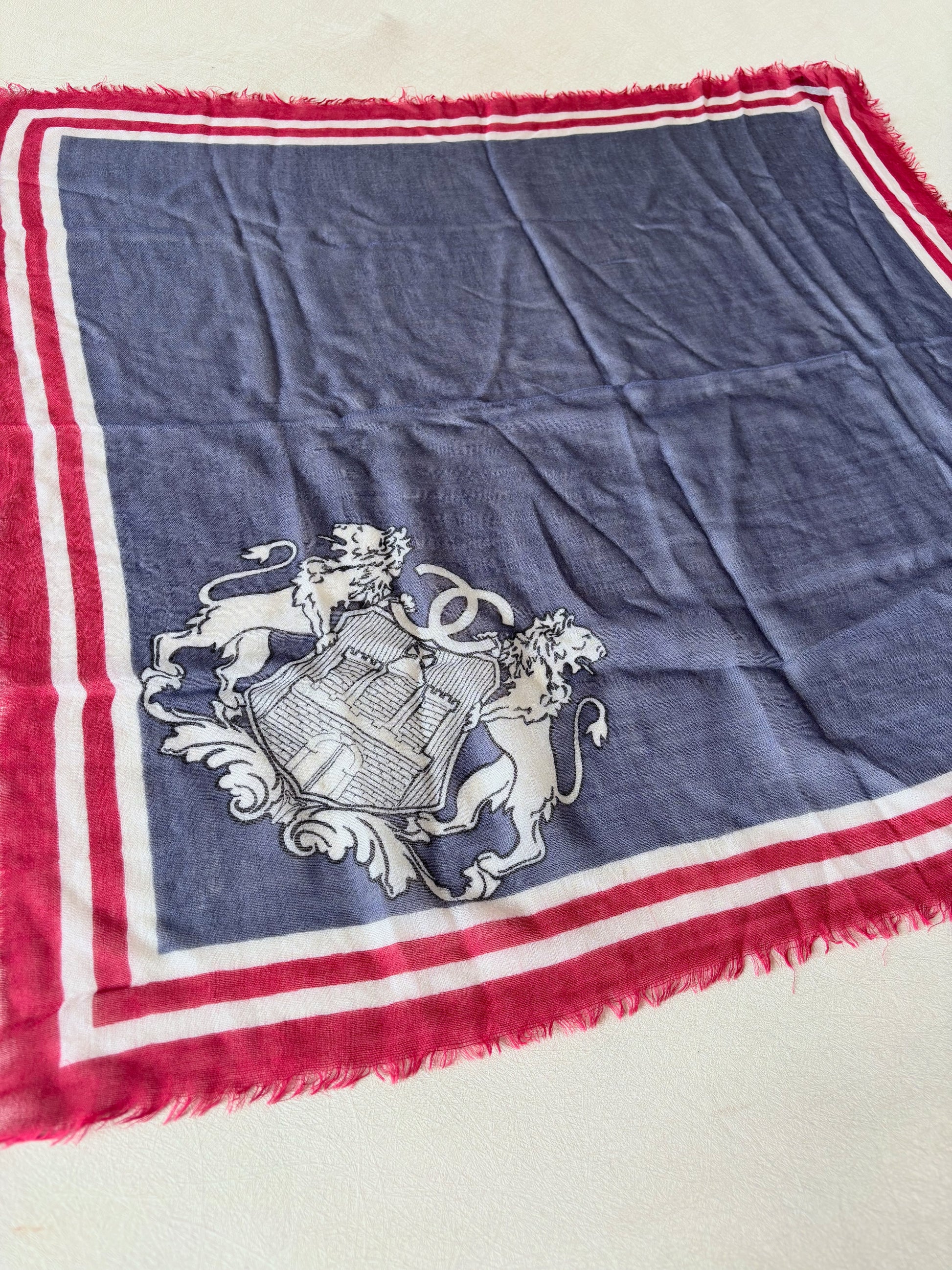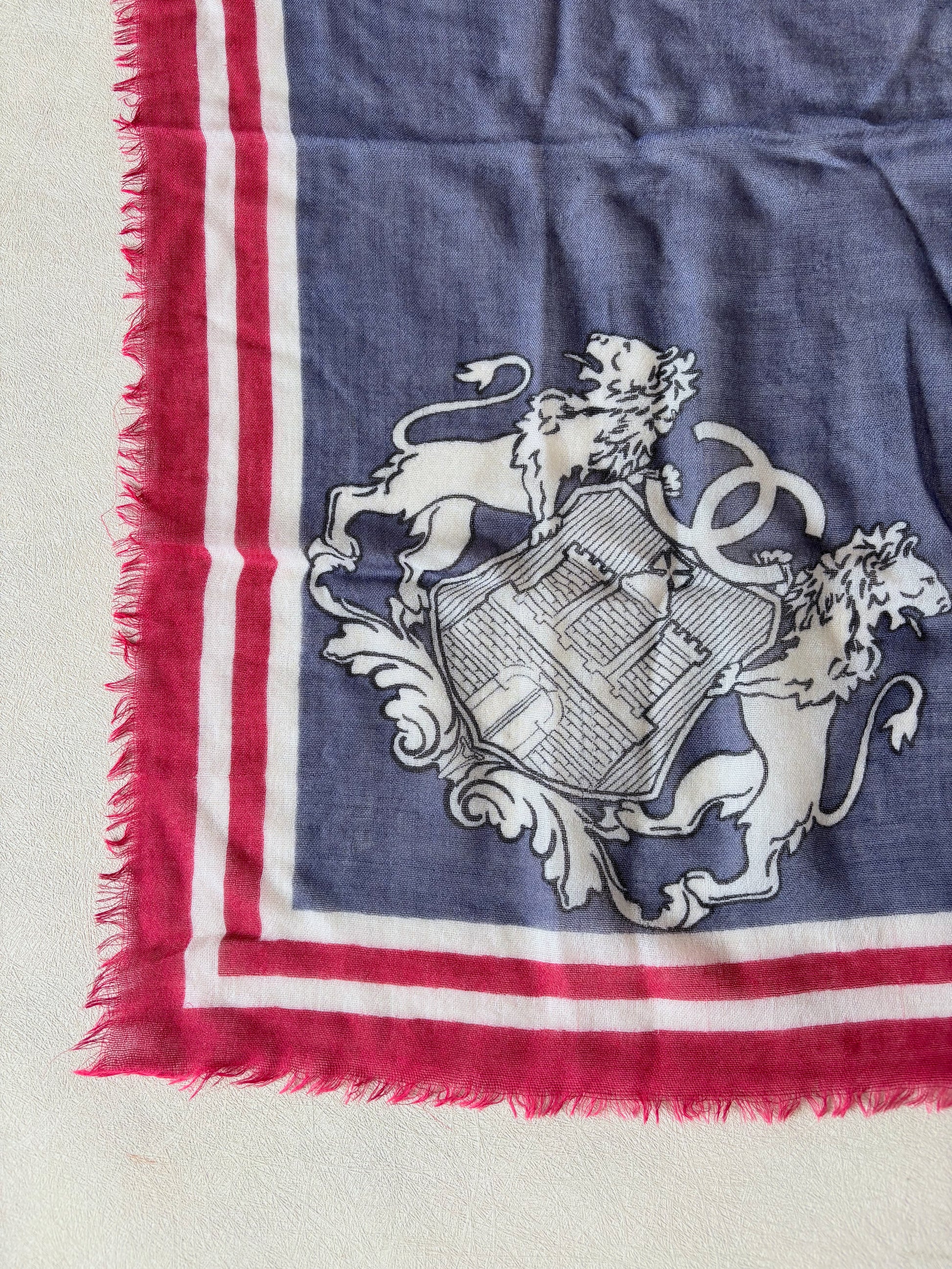 * Blason à deux lions entourant le logo CC, contrastant sur fond bleu denim, bordure rouge et blanche