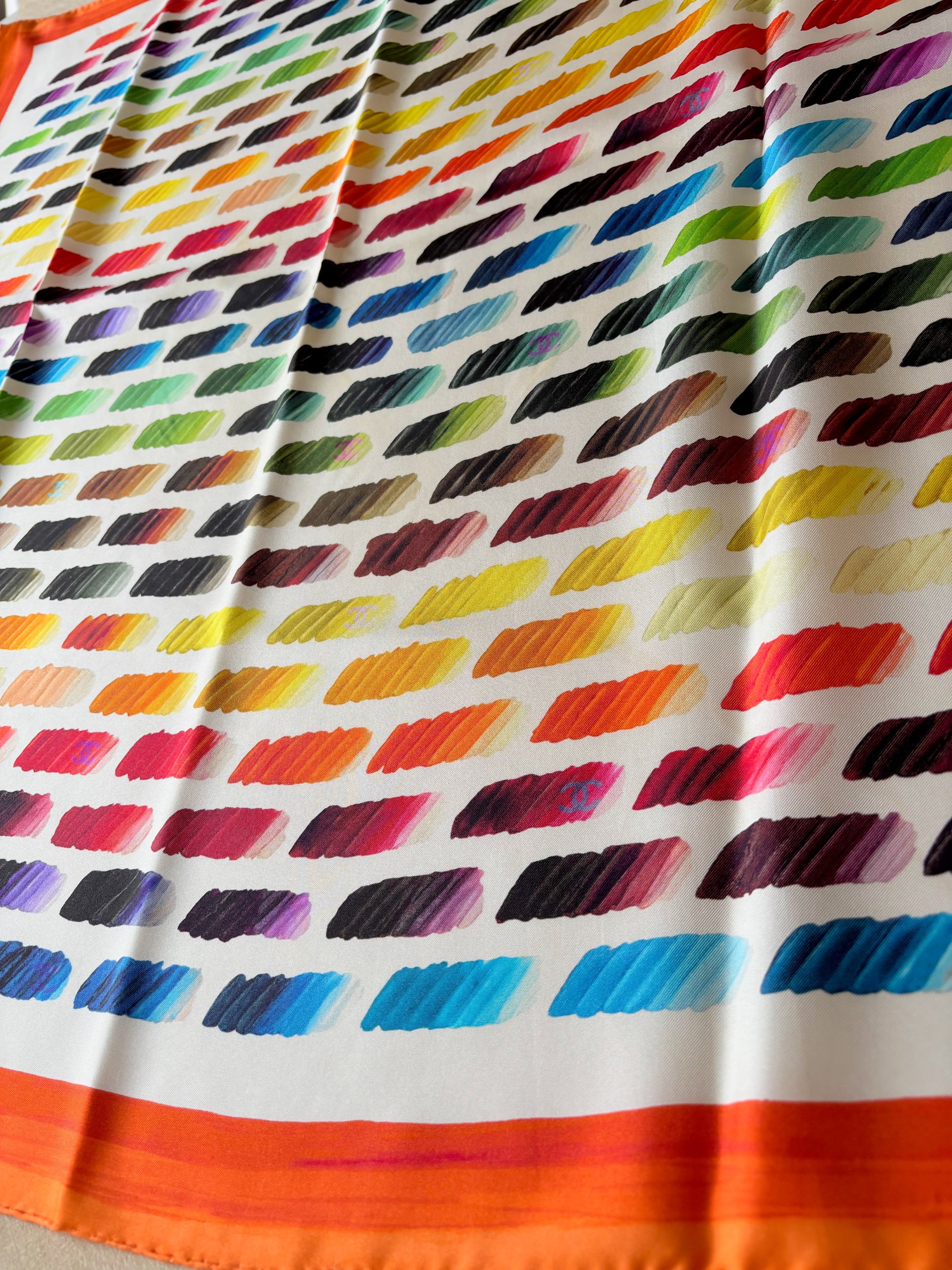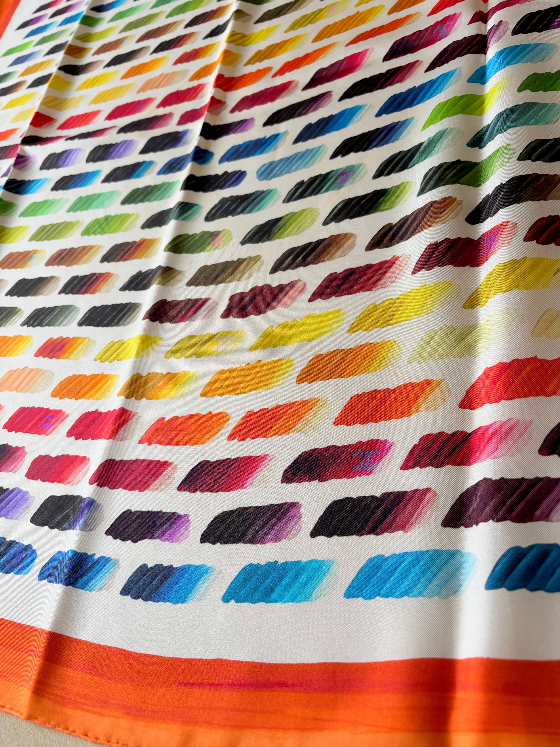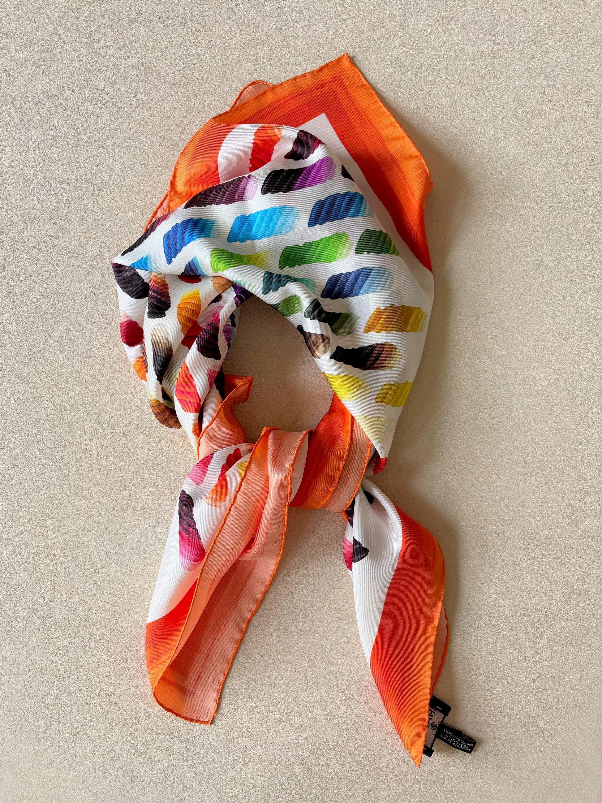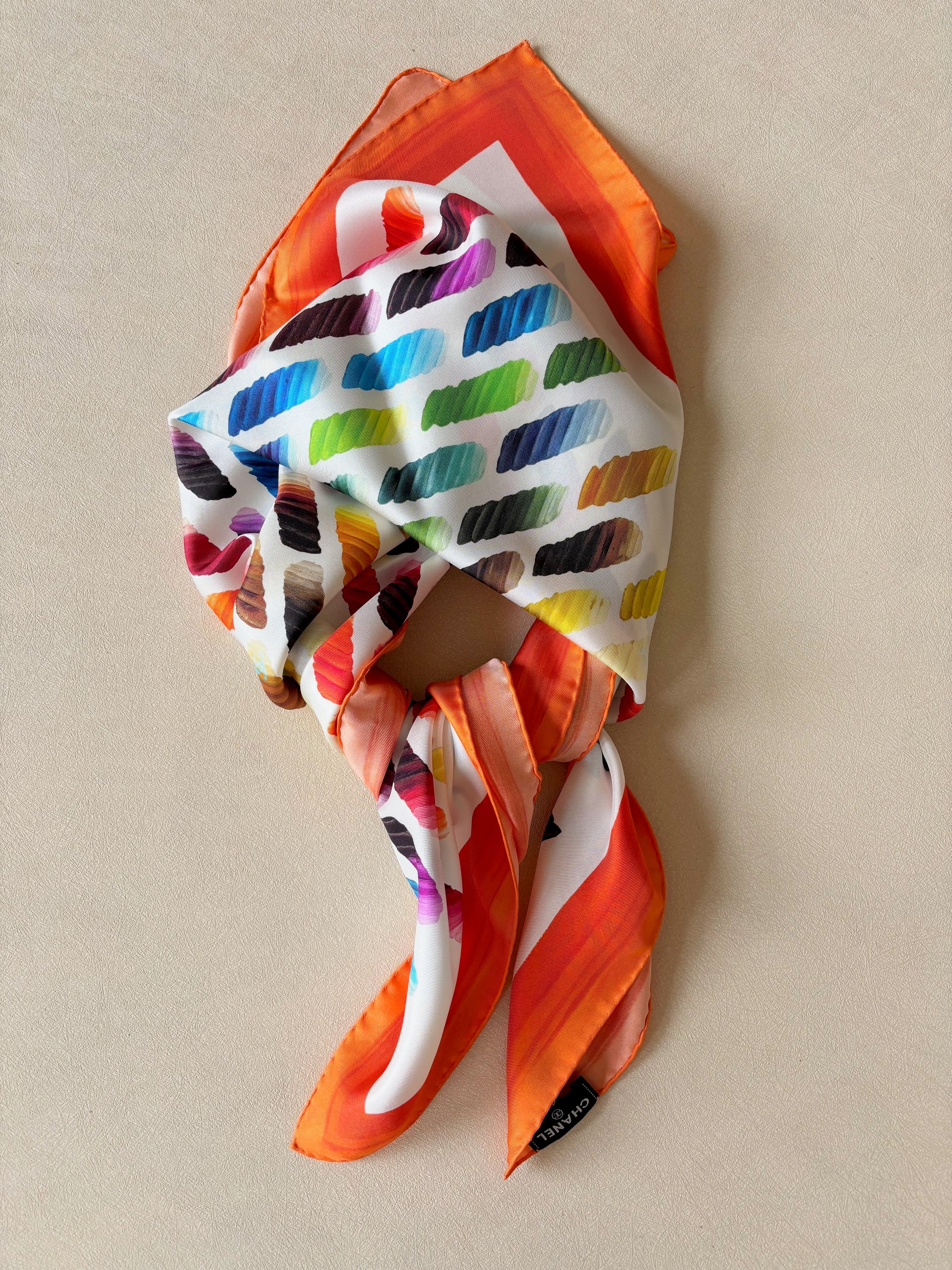 * Motifs multicolores en dégradé de touches de peinture, bordure orange contrastant avec le fond écru