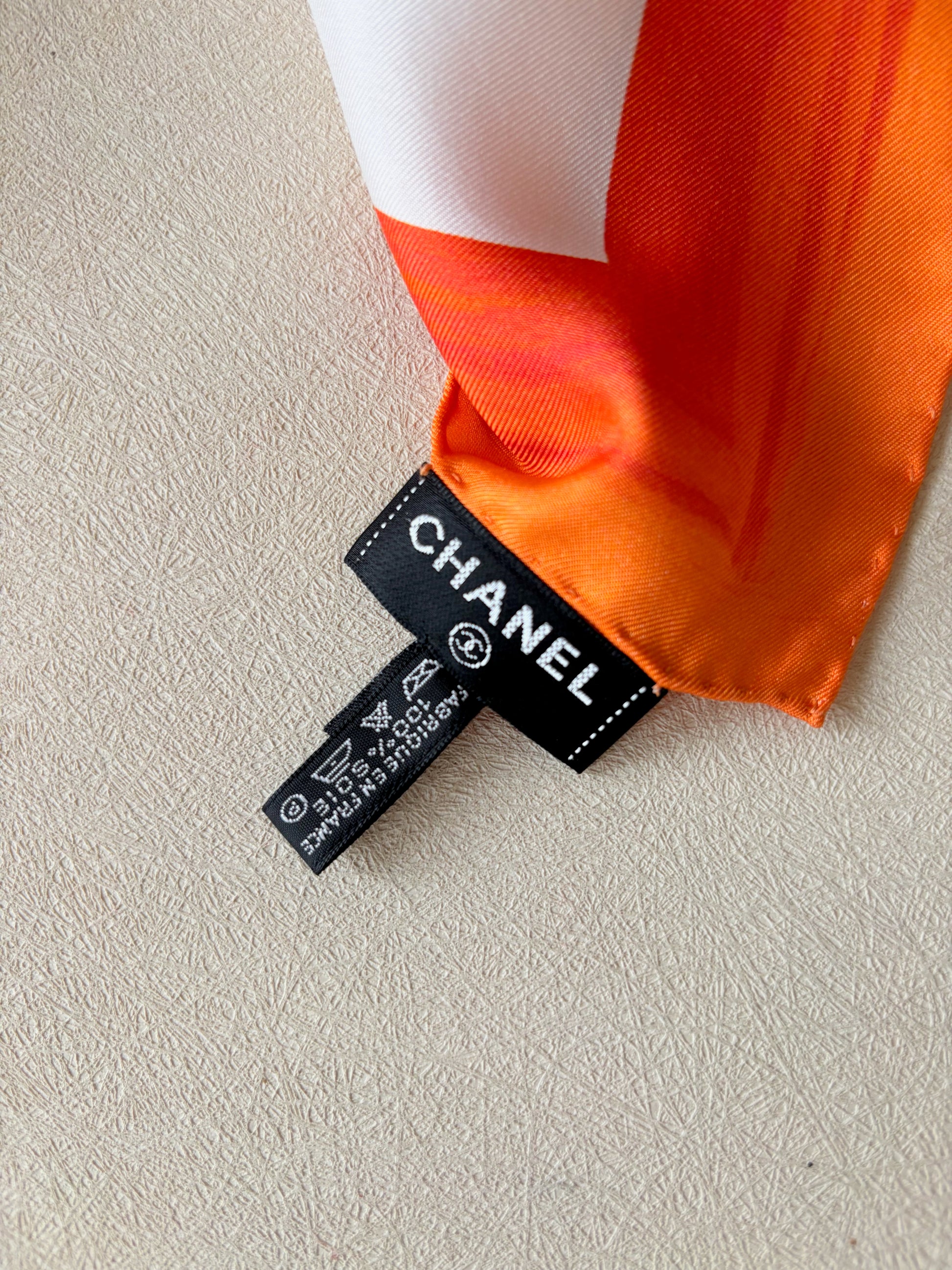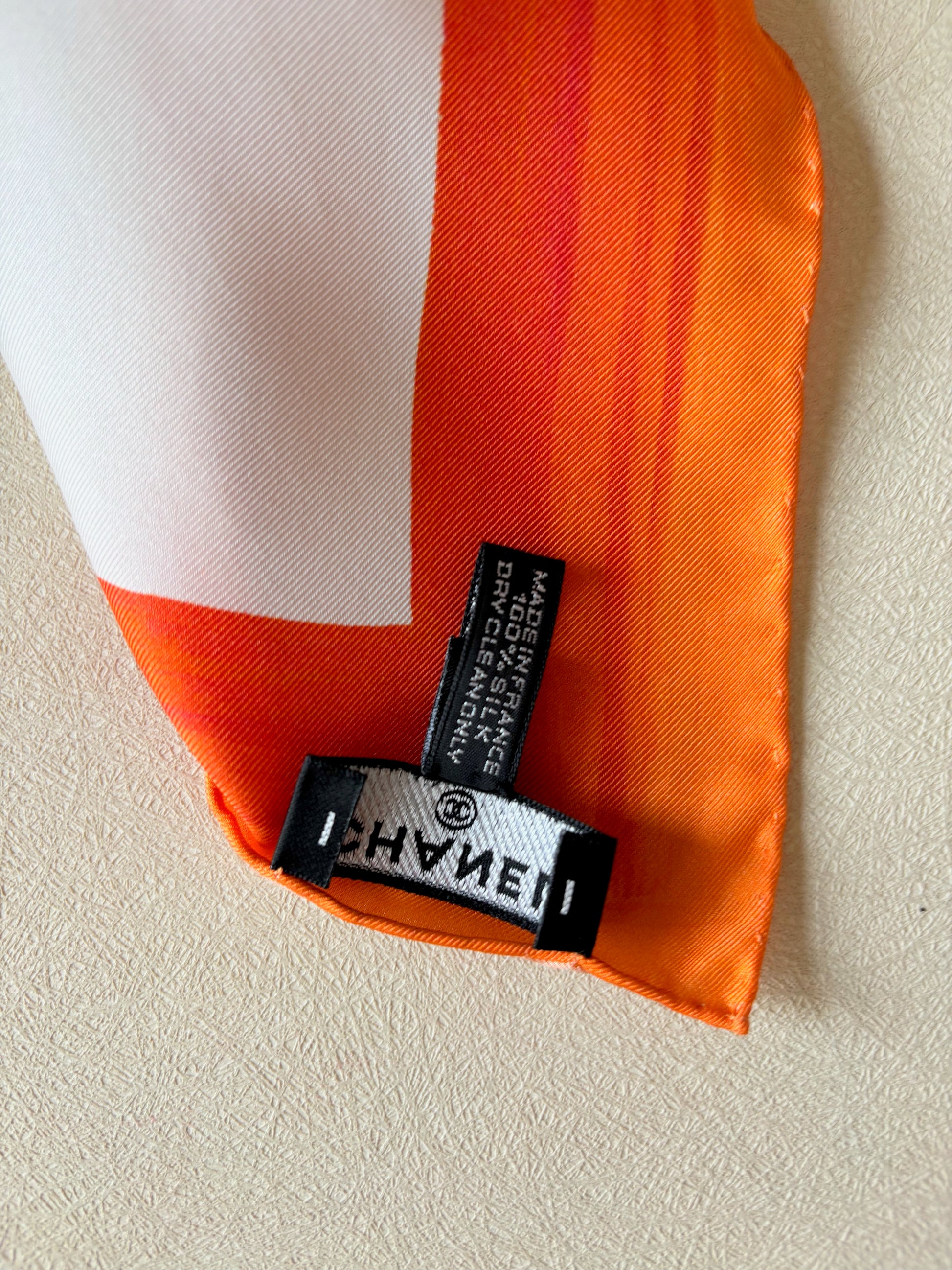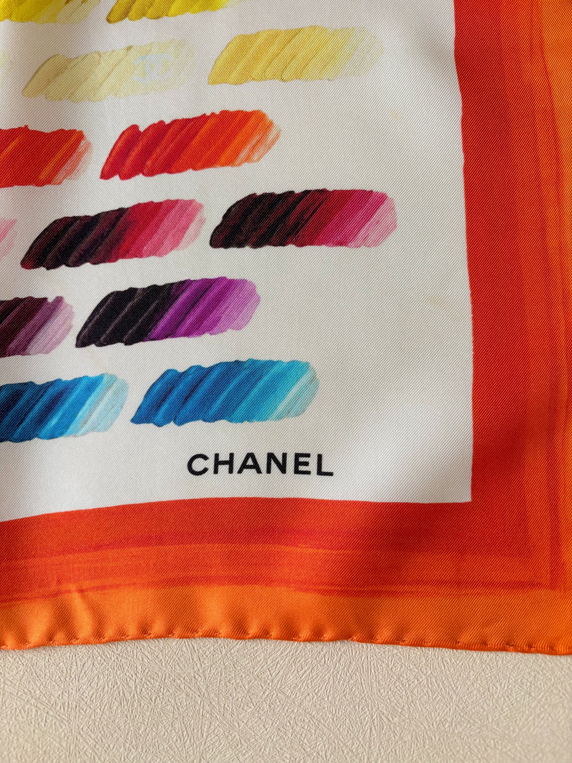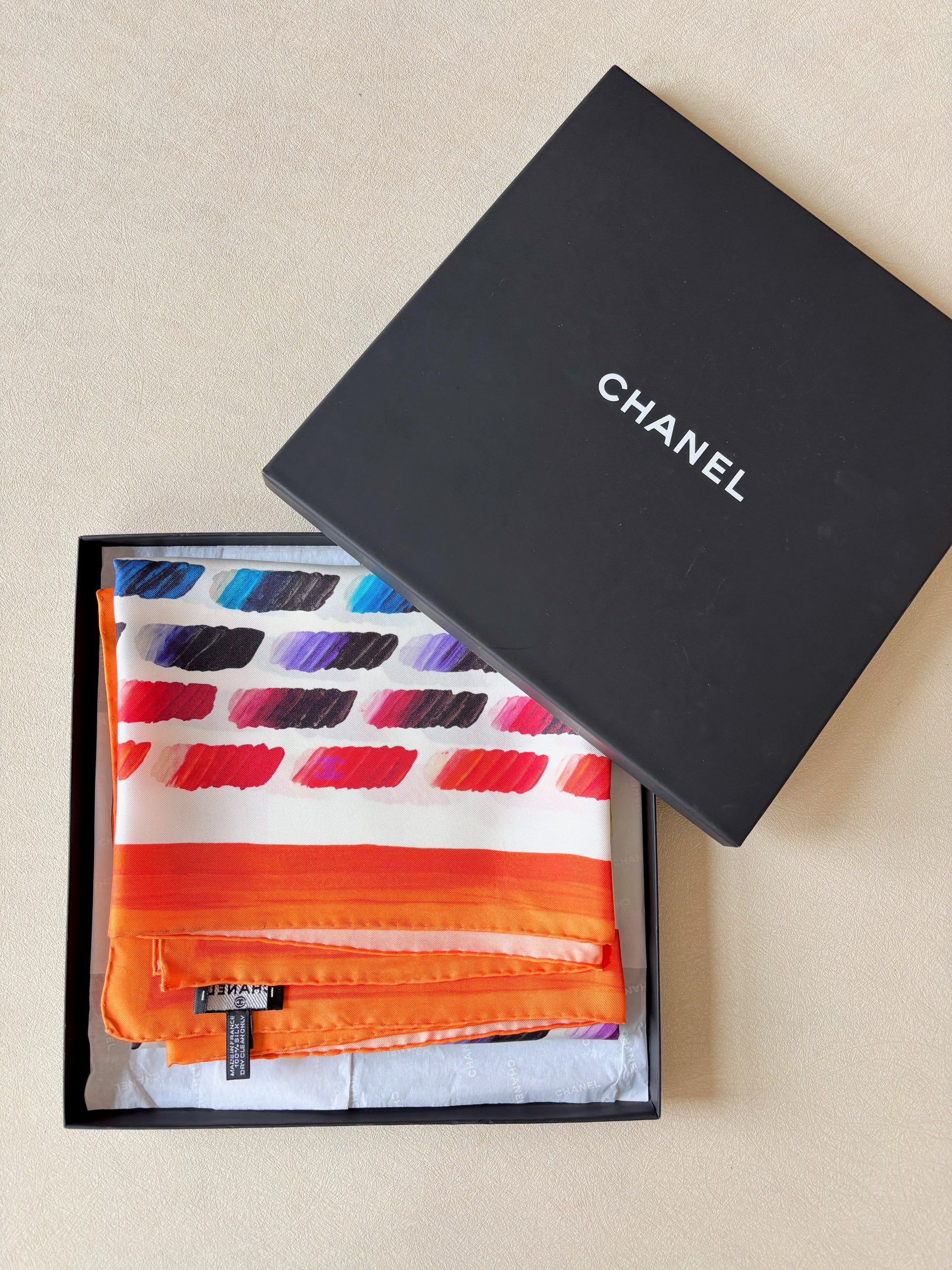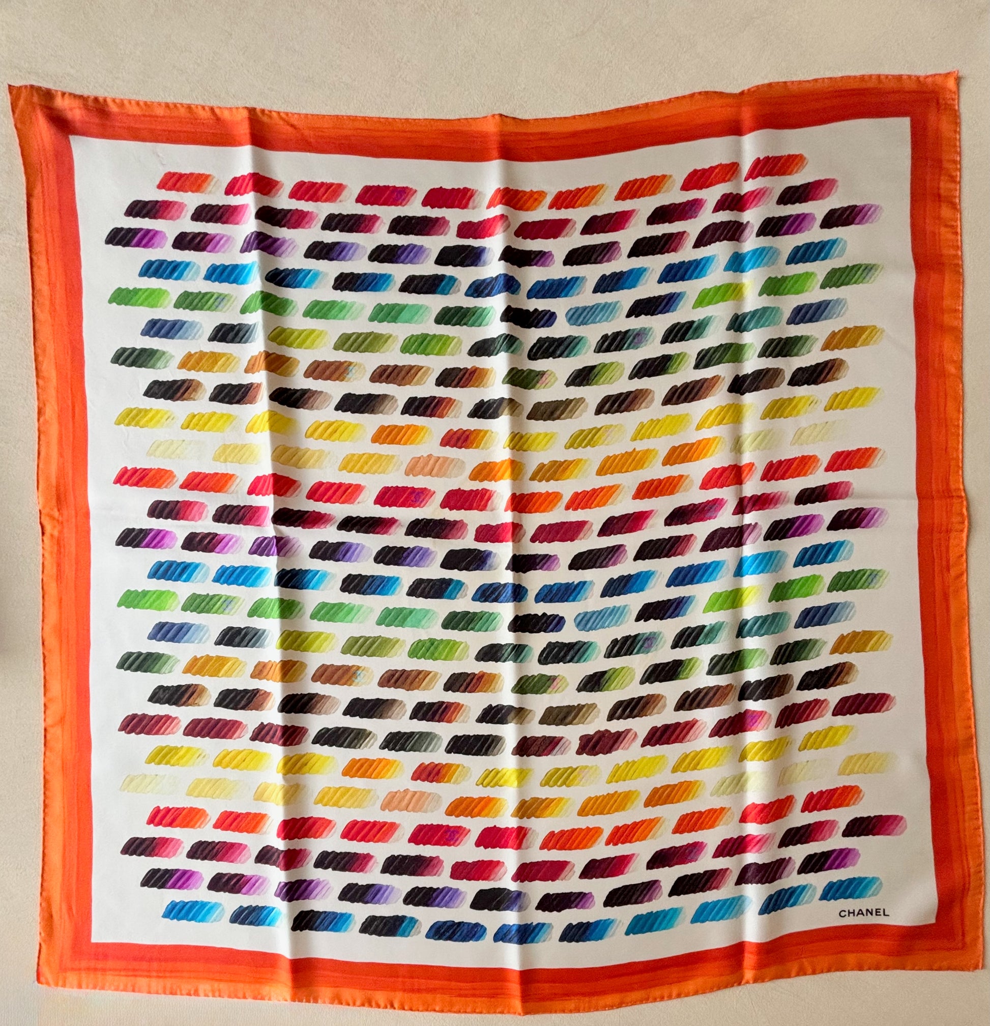 * Motifs multicolores en dégradé de touches de peinture, bordure orange contrastant avec le fond écru