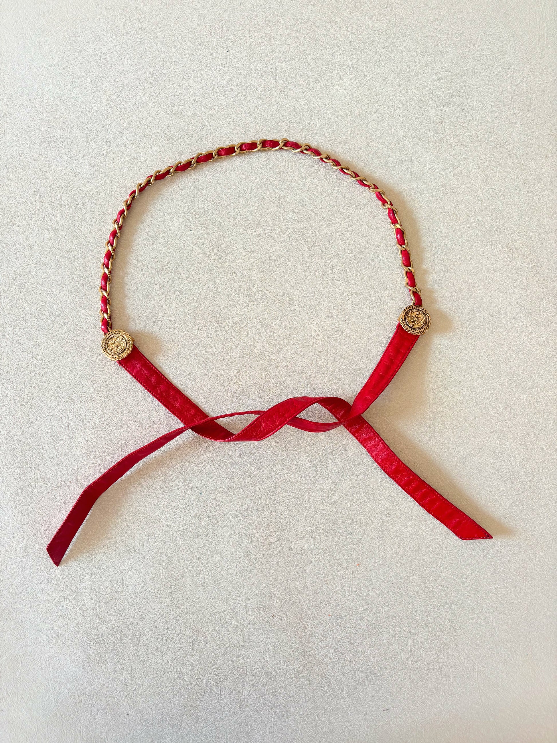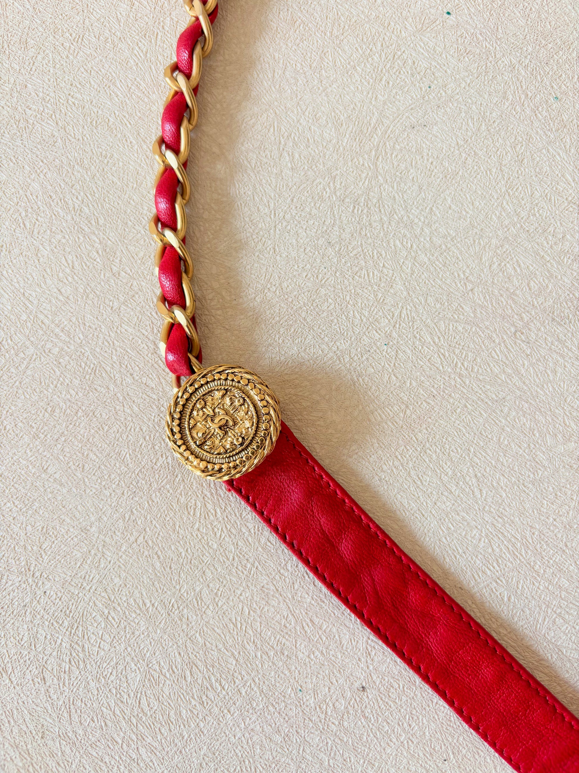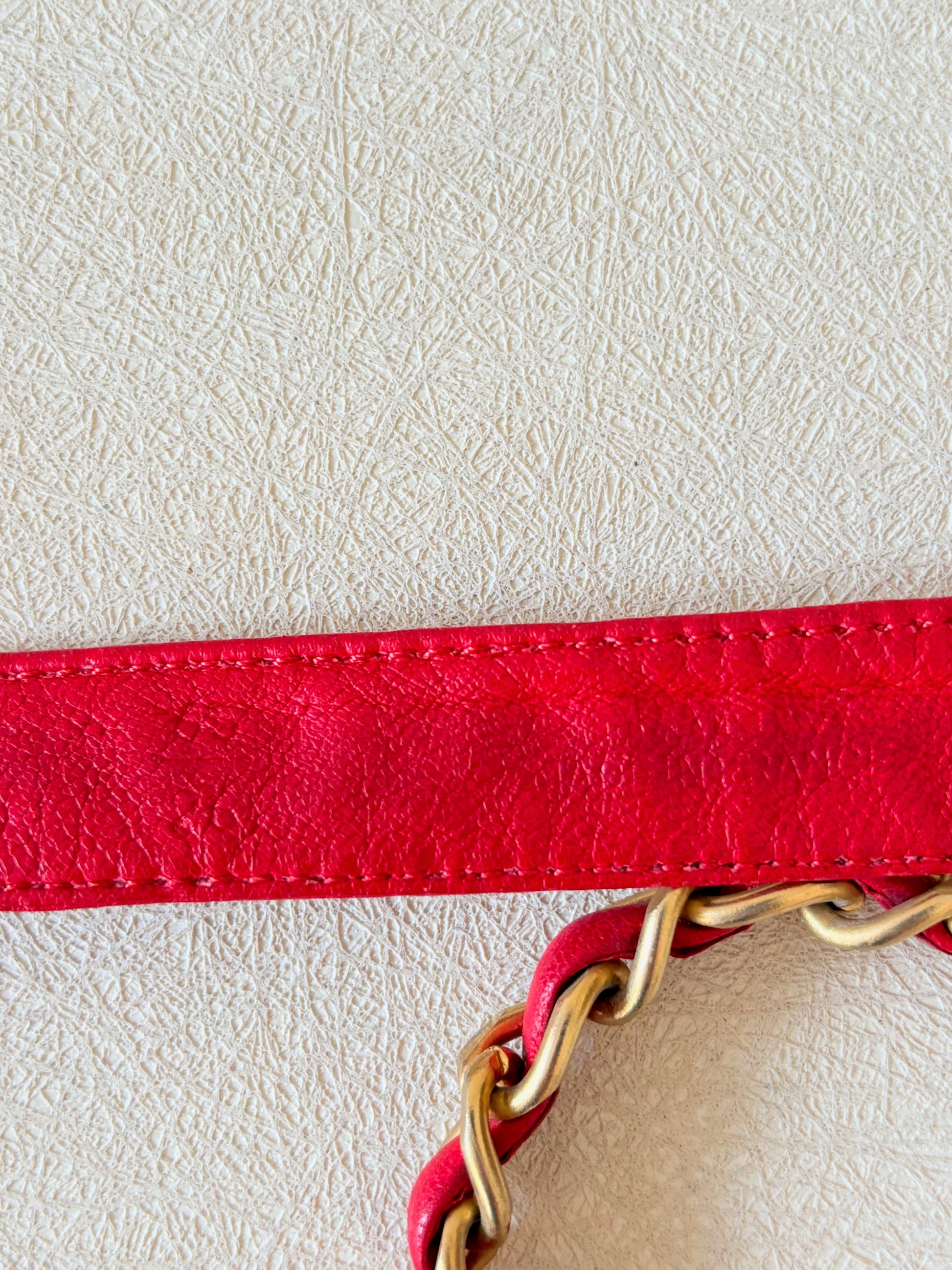 * En cuir d'agneau rouge et section centrale en métal doré entrelacée de cuir