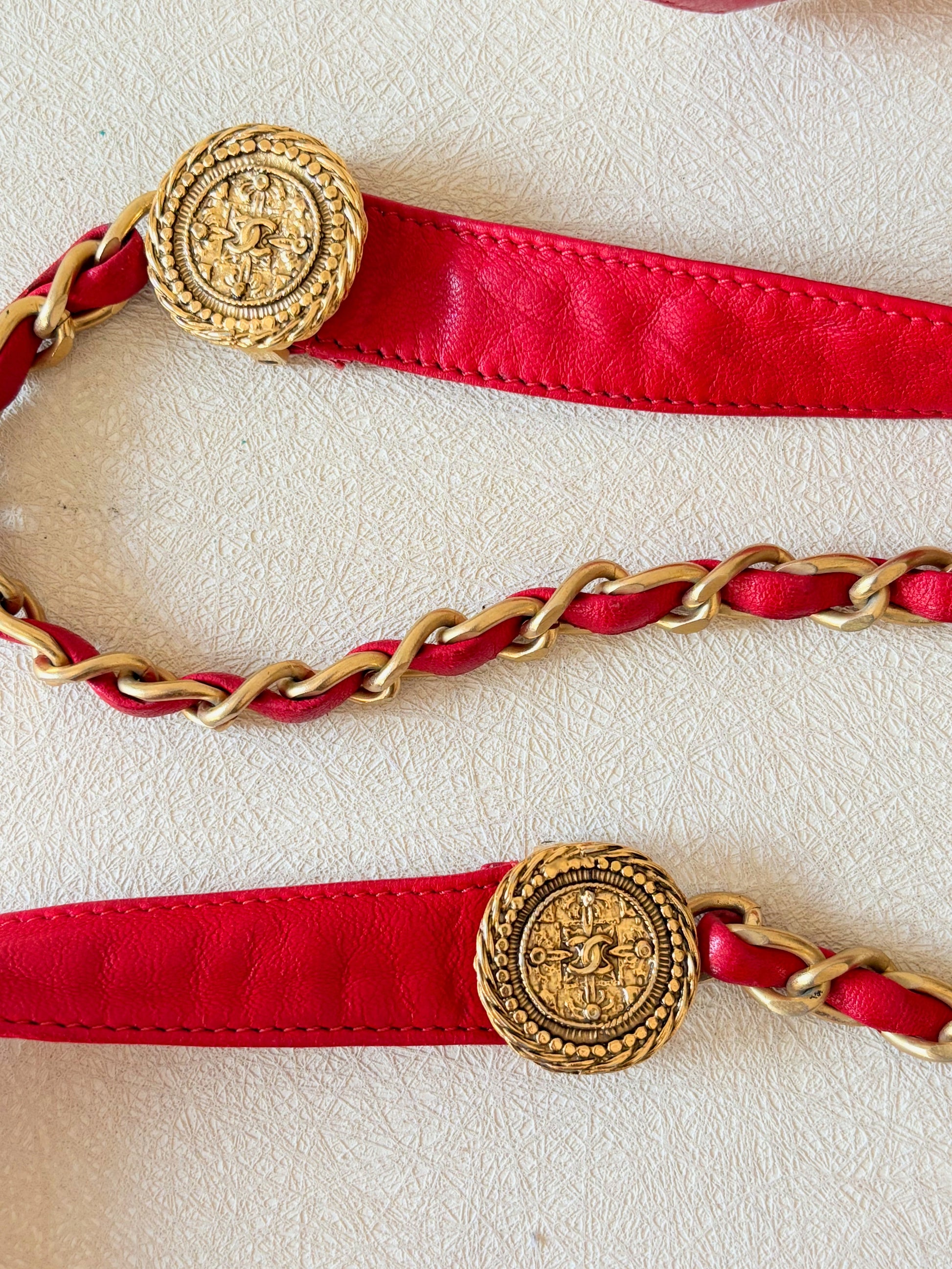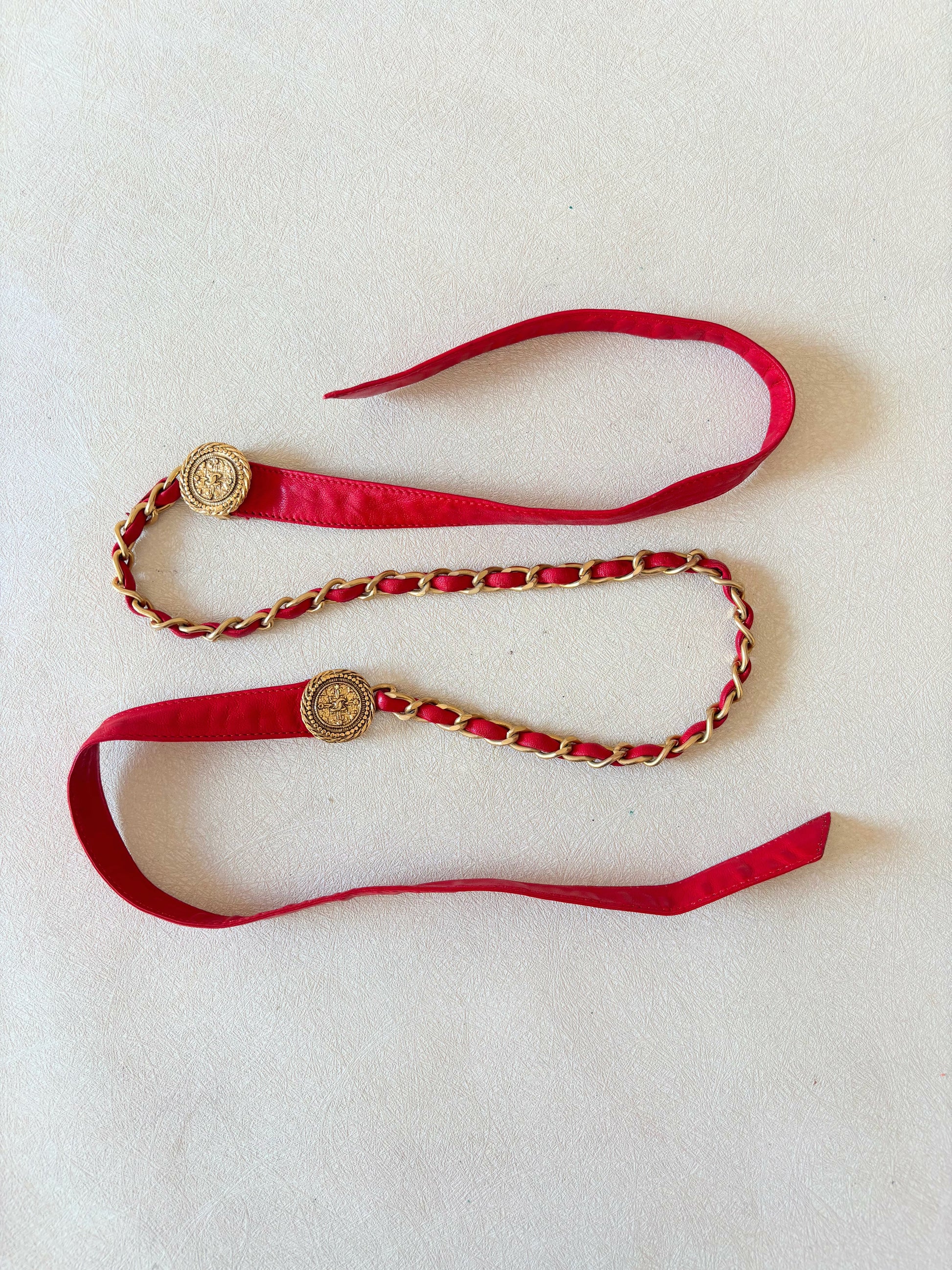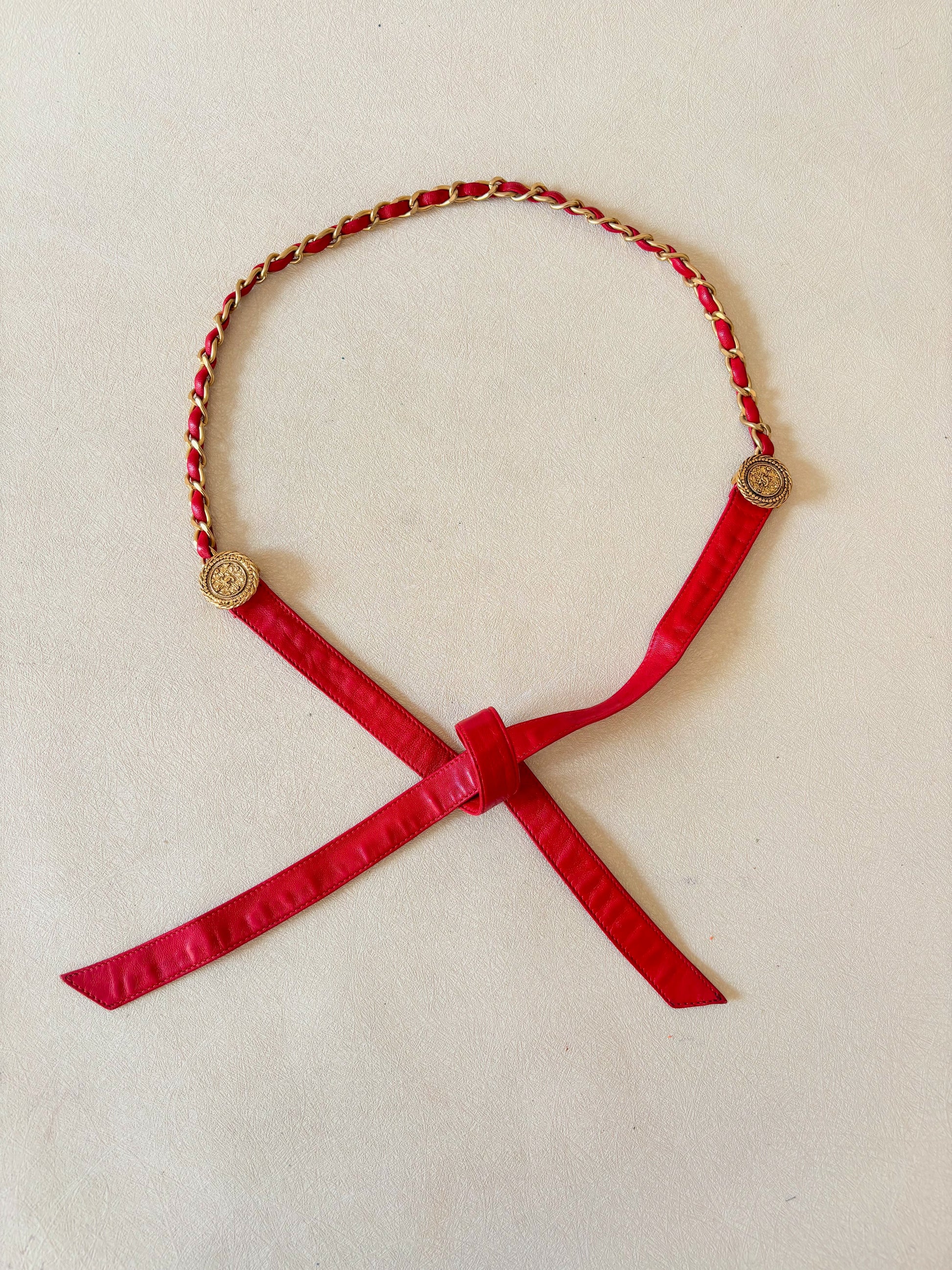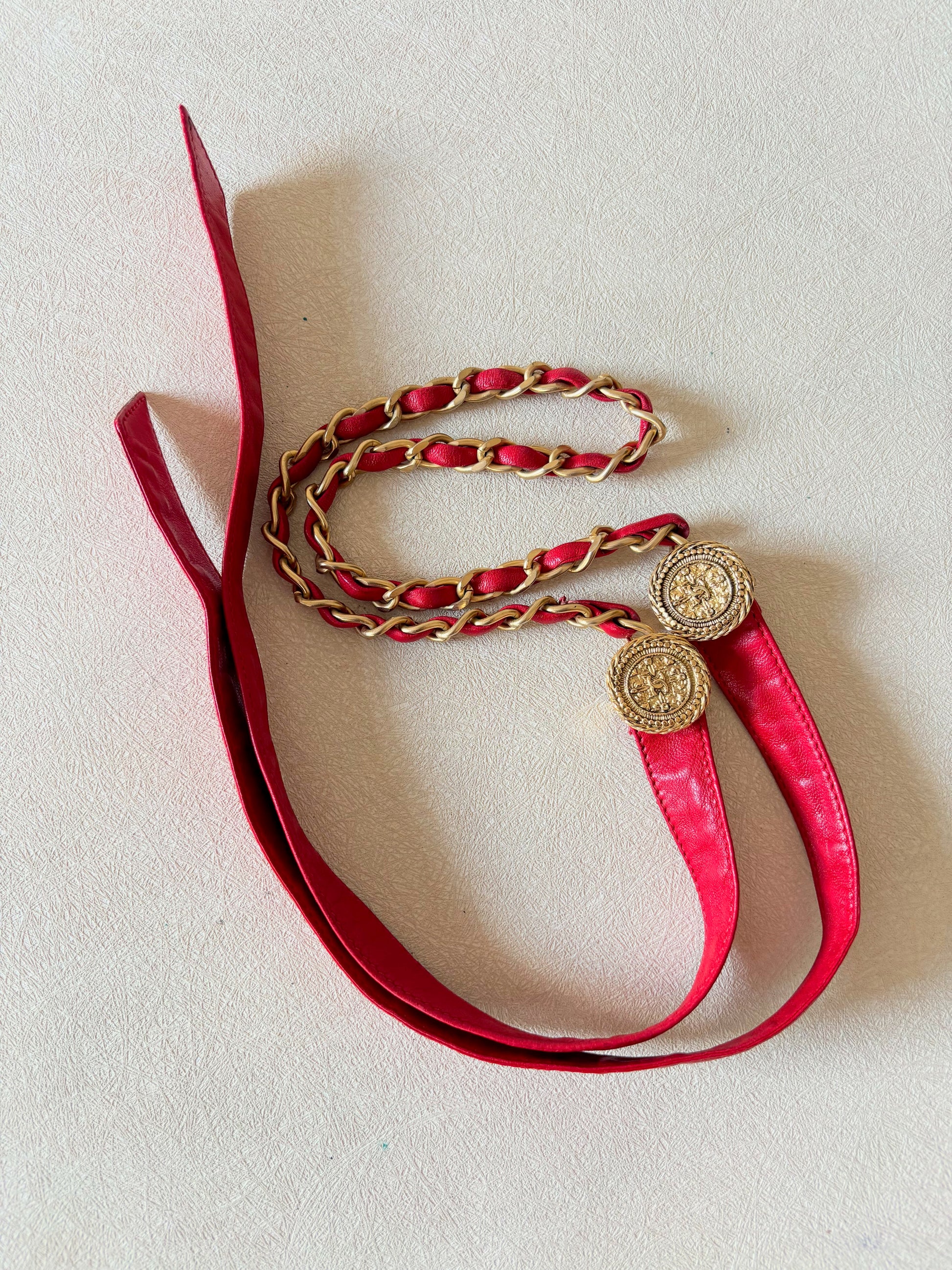 * En cuir d'agneau rouge et section centrale en métal doré entrelacée de cuir