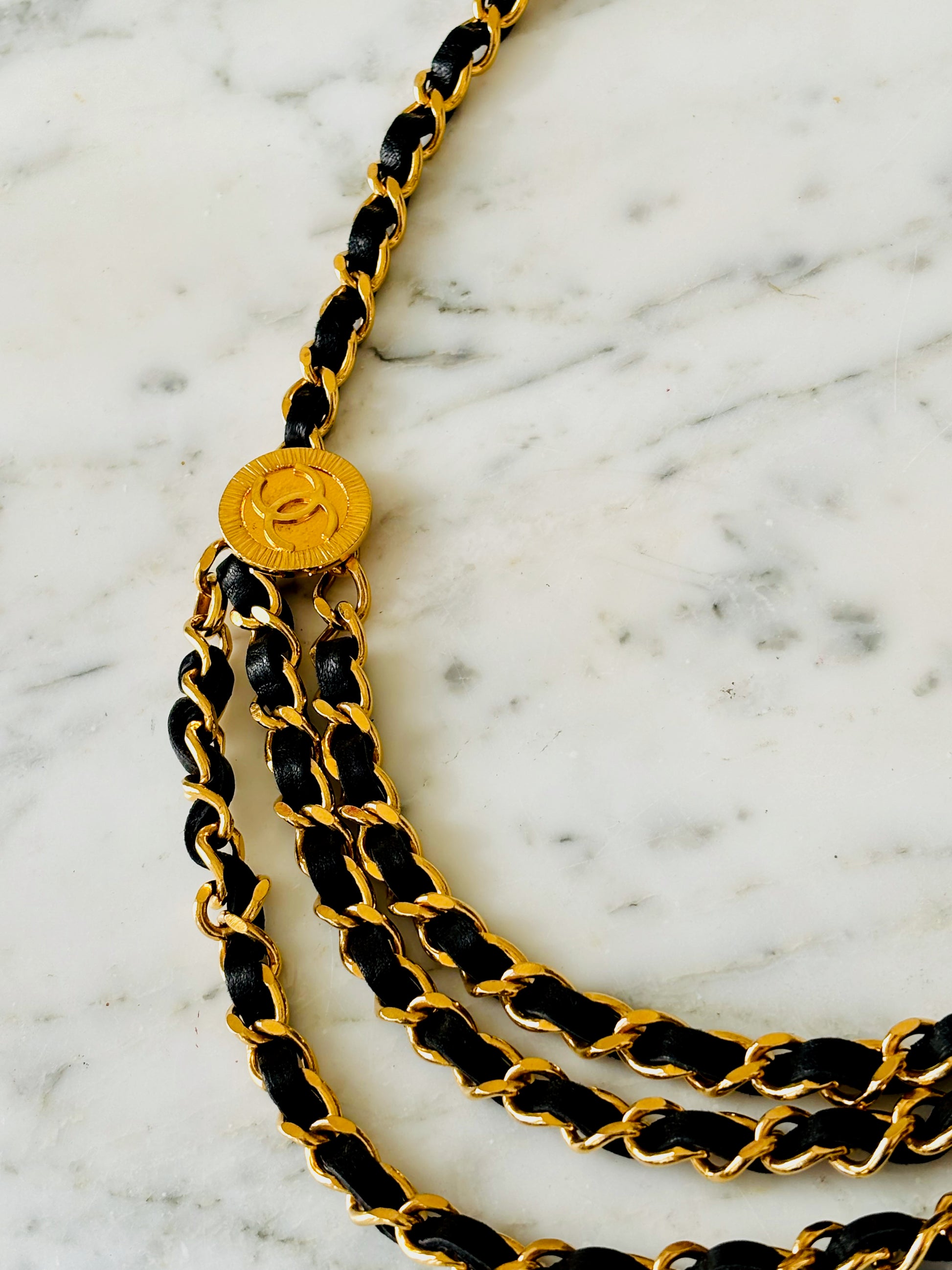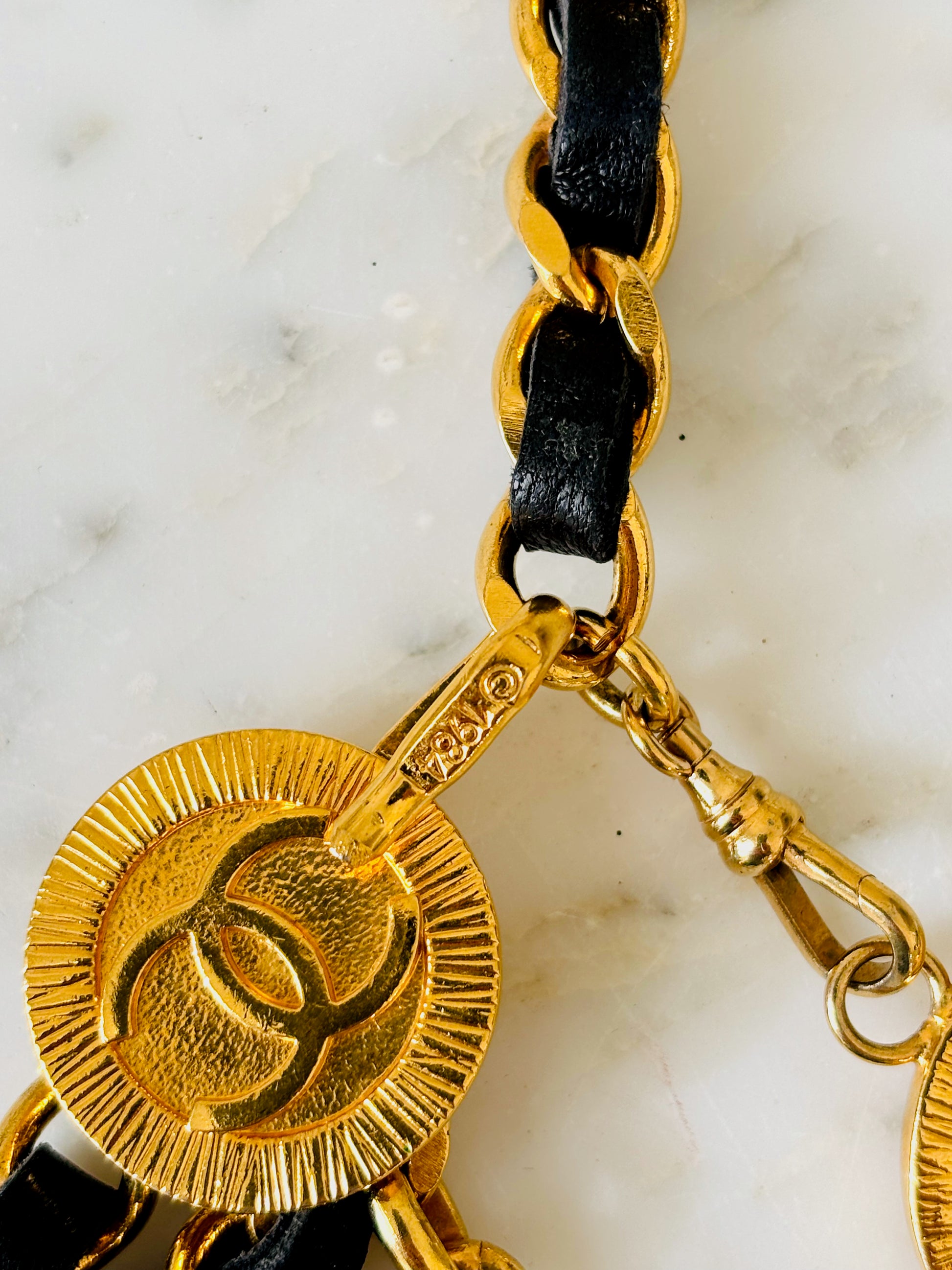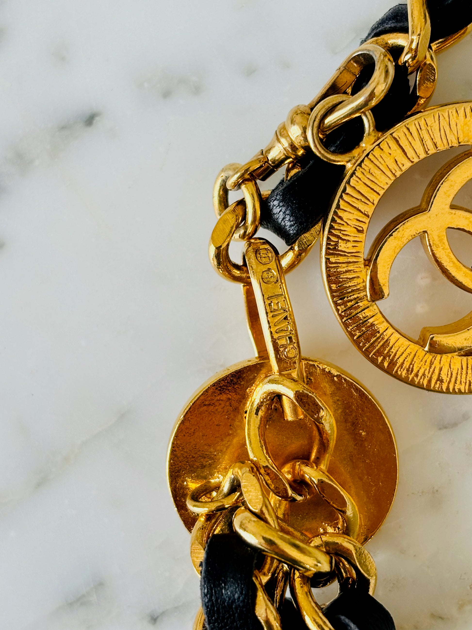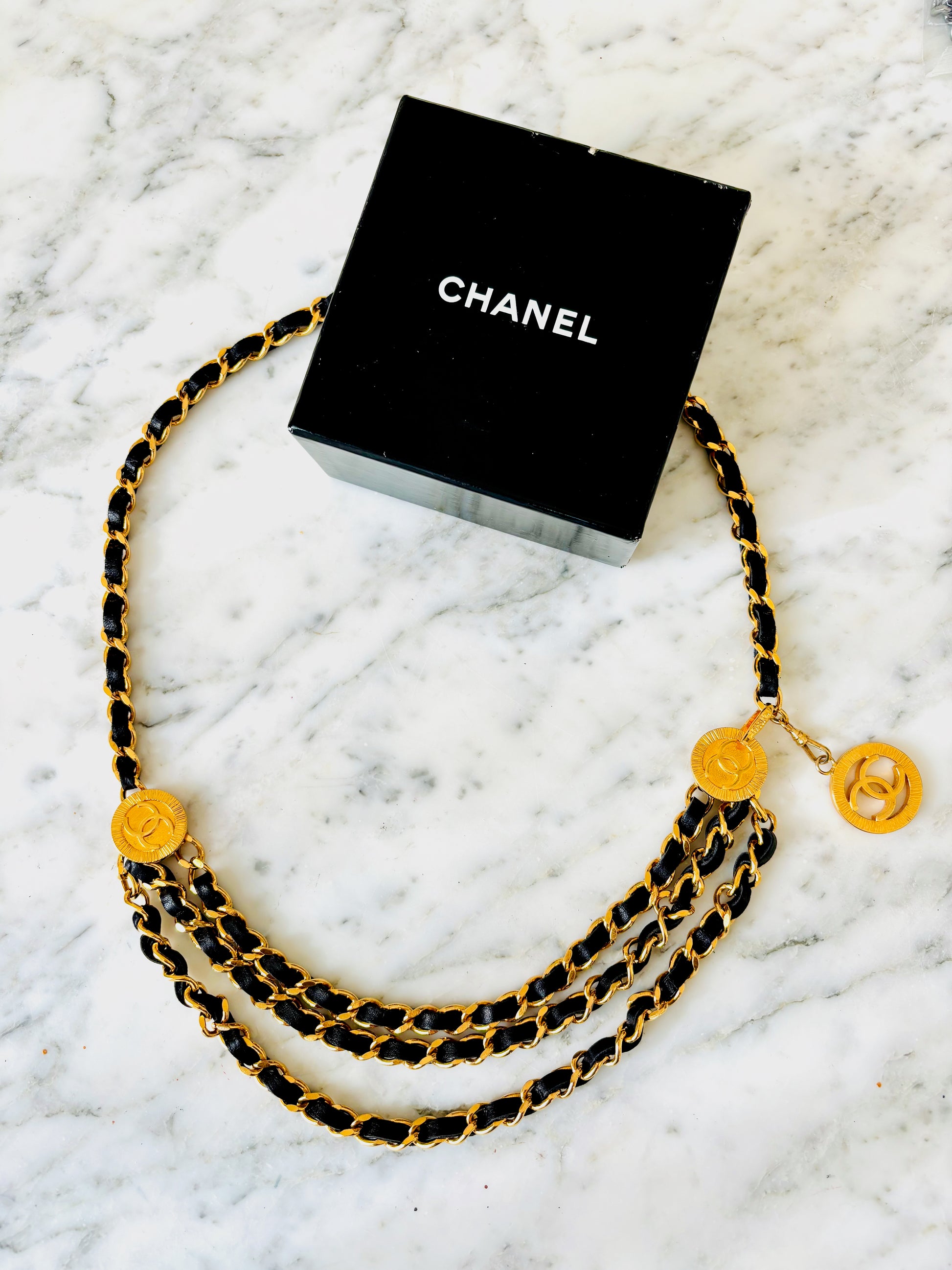 * Ceinture chaîne CHANEL 1984 en métal doré entrelacée d’une lanière en cuir noir dans sa boîte originale