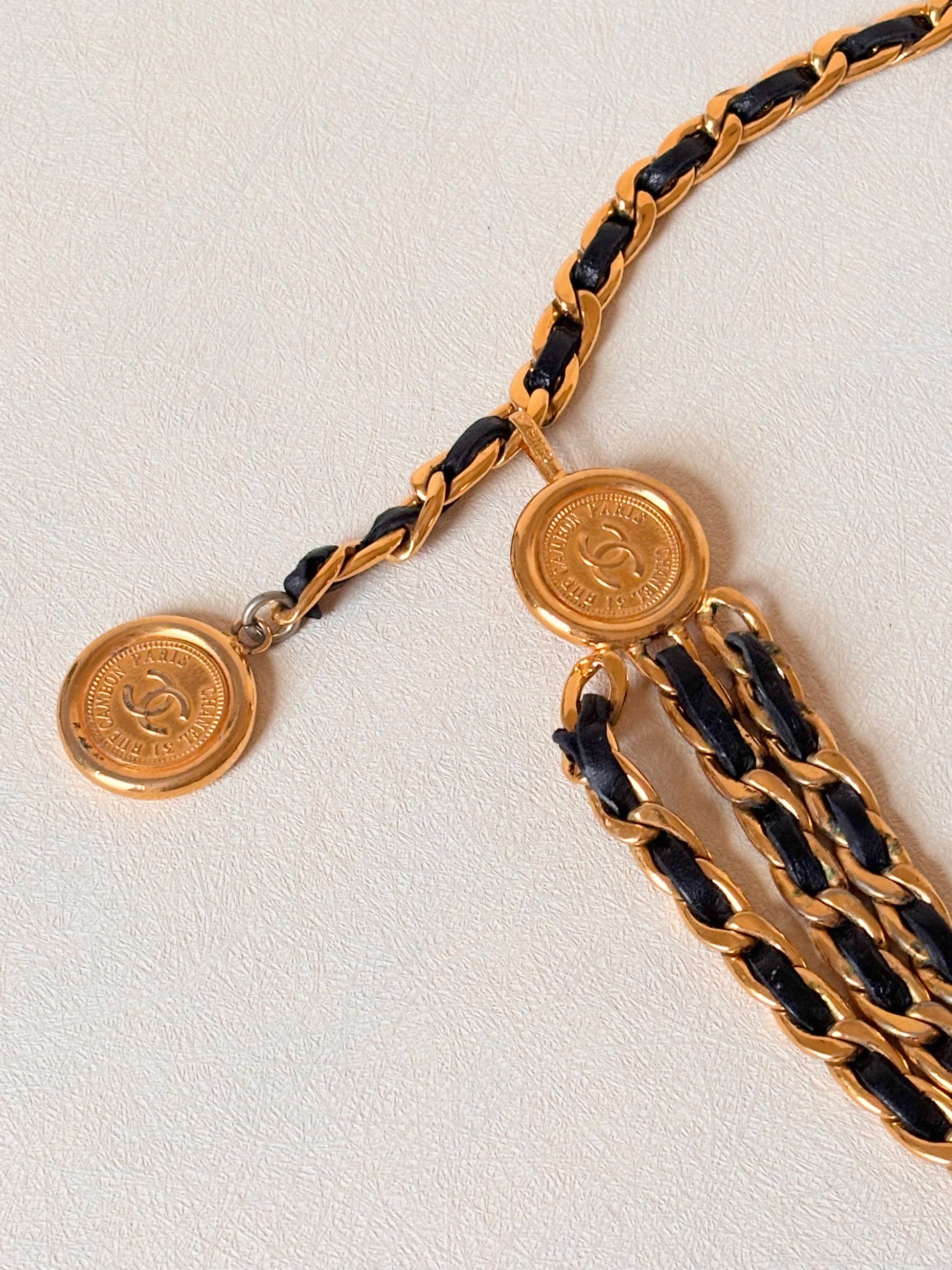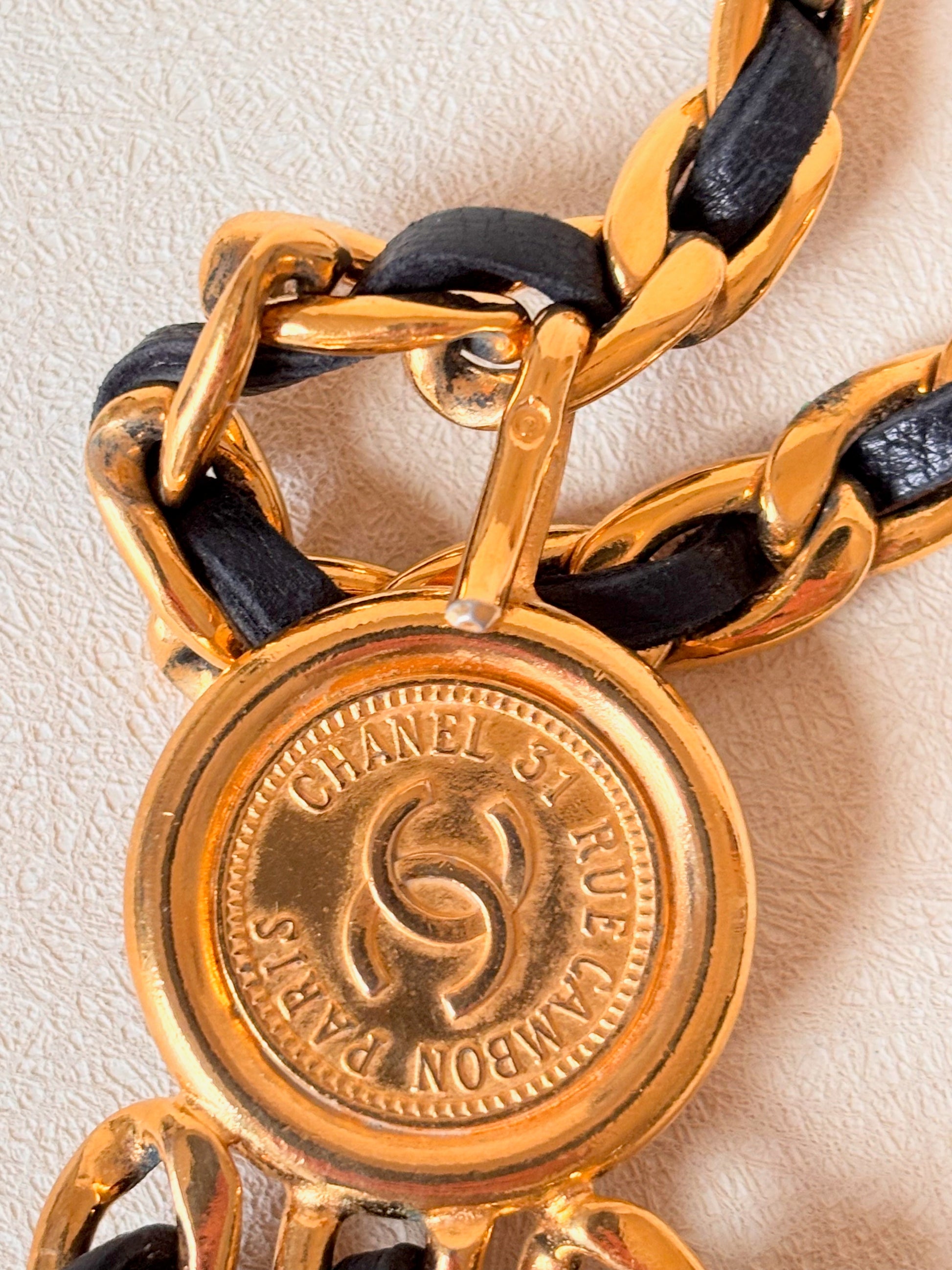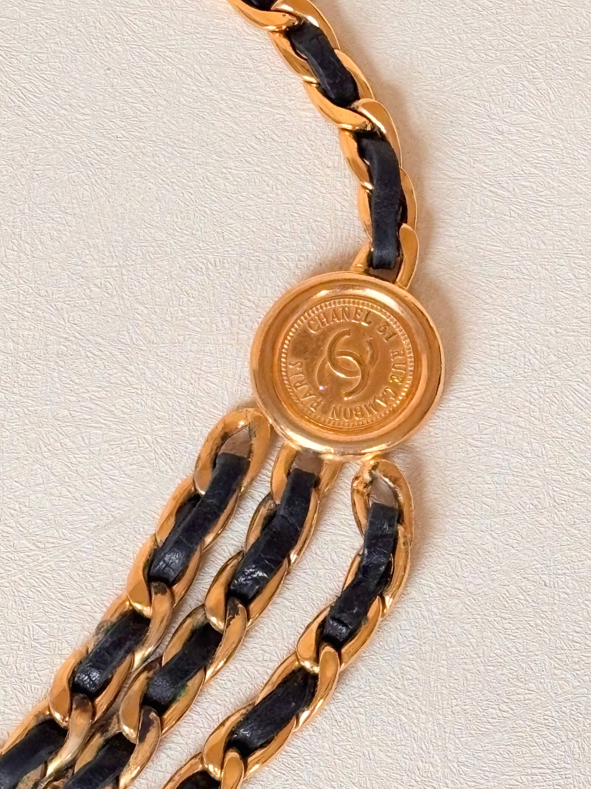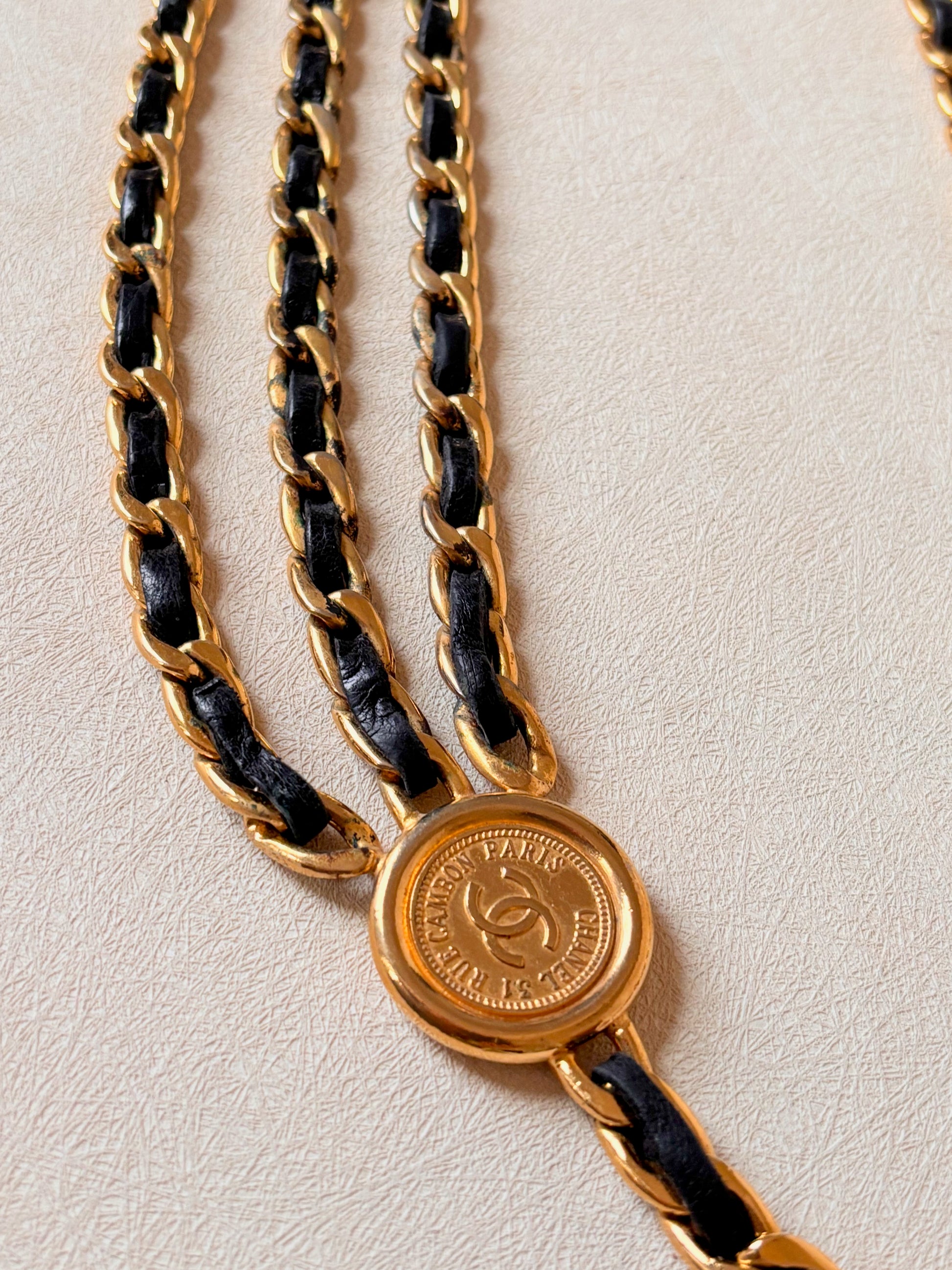 * Triple chaine sur le devant délimitée par 2 médaillons en métal doré logo CC 31 rue Cambon