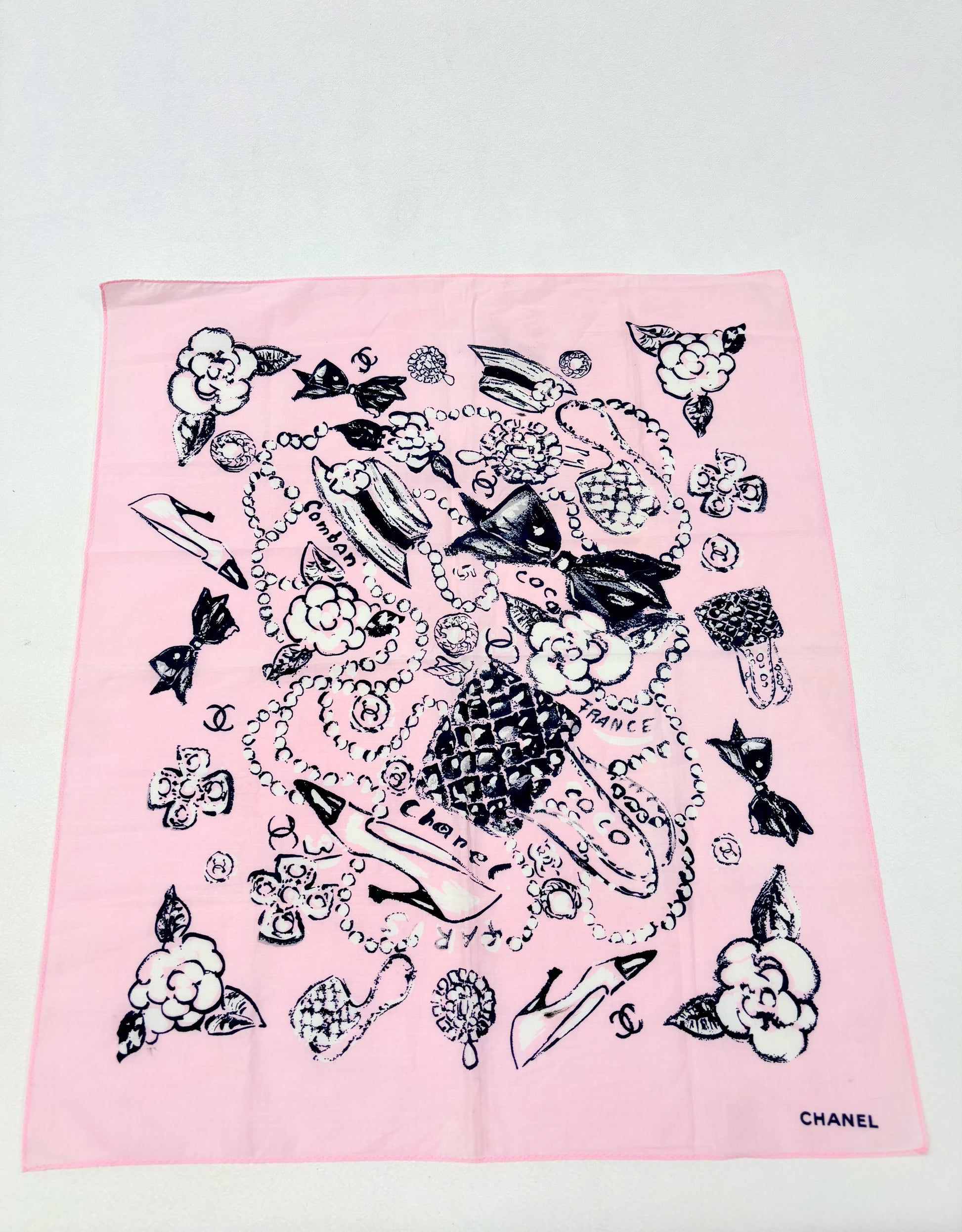 * Motifs représentant les produits emblématiques de la Maison : sac, camélia, noeud, trèfle, escarpins et collier de perles