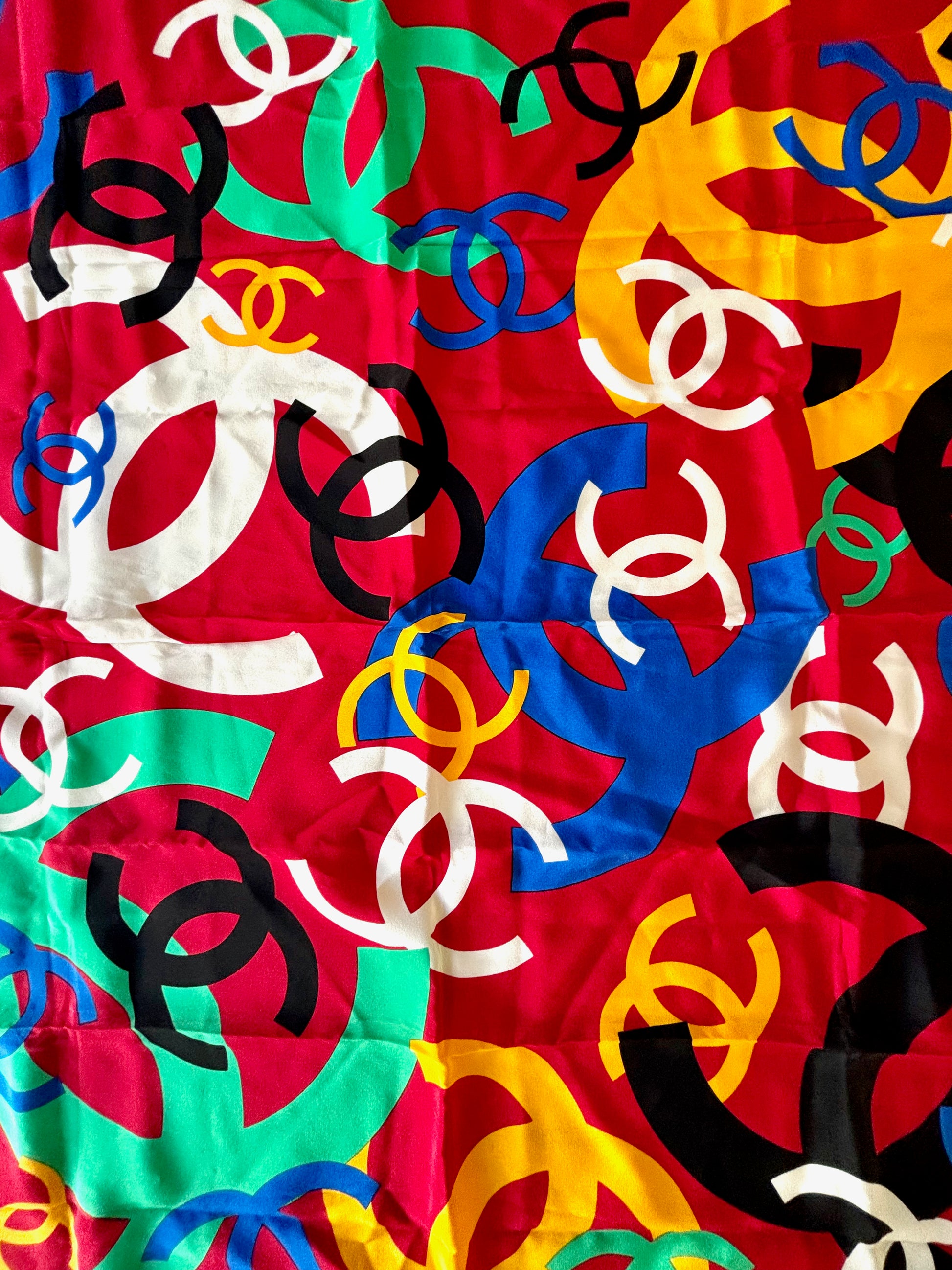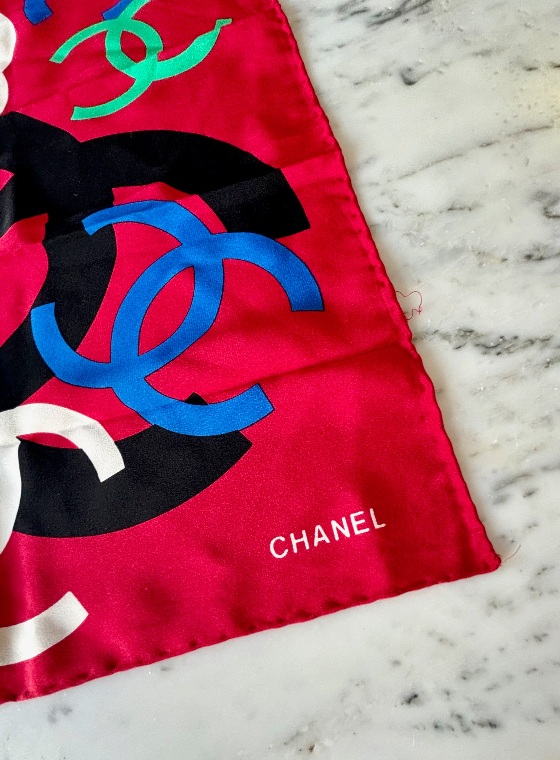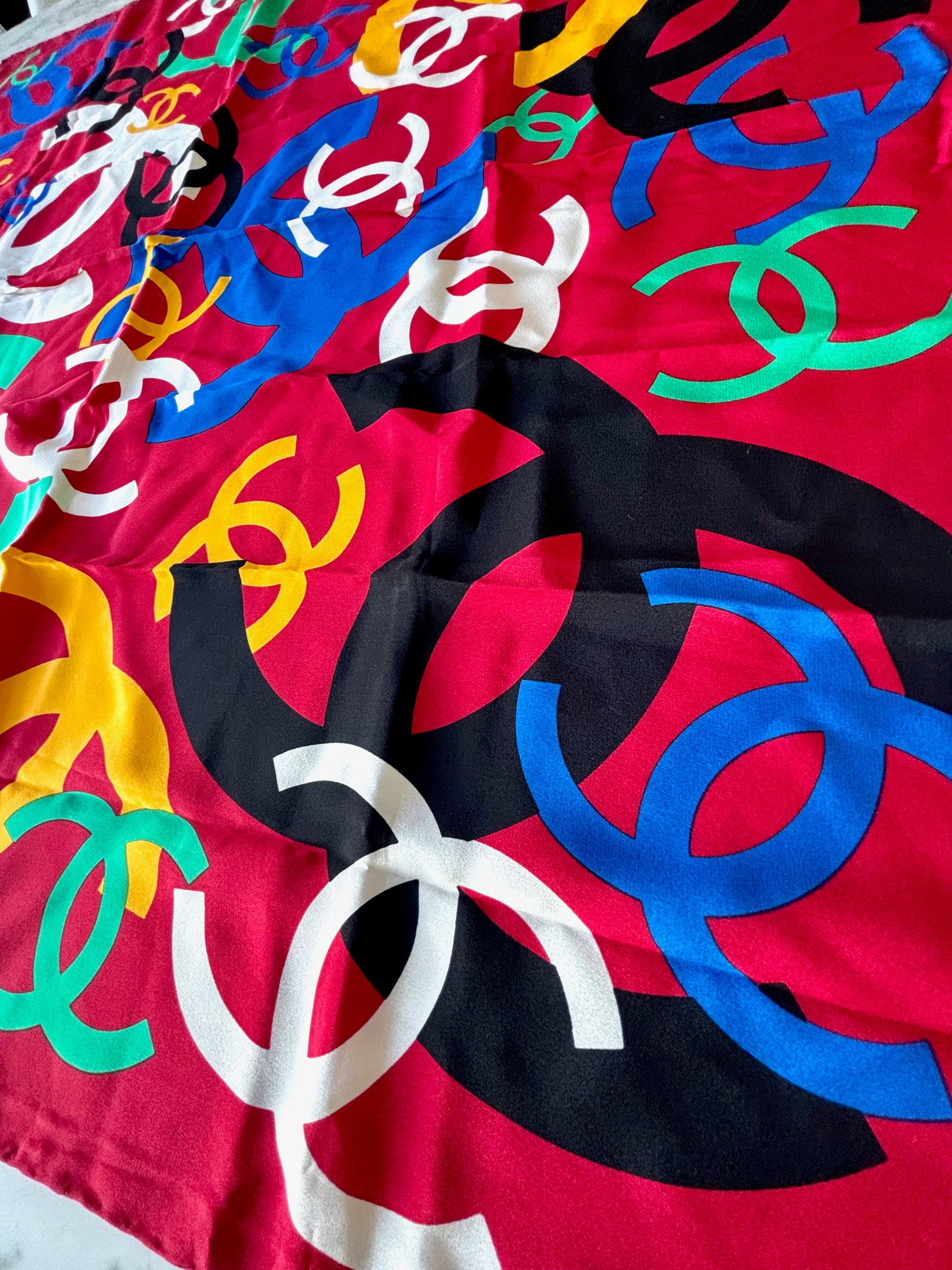 * Motifs logo CC Chanel multicolores contrastants sur fond rouge