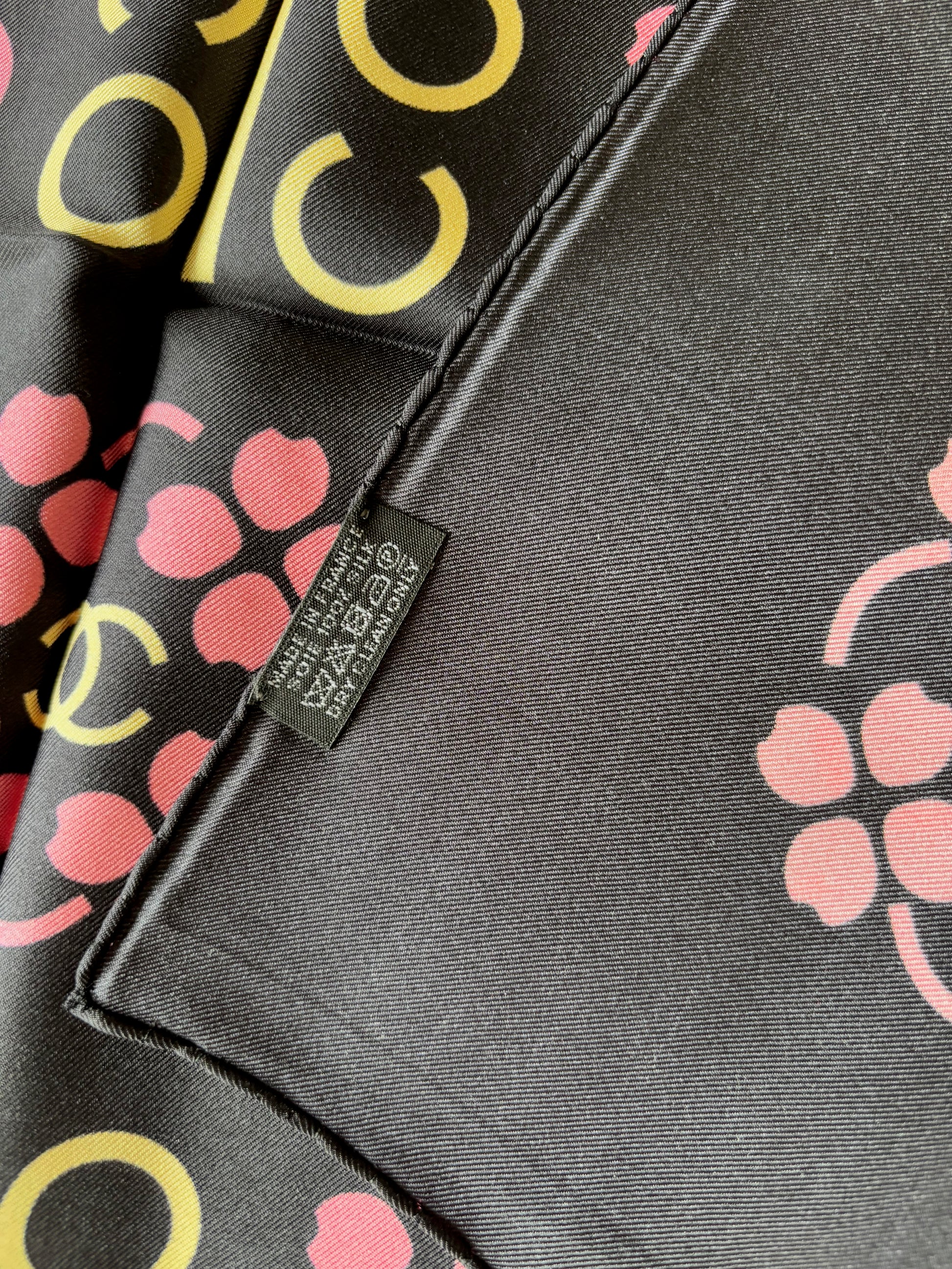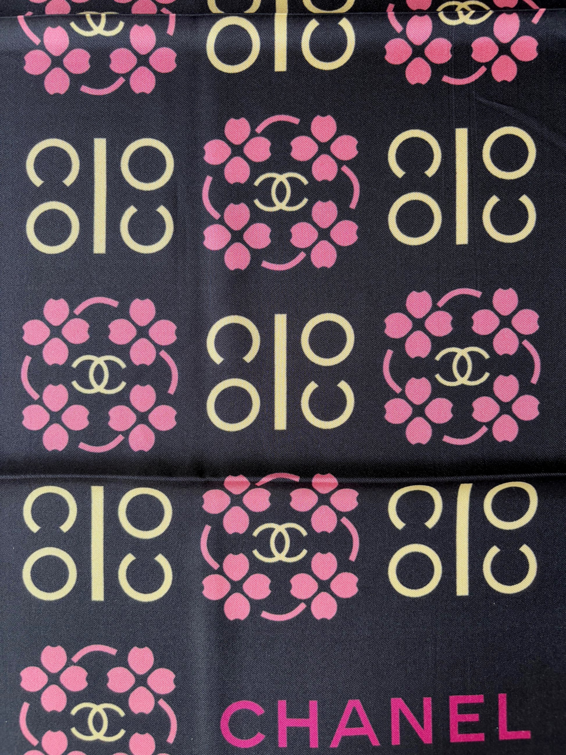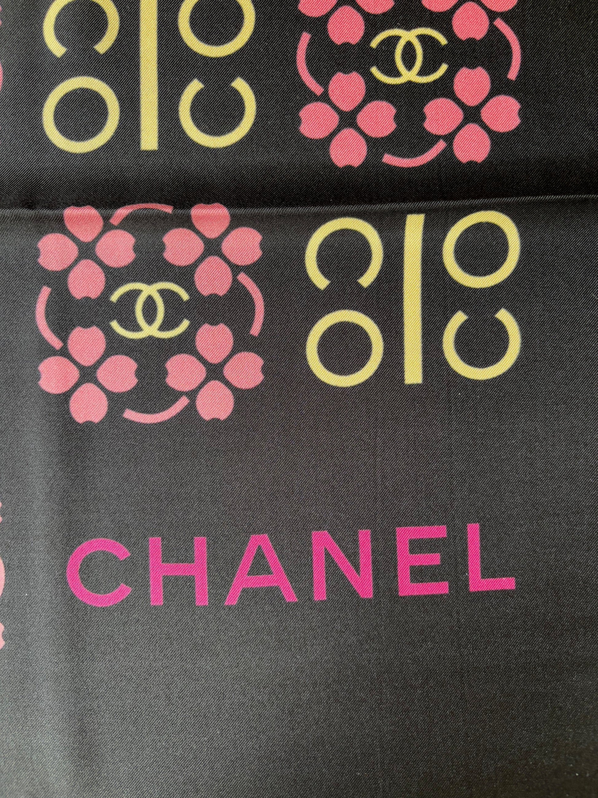 * Logo CHANEL de couleur rouge dans l'un des coins du foulard