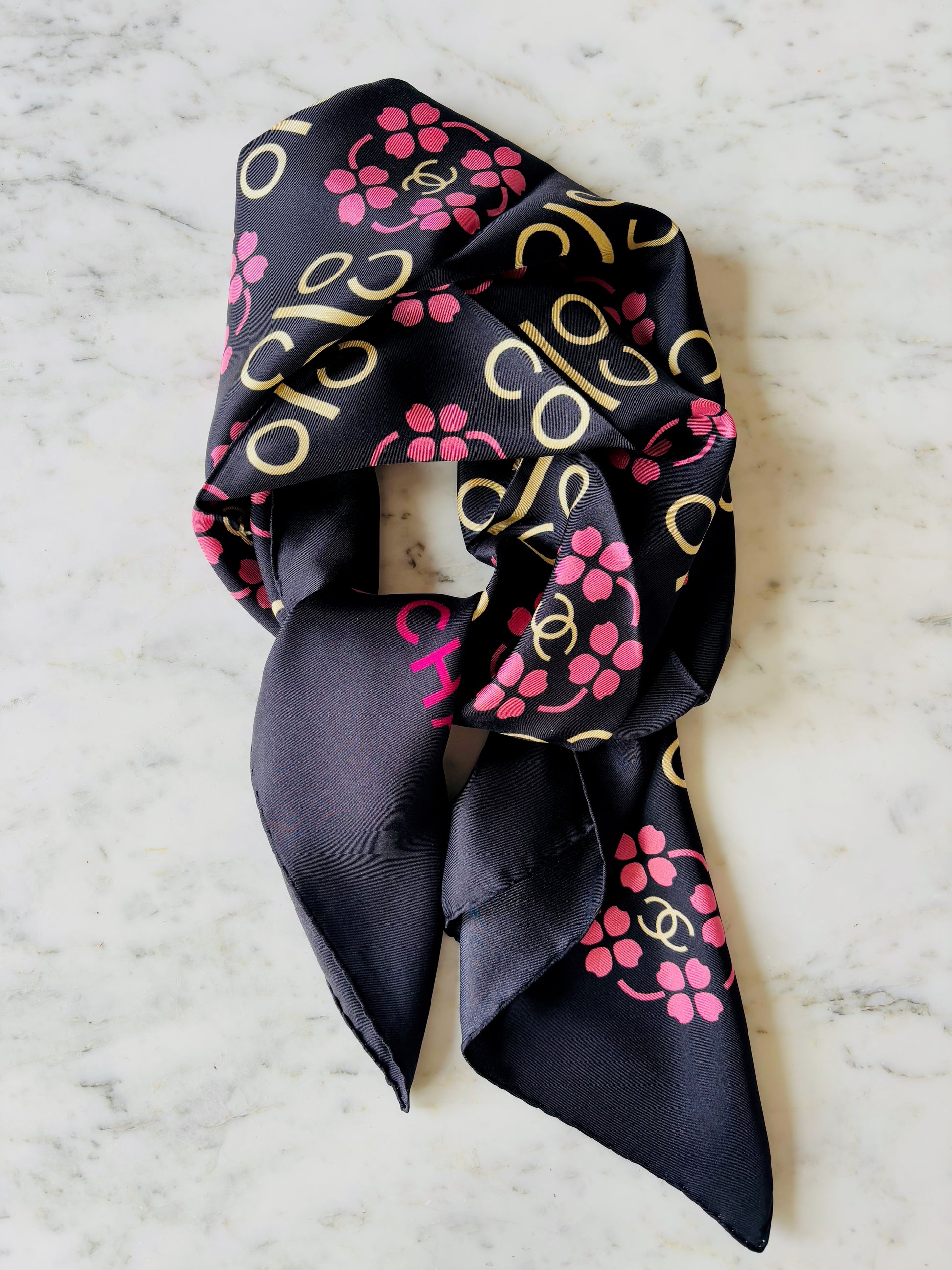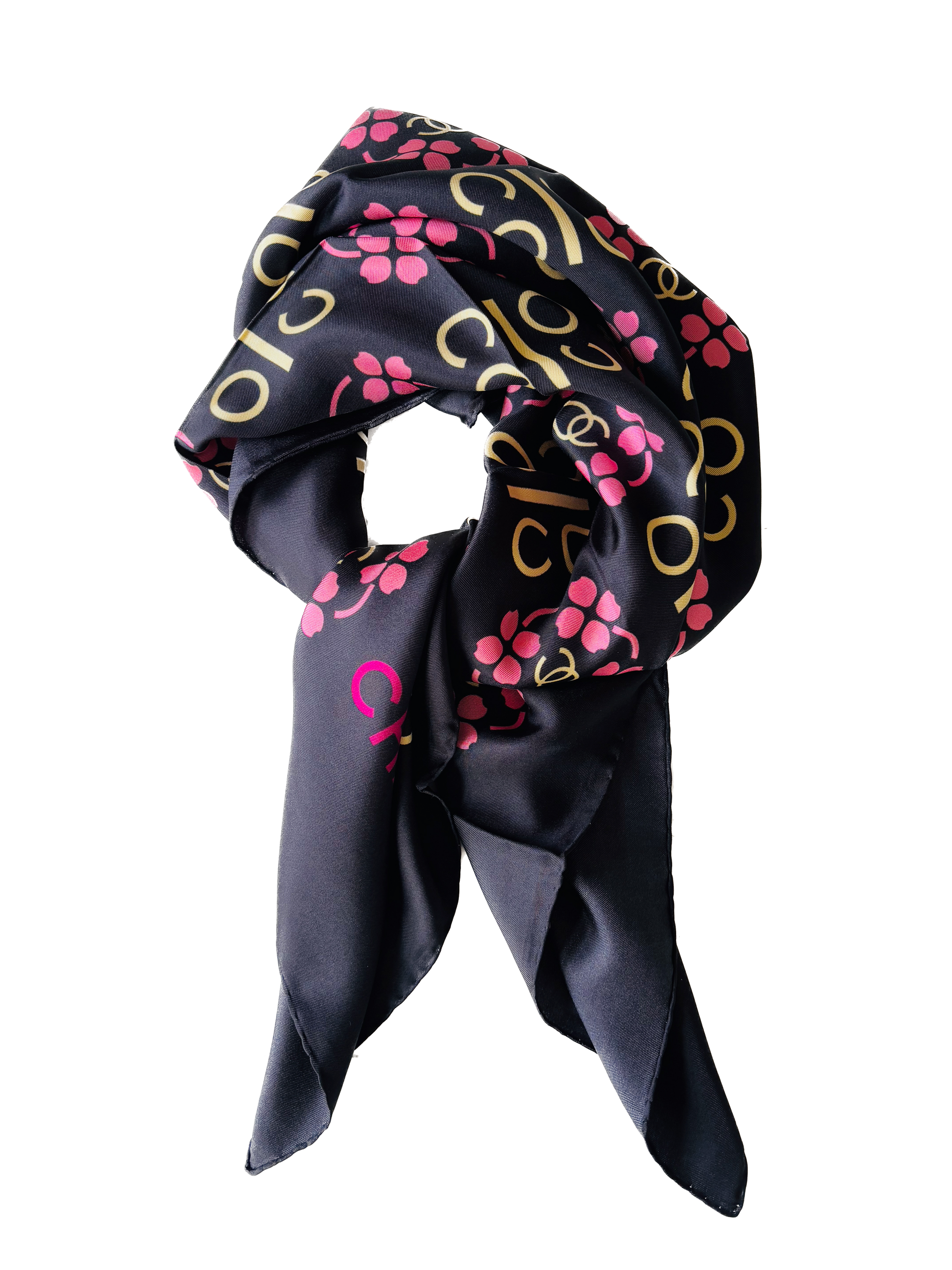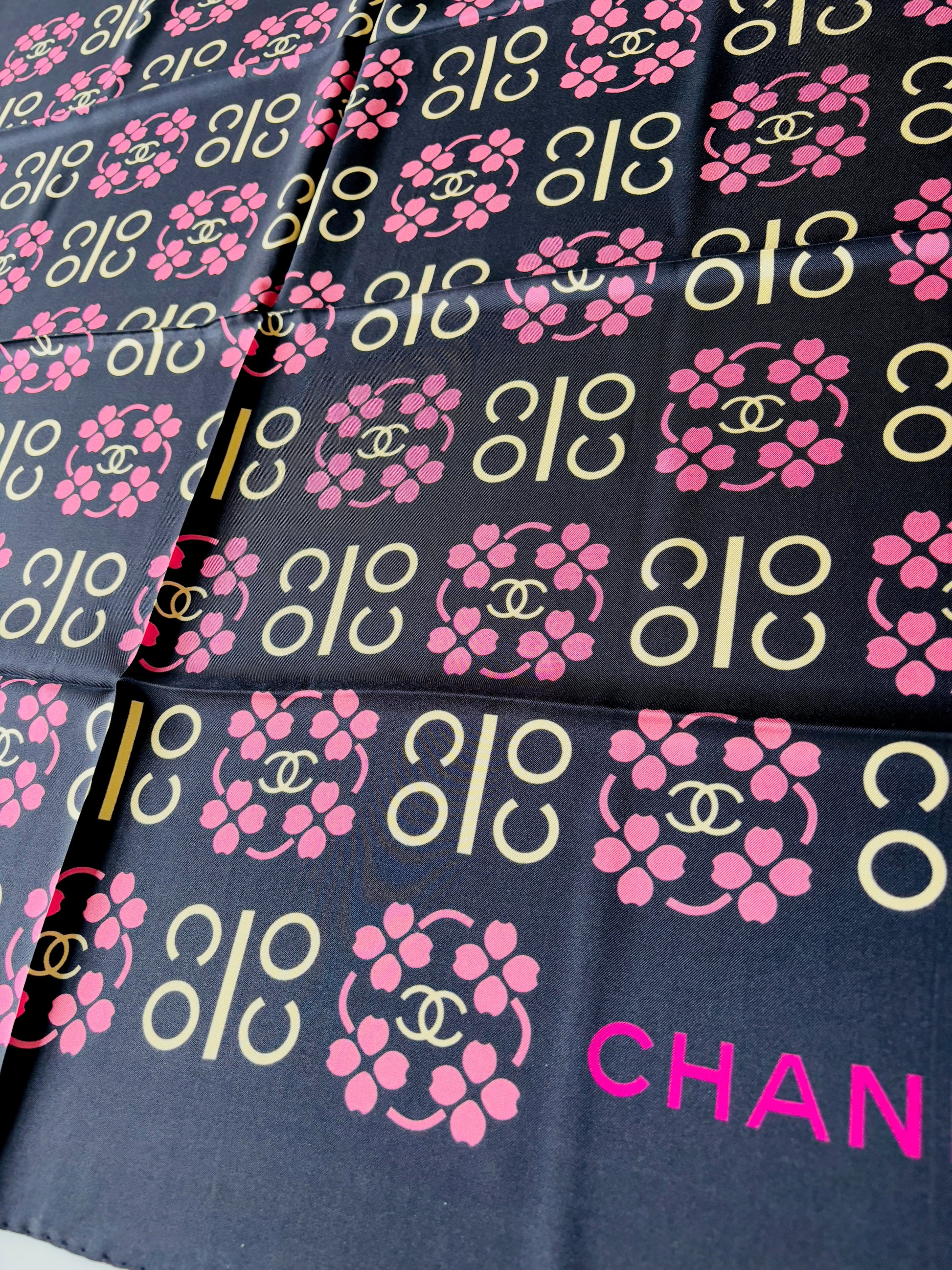 * Logo CHANEL de couleur rouge dans l'un des coins du foulard