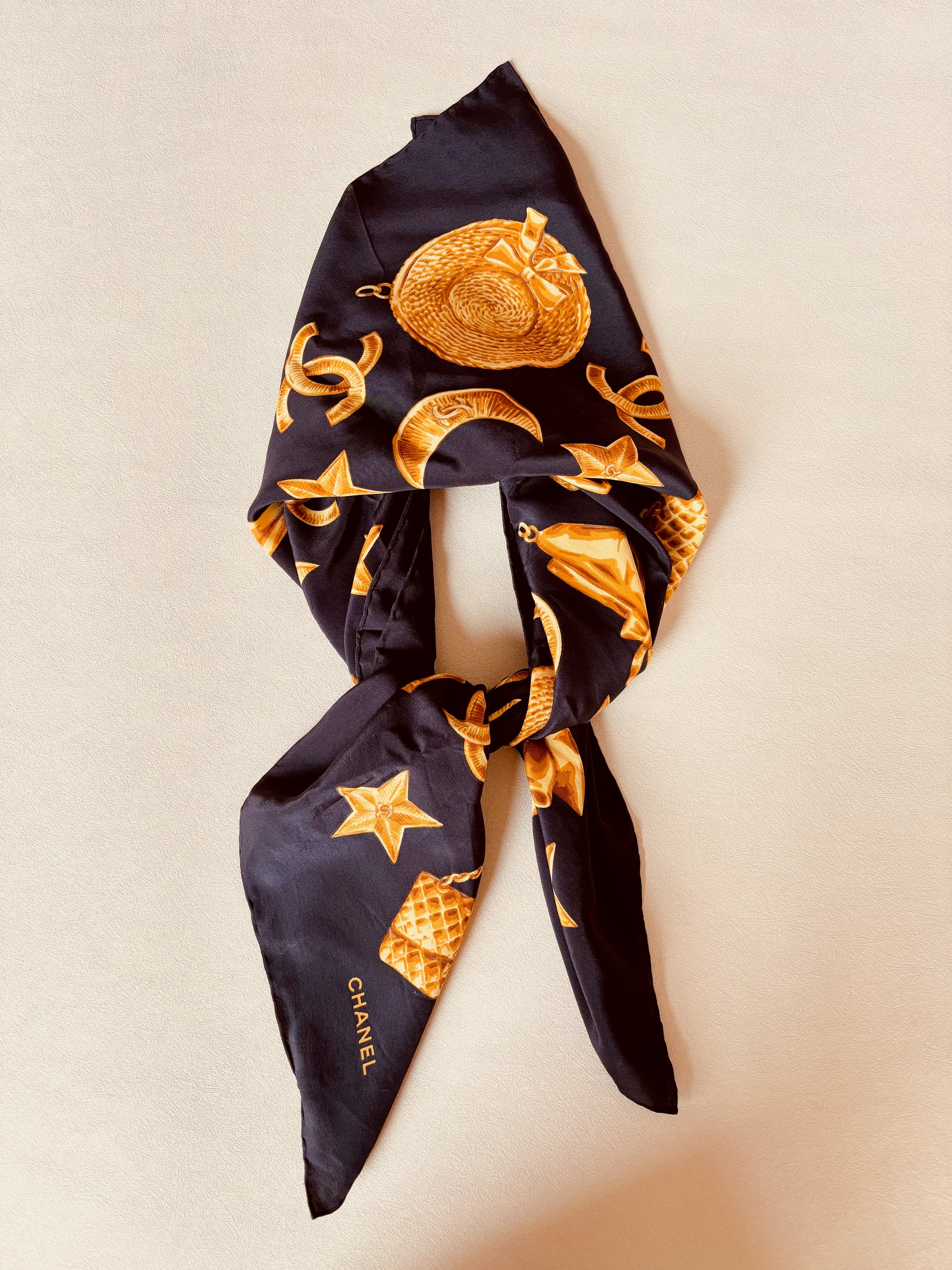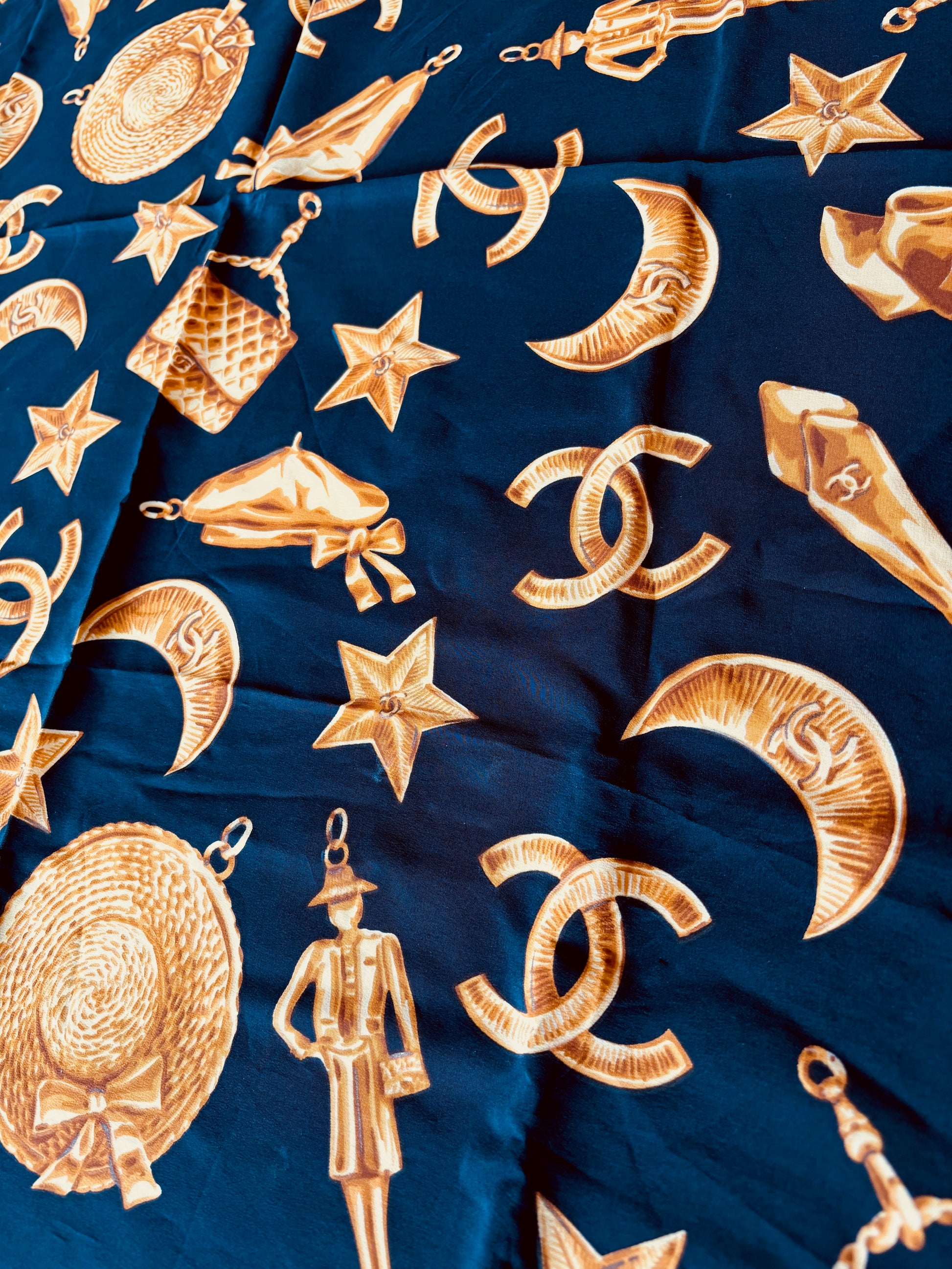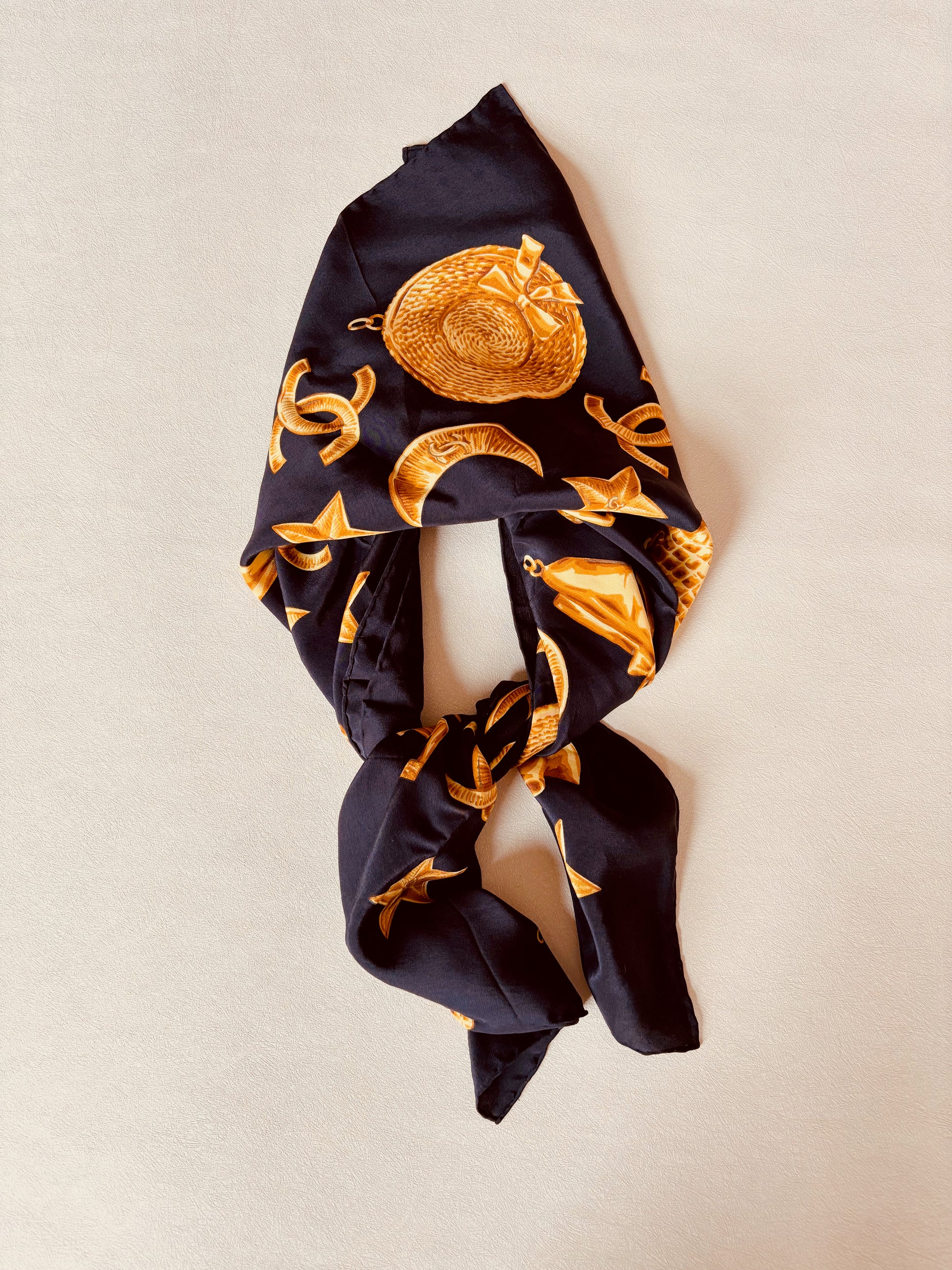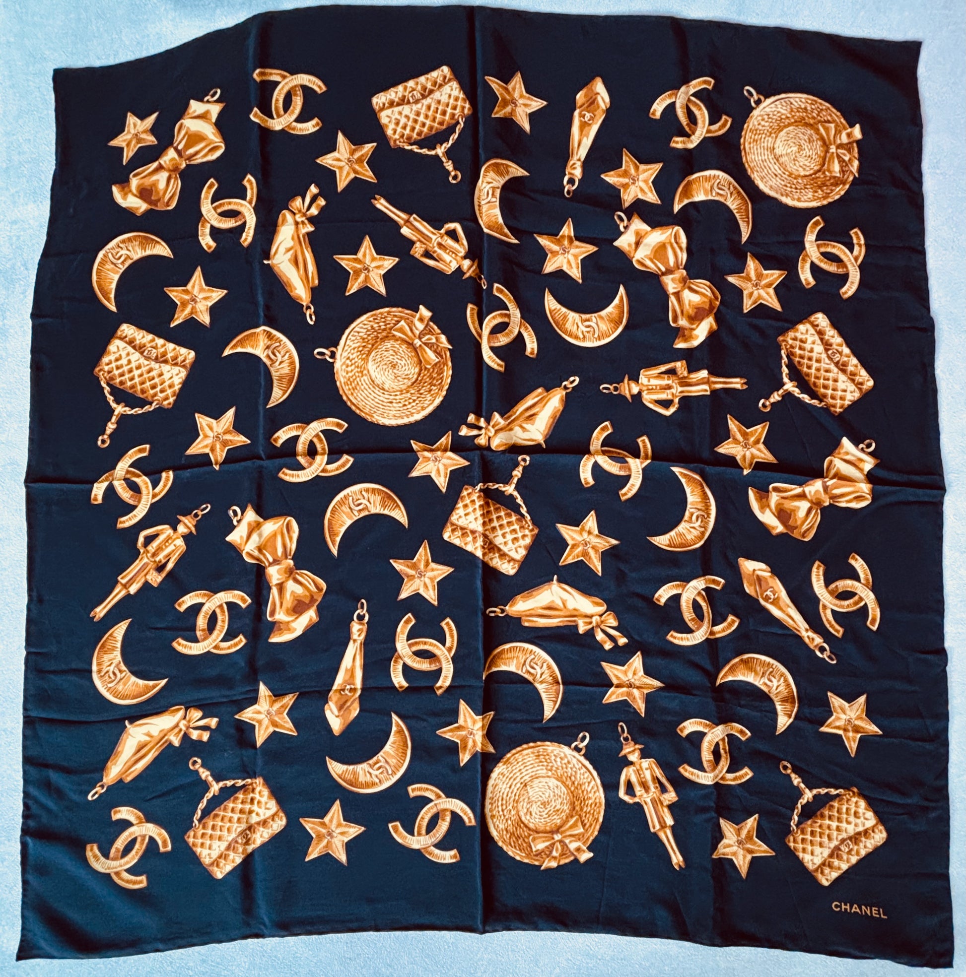 * Motifs dorés emblématiques de la marque (sac Timeless, logo CC...) sur fond noir