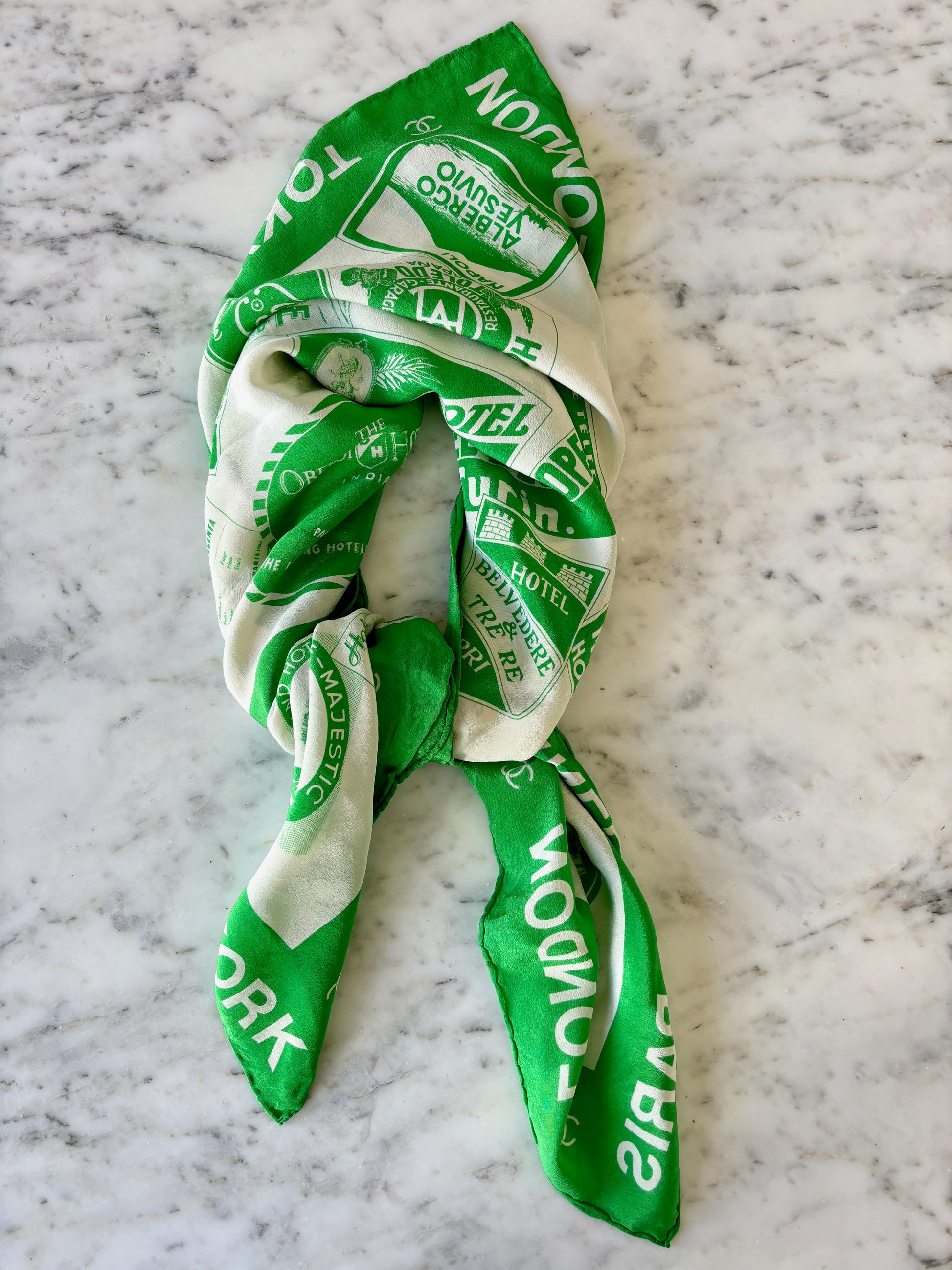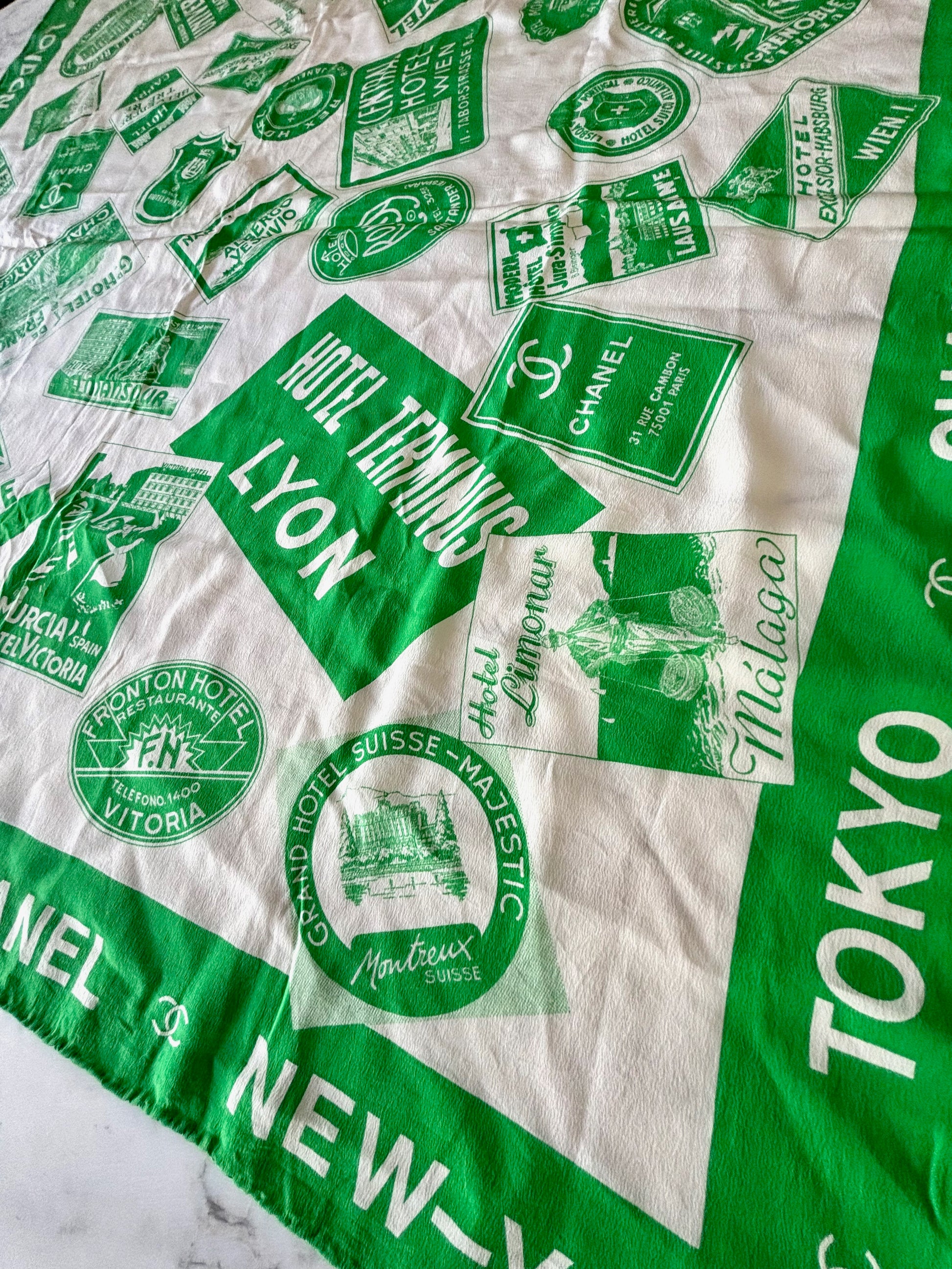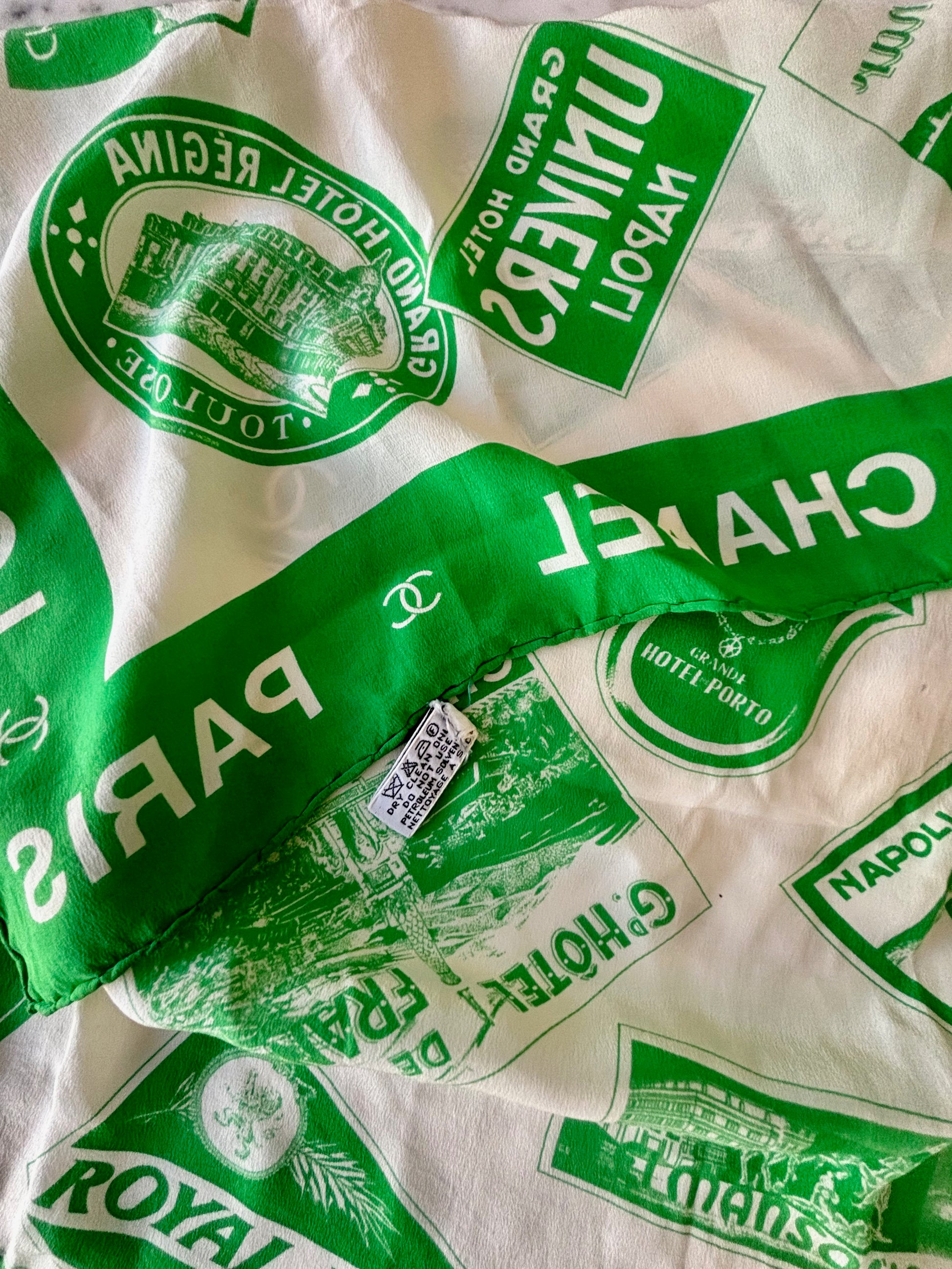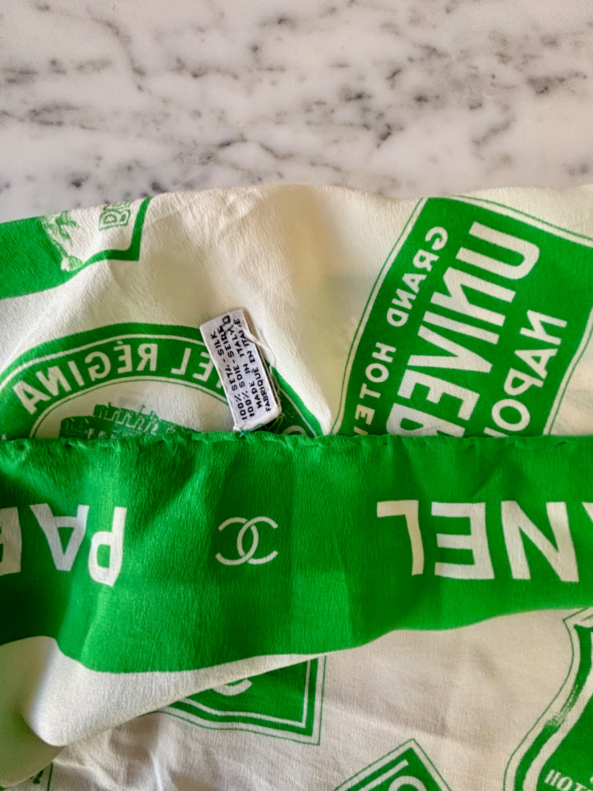 * Inscription des capitales et du logo Chanel en blanc sur bordure verte, ponctuée de l'emblématique logo CC