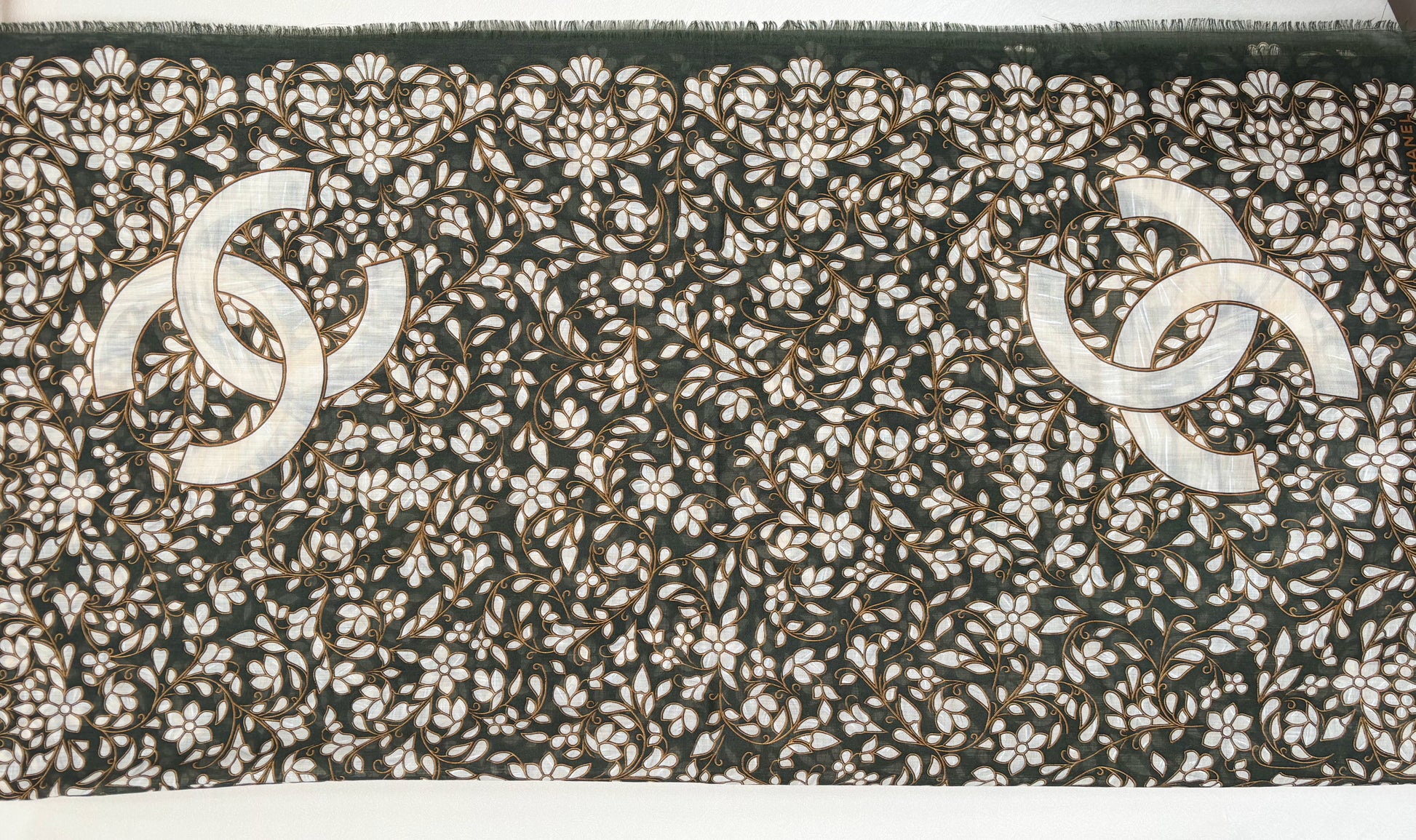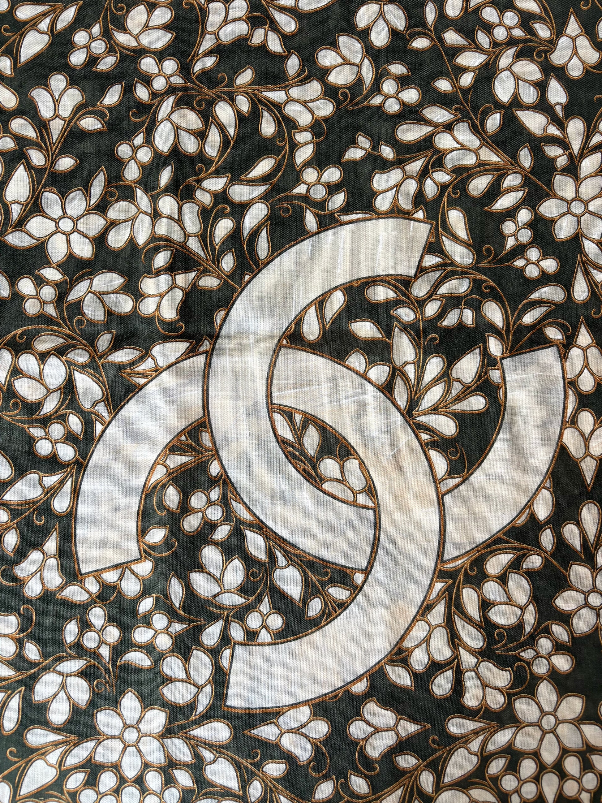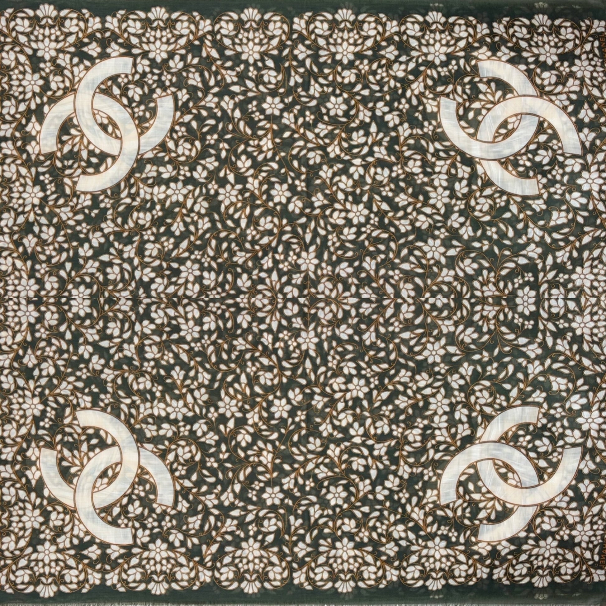 * Motifs CC emblématiques de la marque, sur un fond fleuri kaki