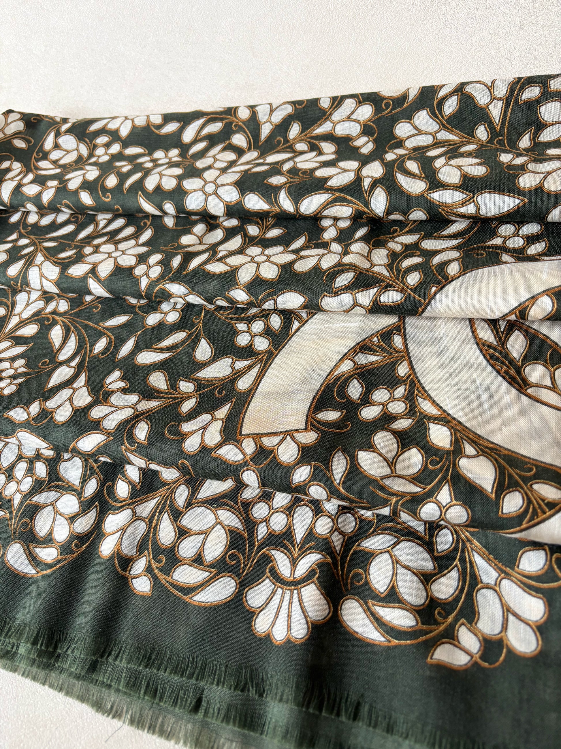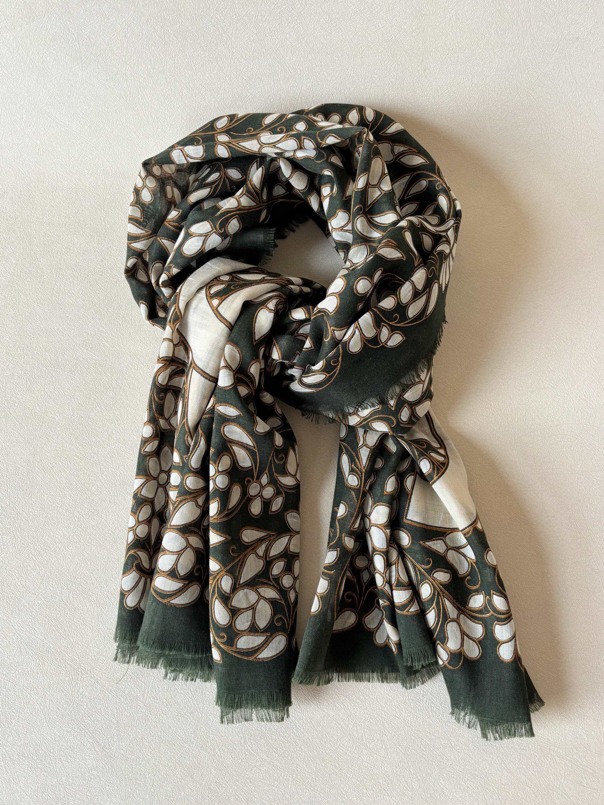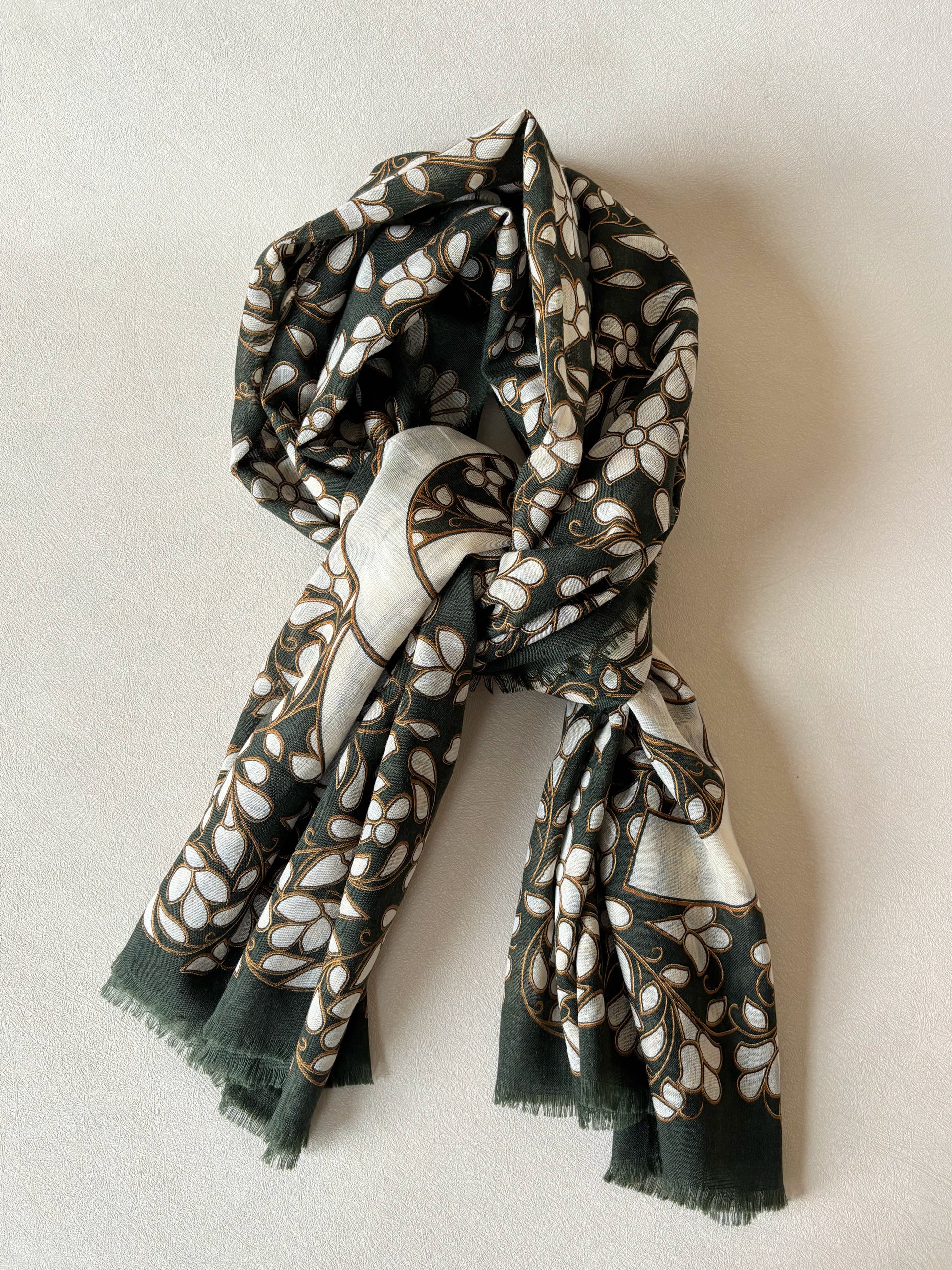 * Motifs CC emblématiques de la marque, sur un fond fleuri kaki