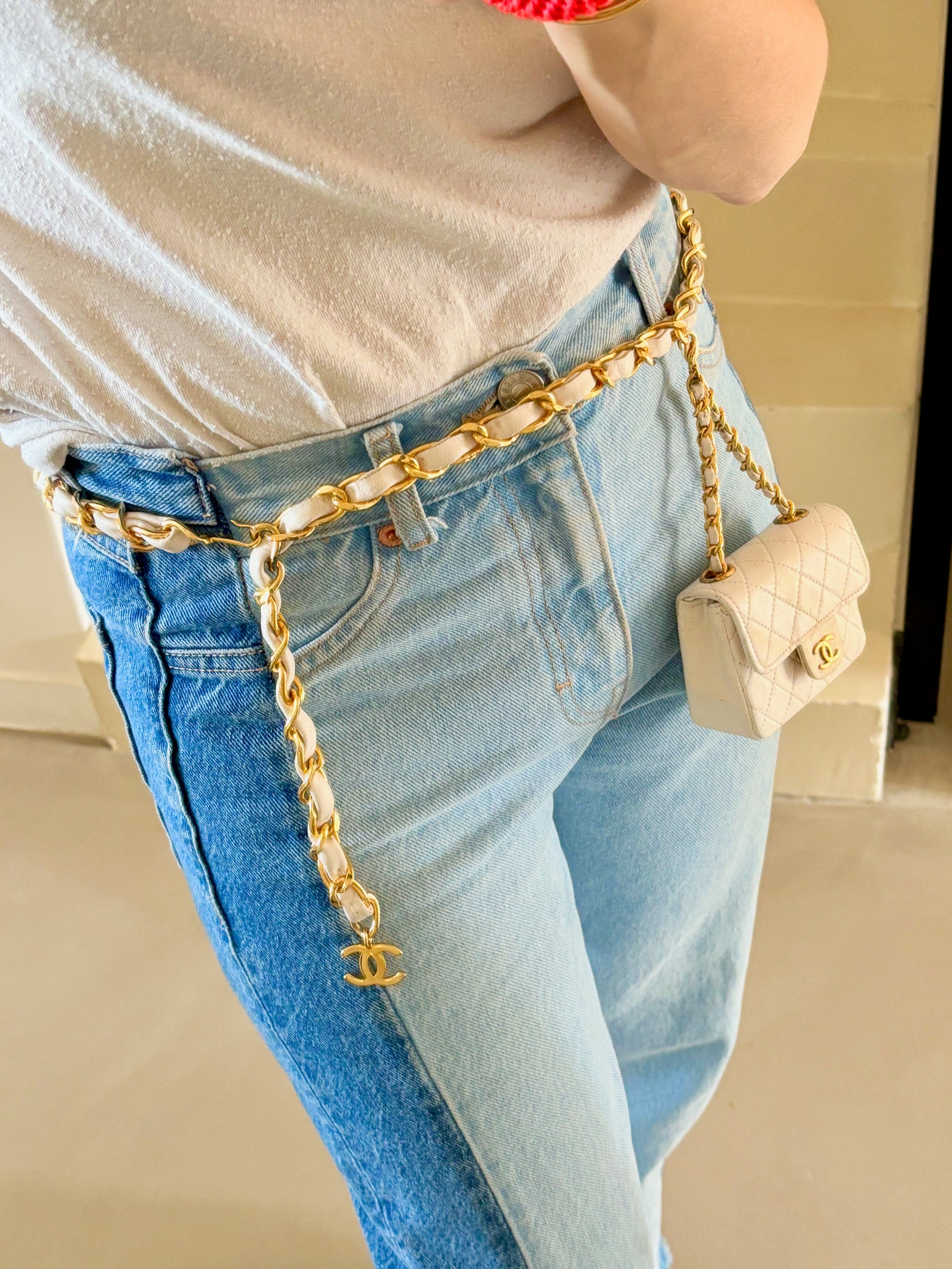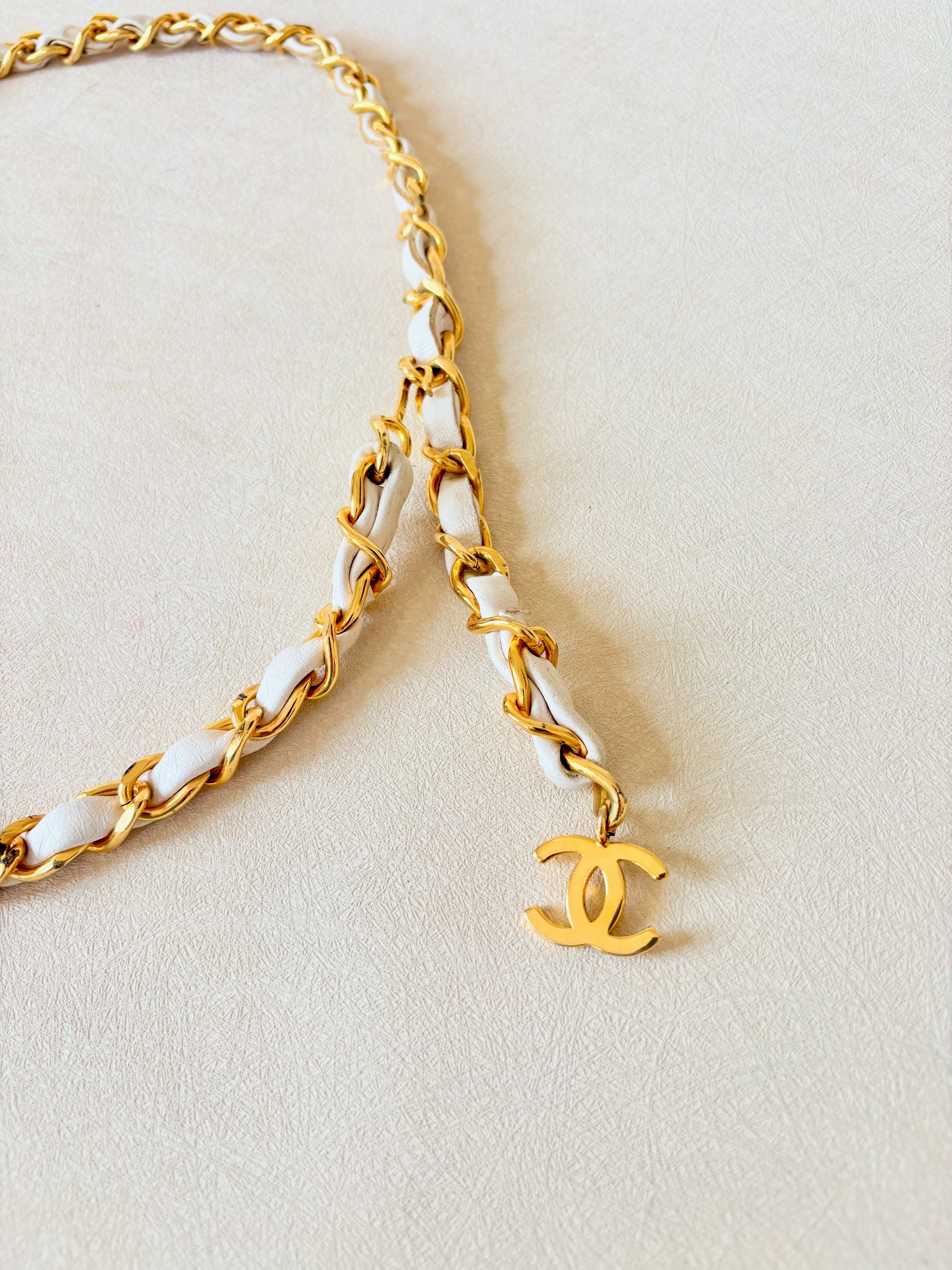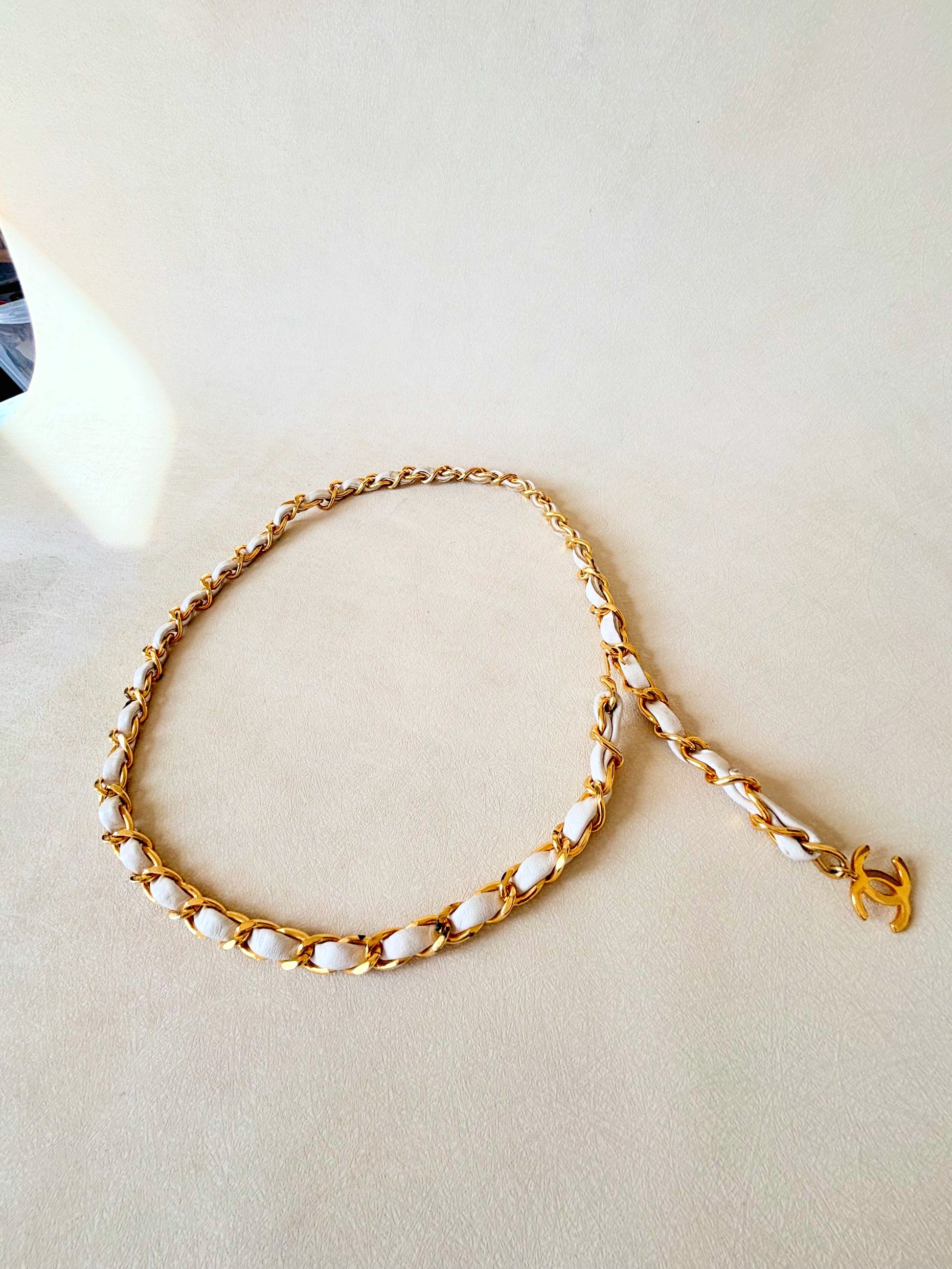 * Ceinture en chaîne dorée entrelacée de cuir blanc avec pendentif CC