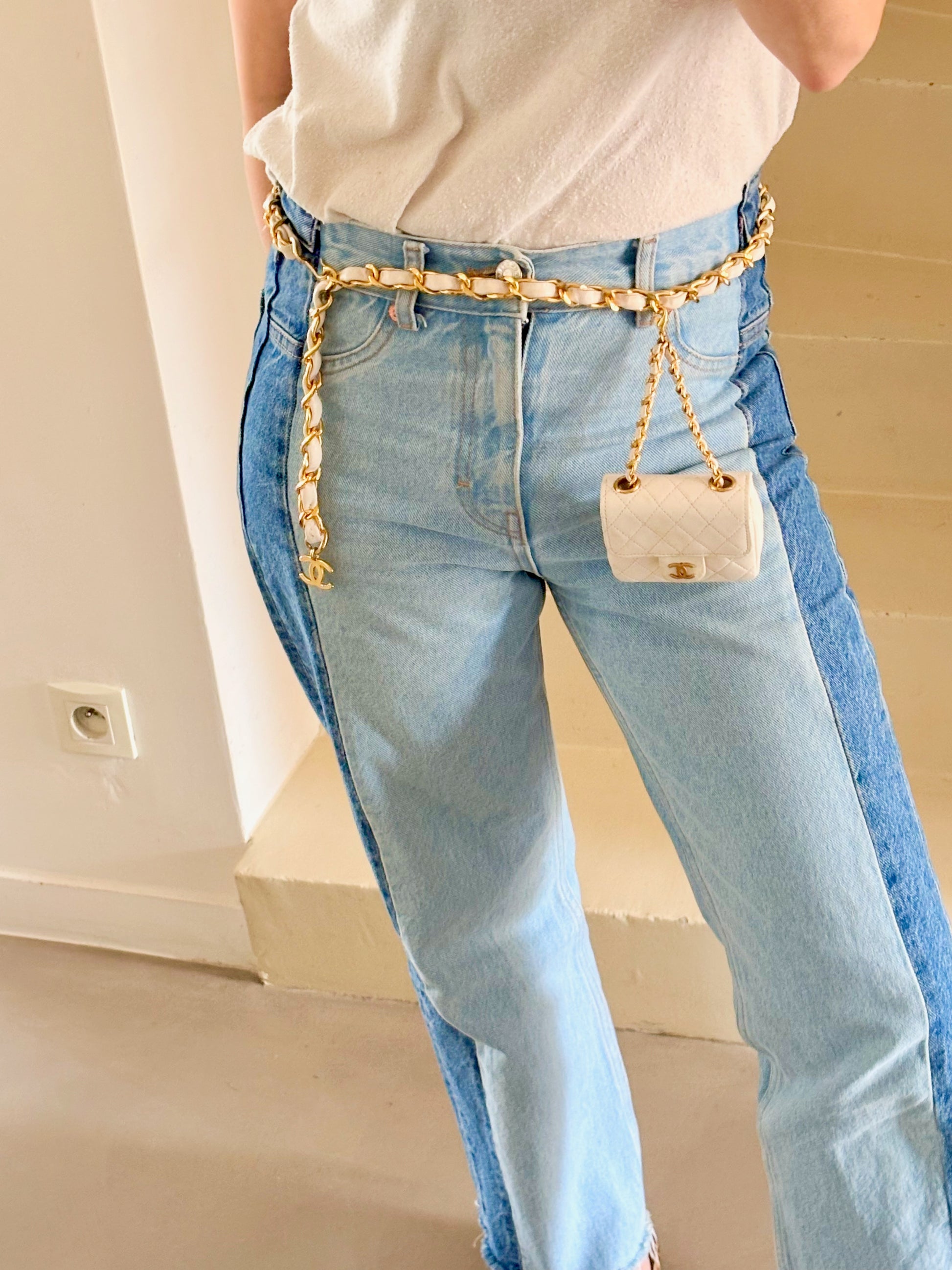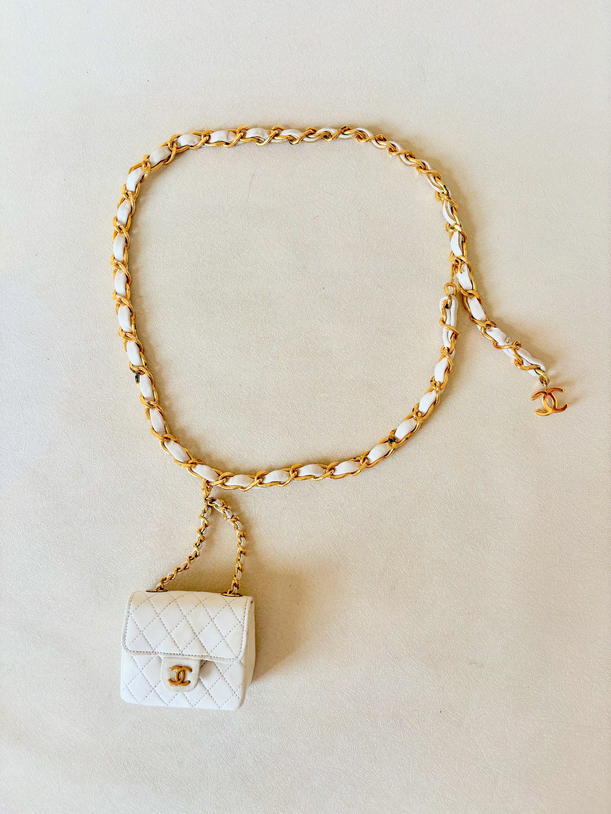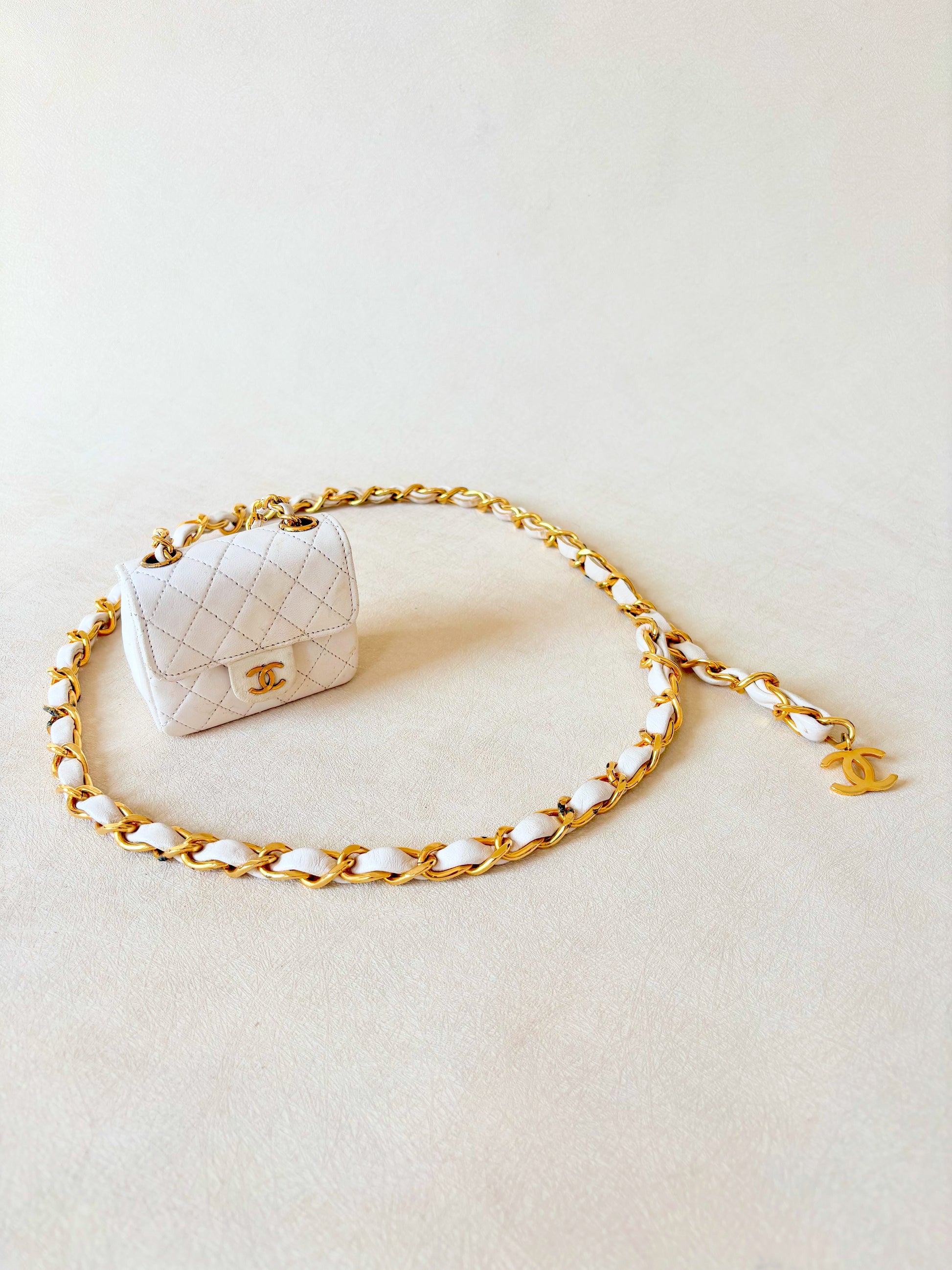 * Ceinture en chaîne dorée entrelacée de cuir blanc avec pendentif CC