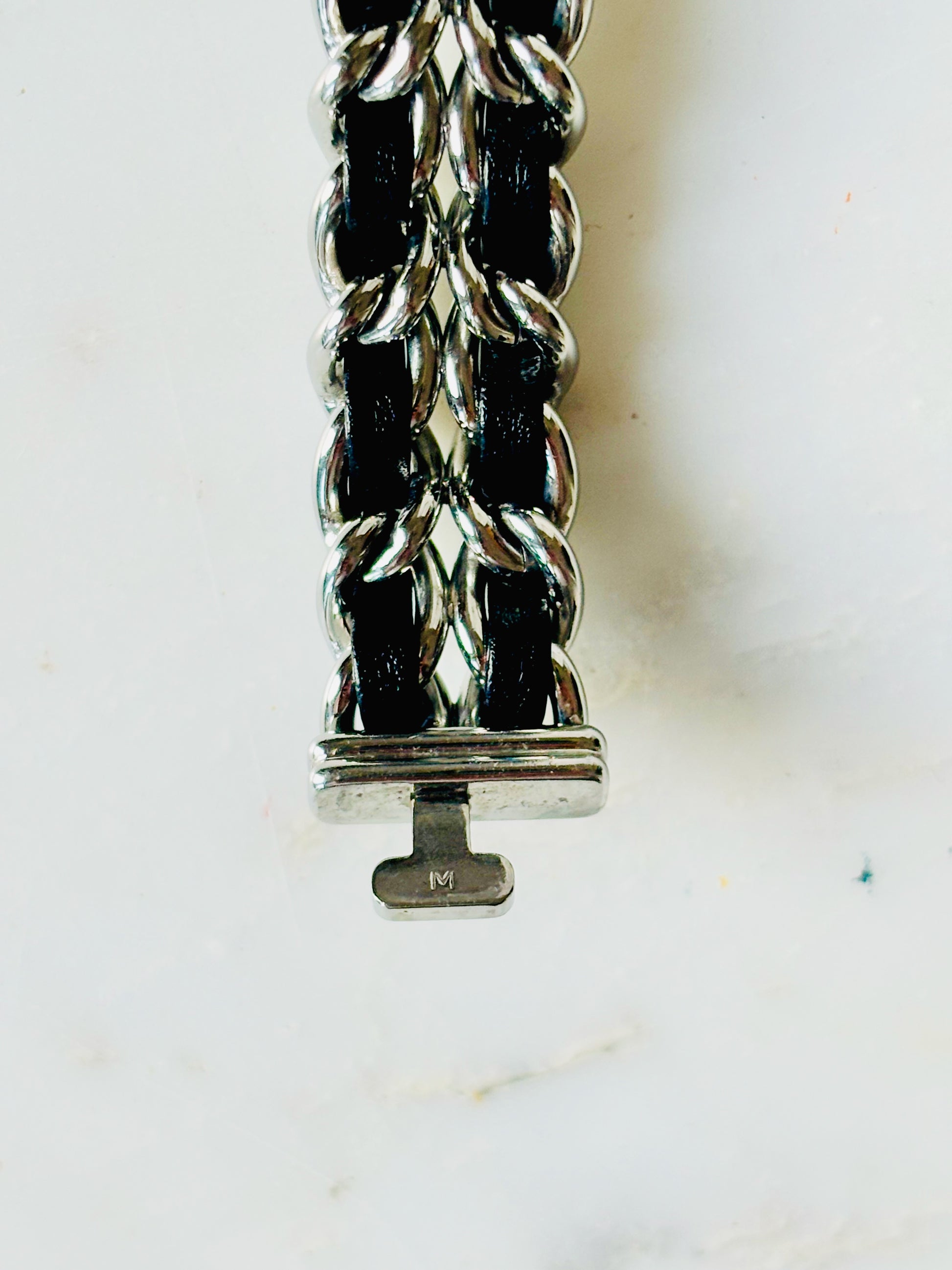 * Bracelet en chaine maillons en acier et cuir d’agneau