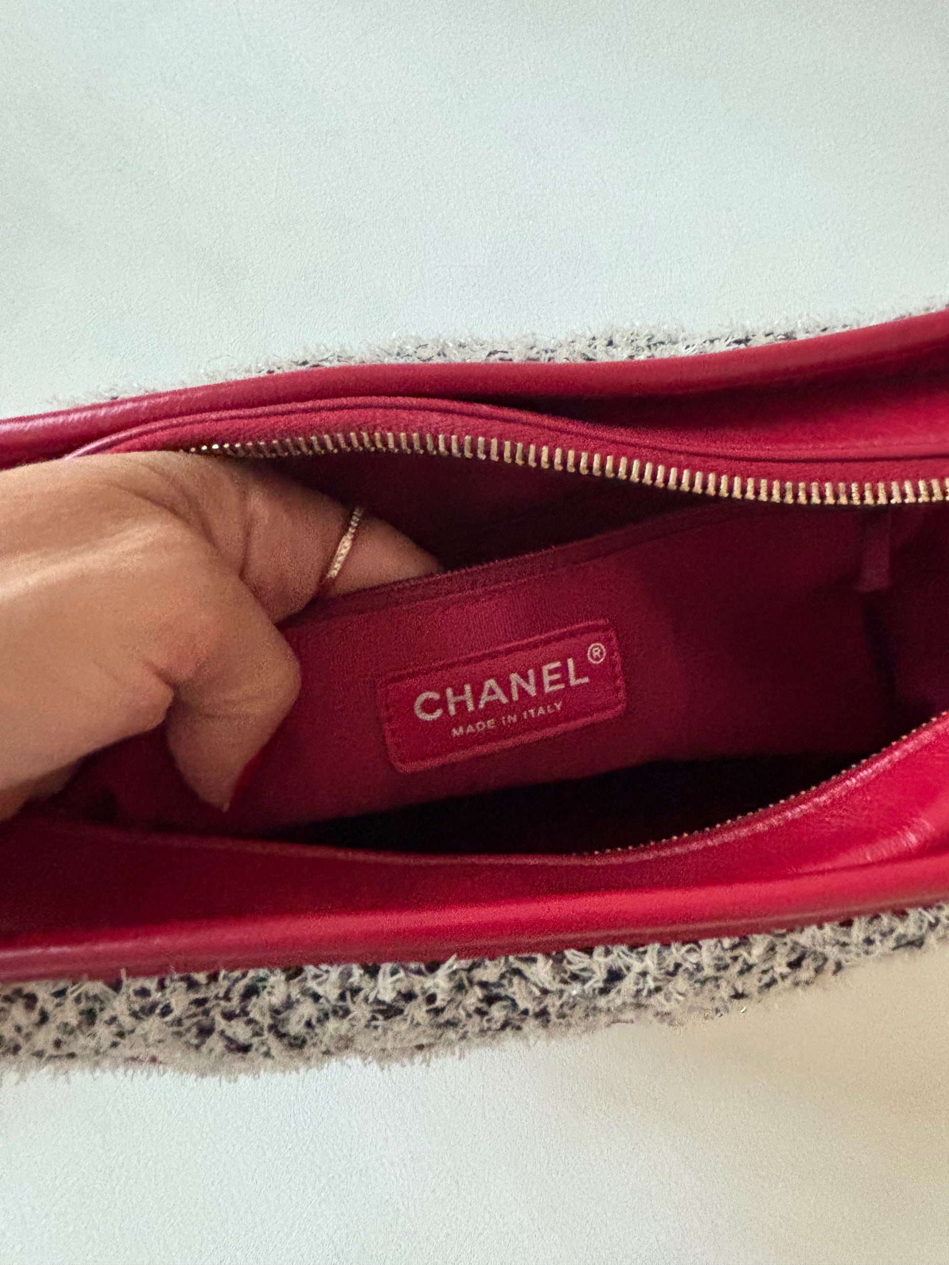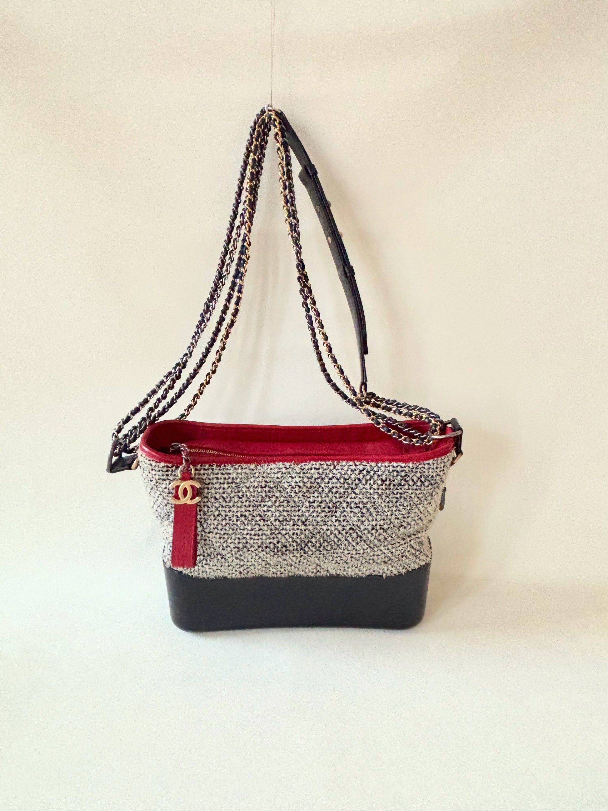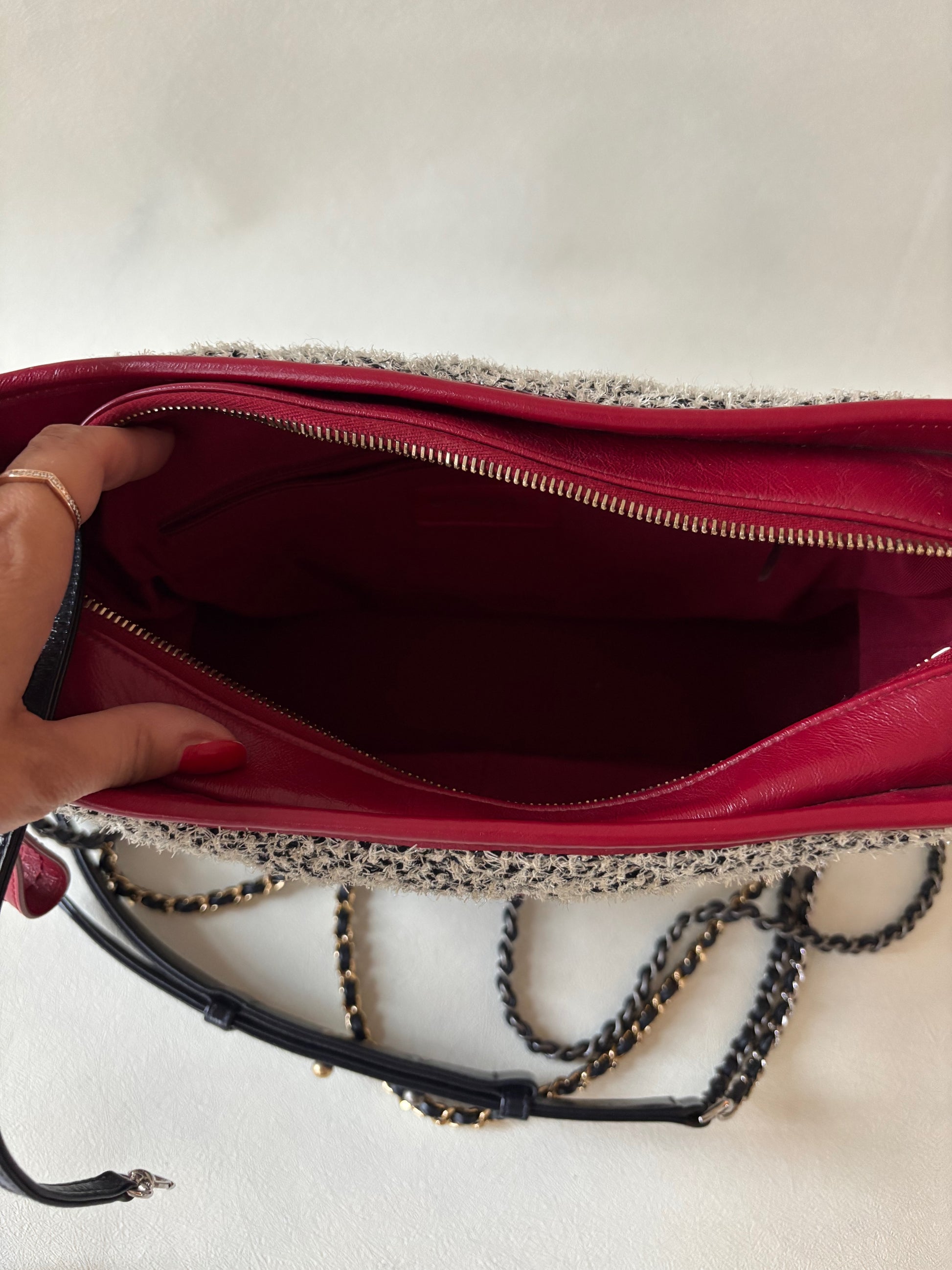 * En tweed gris et cuir : marine au bas du sac et rouge au niveau de l'ouverture