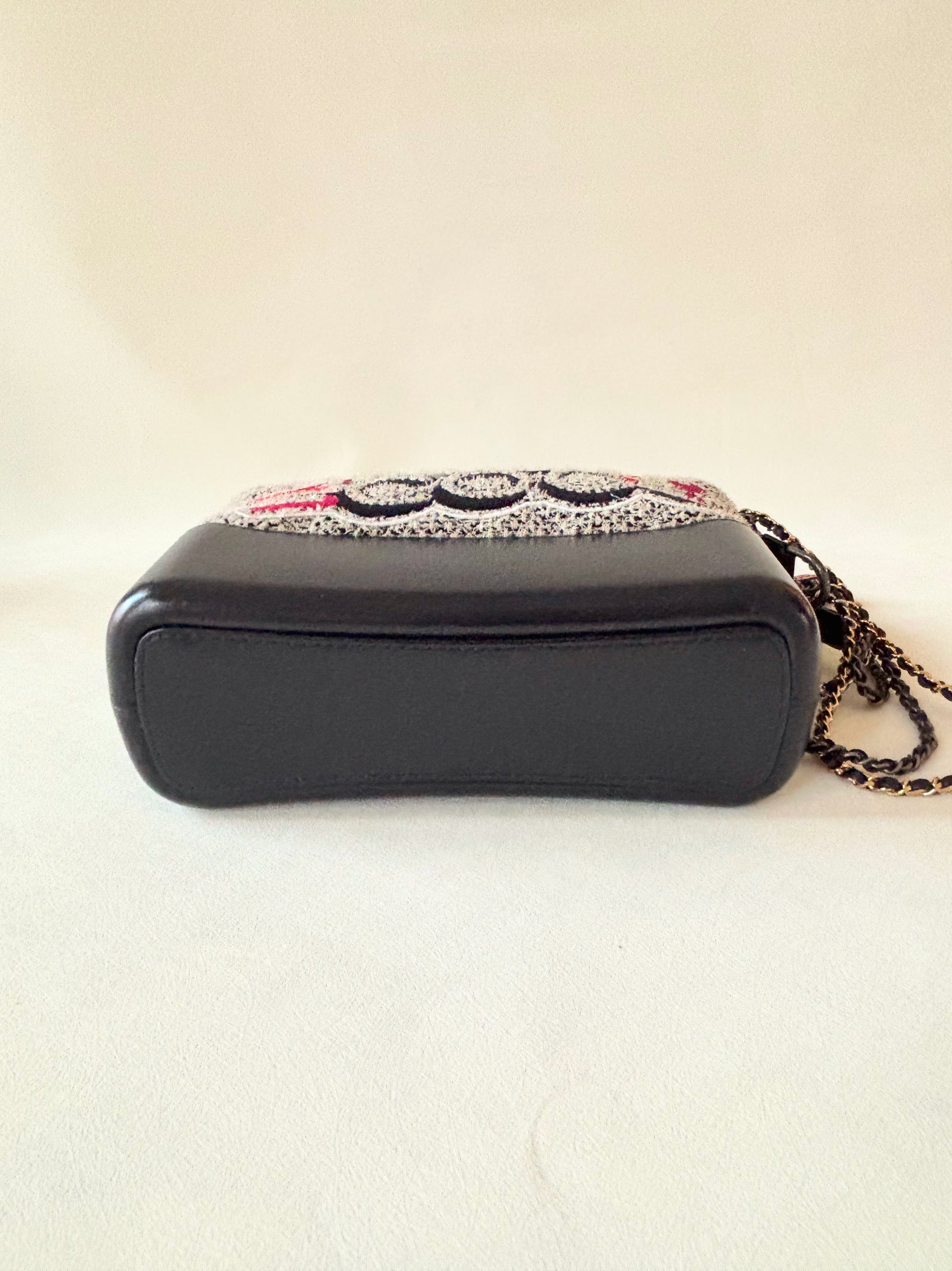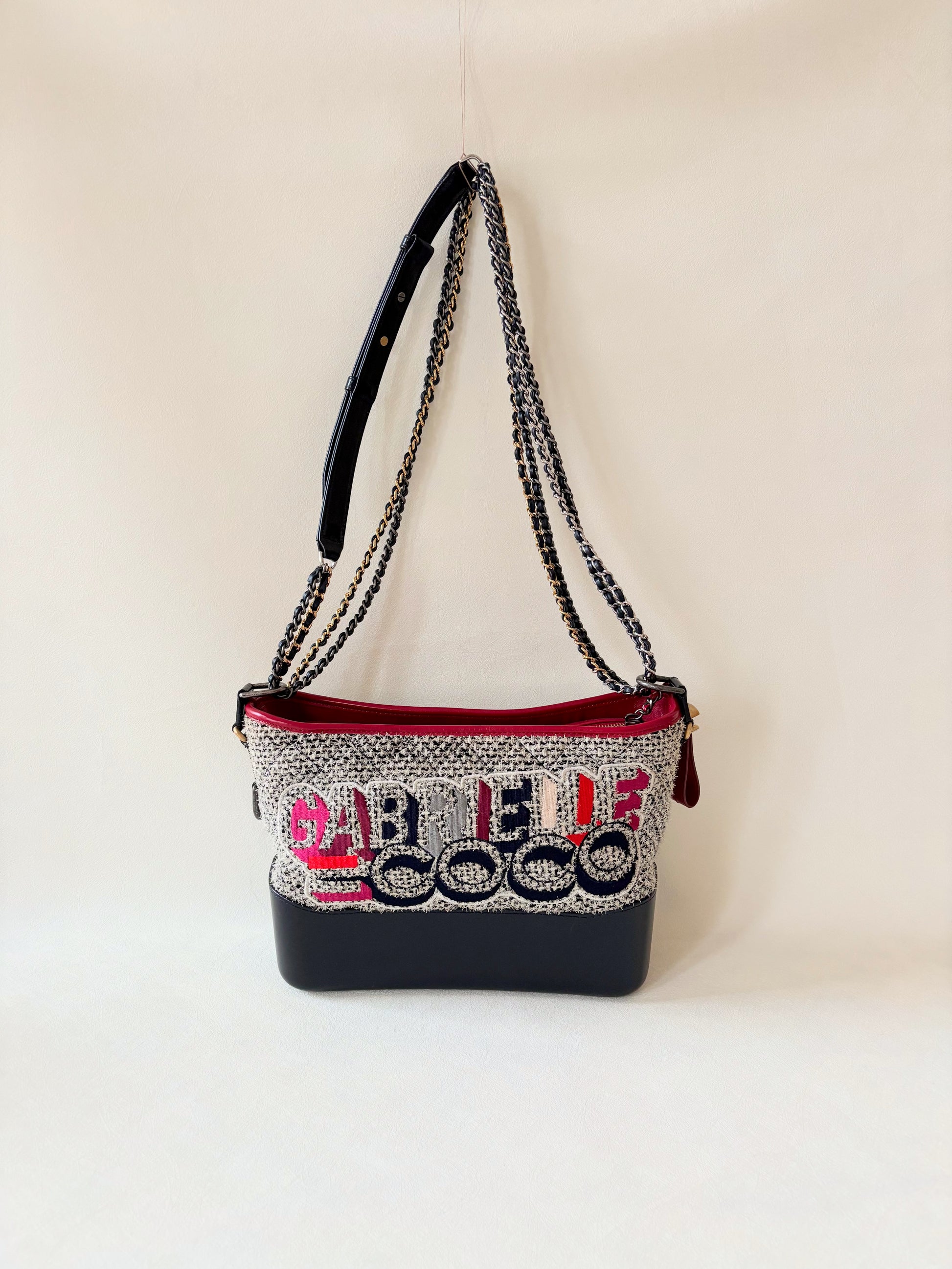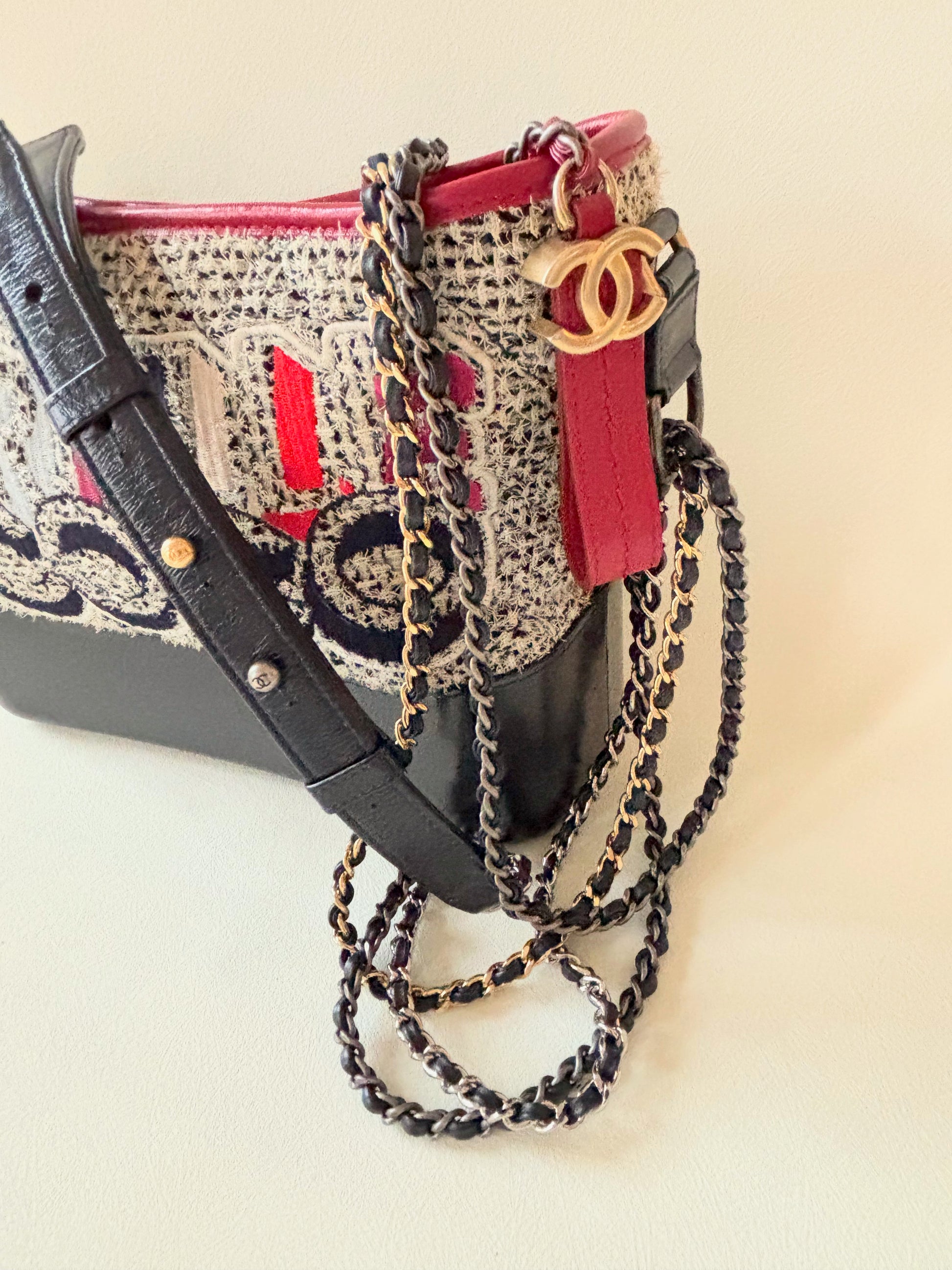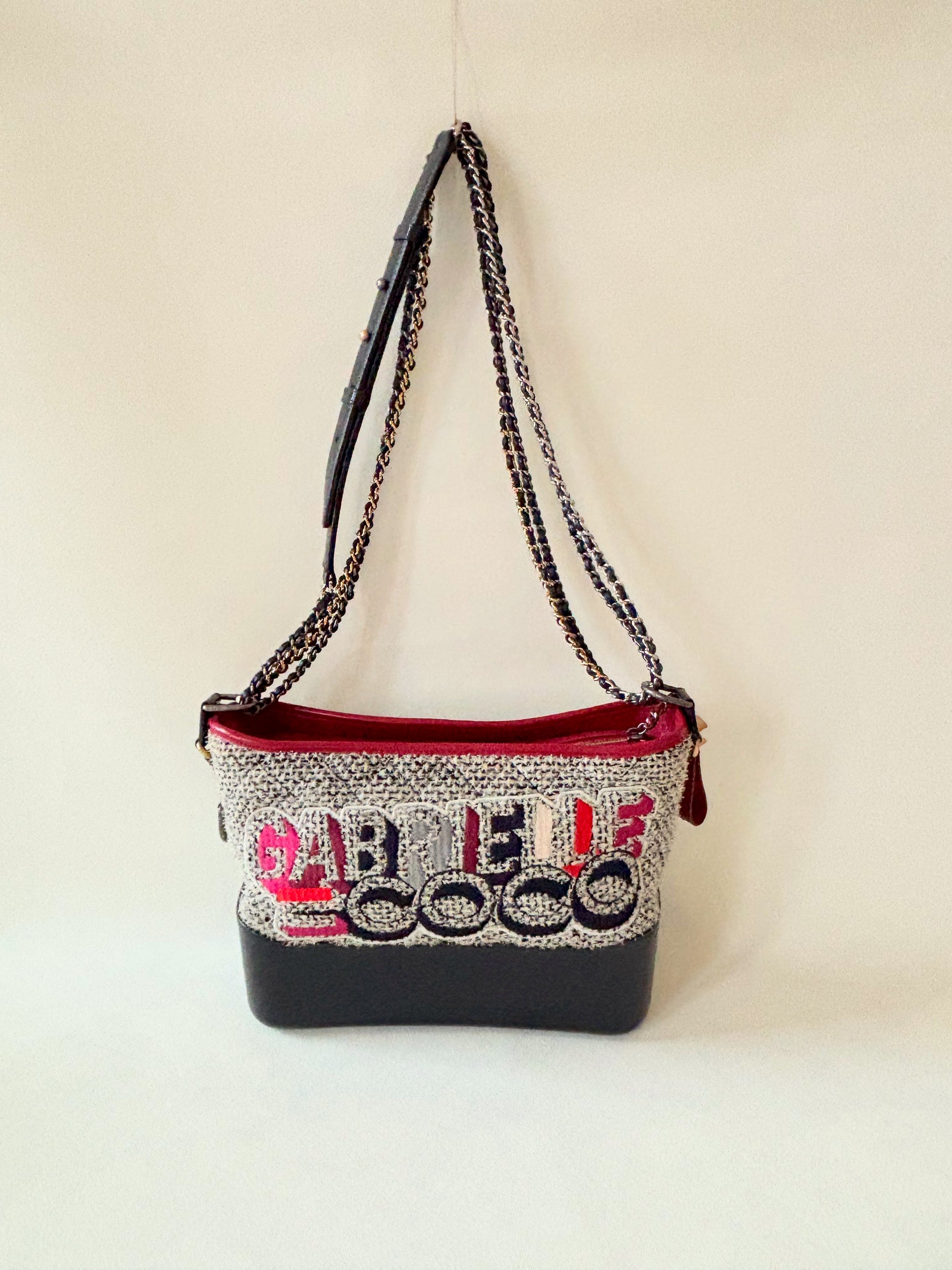 * En tweed gris et cuir : marine au bas du sac et rouge au niveau de l'ouverture