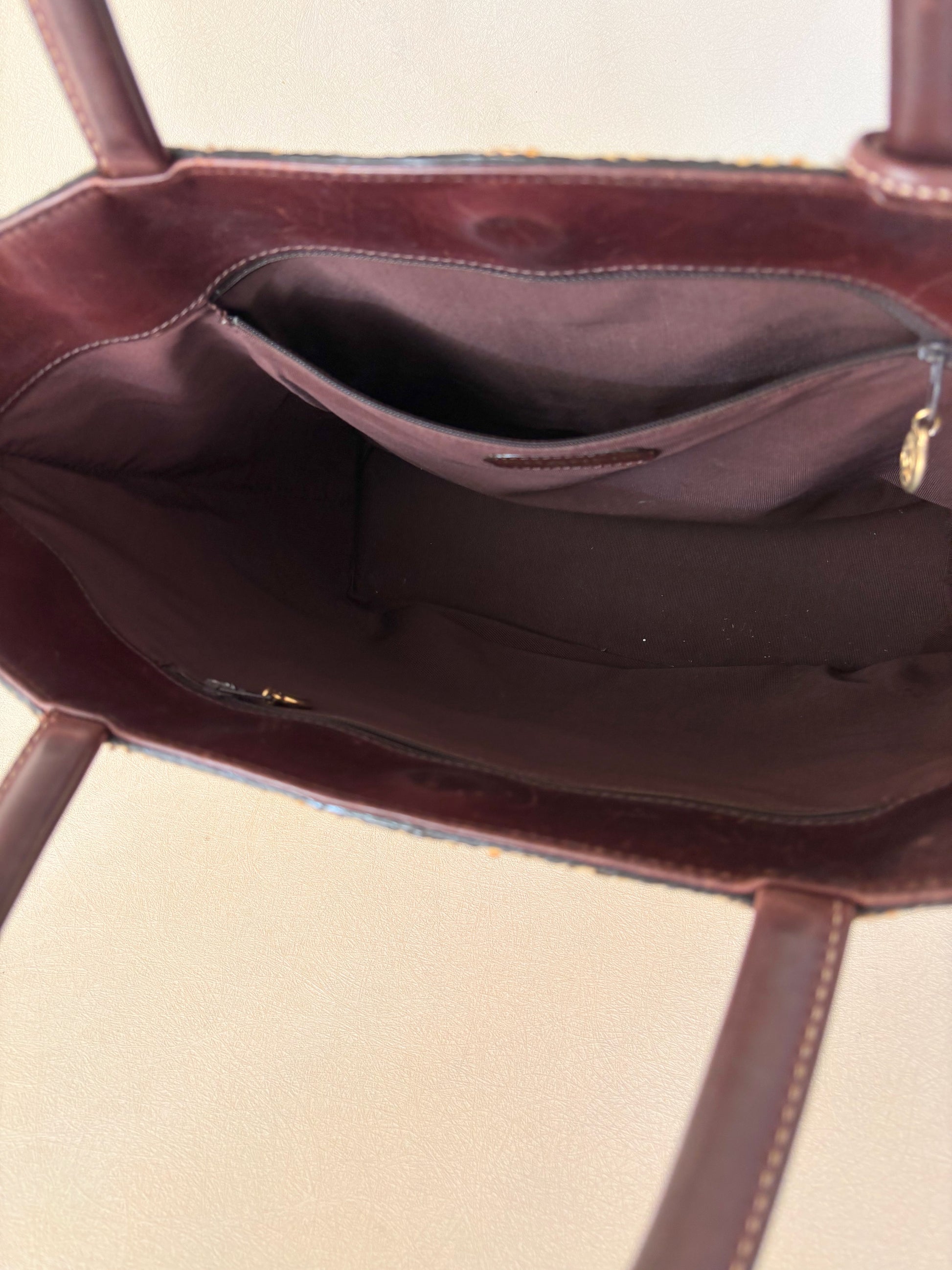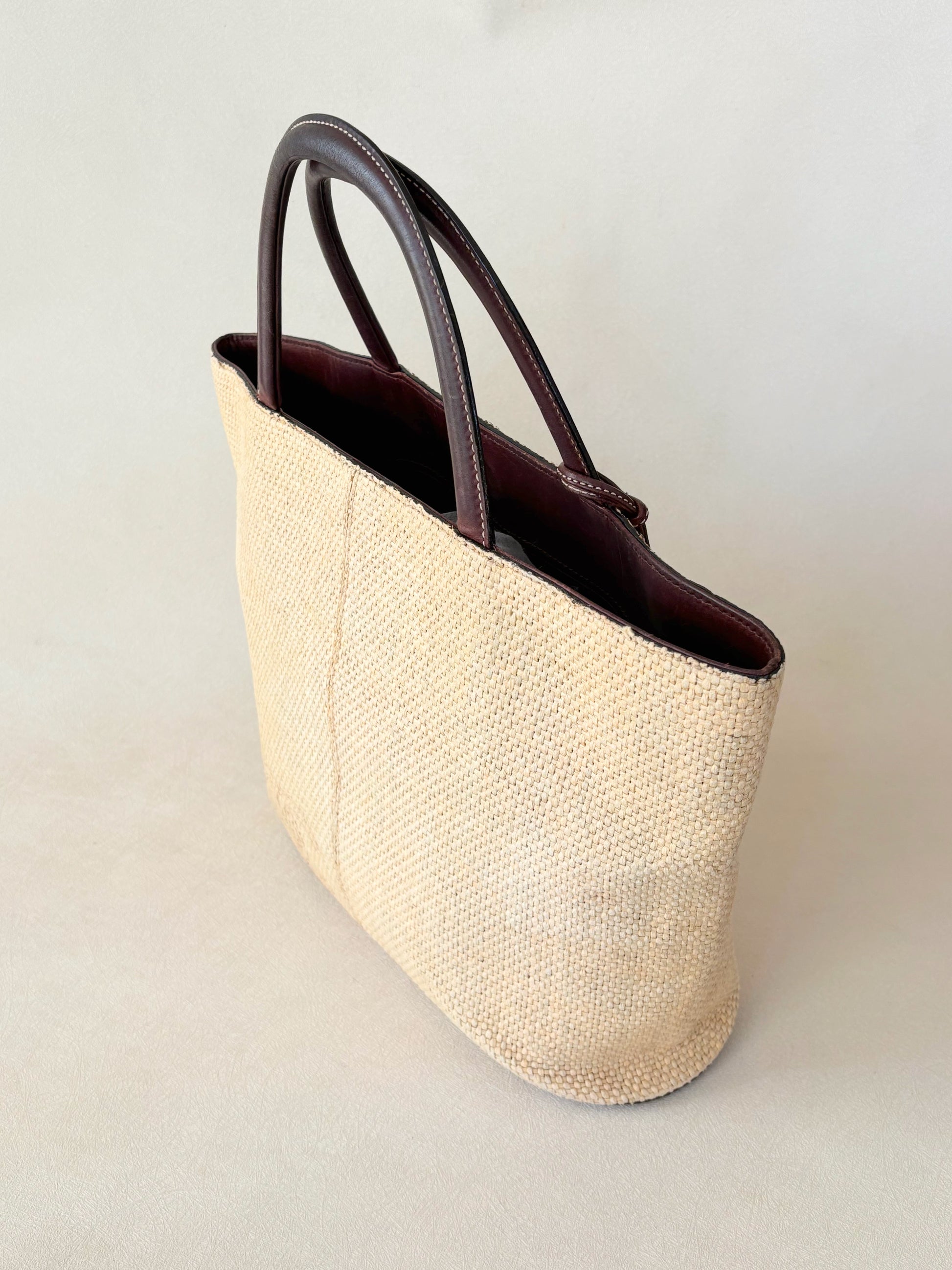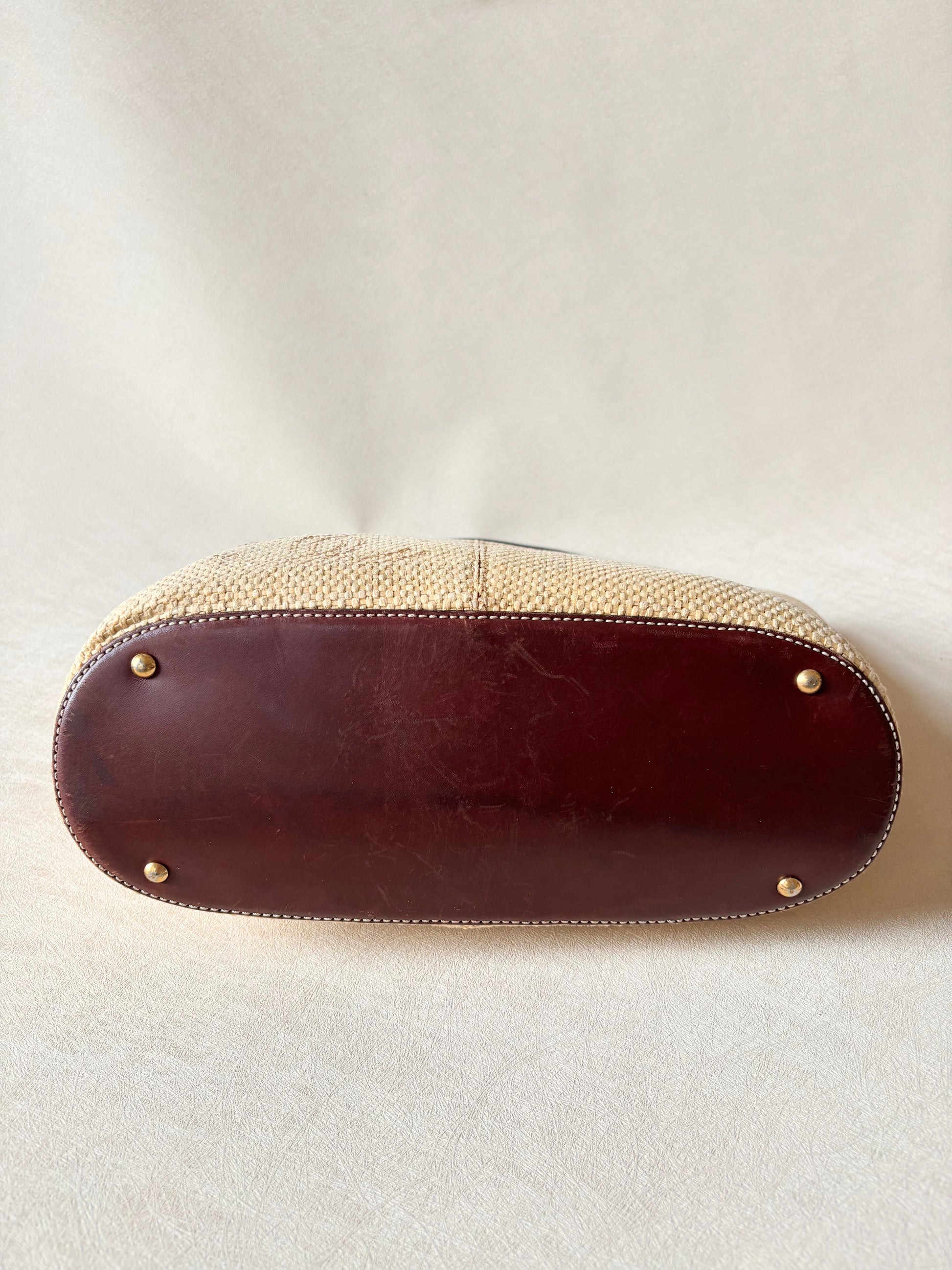 * Anses en cuir marron, avec une bijouterie de sac en cuir marron surpiqué de coton écru