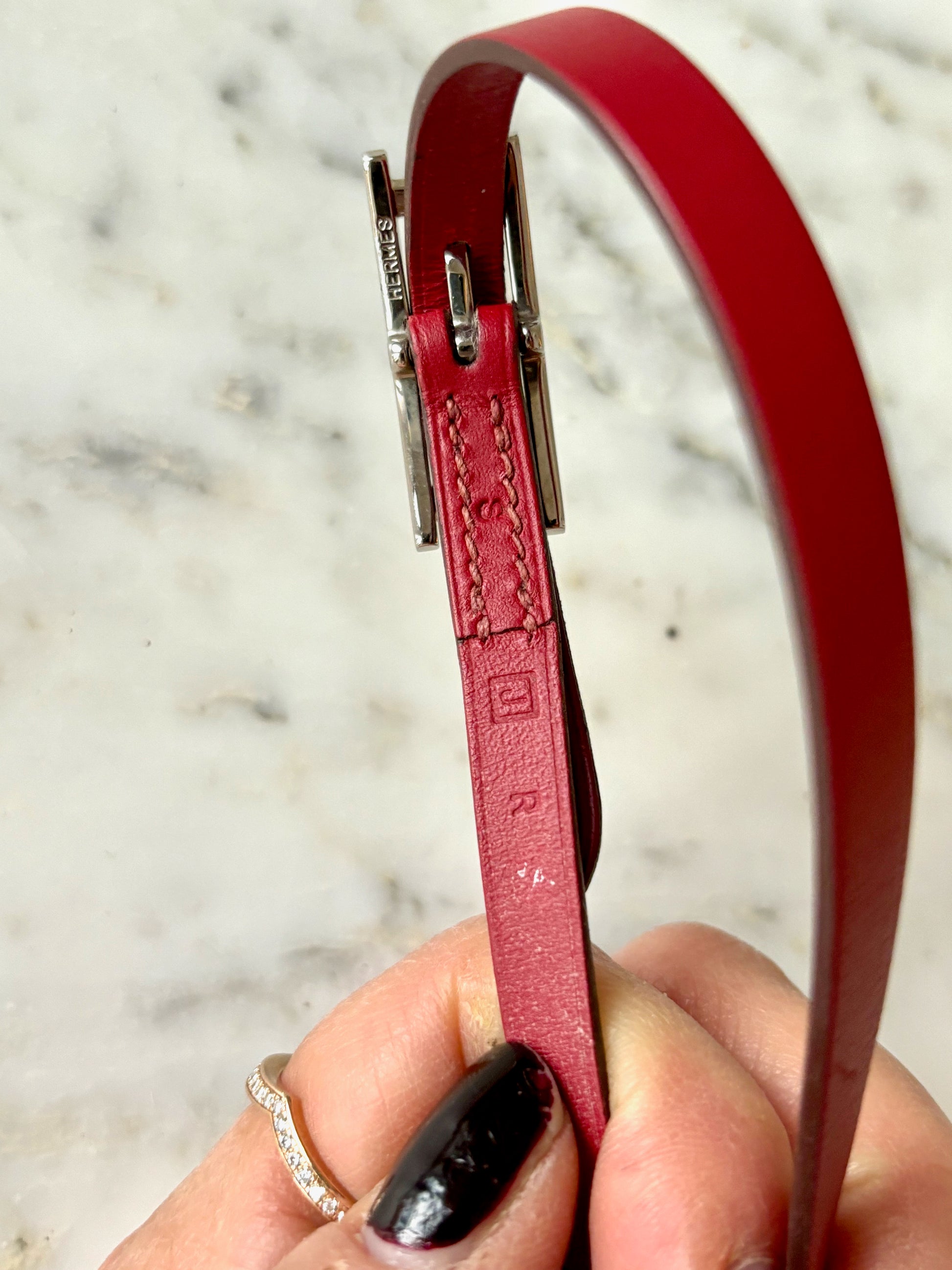 * Agrémenté d’une boucle en métal doré stylisant le “H” de la maison Hermès.