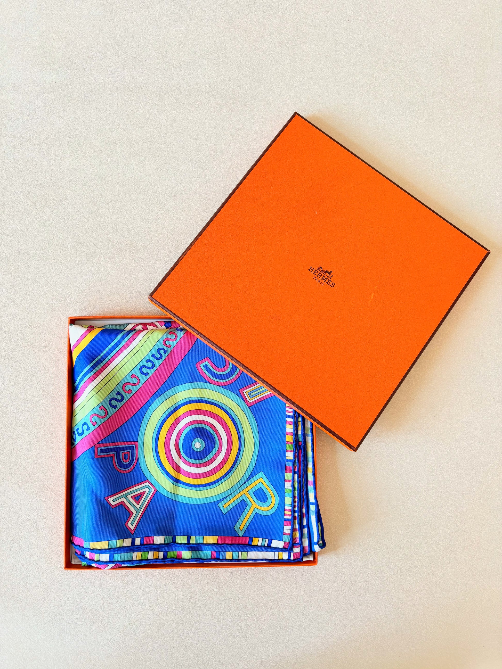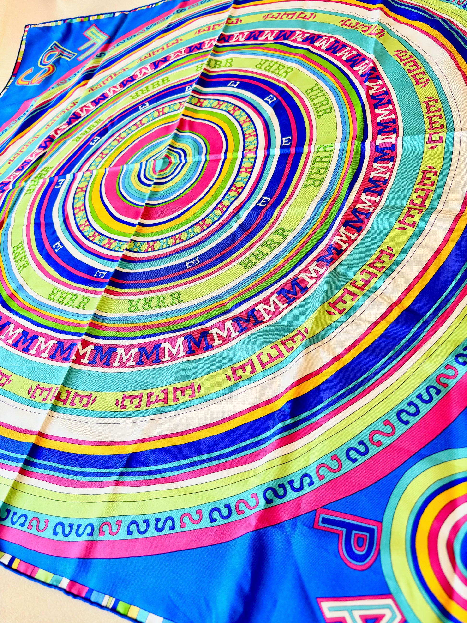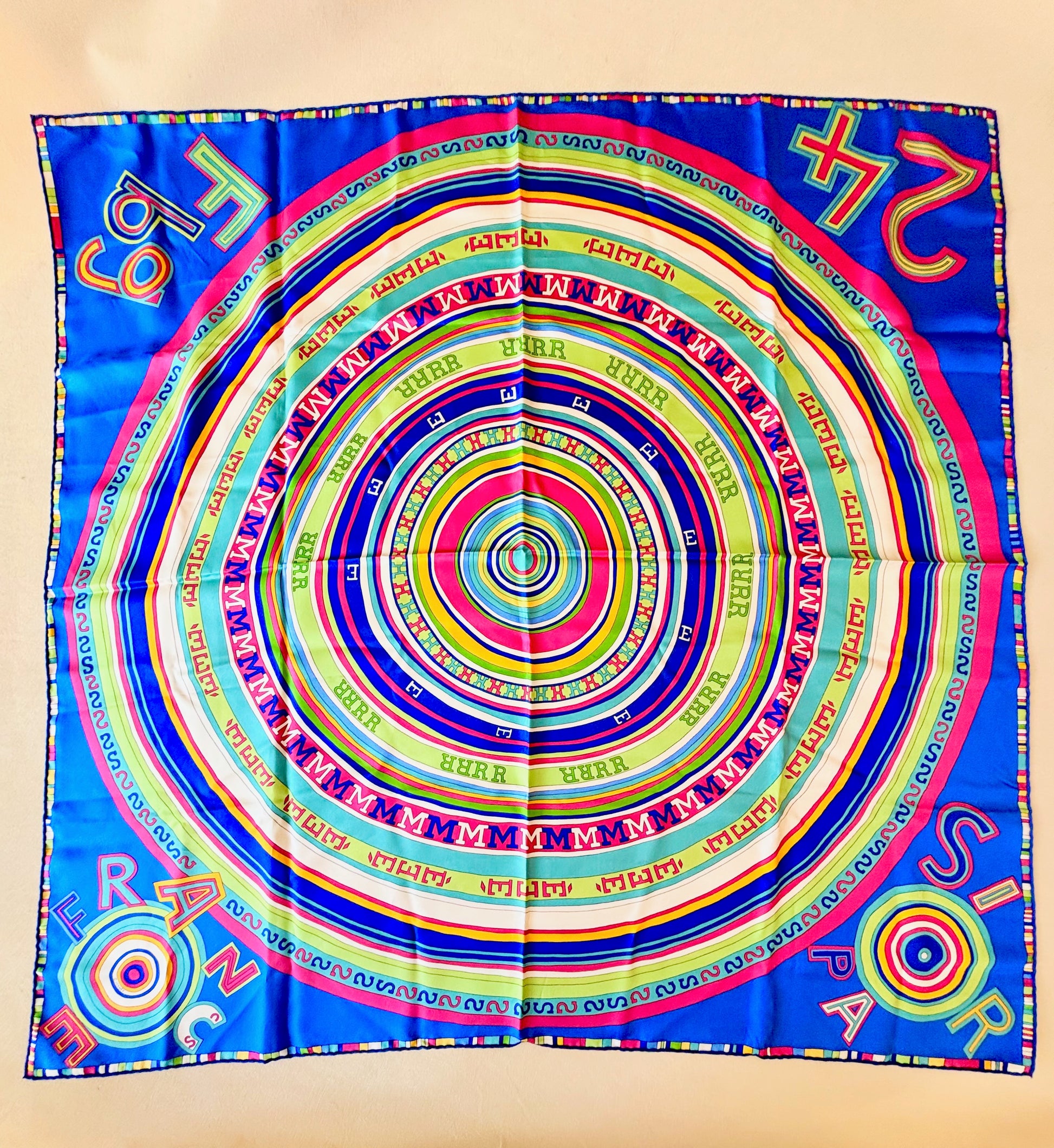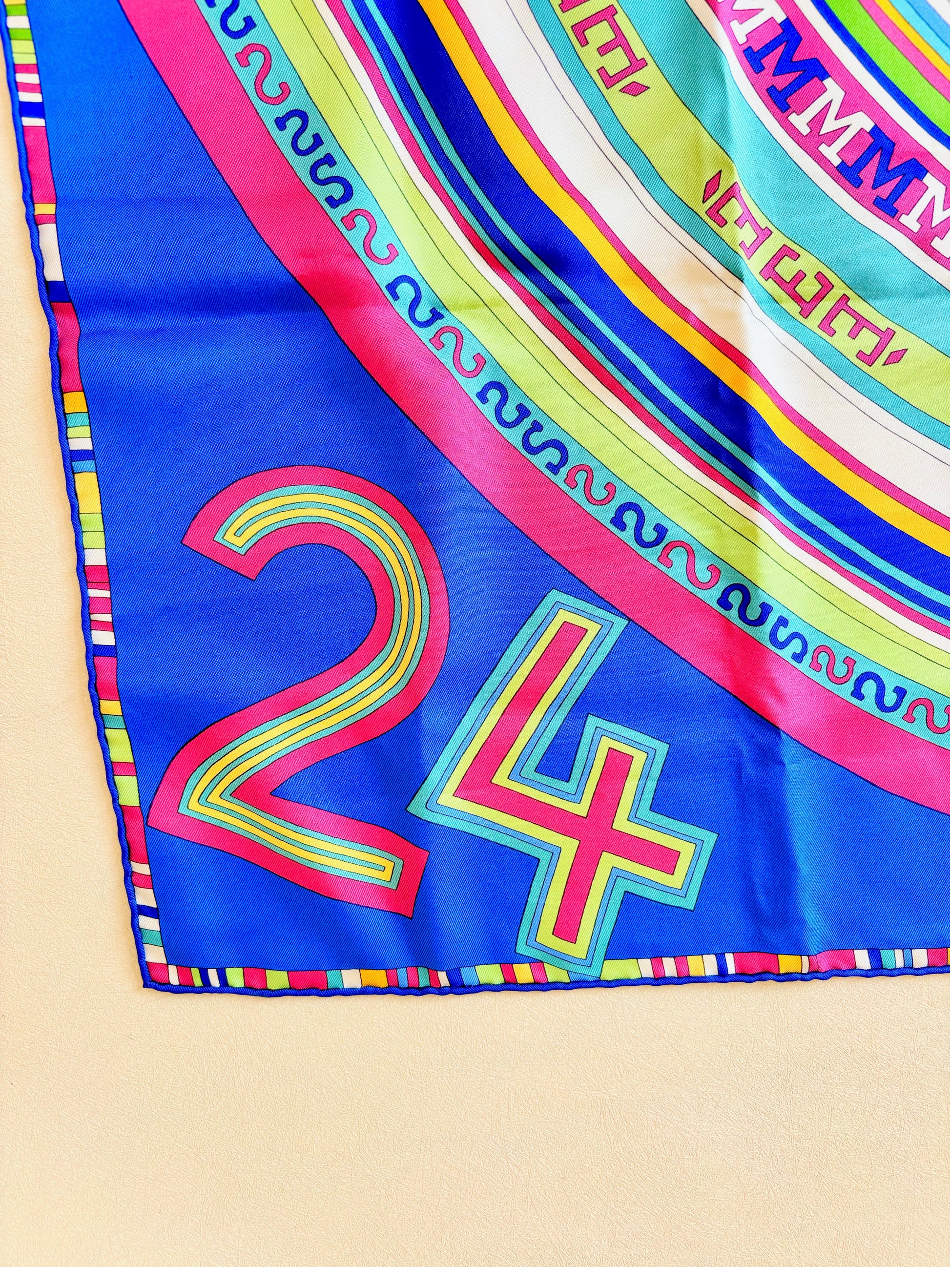 * En soie bleue à motifs circulaires multicolores célébrant l'emblématique adresse parisienne de la Maison HERMÈS au 24 rue du Faubourg Saint-Honoré