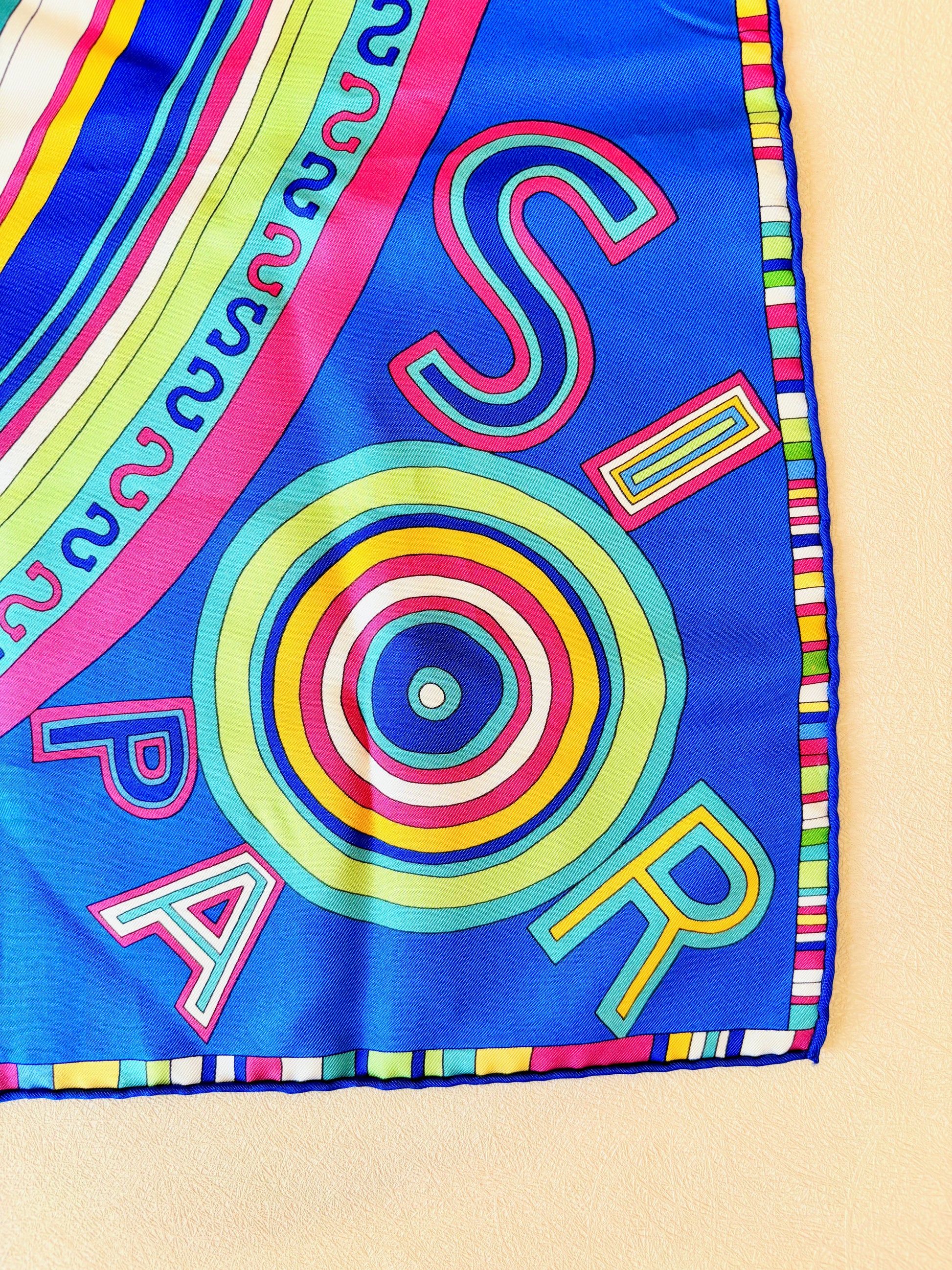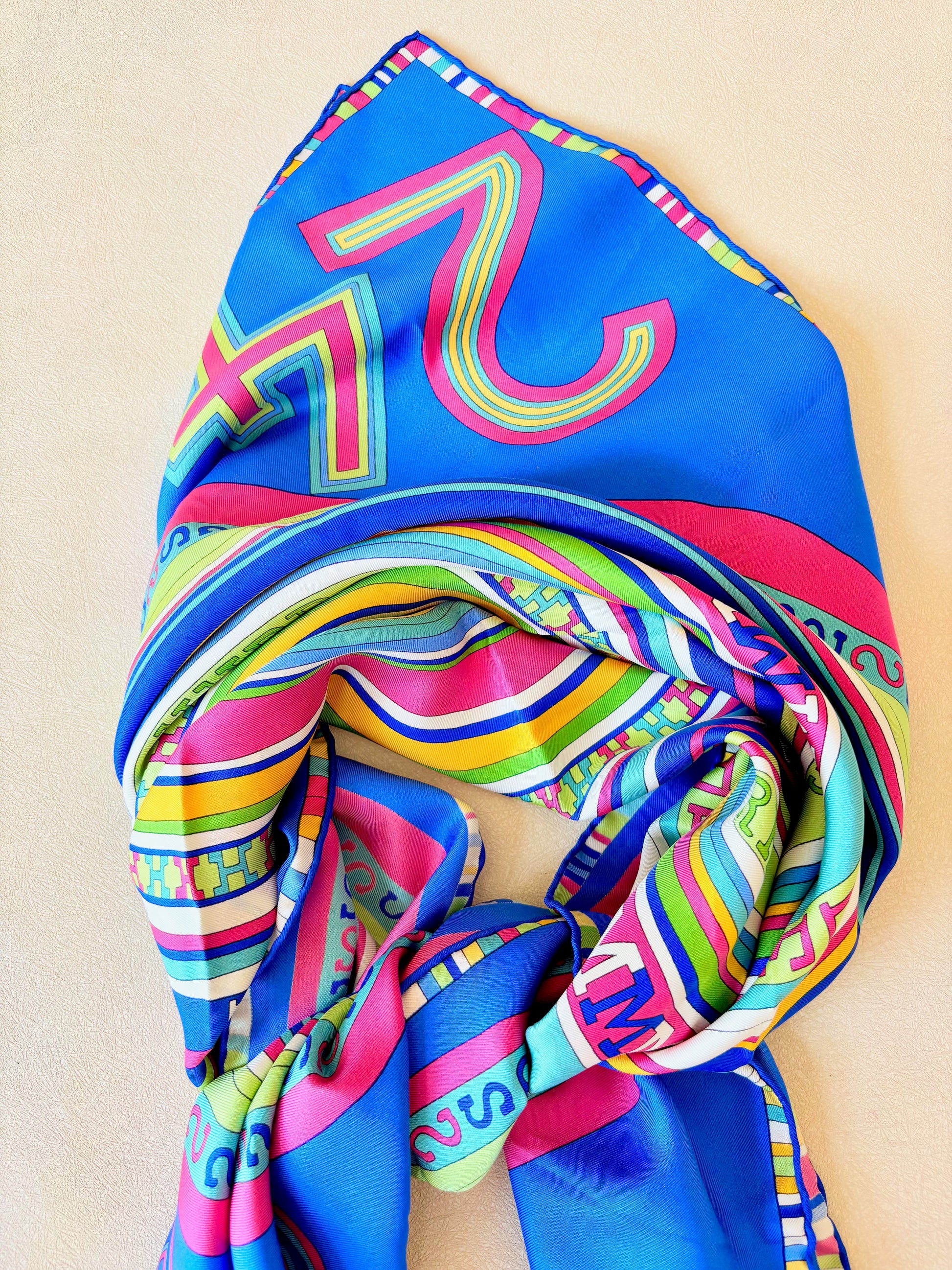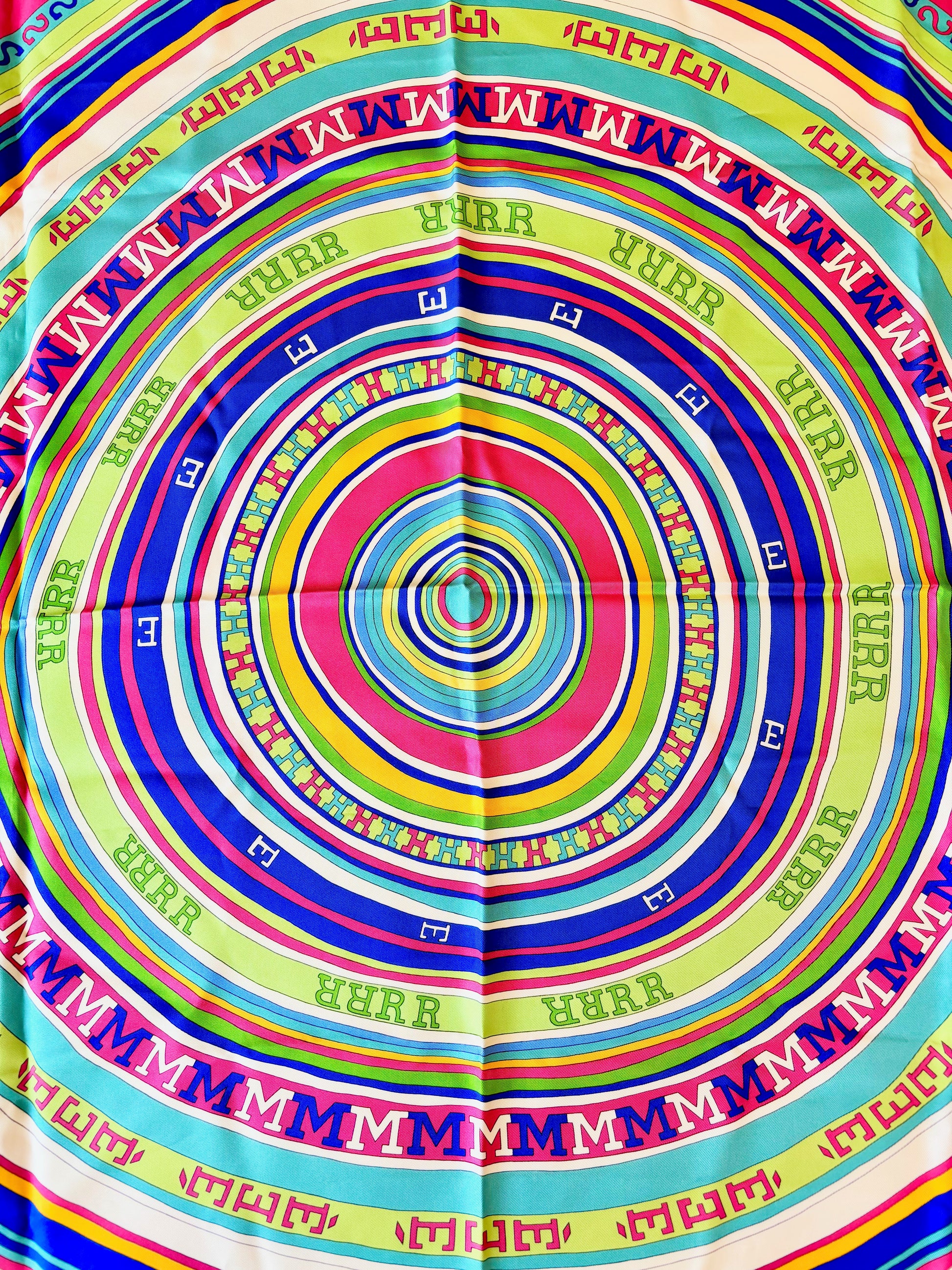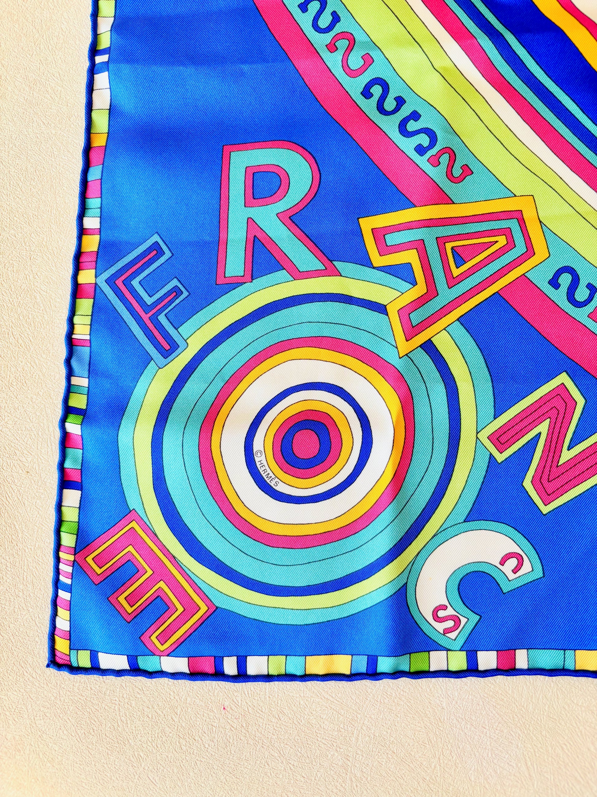 * En soie bleue à motifs circulaires multicolores célébrant l'emblématique adresse parisienne de la Maison HERMÈS au 24 rue du Faubourg Saint-Honoré