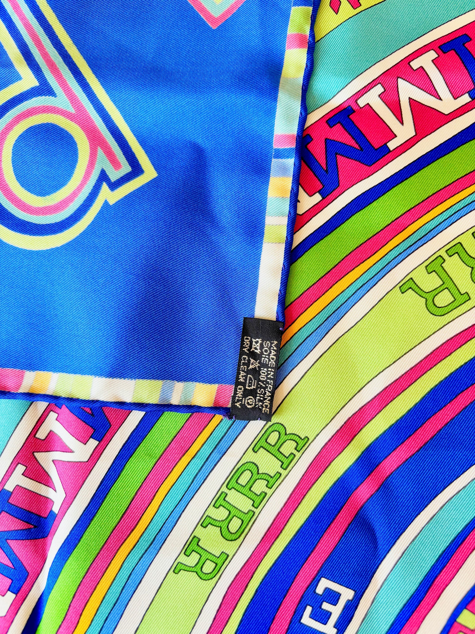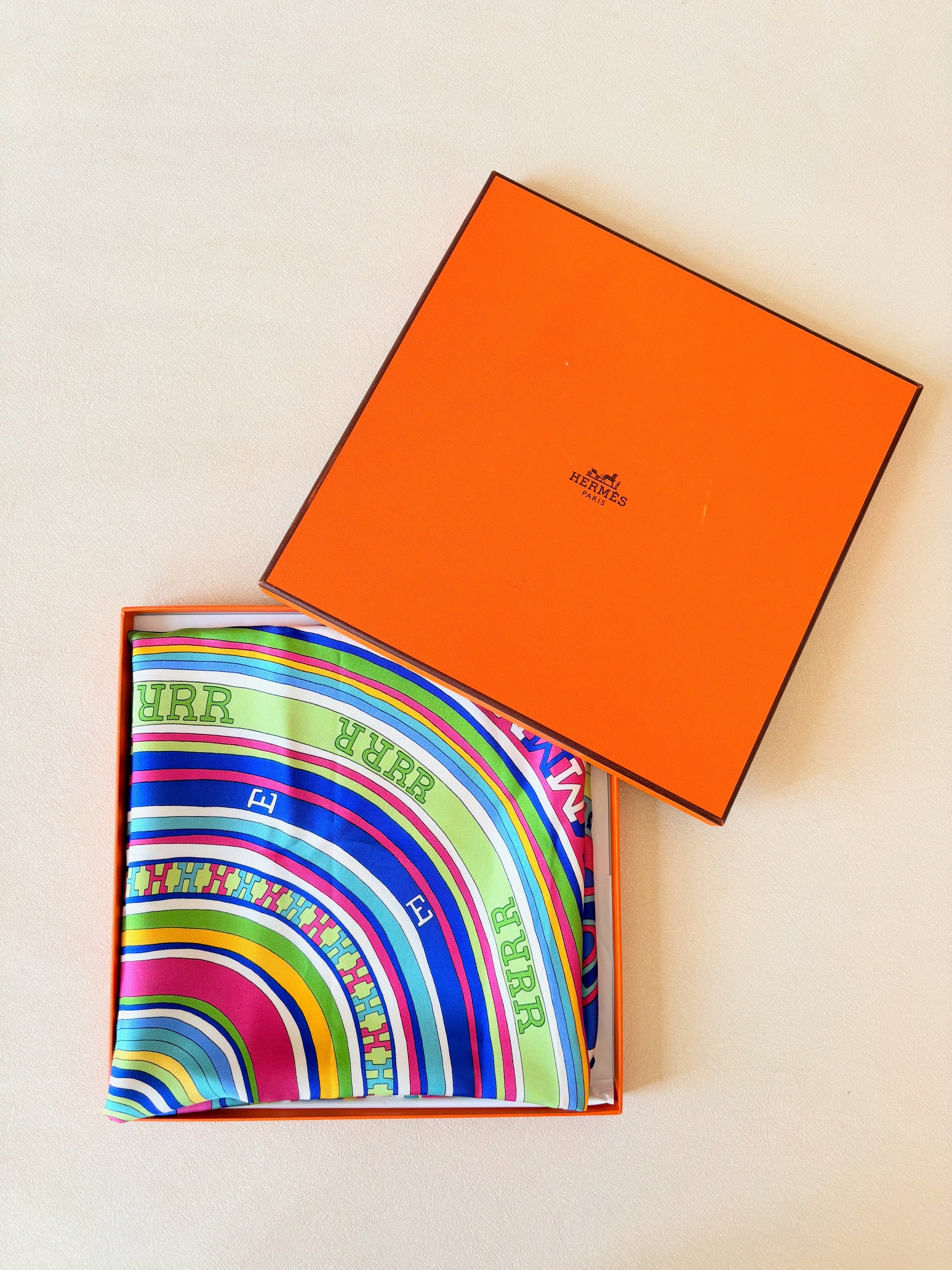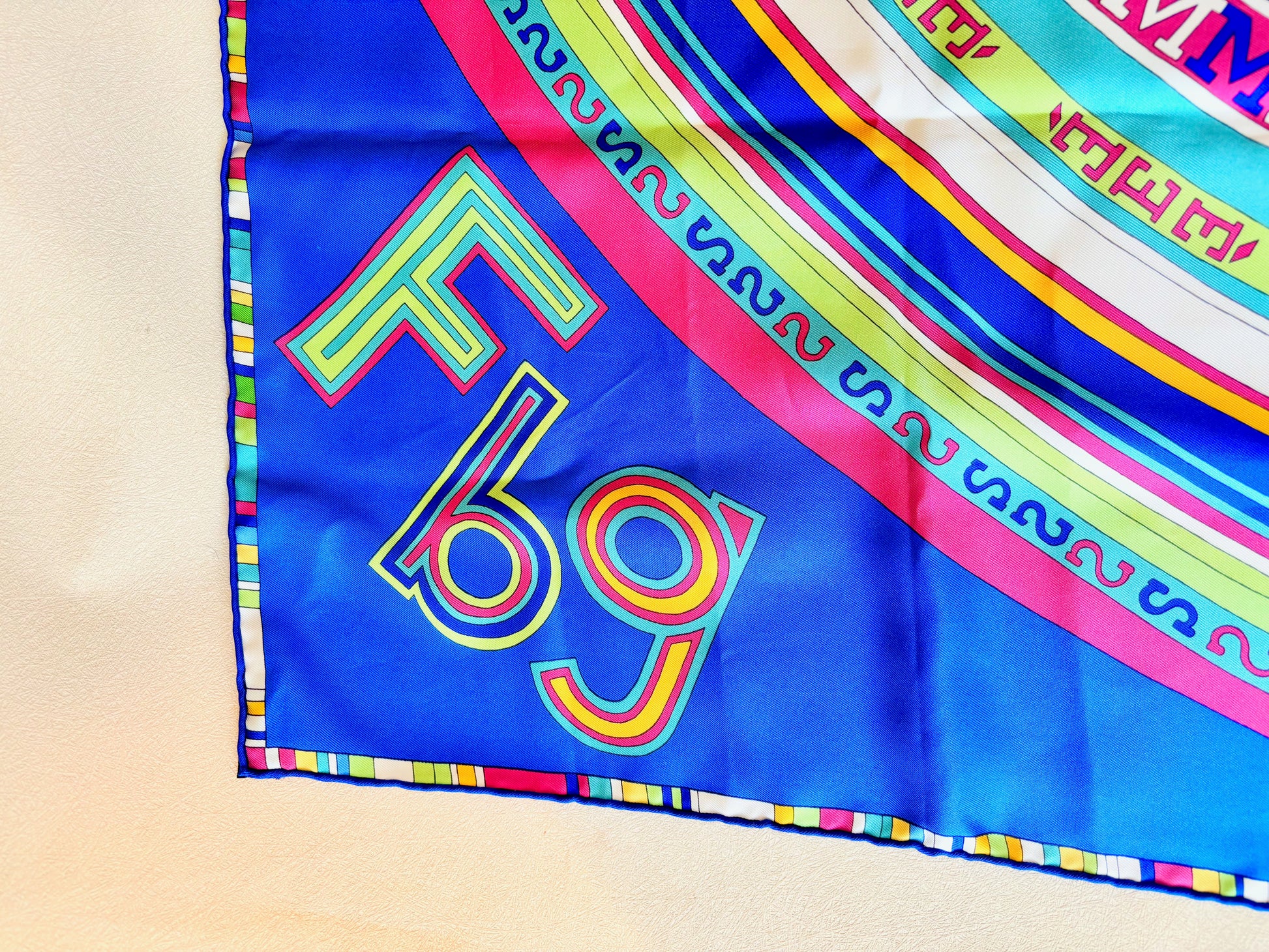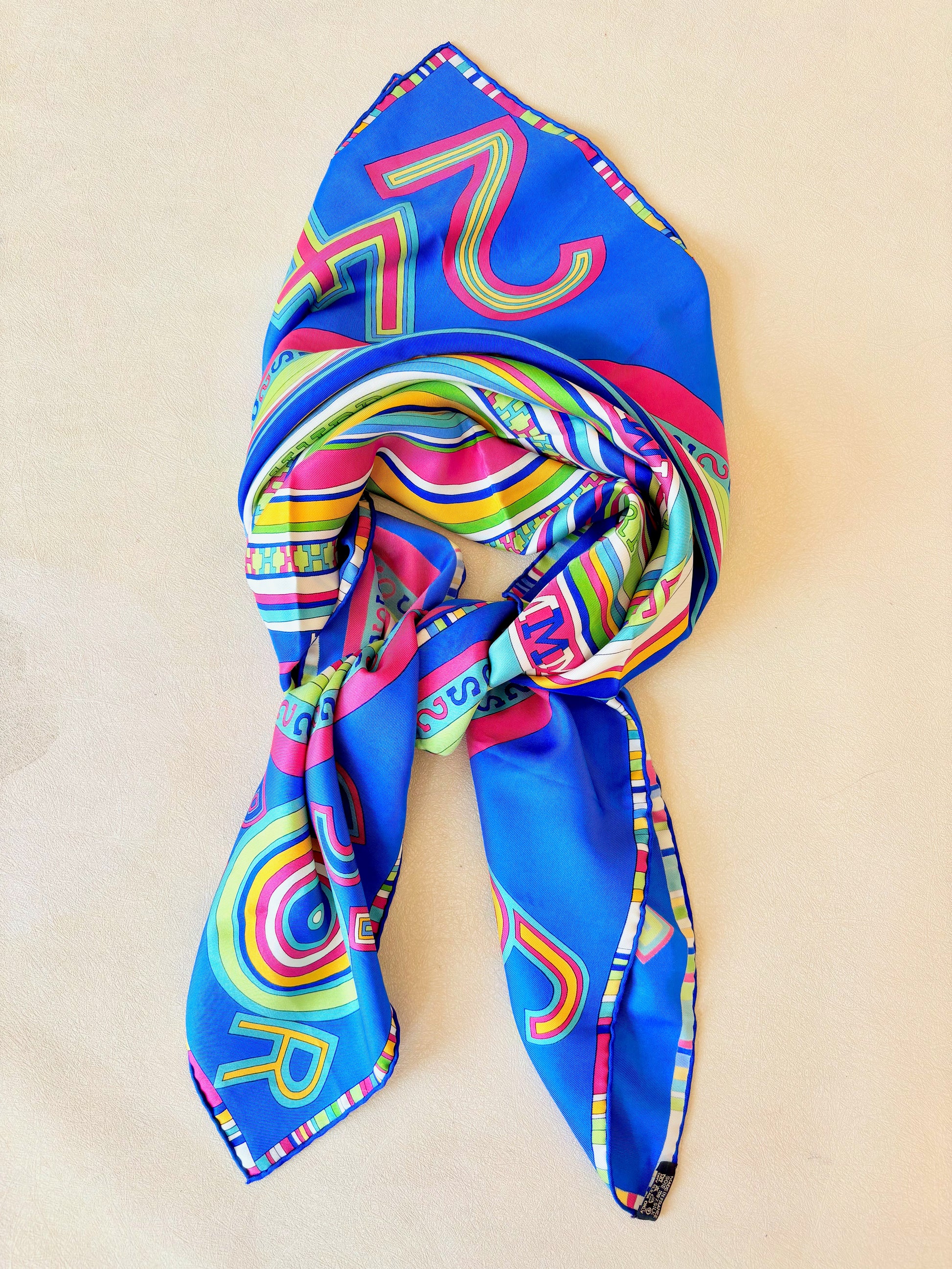 * En soie bleue à motifs circulaires multicolores célébrant l'emblématique adresse parisienne de la Maison HERMÈS au 24 rue du Faubourg Saint-Honoré