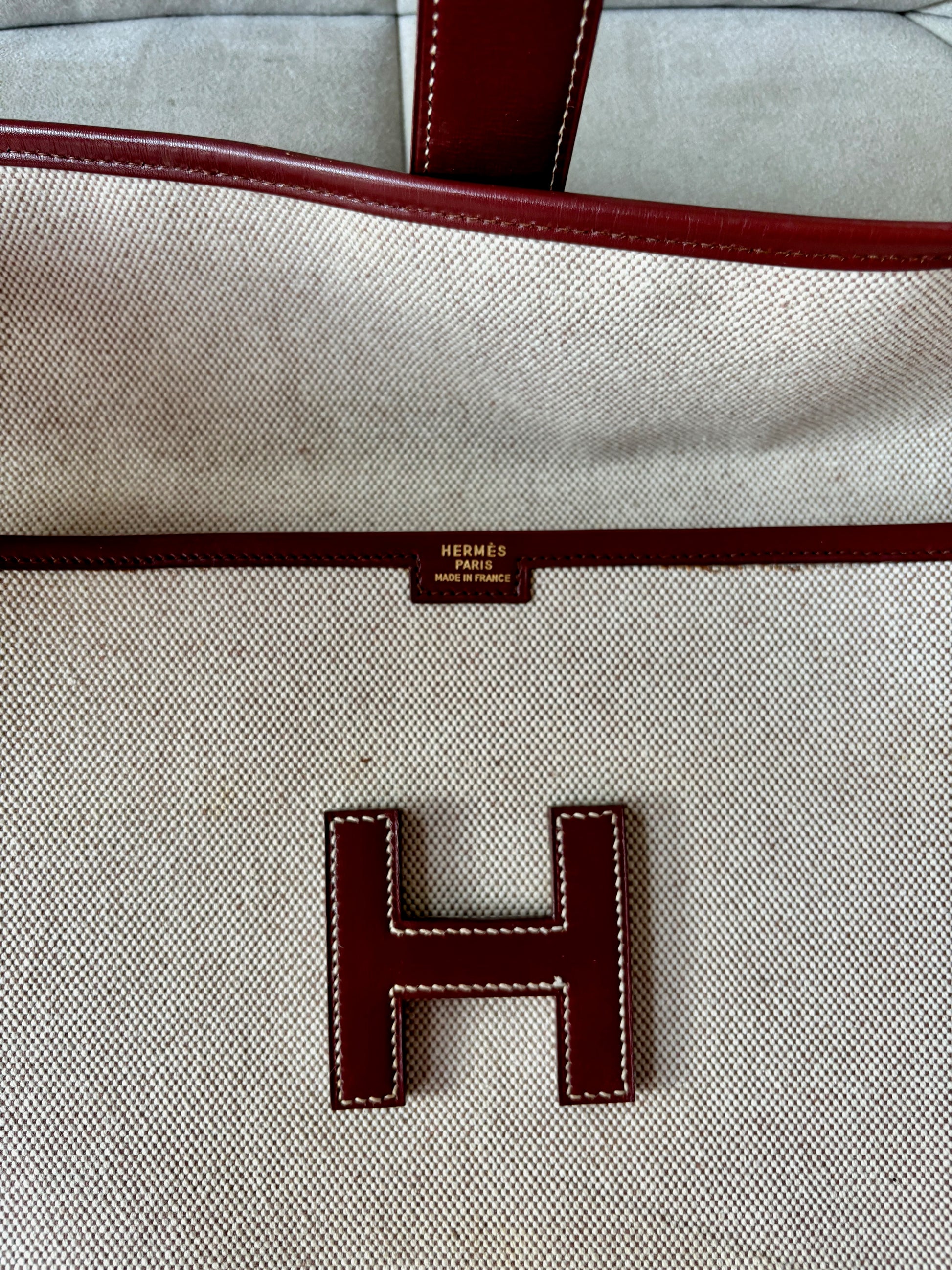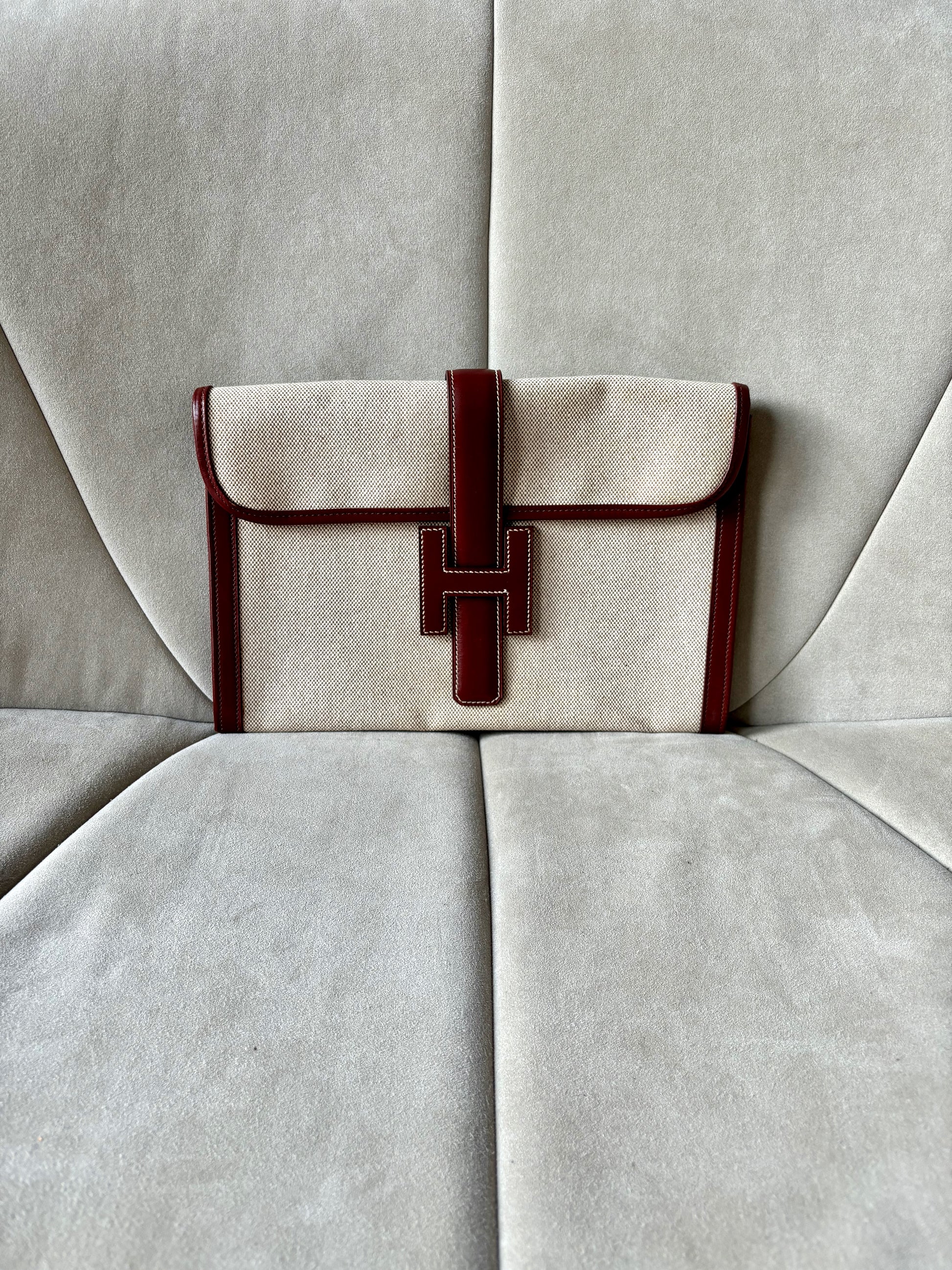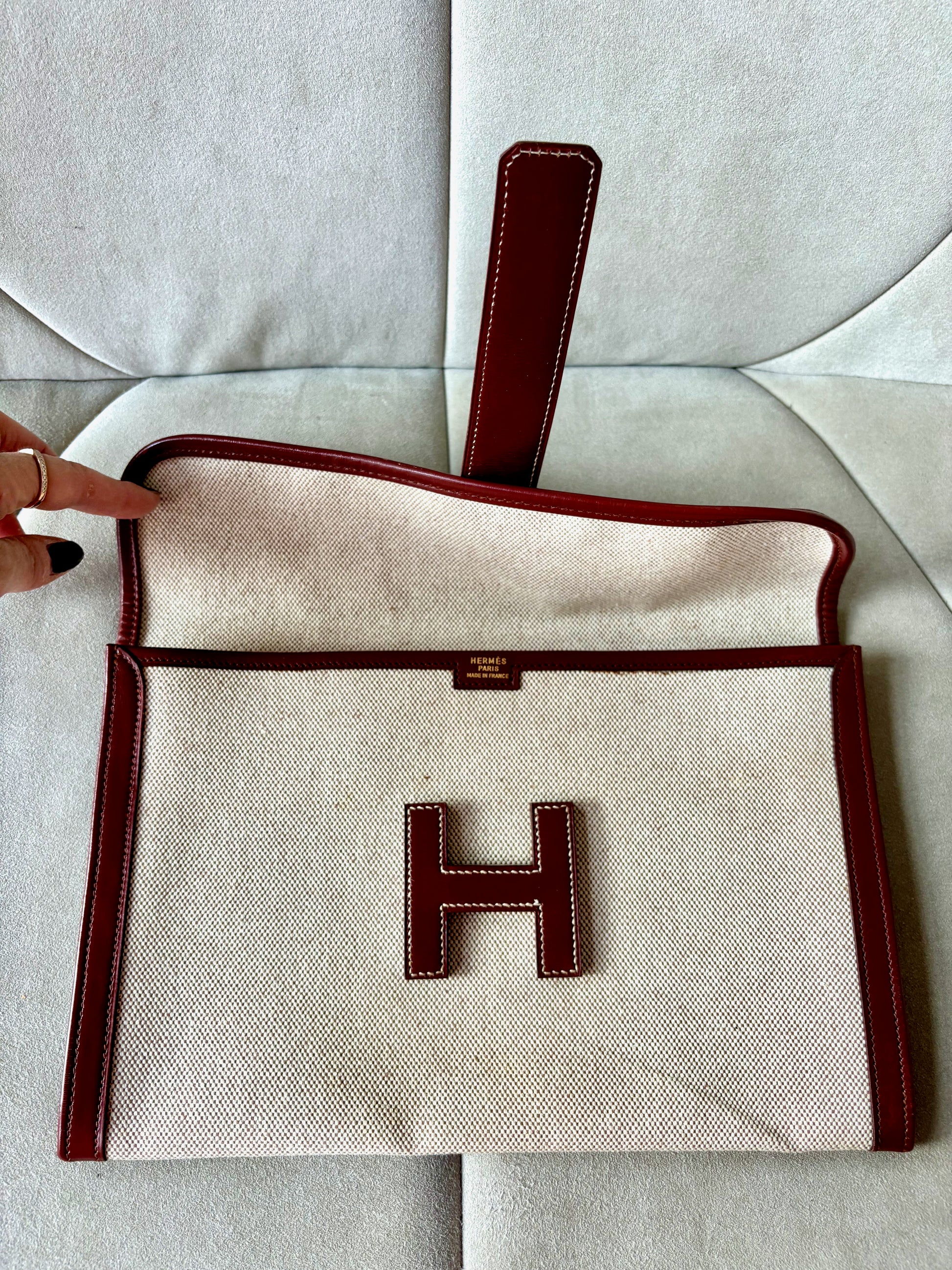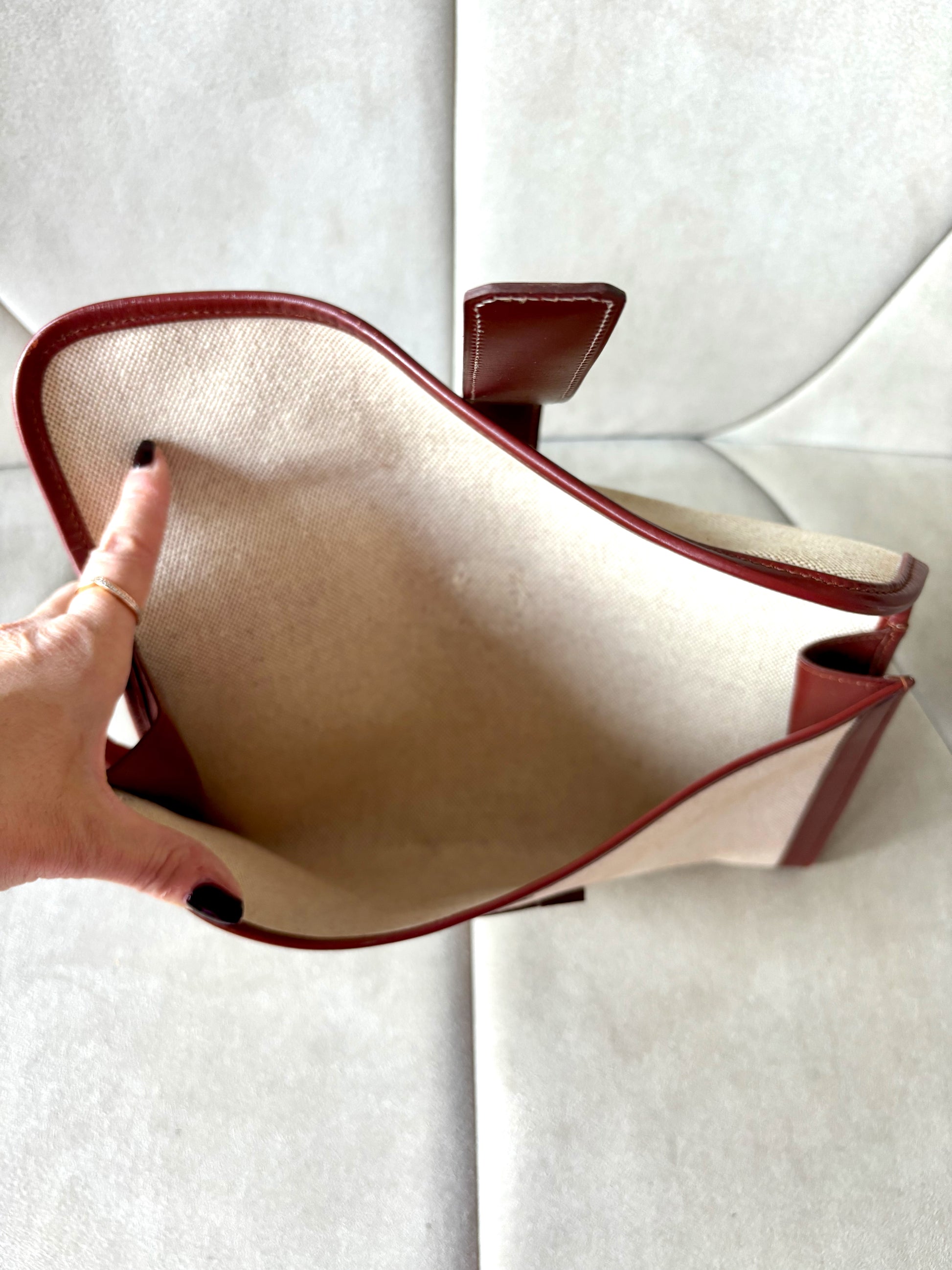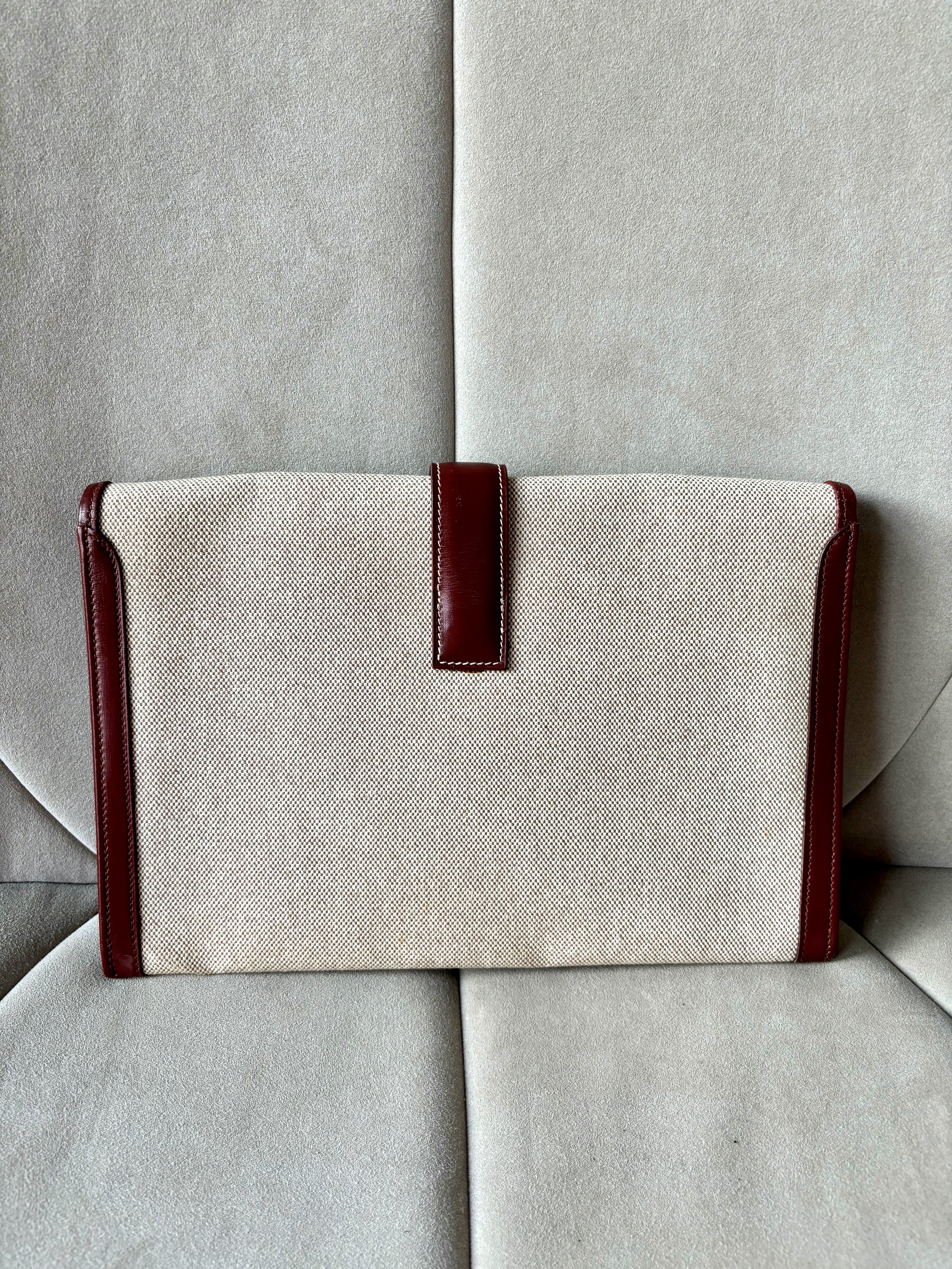* Pochette HERMÈS modèle "Jige" en toile beige et cuir bordeaux, surpiqûres.