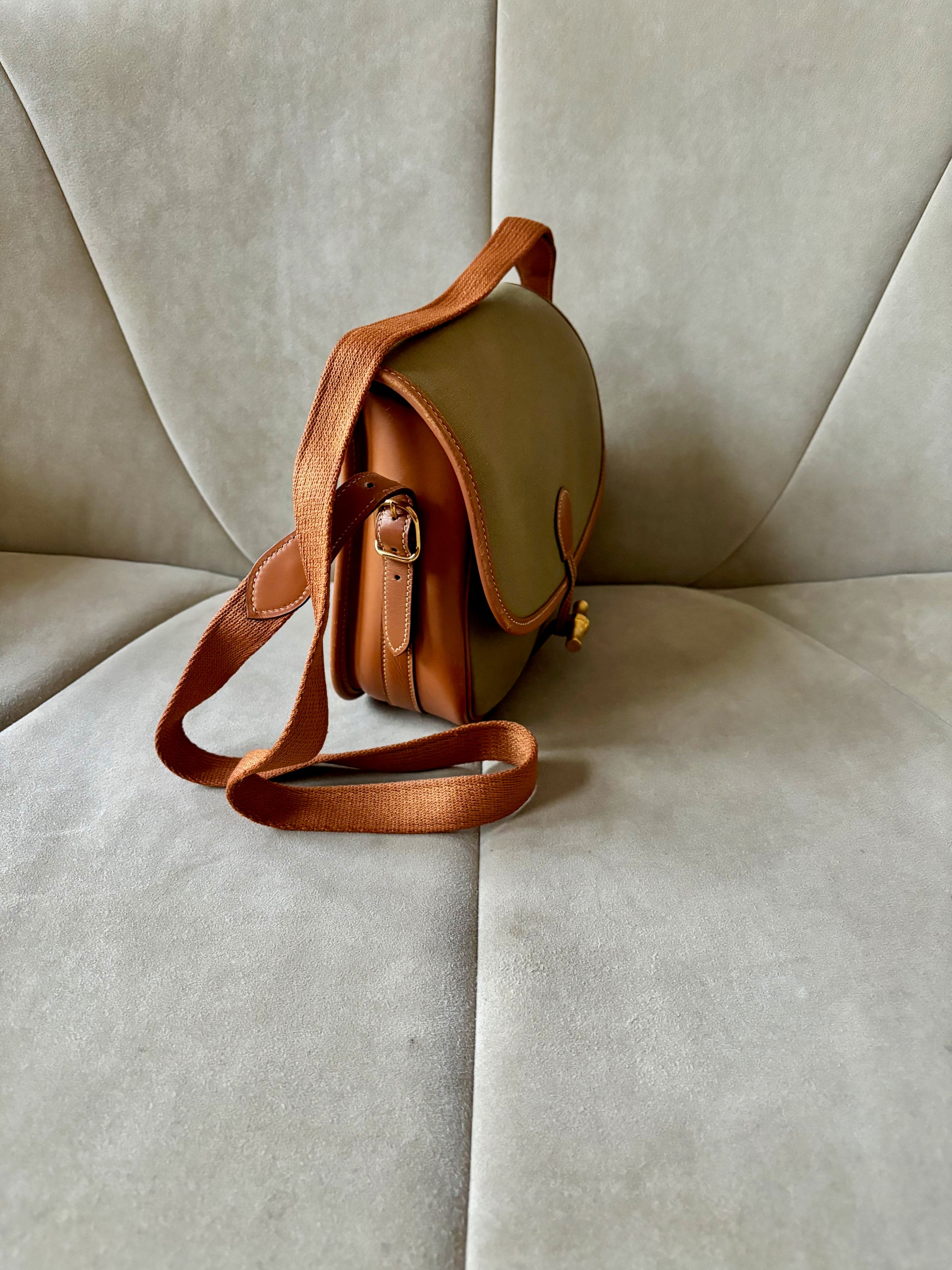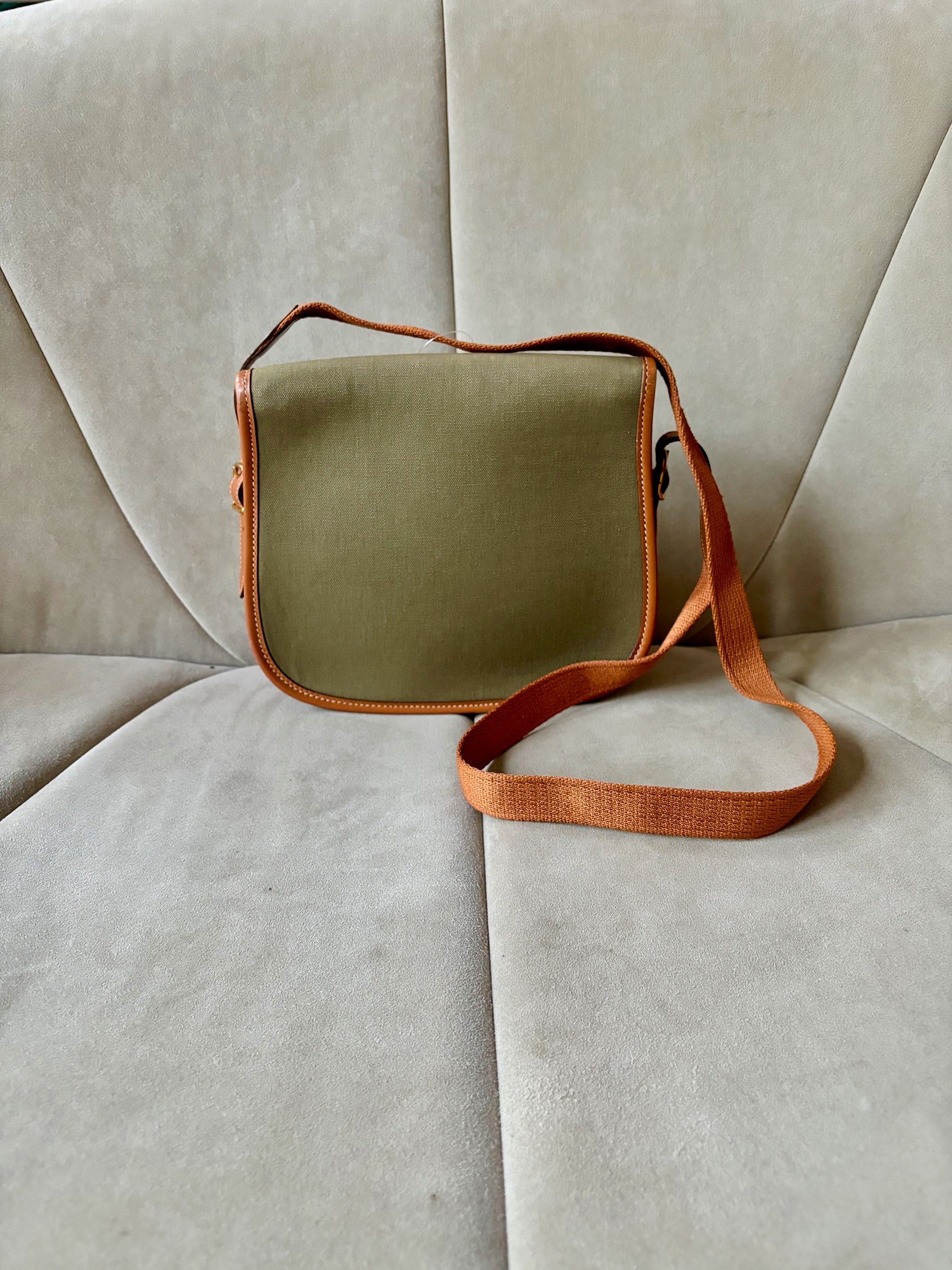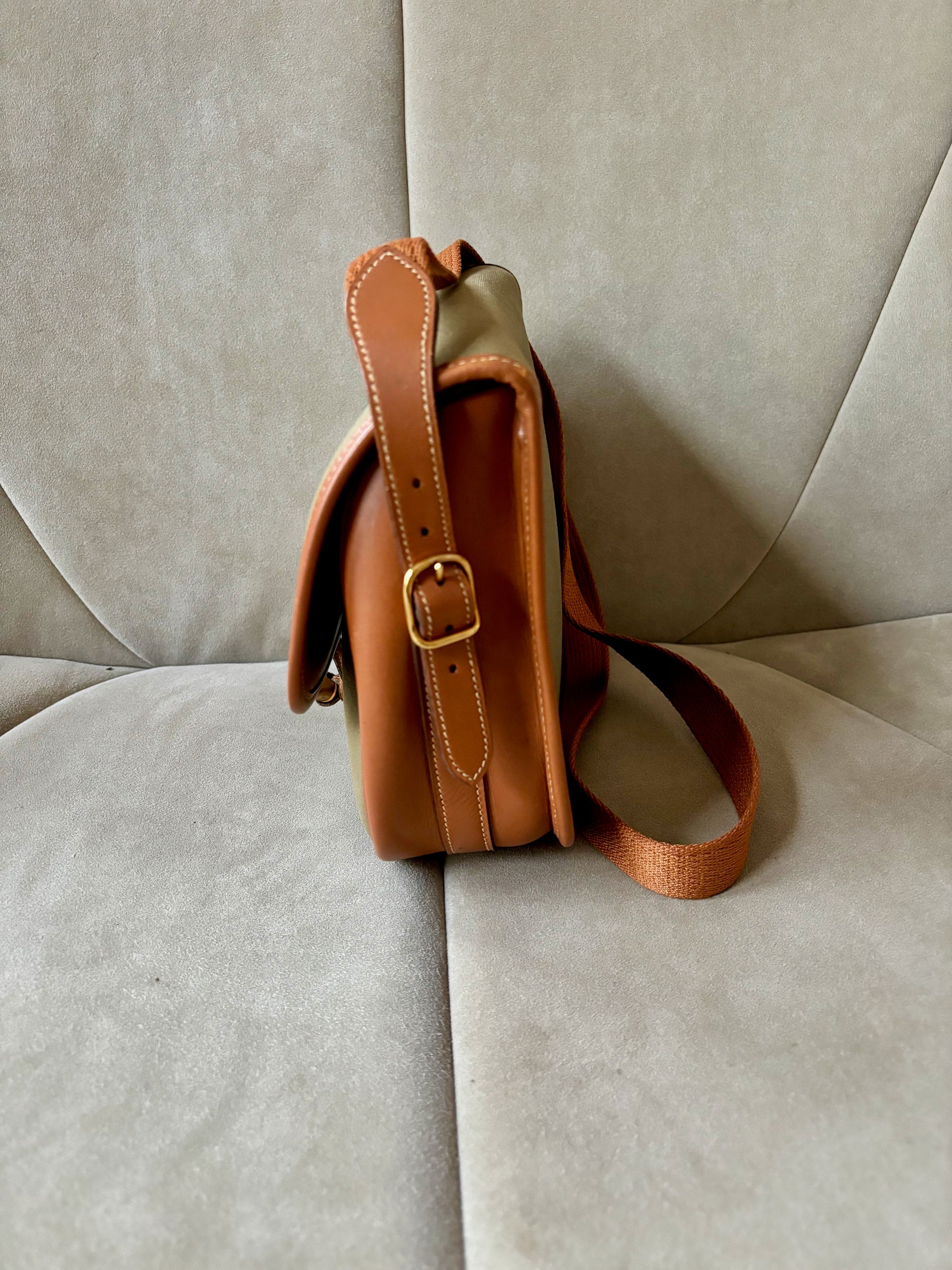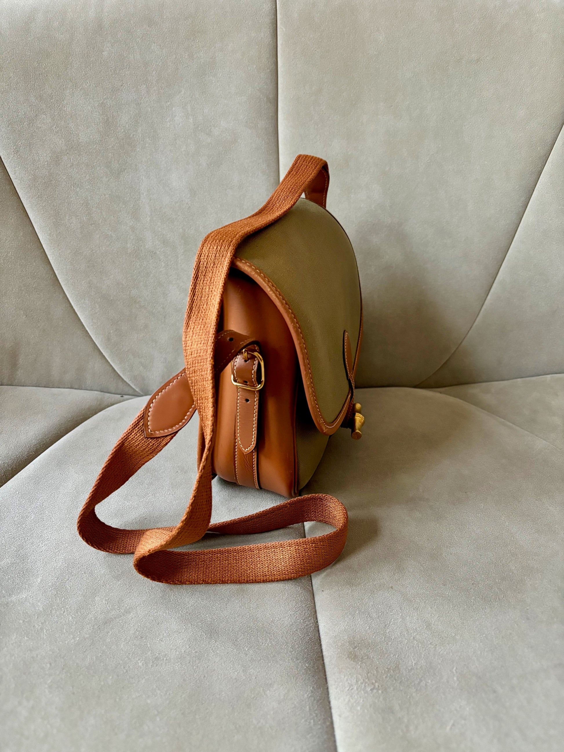 * Toile kaki et cuir camel à surpiqure crème, bandoulière en tissu et cuir camel