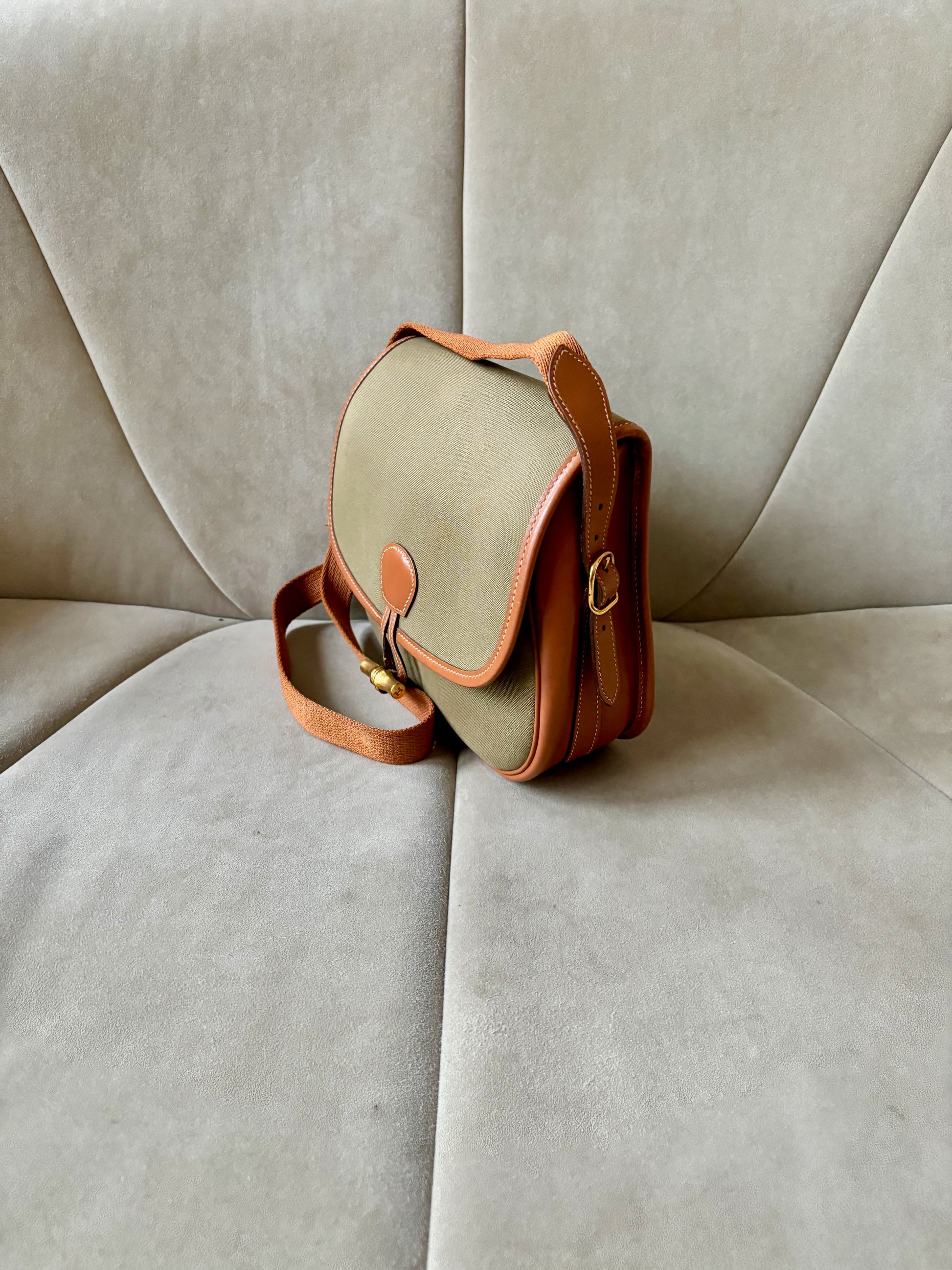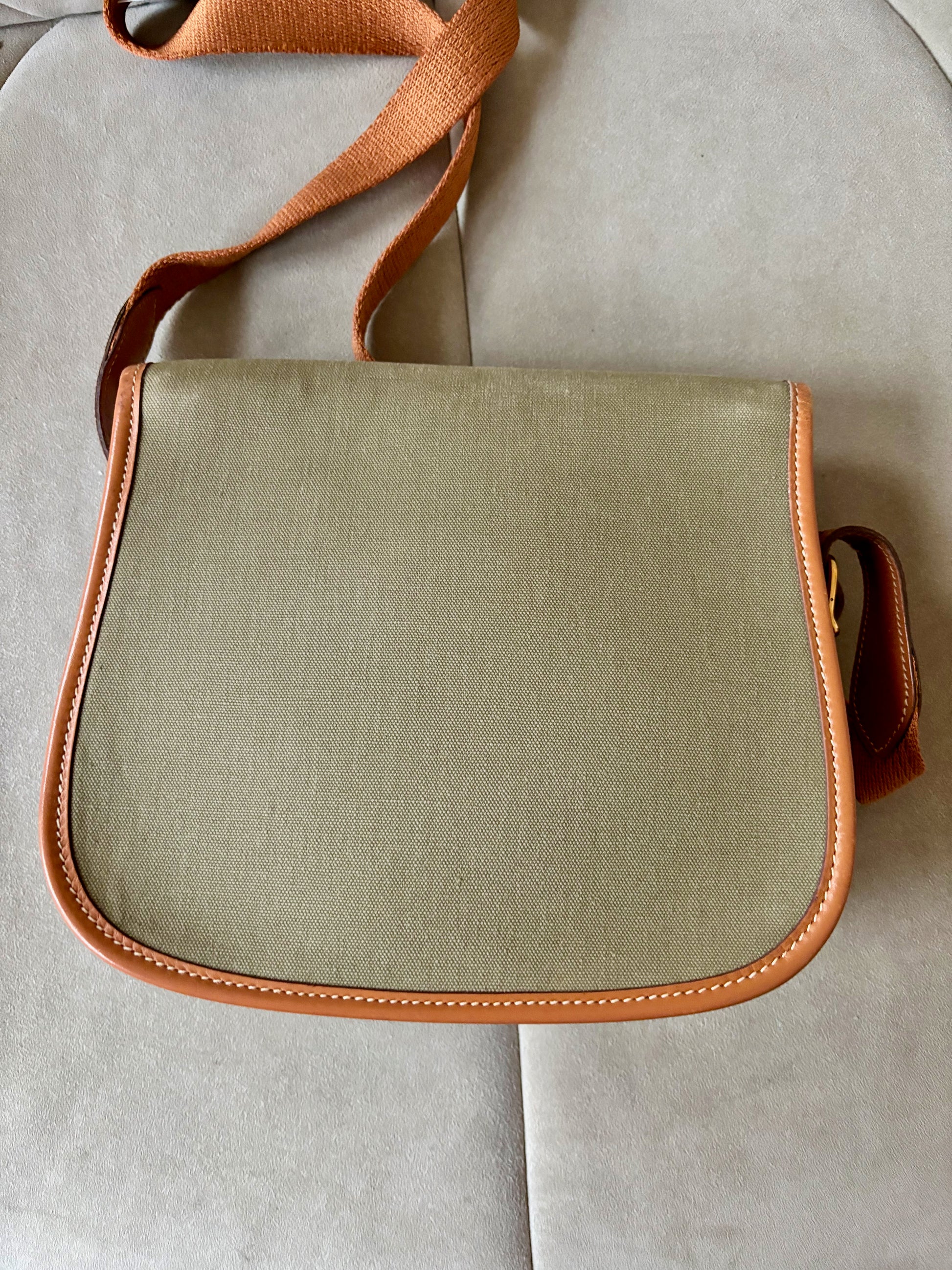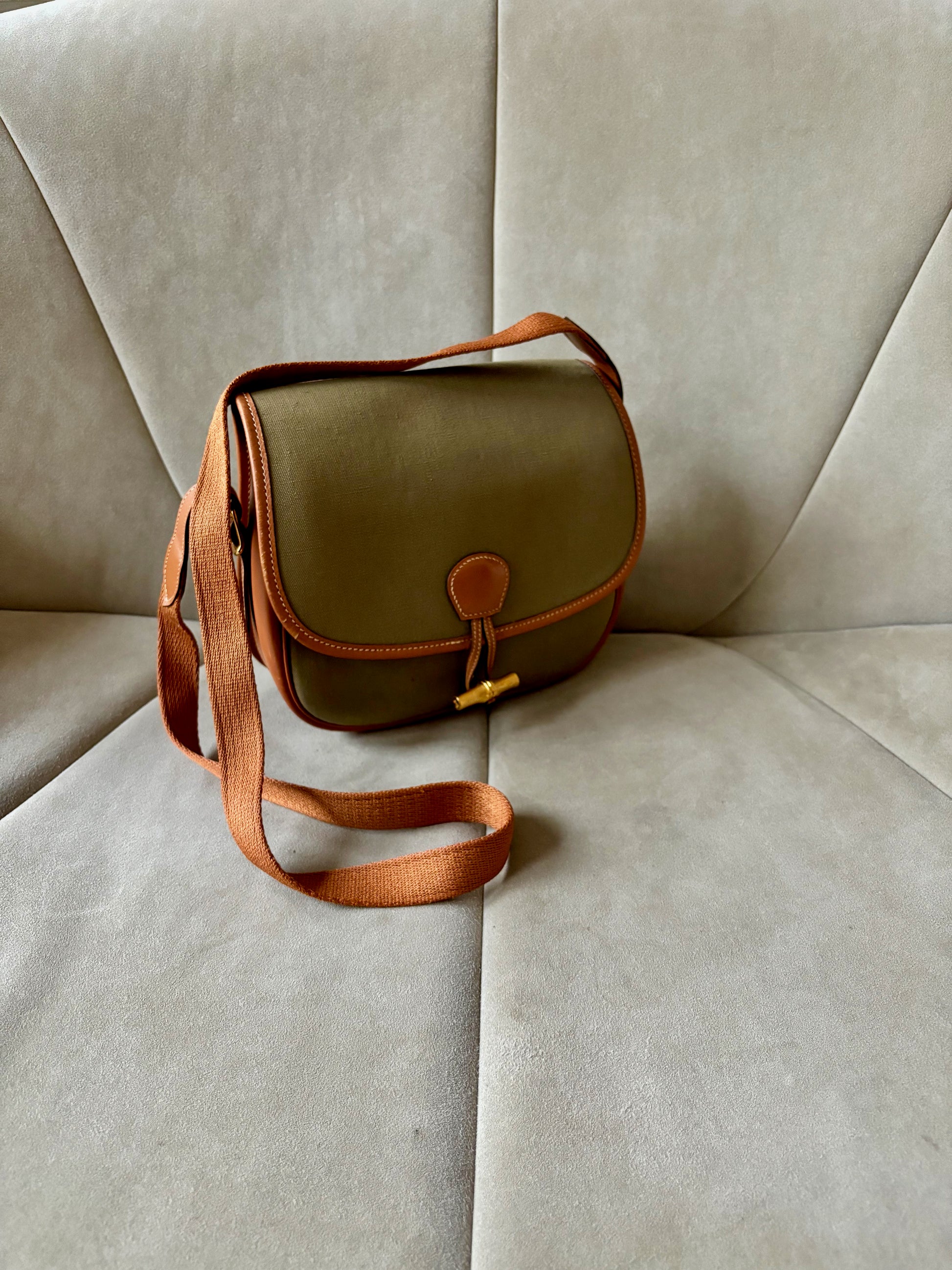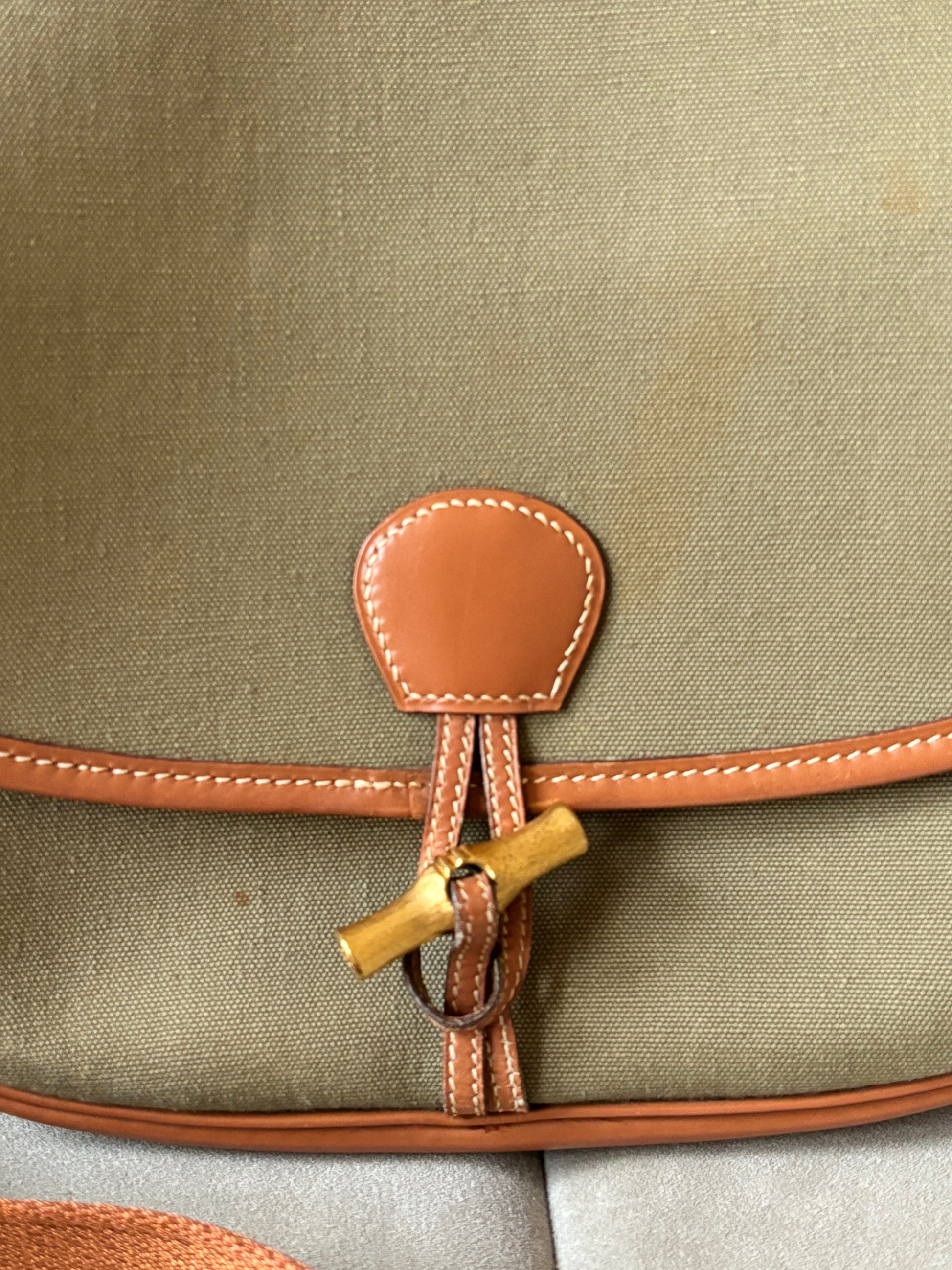 * Toile kaki et cuir camel à surpiqure crème, bandoulière en tissu et cuir camel