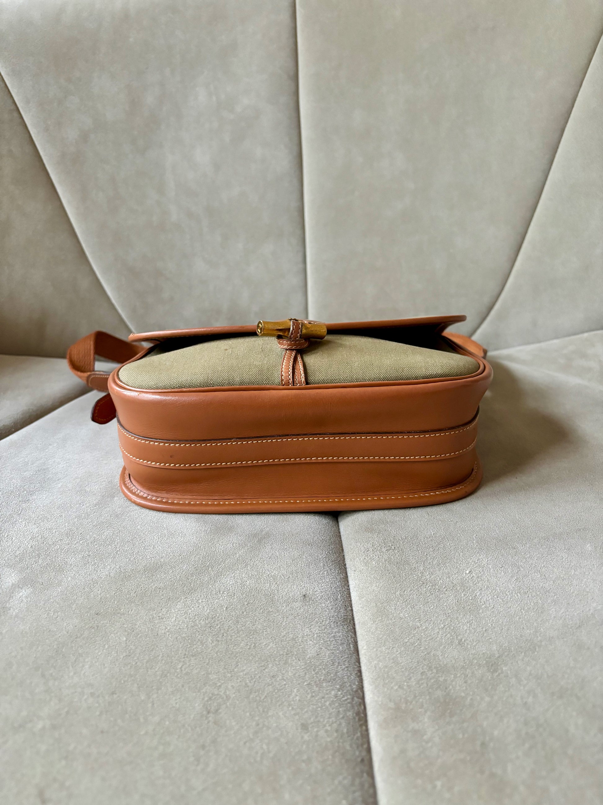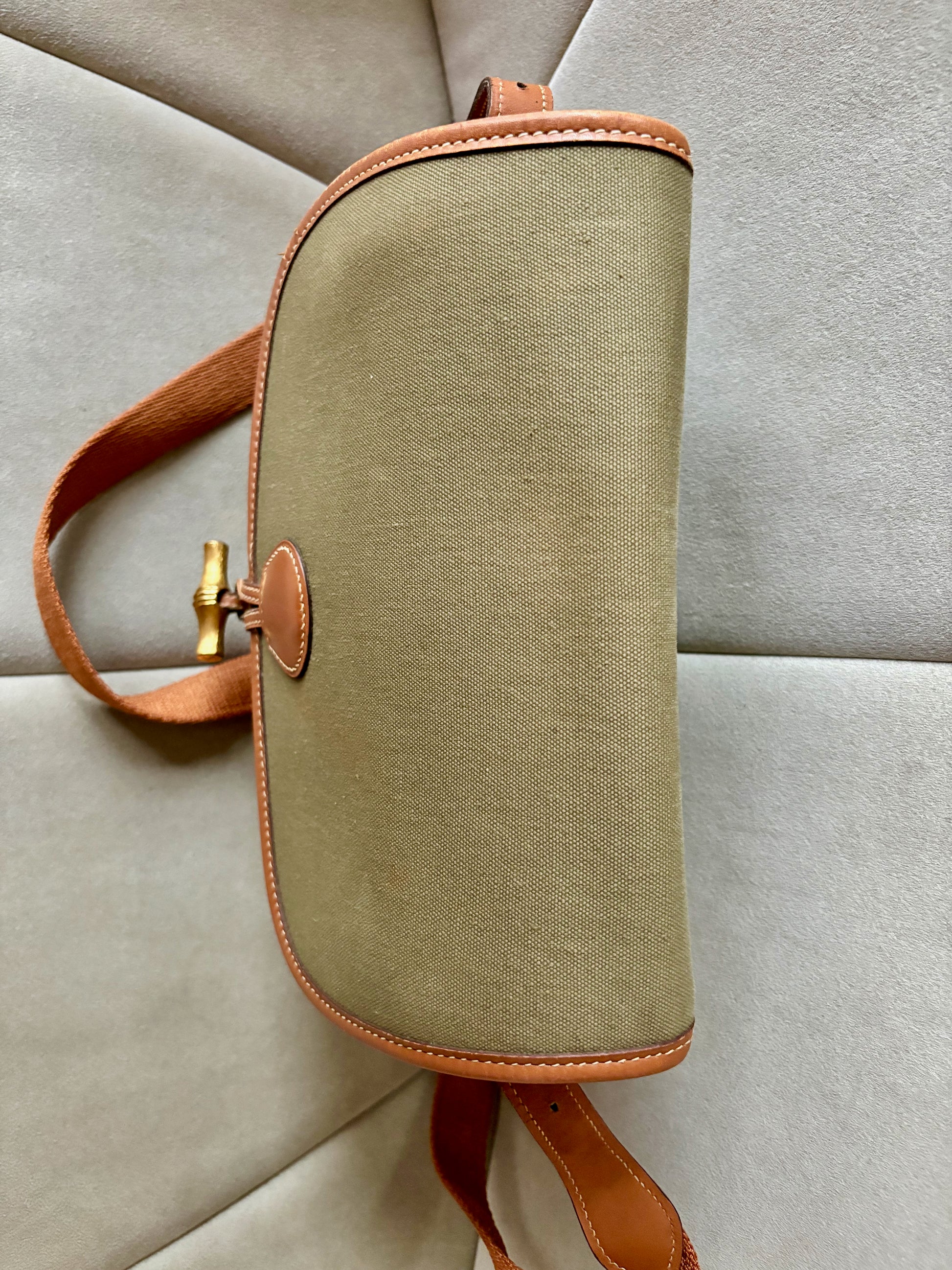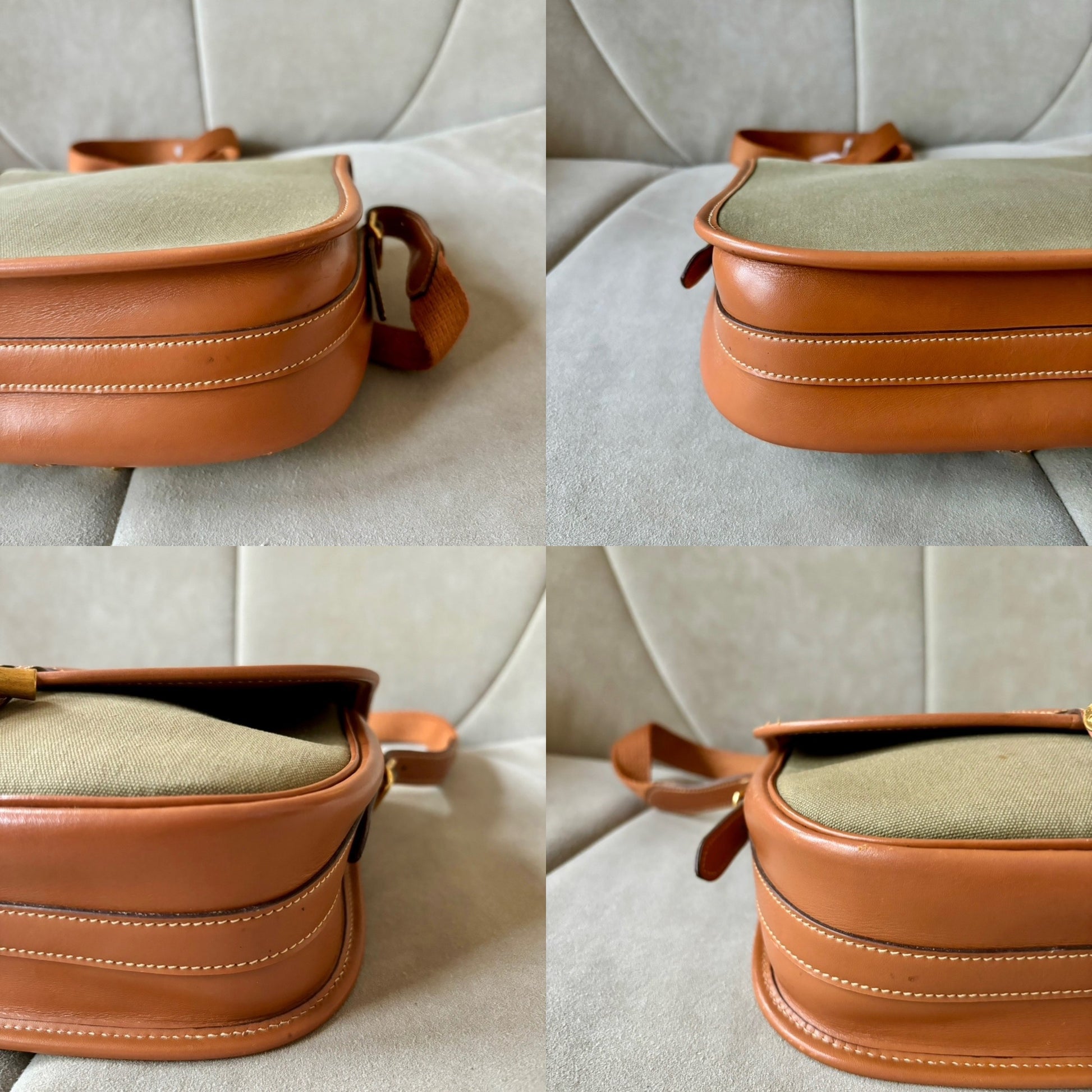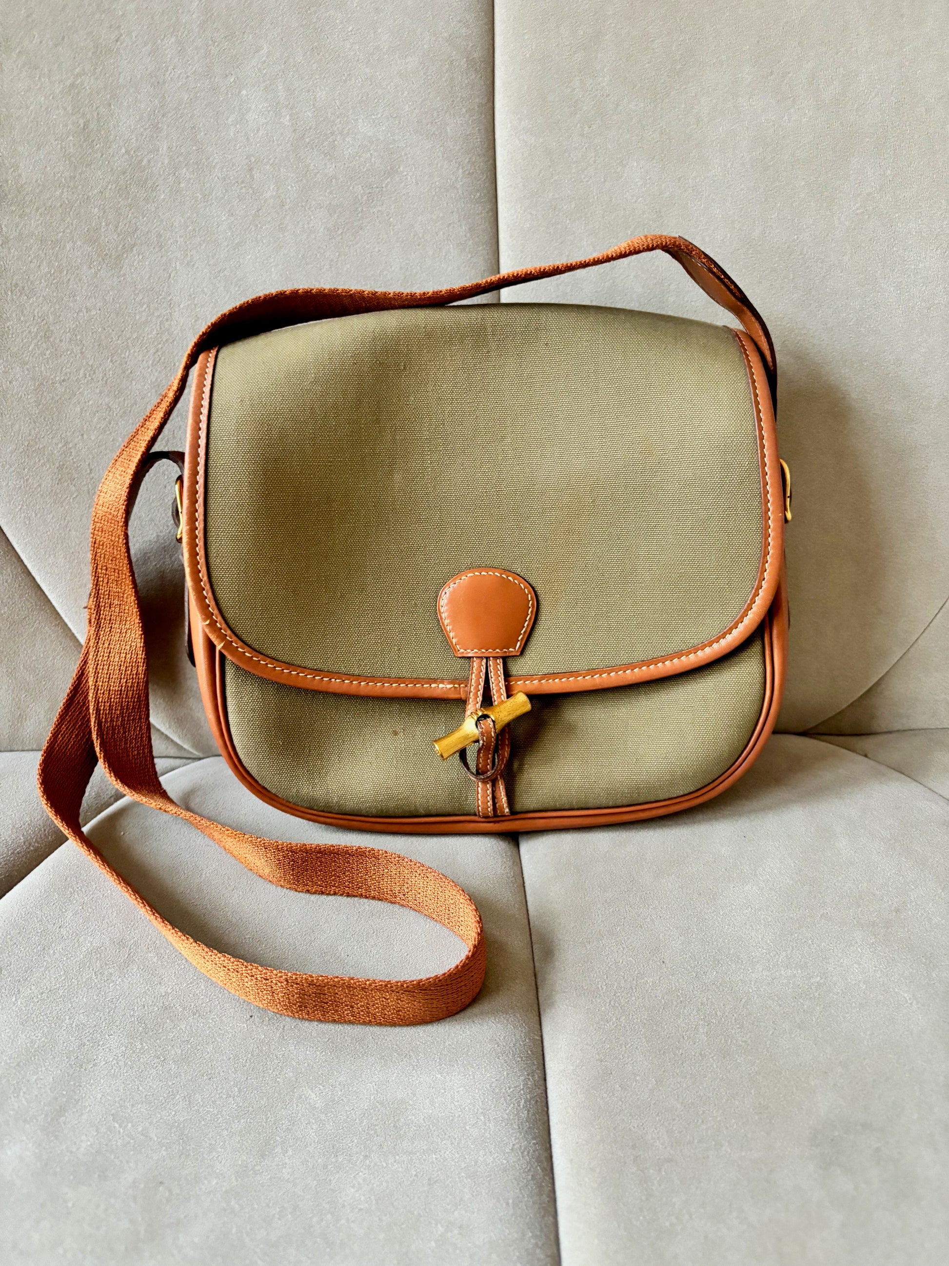 * Toile kaki et cuir camel à surpiqure crème, bandoulière en tissu et cuir camel