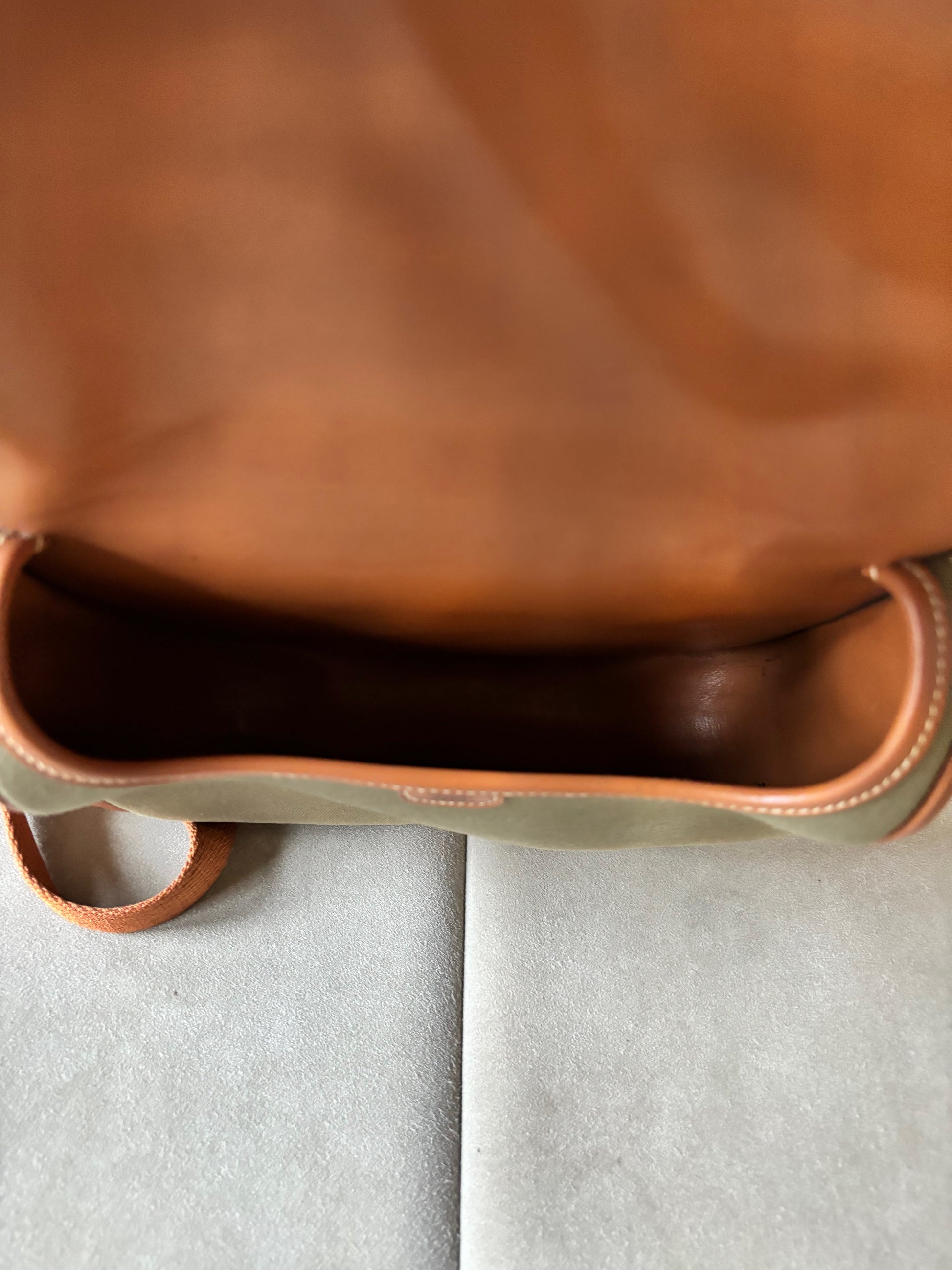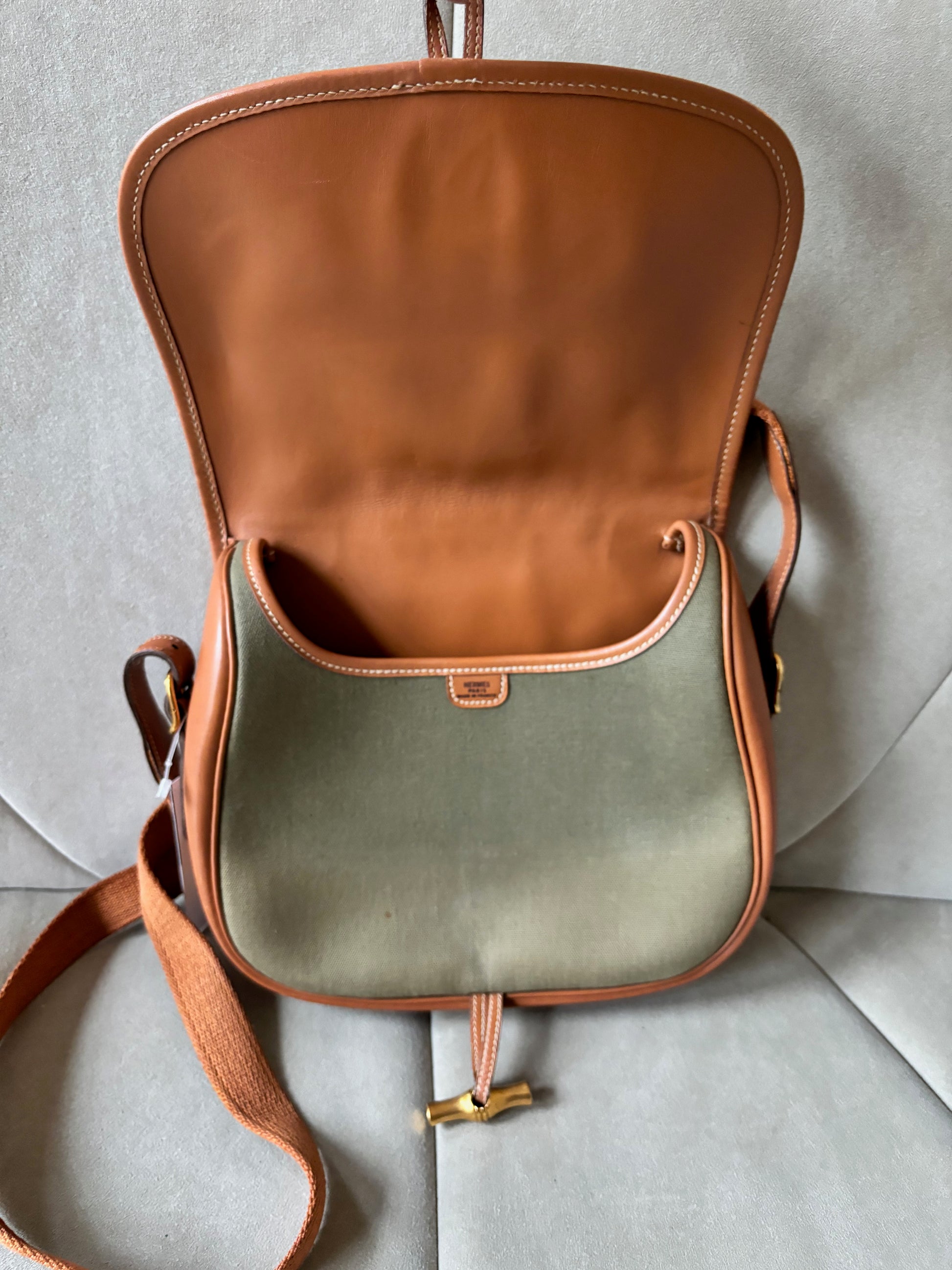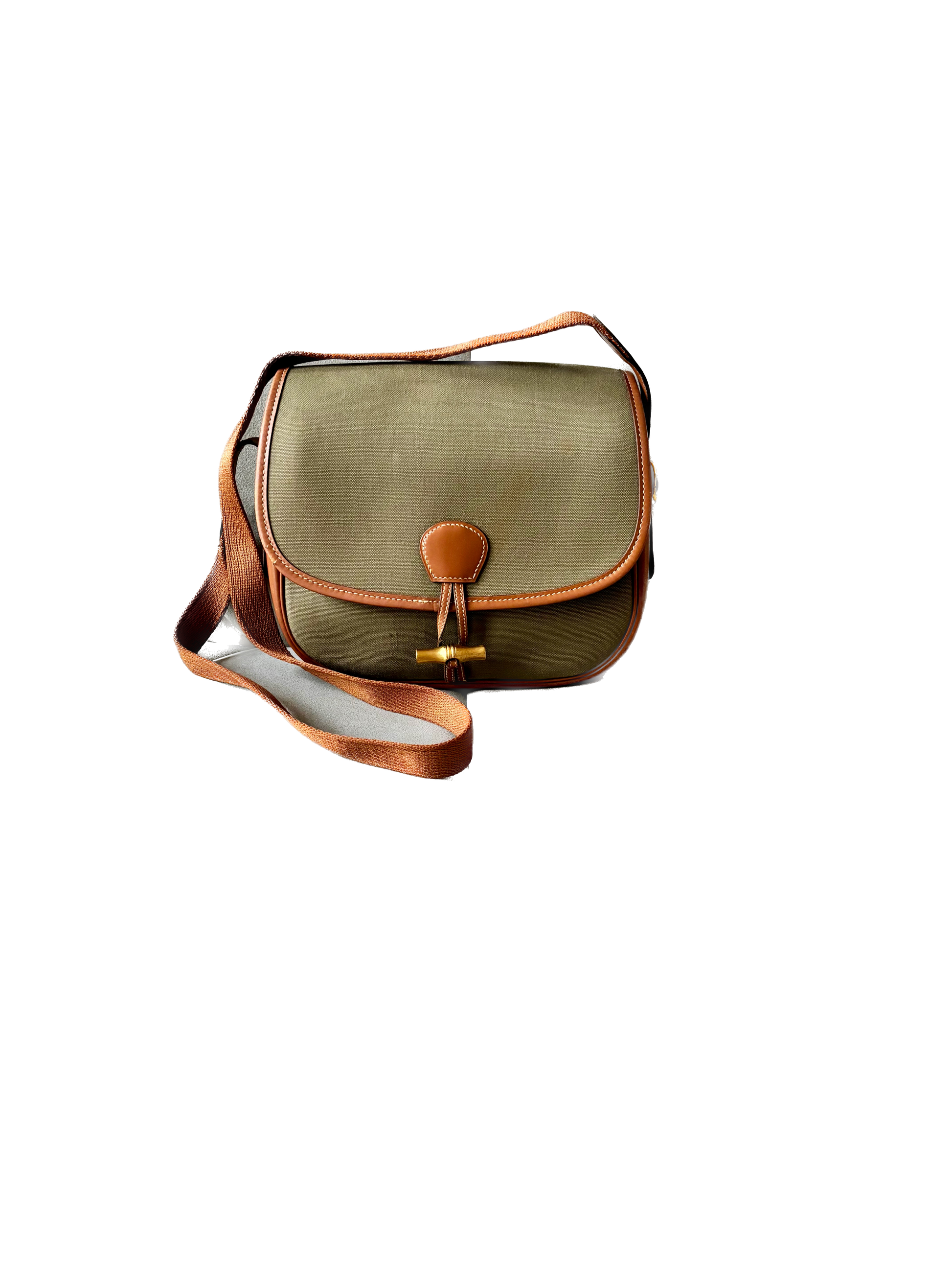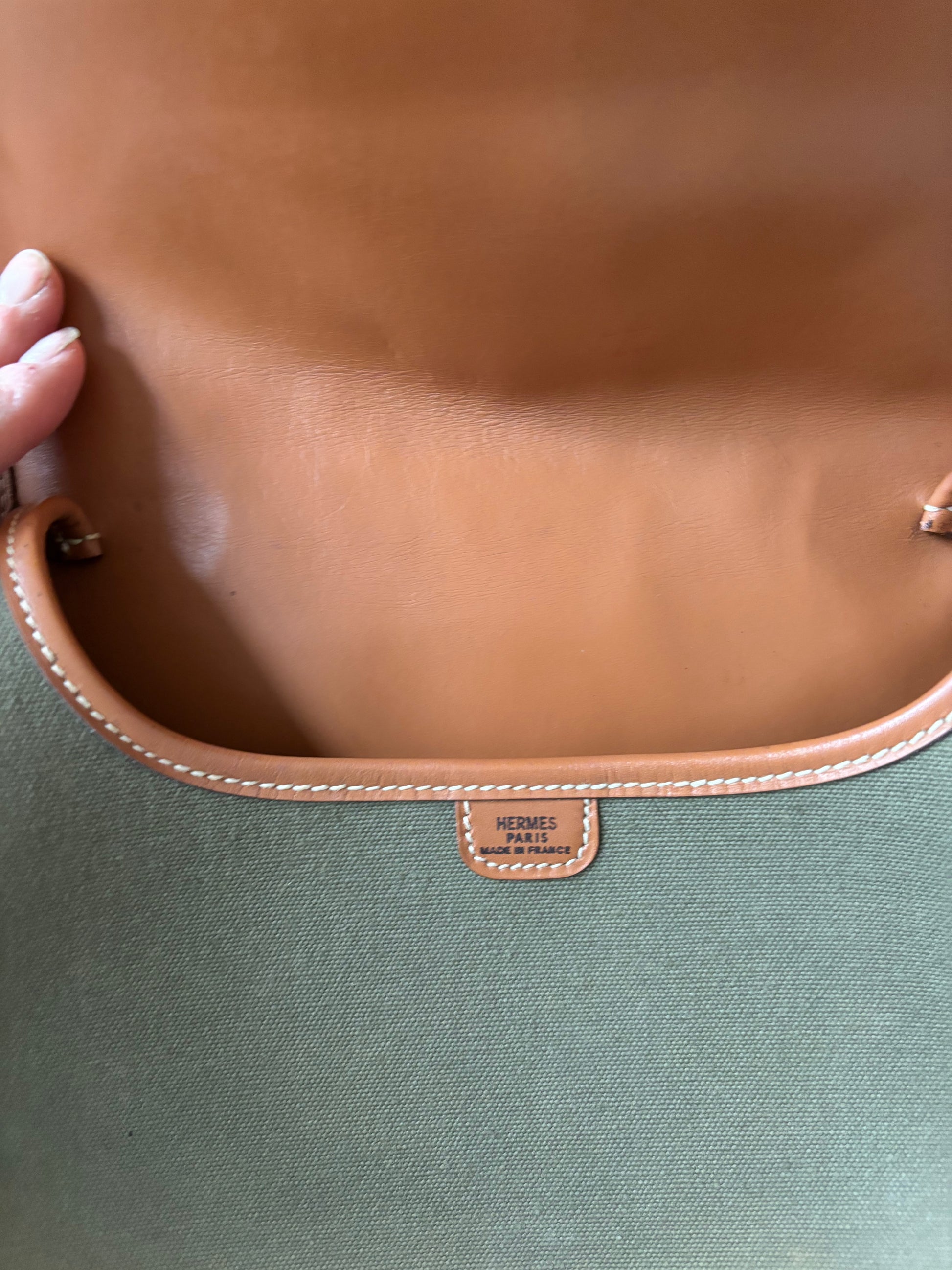 * Toile kaki et cuir camel à surpiqure crème, bandoulière en tissu et cuir camel