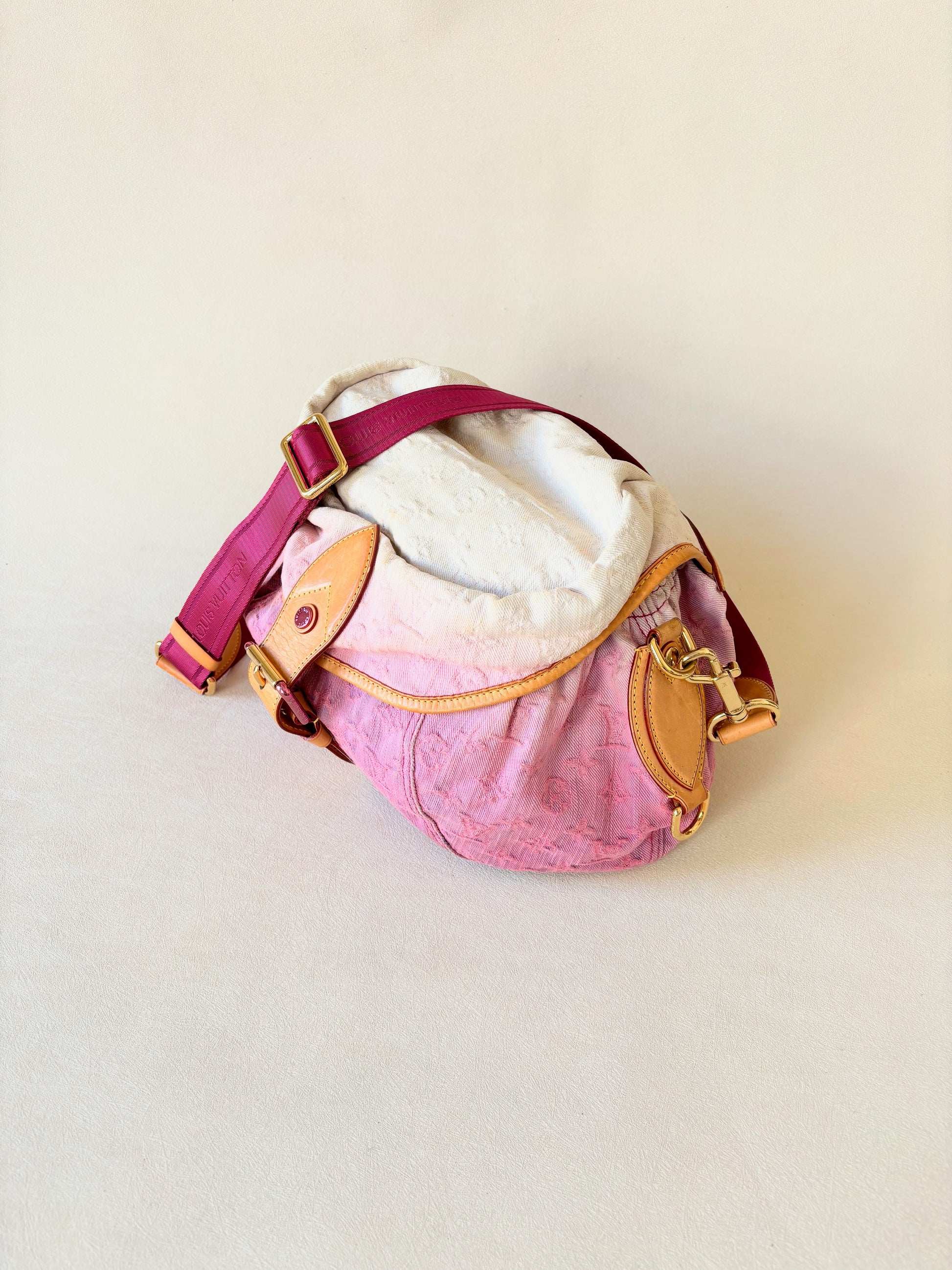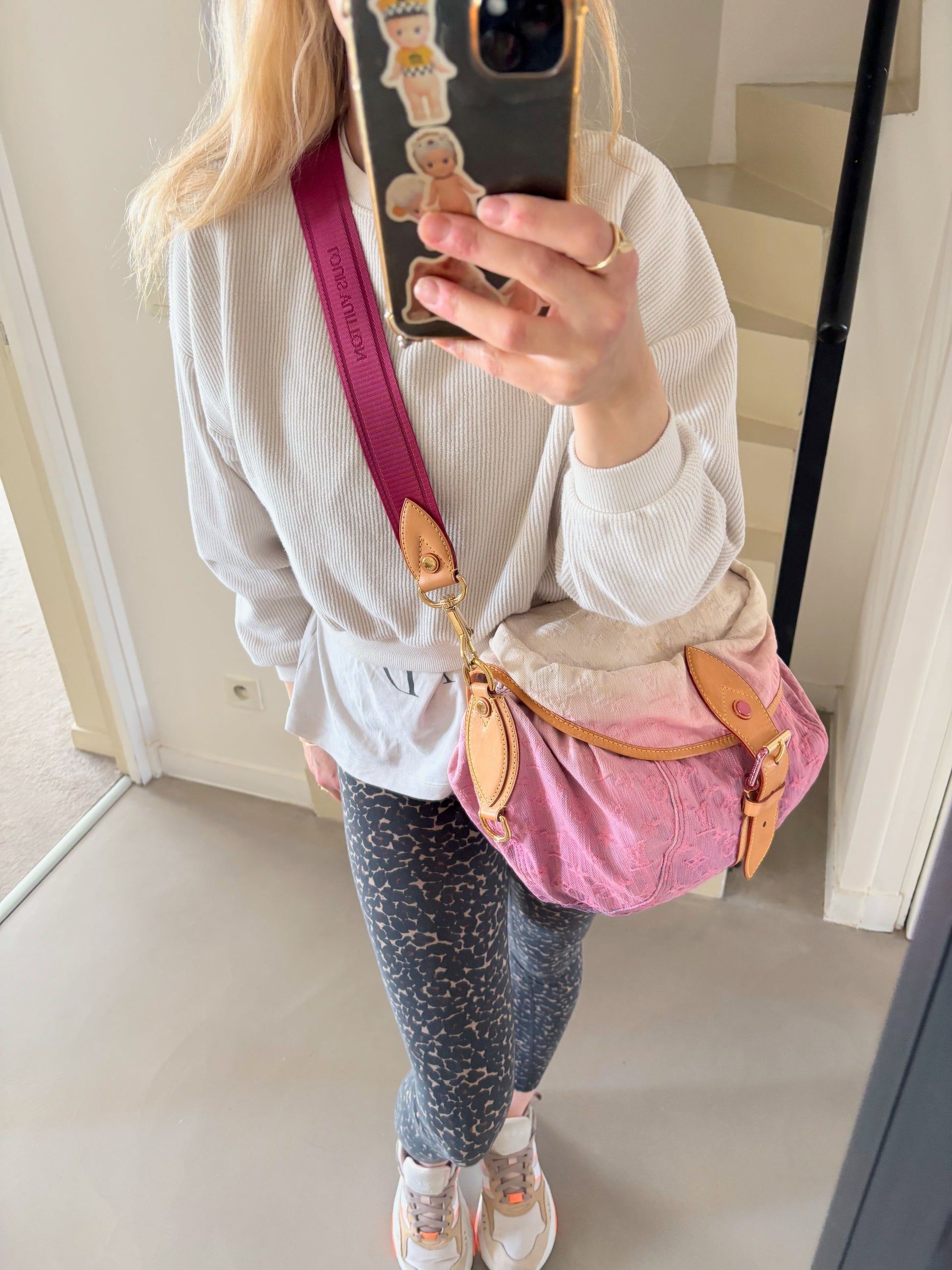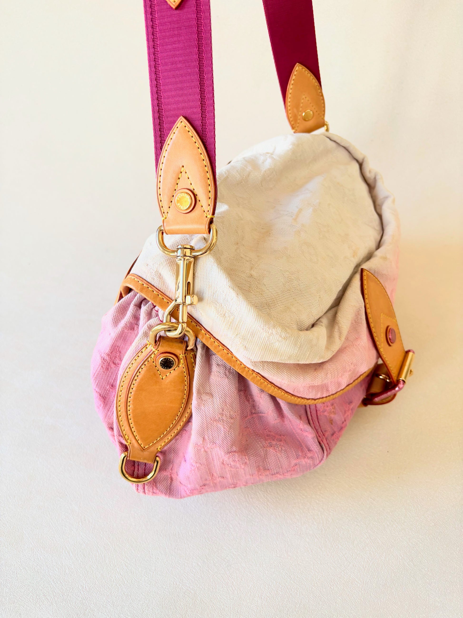 * Bandoulière en tissu parme, cuir de vachette camel et attaches dorées siglées