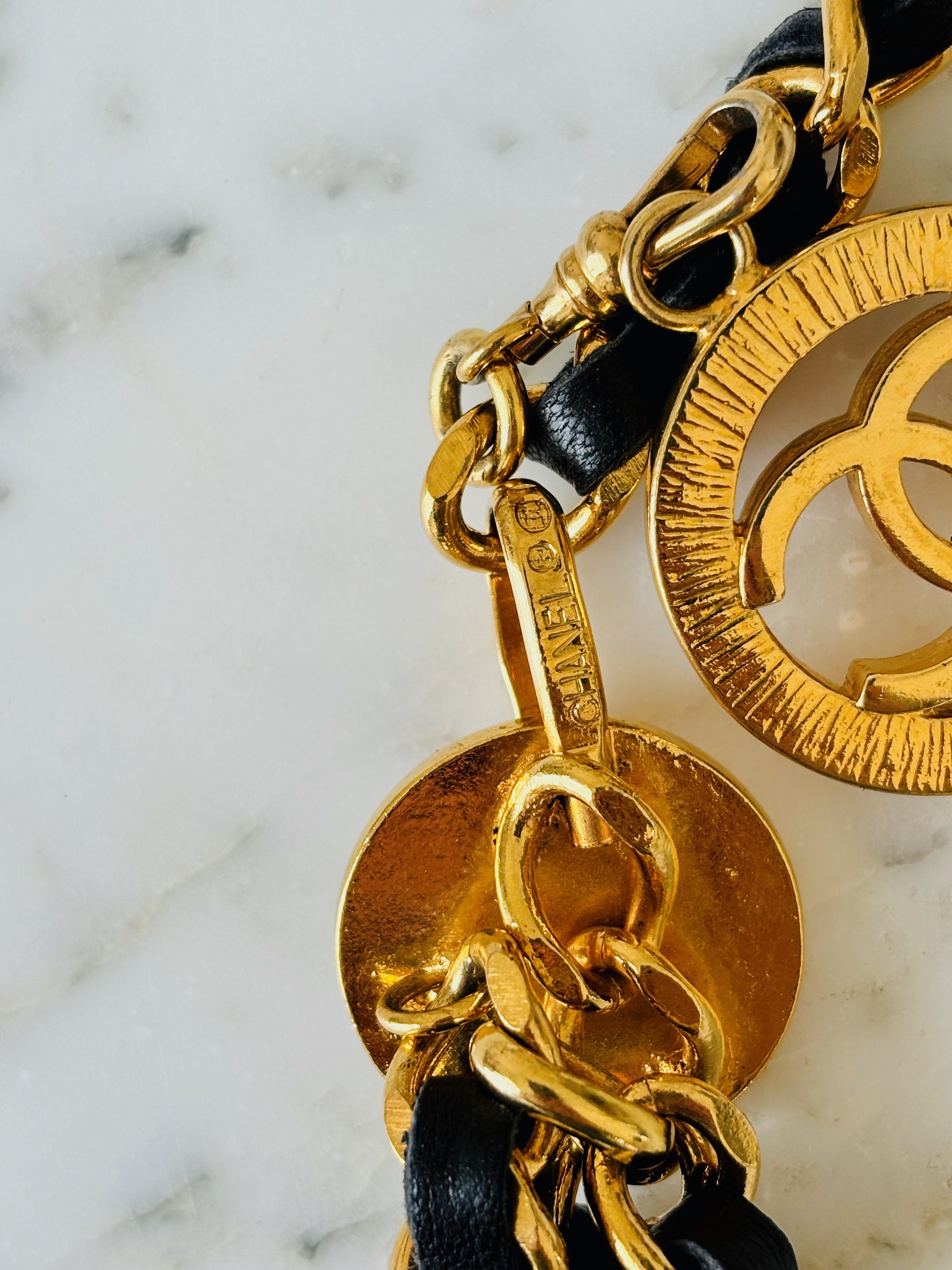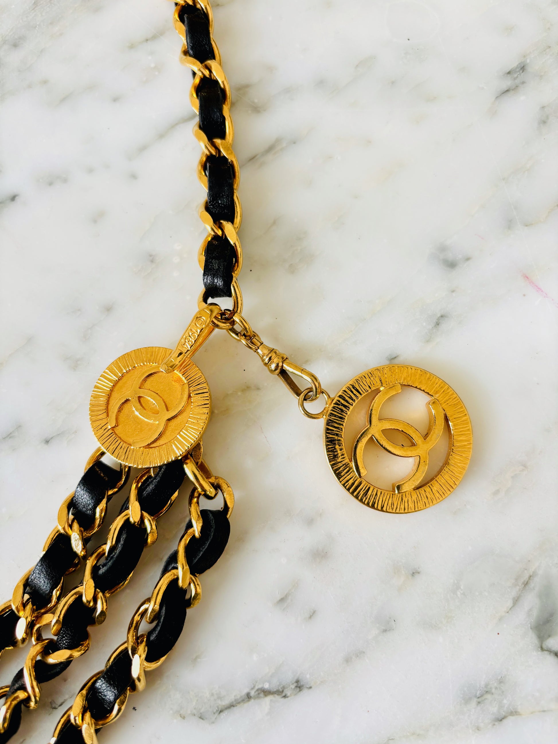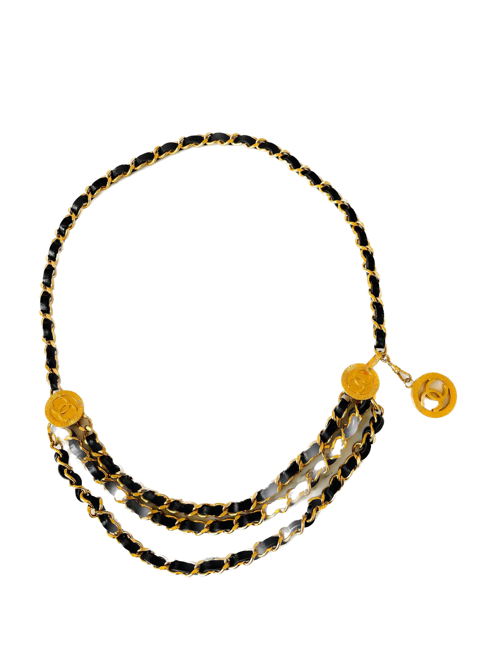 * Ceinture vintage multi-rangs CHANEL en cuir noir et lien en métal doré