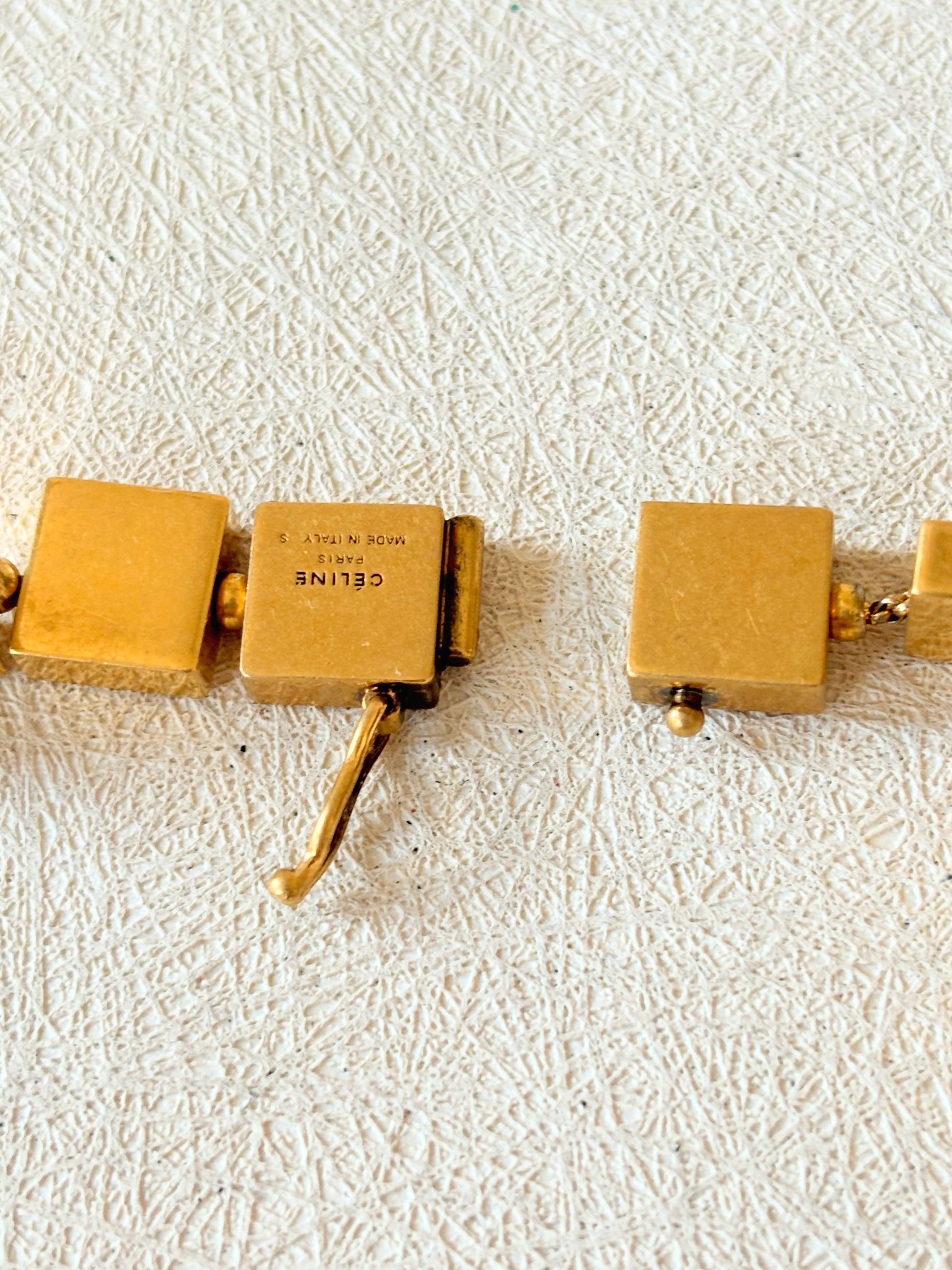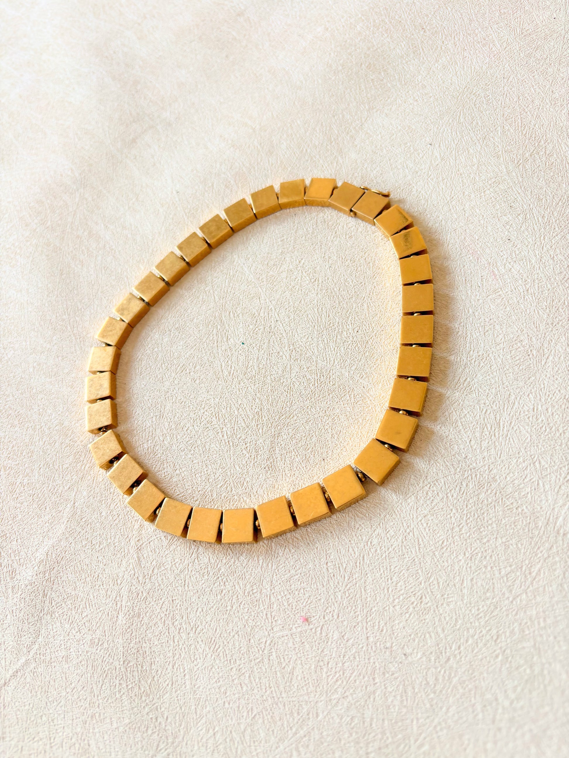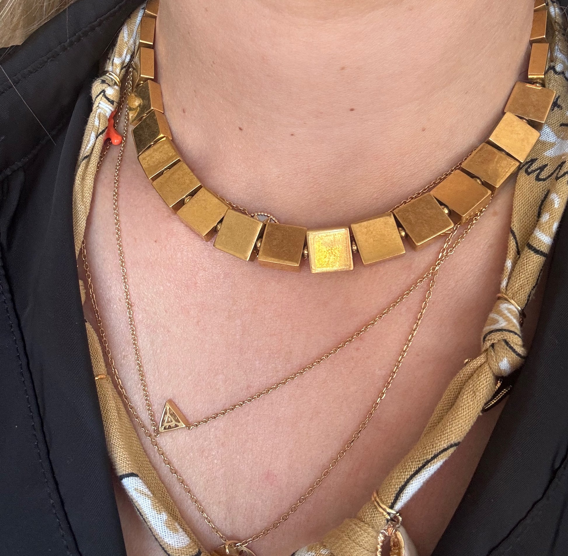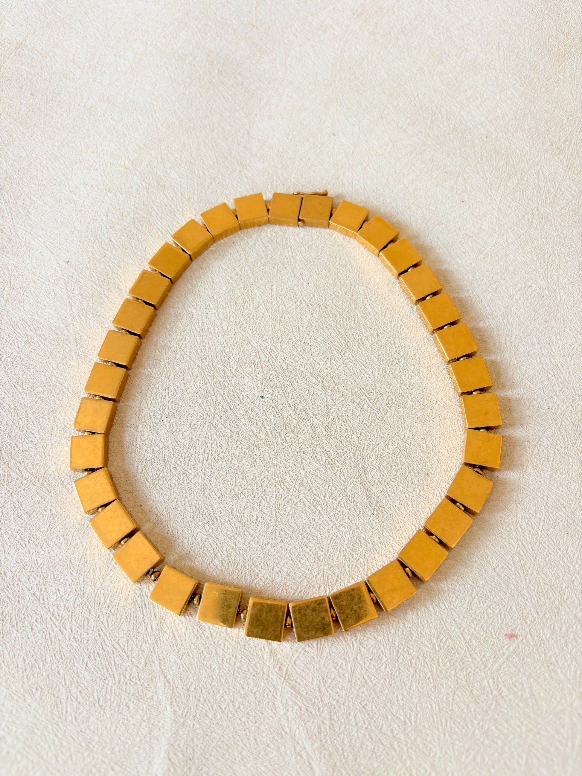 * Chaîne de cubes plats en métal doré, rappelant les colliers de l'Antiquité